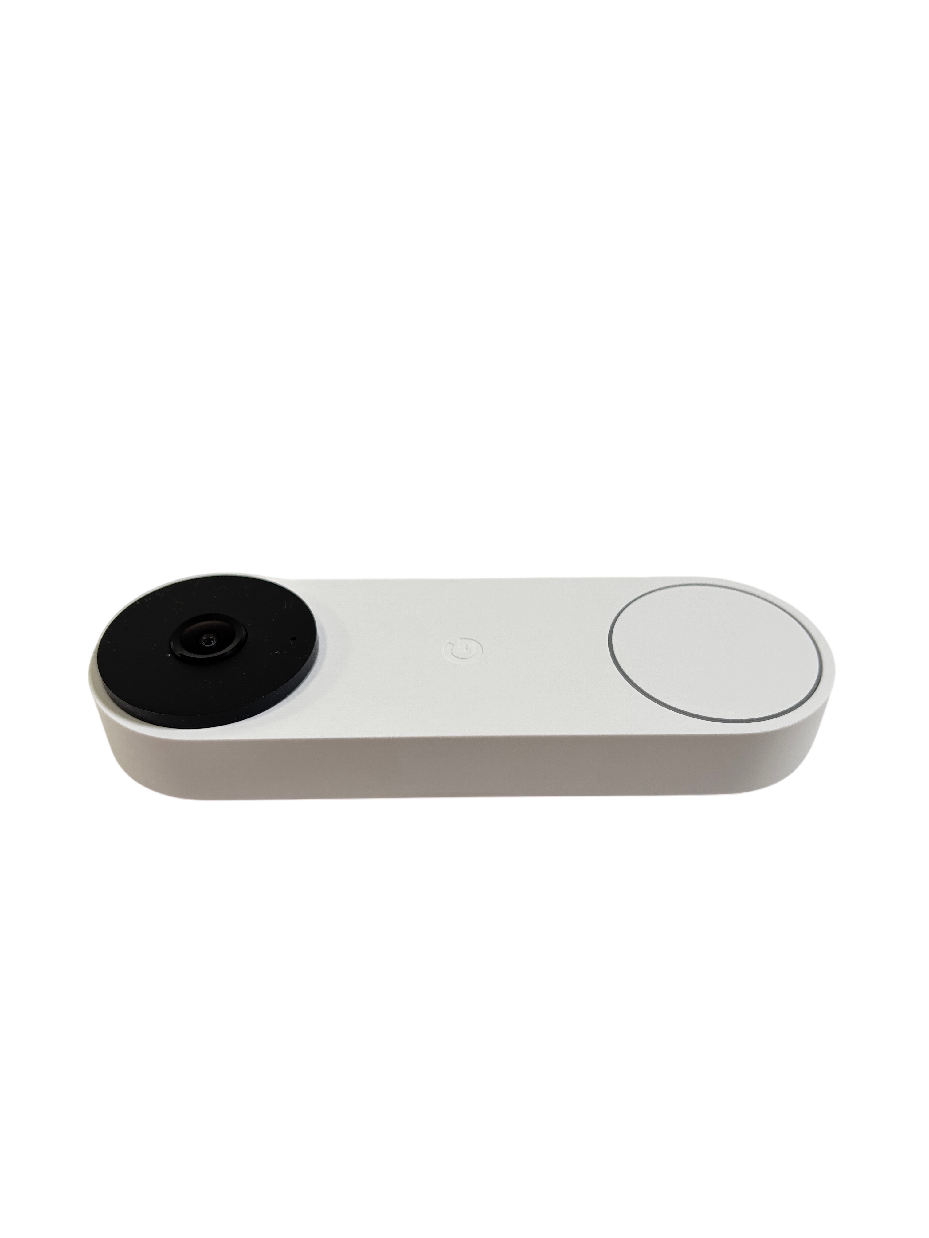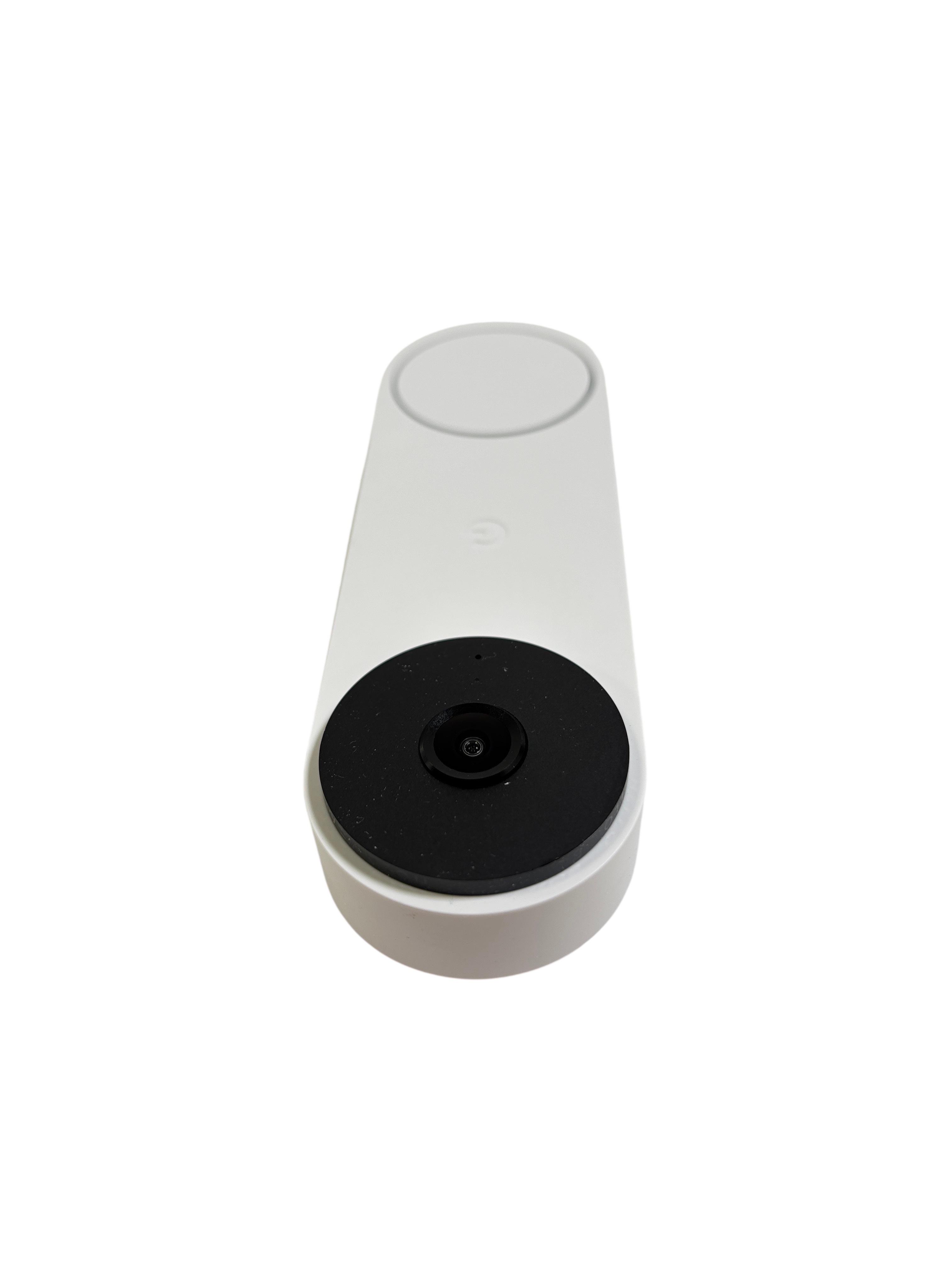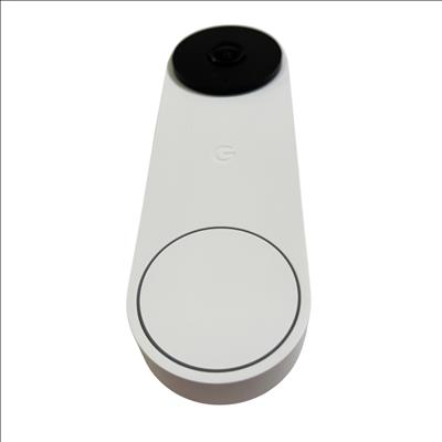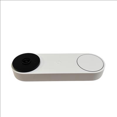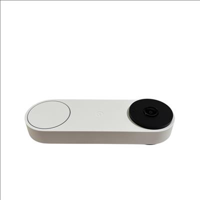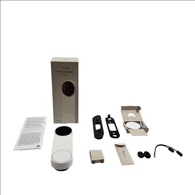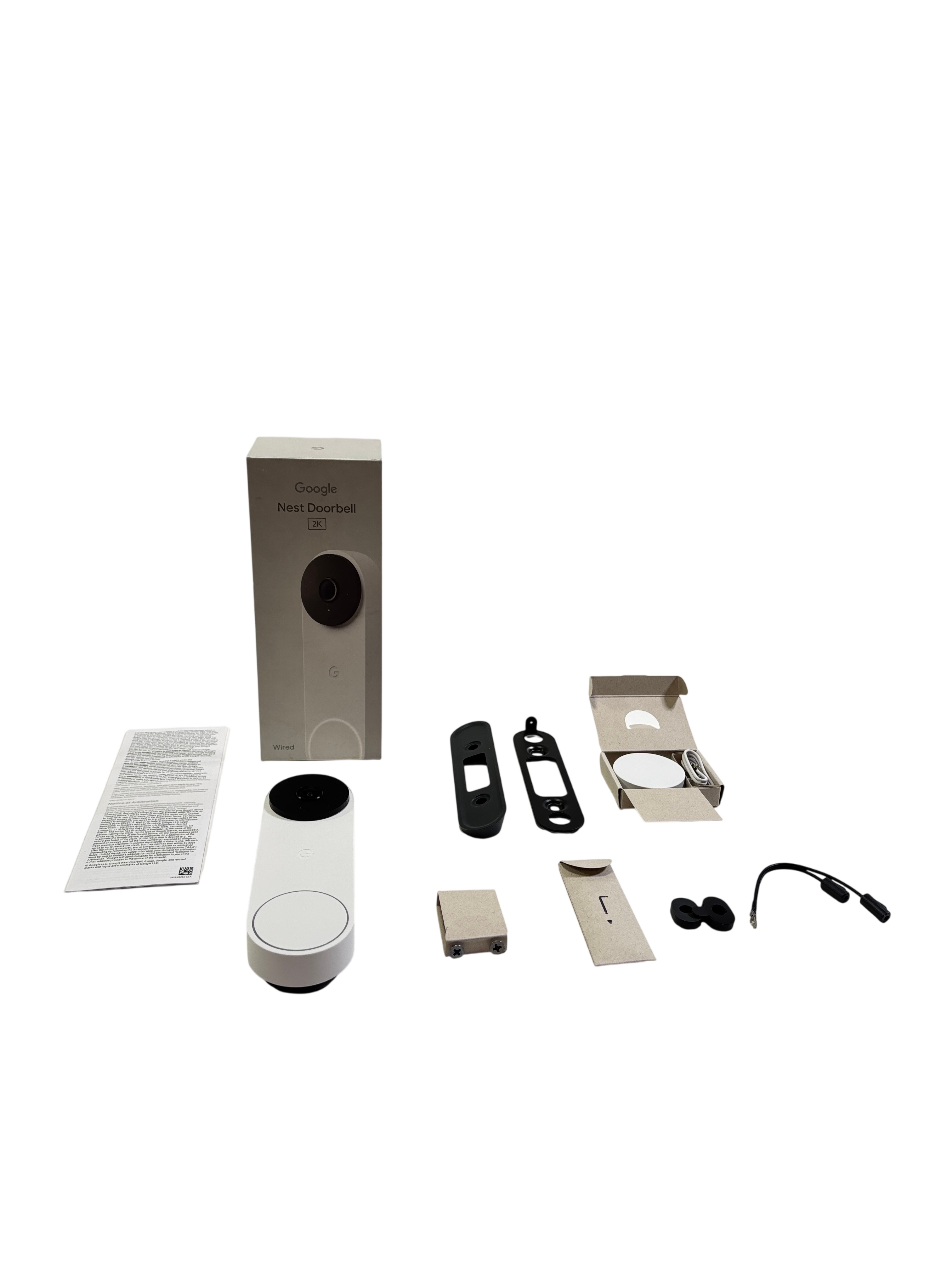 The Google Nest Doorbell is a wired video doorbell camera featuring 2K resolution for clear, detailed video monitoring. This sleek white and black doorbell includes night vision, motion detection, and two-way audio for enhanced home security and communication. The package comes complete with mounting brackets, adapters, screws, and installation guide, making setup straightforward. Ideal for homeowners seeking reliable wired video surveillance with smart features and high-quality video clarity.
