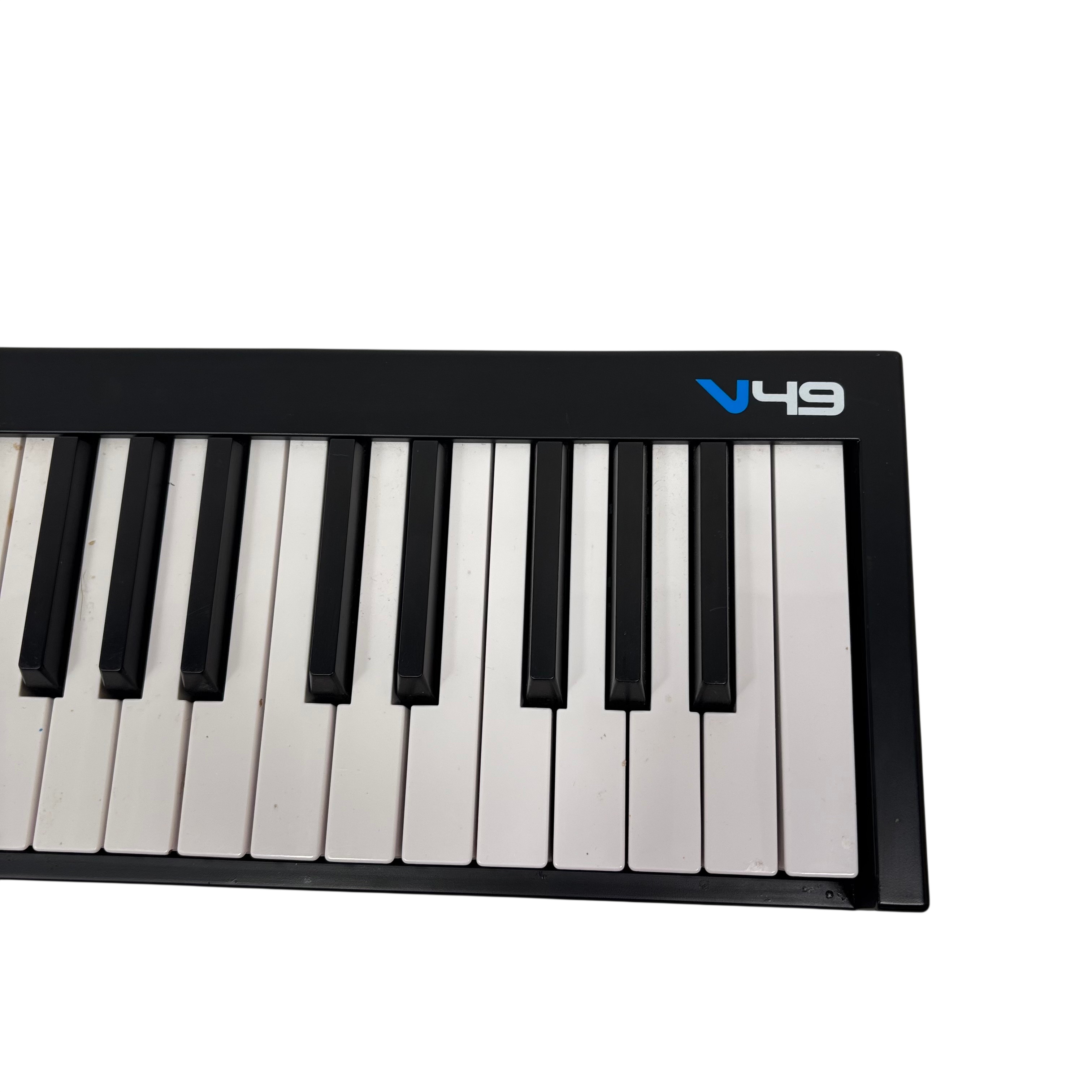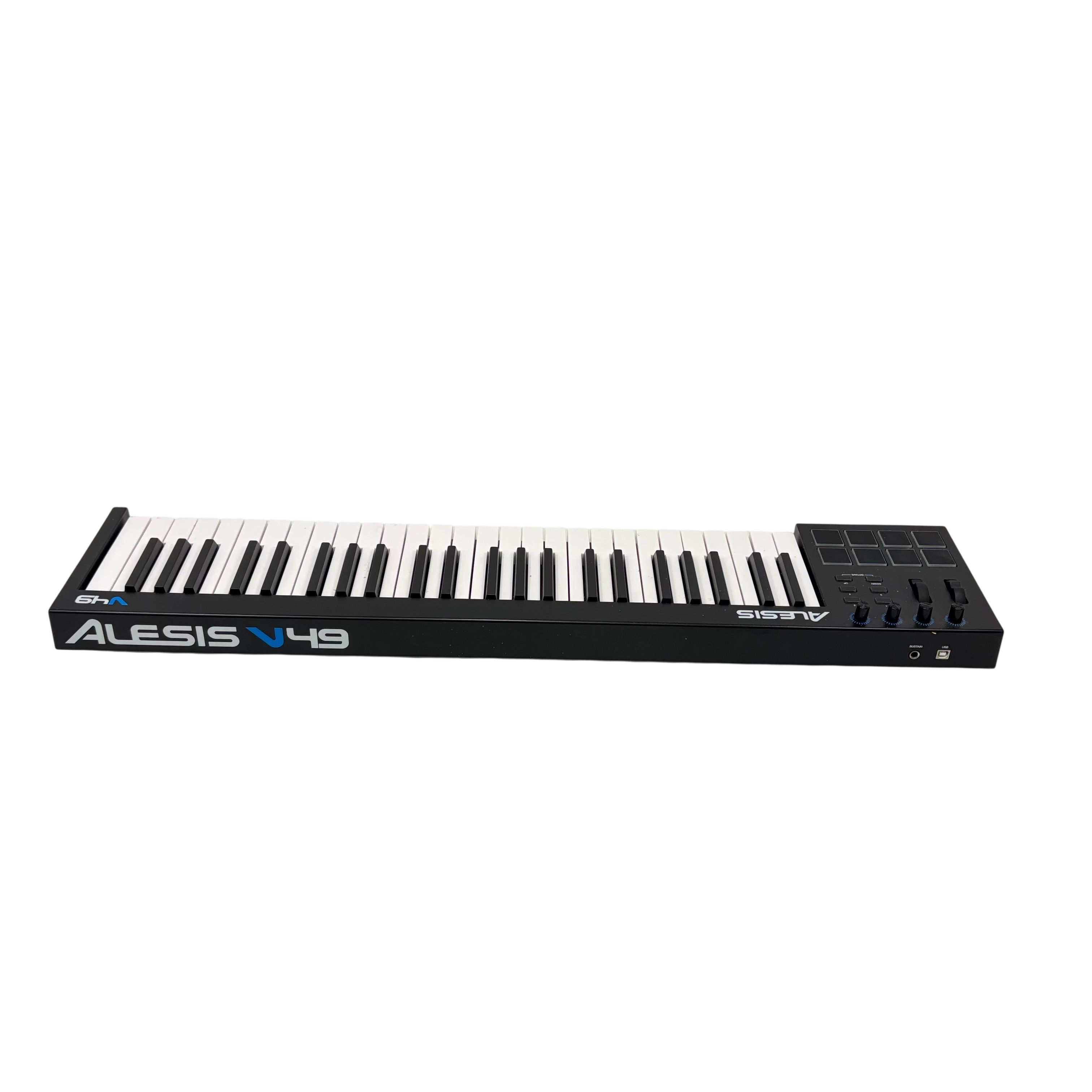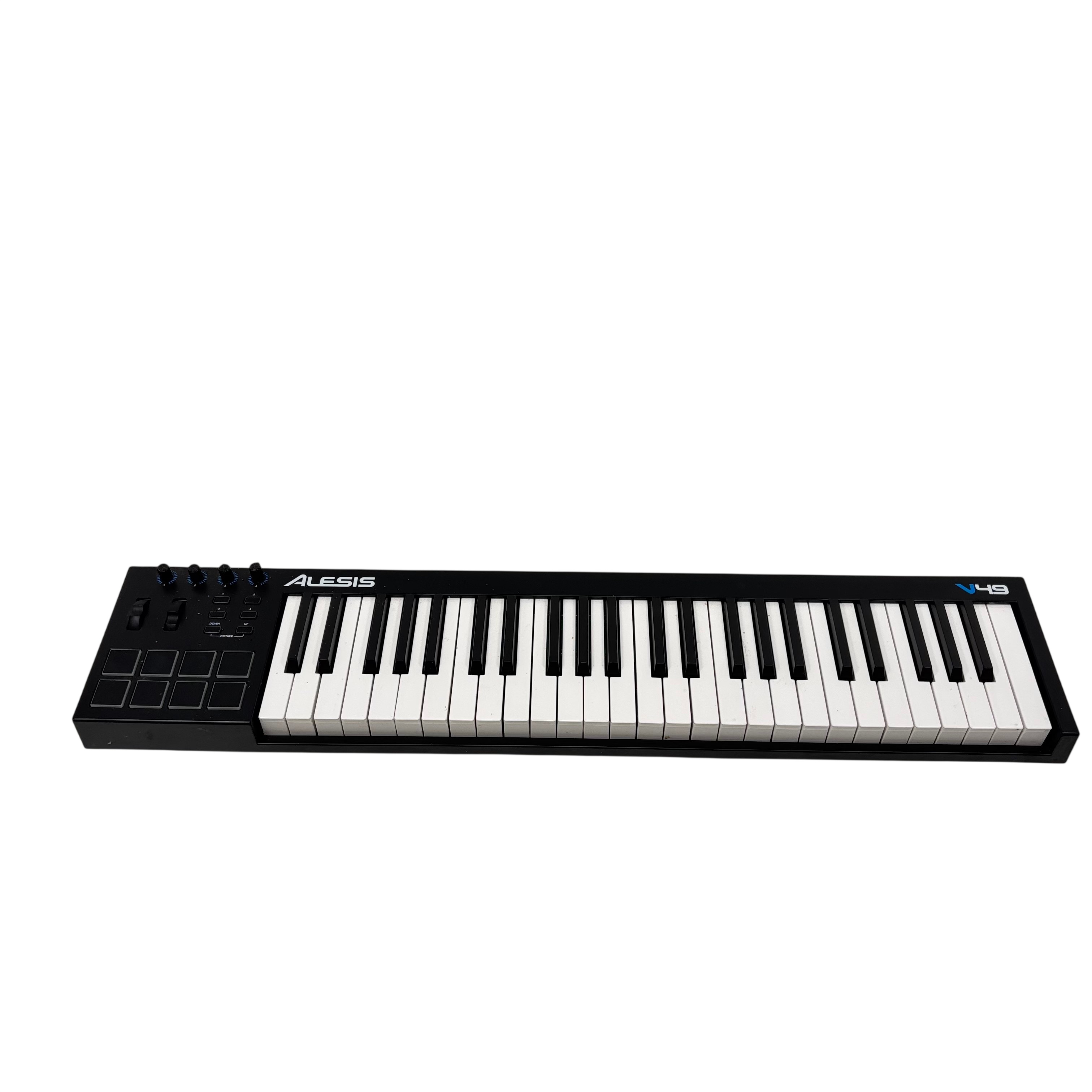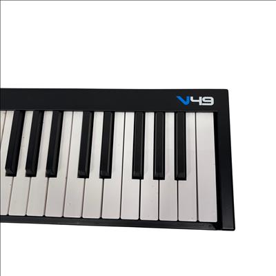 The Alesis V49 Midi Keyboard Controller offers 49 full-size velocity-sensitive keys, 8 velocity-sensitive backlit pads, and 4 assignable knobs for dynamic music production and performance. This USB-powered MIDI controller features pitch bend and modulation wheels, as well as octave up and down buttons to extend your playable range. Compatible with most music software, the V49 provides versatile control and connectivity for musicians and producers.