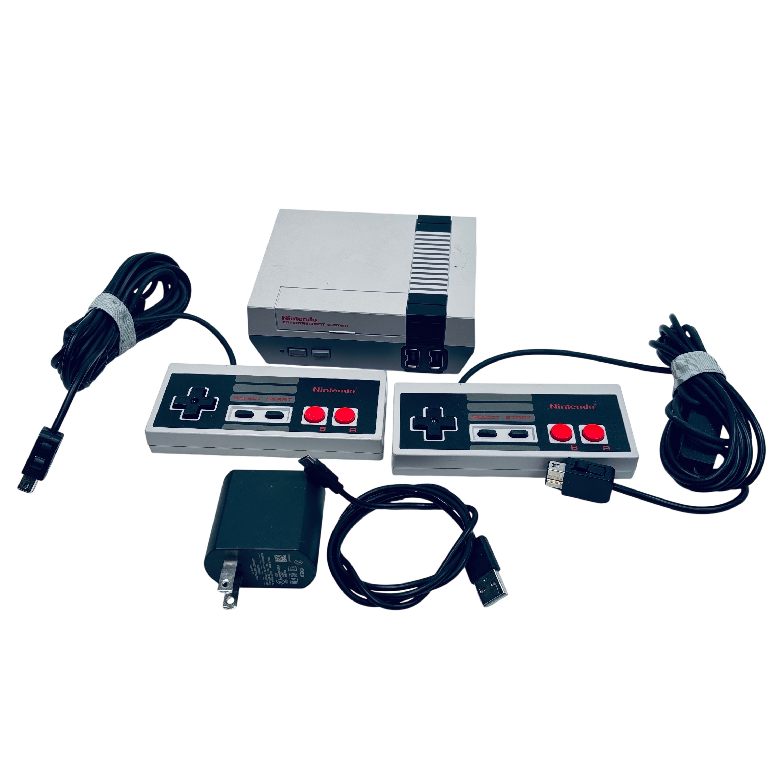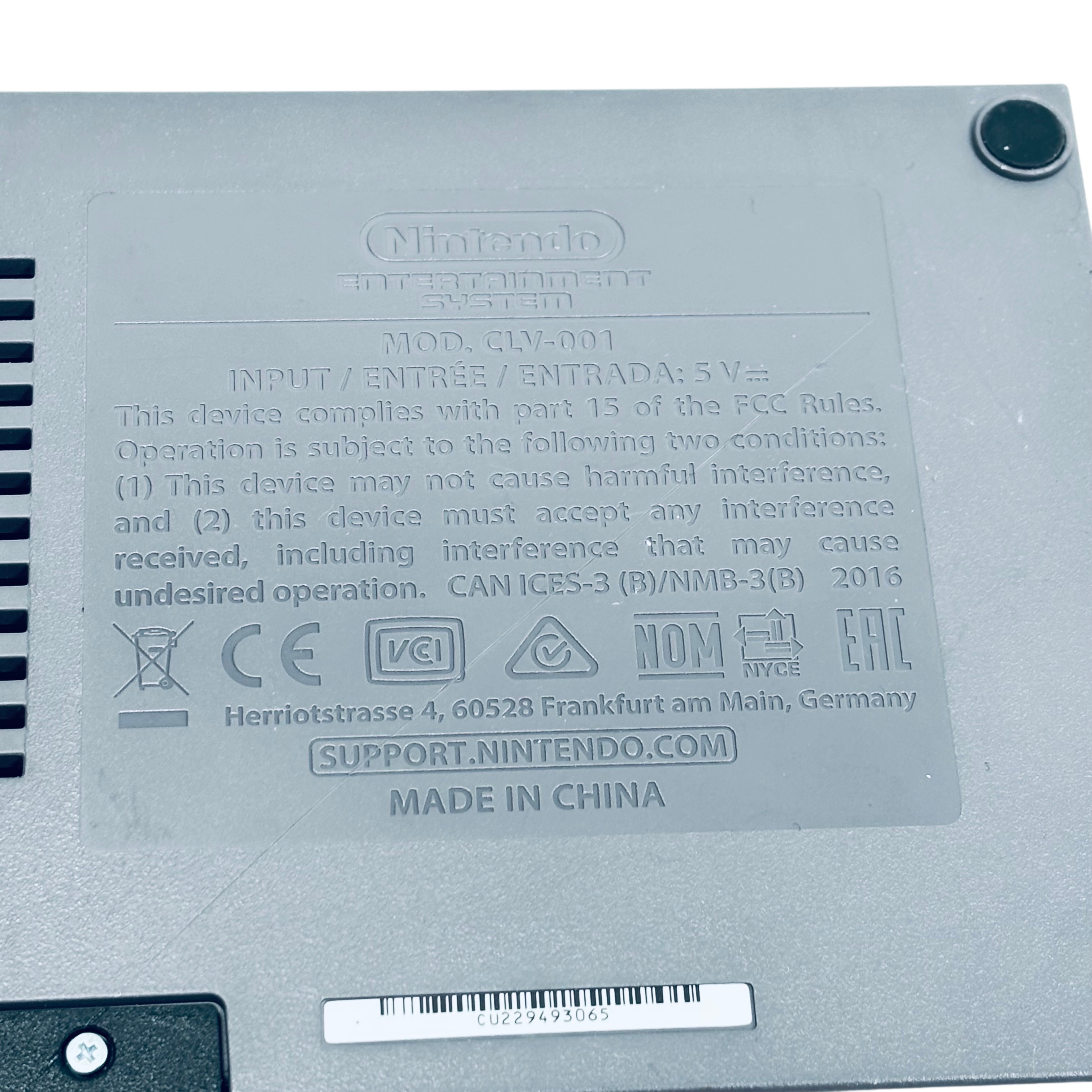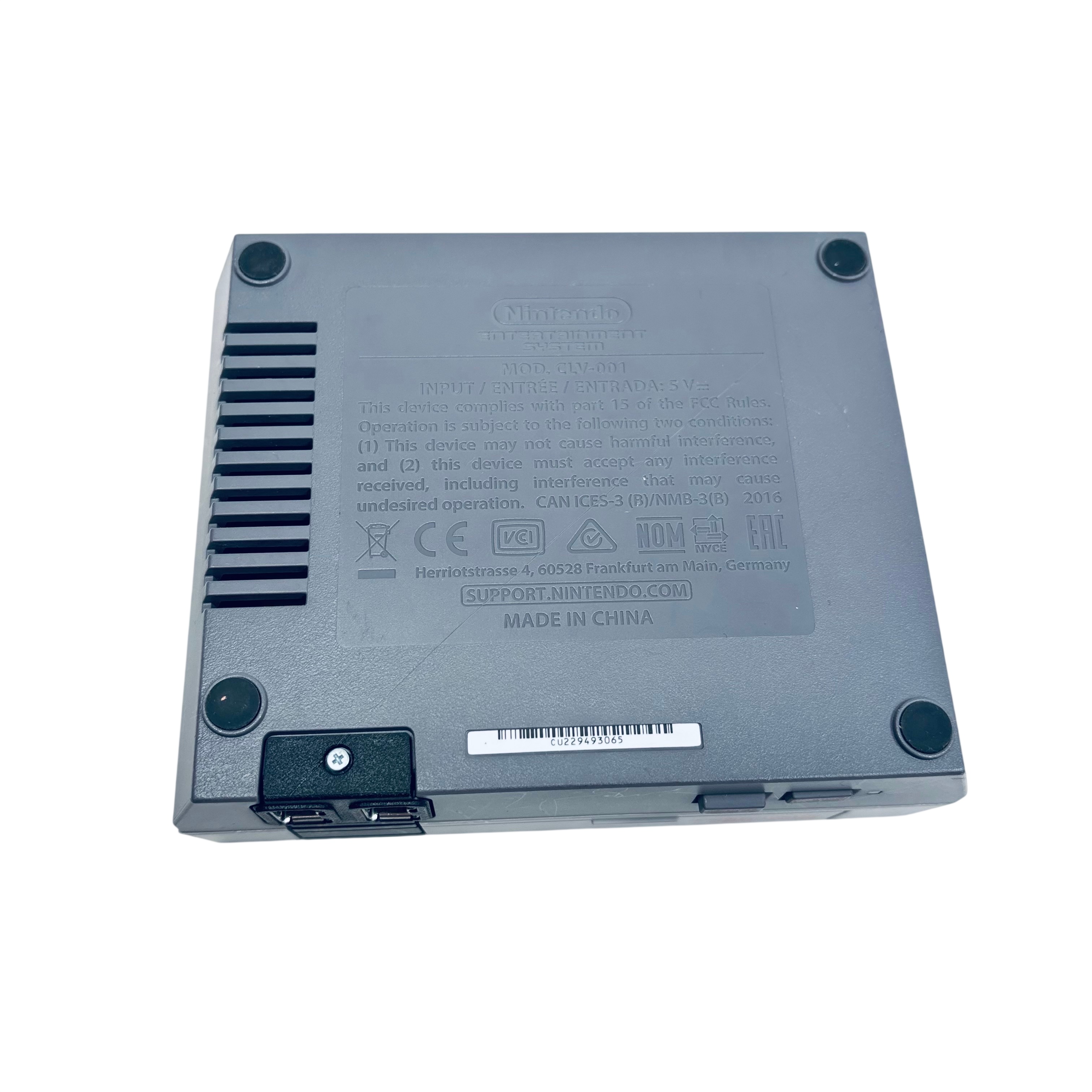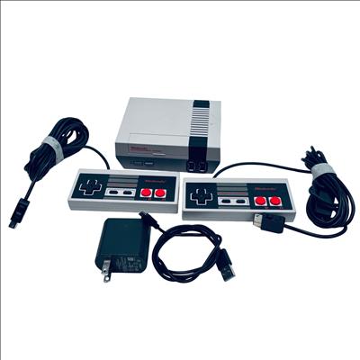 The Nintendo CLV-001 NES Classic is a compact video game console that replicates the original Nintendo Entertainment System experience. This model includes two wired controllers and is powered by a 5V USB AC adapter, making it easy to connect and use with modern TVs. Its classic gray and black design offers nostalgic appeal, while the lightweight and small form factor ensure convenient placement in any entertainment setup. Ideal for fans of retro gaming, this console delivers classic gameplay with modern convenience.