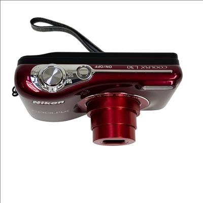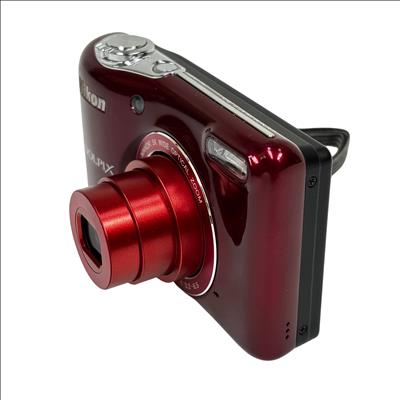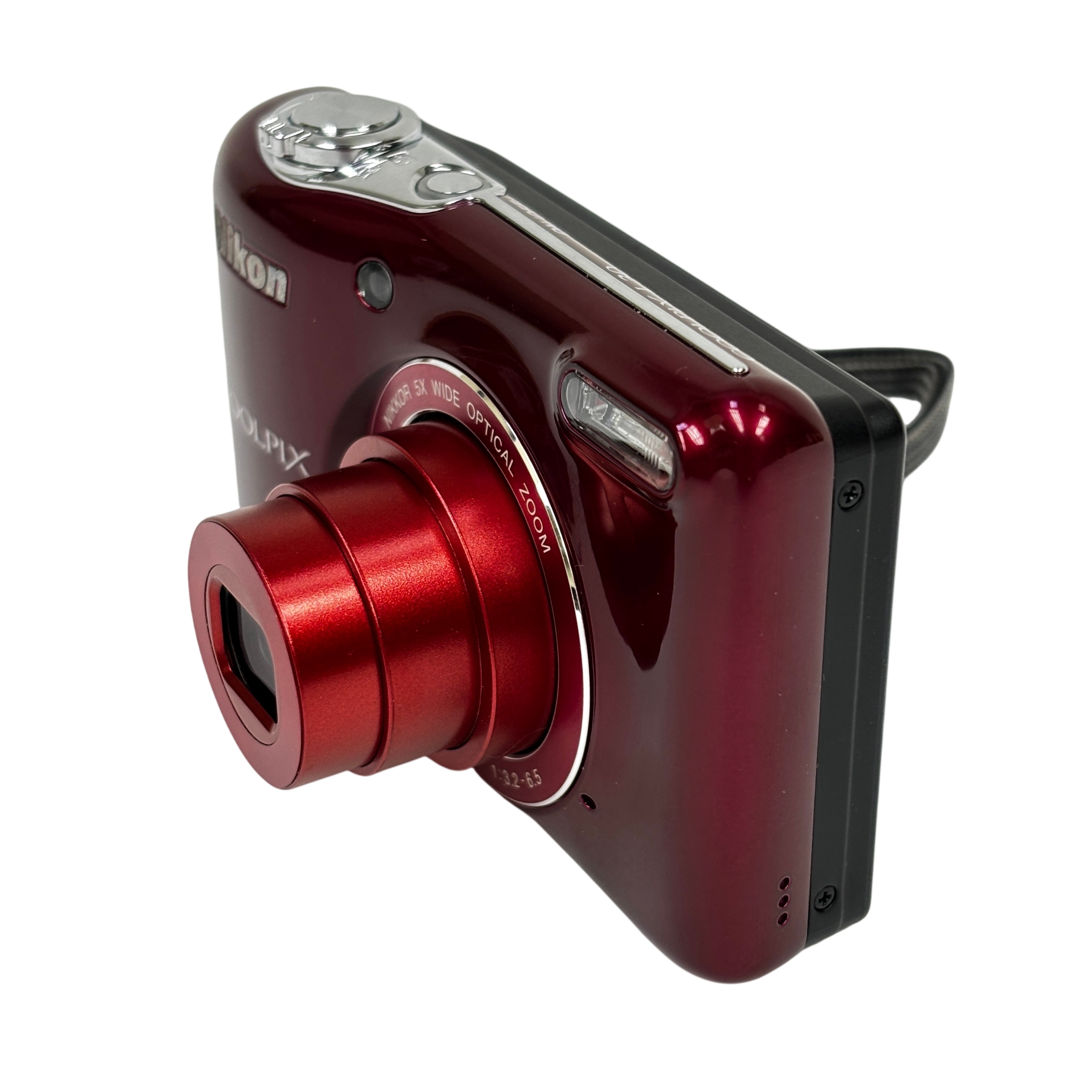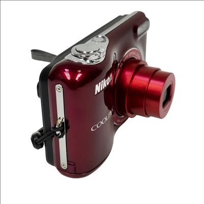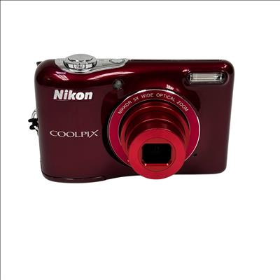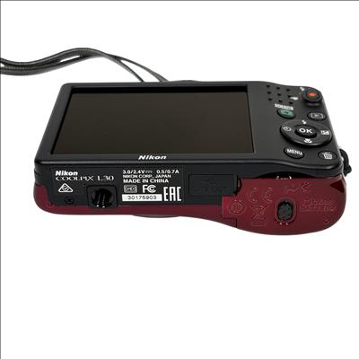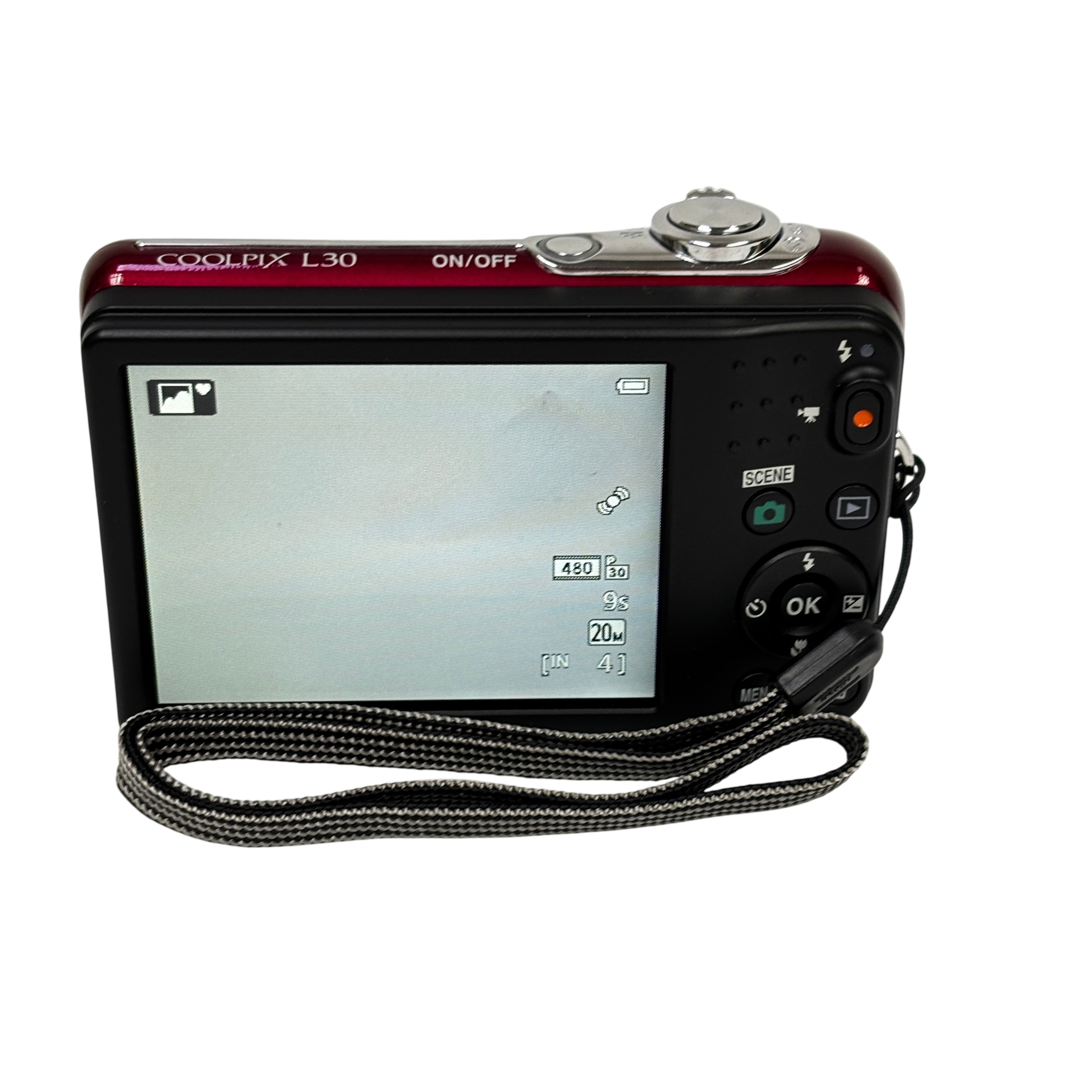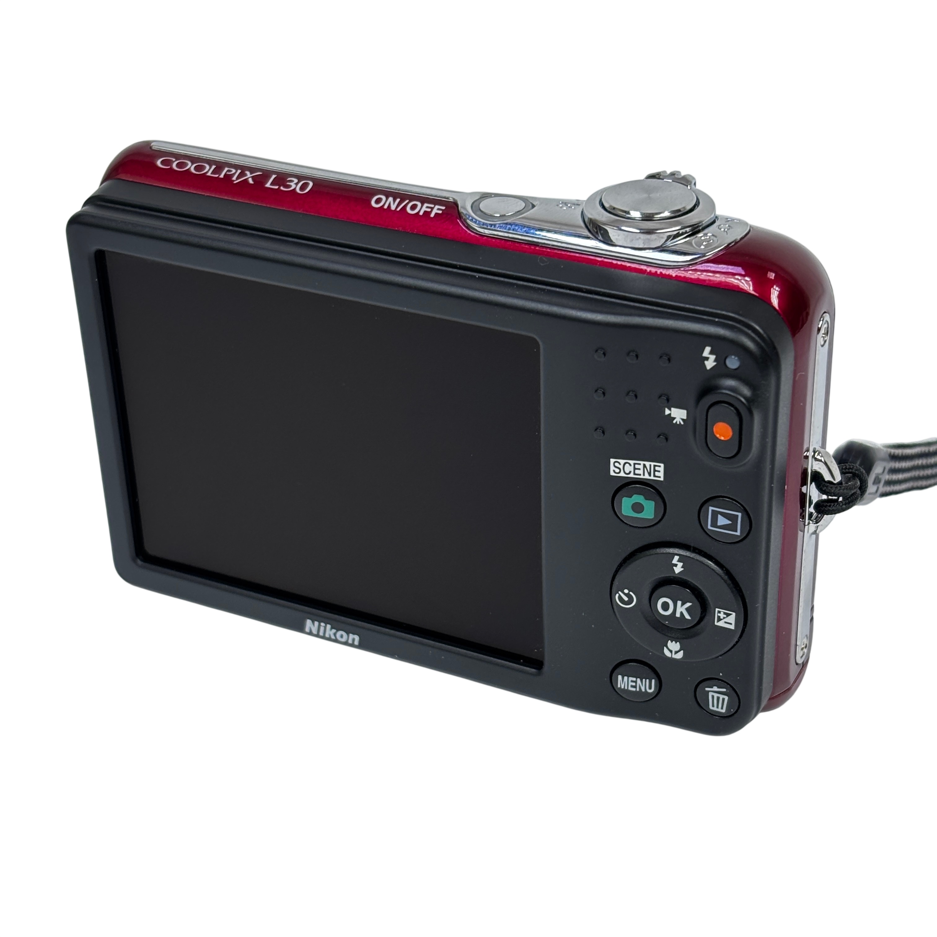 The Nikon Coolpix L30 is a compact digital camera featuring a 5x wide optical zoom Nikkor lens and an easy-to-use interface, perfect for casual photography. Its lightweight and portable design, combined with a clear LCD screen, makes it ideal for capturing everyday moments with ease. The cameras red finish adds a stylish touch to its practical functionality.
