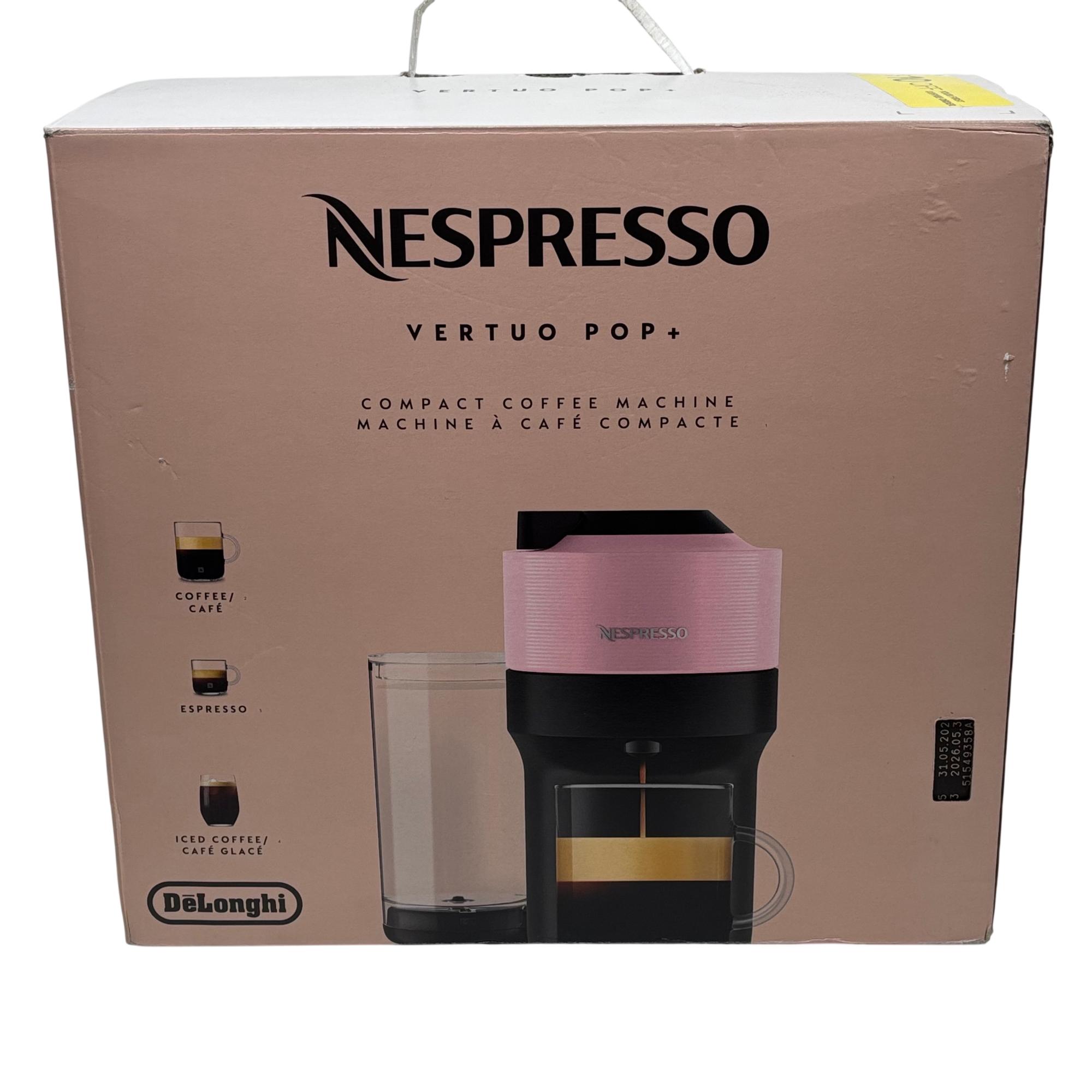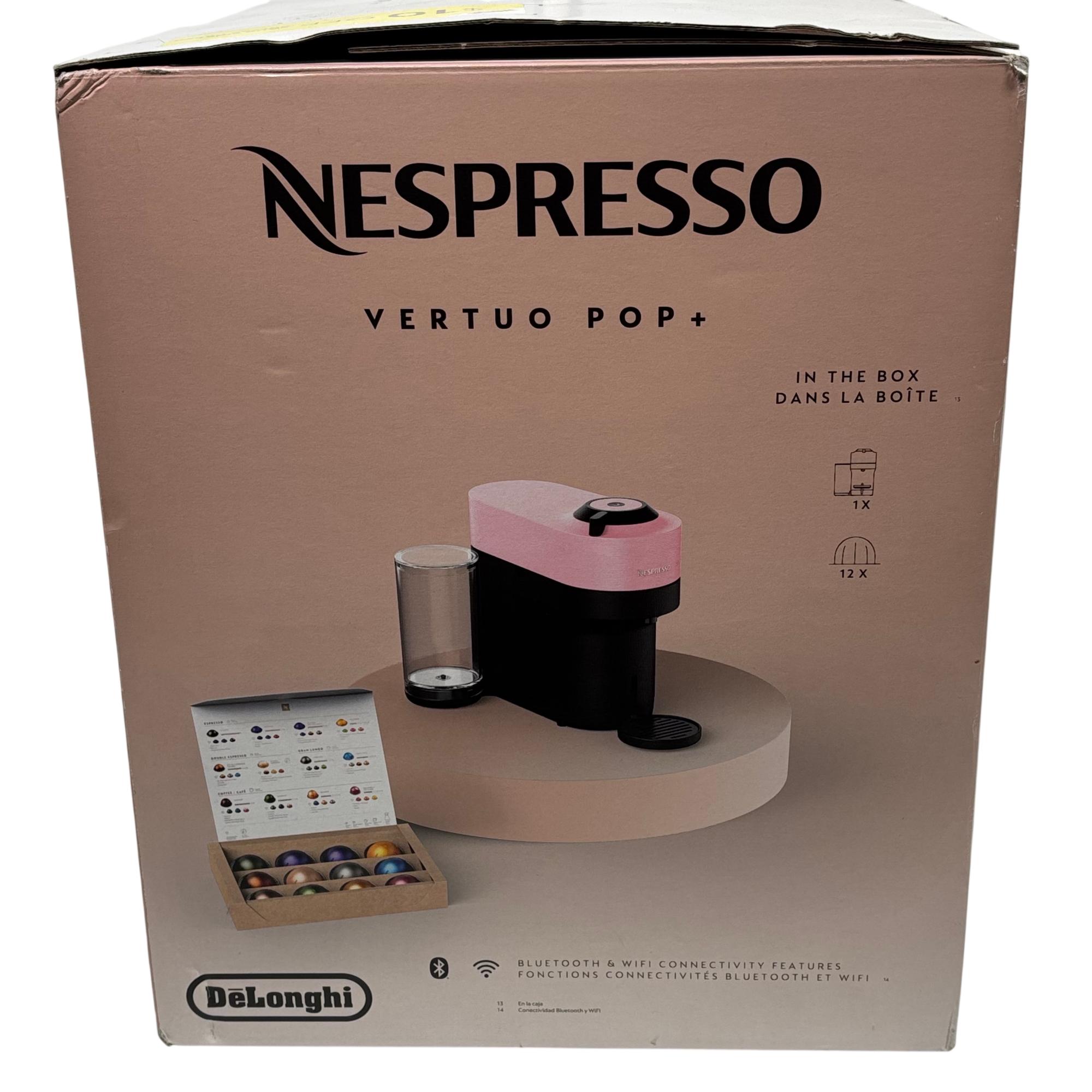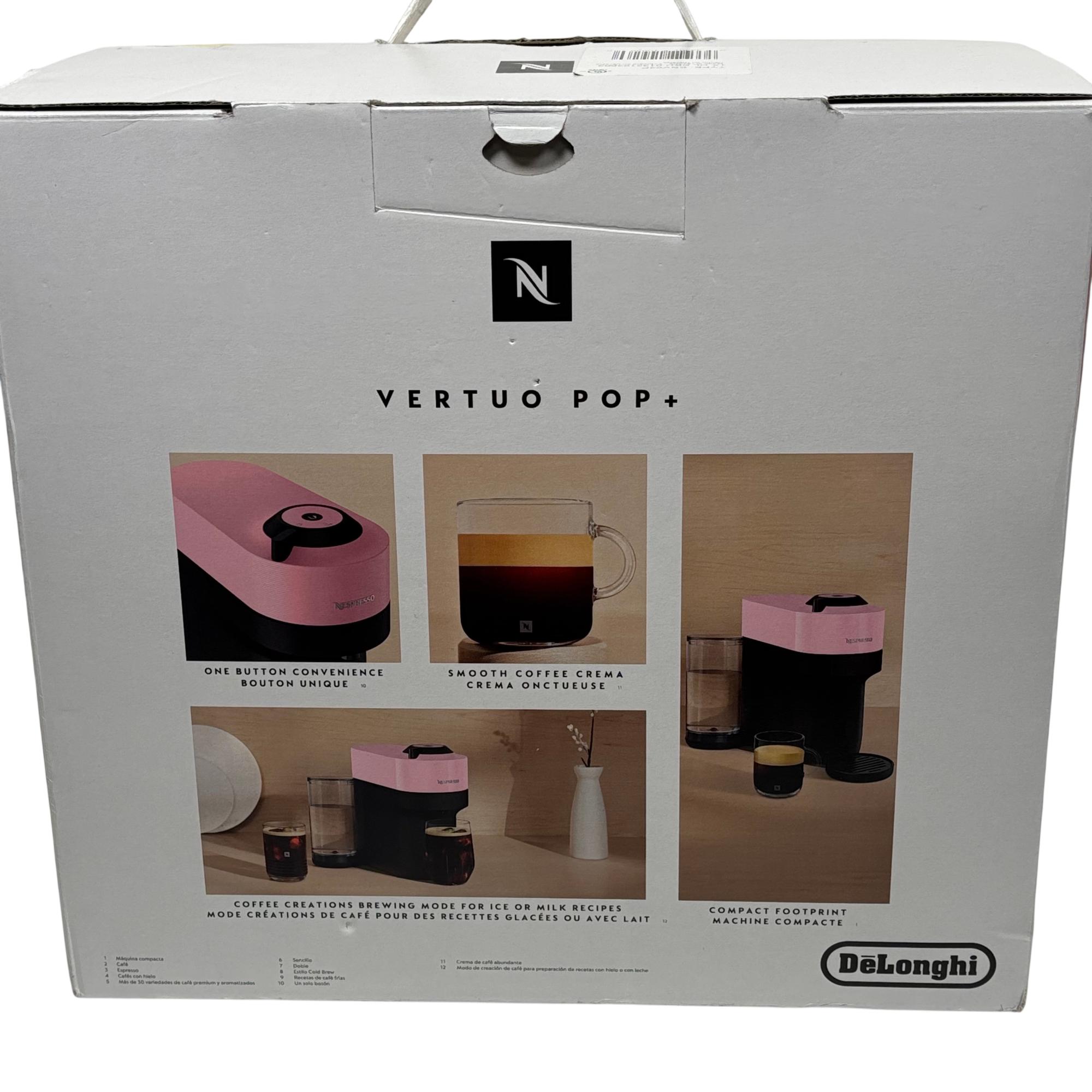 Nespresso Vertuo Pop+ Compact Coffee & Espresso Machine by DeLonghi in Candy Pink delivers smooth coffee crema and versatile brewing modes tailored for espresso, iced coffee, and milk-based recipes. This compact coffee maker features one-button convenience and advanced Bluetooth and WiFi connectivity for seamless operation and premium coffee creations.