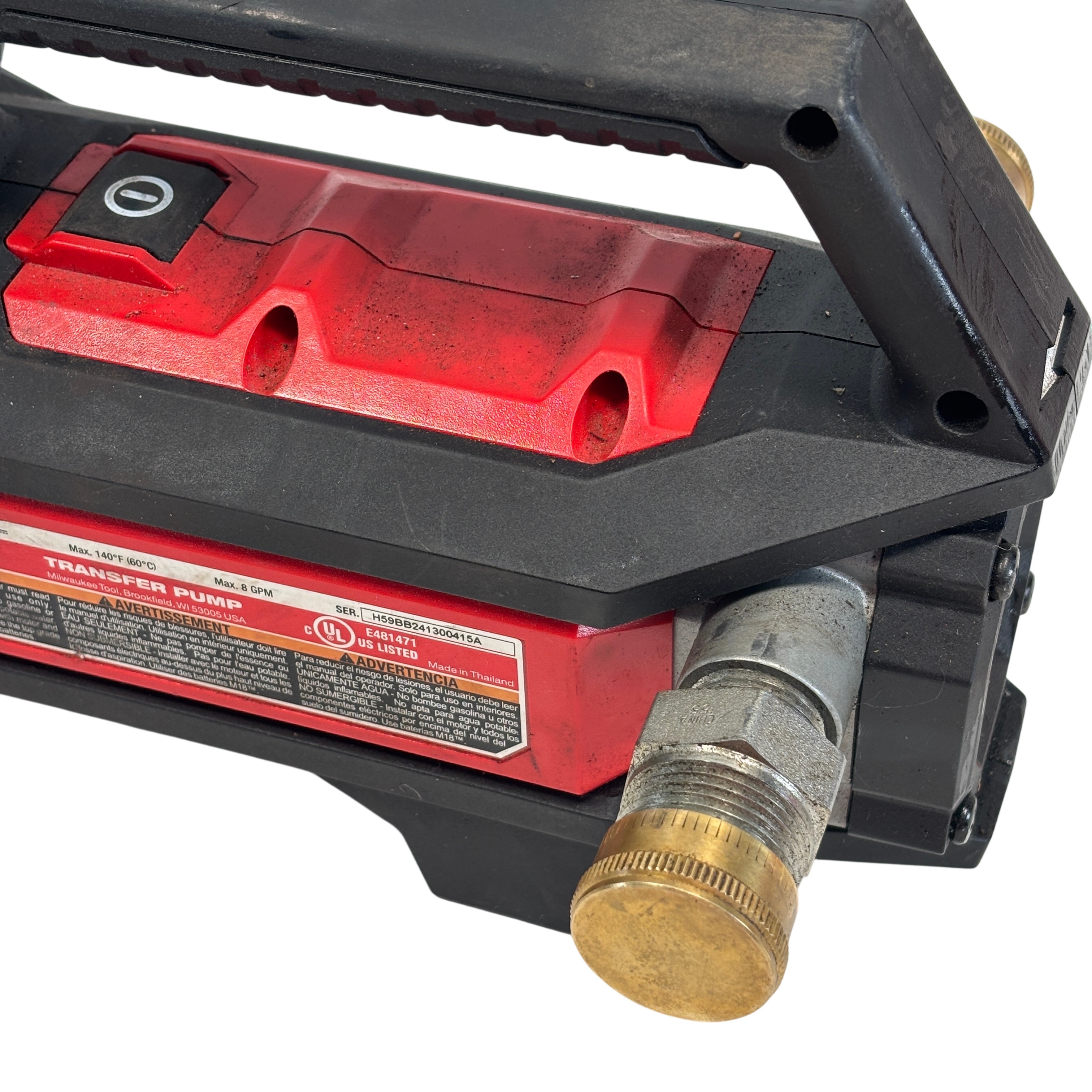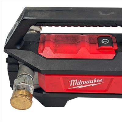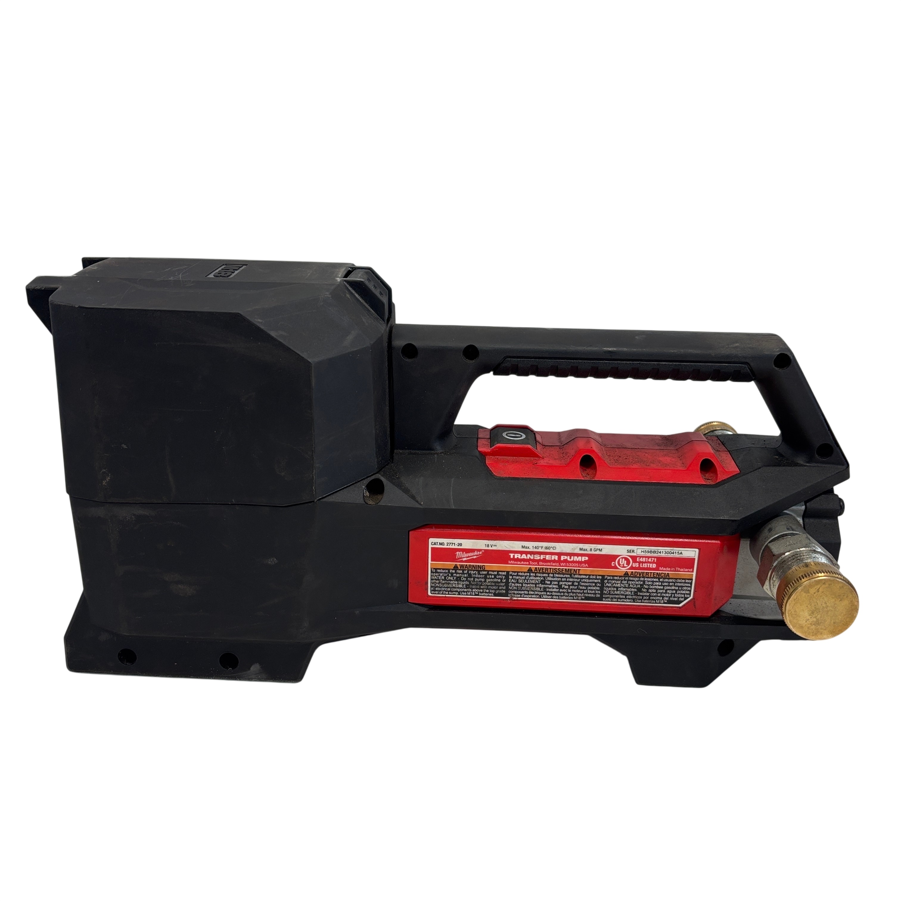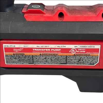 The Milwaukee 2771-20 M18 Cordless Transfer Pump is a durable, battery-powered pump designed for indoor use. Operating at 18 volts, this pump delivers a maximum flow rate of 8 gallons per minute and can handle water temperatures up to 140°F (60°C). It is specifically designed for pumping water only and is non-submersible, making it ideal for transferring water safely without the risk of pumping gasoline or other flammable liquids. Its compact and robust design ensures reliable performance for various water transfer tasks.