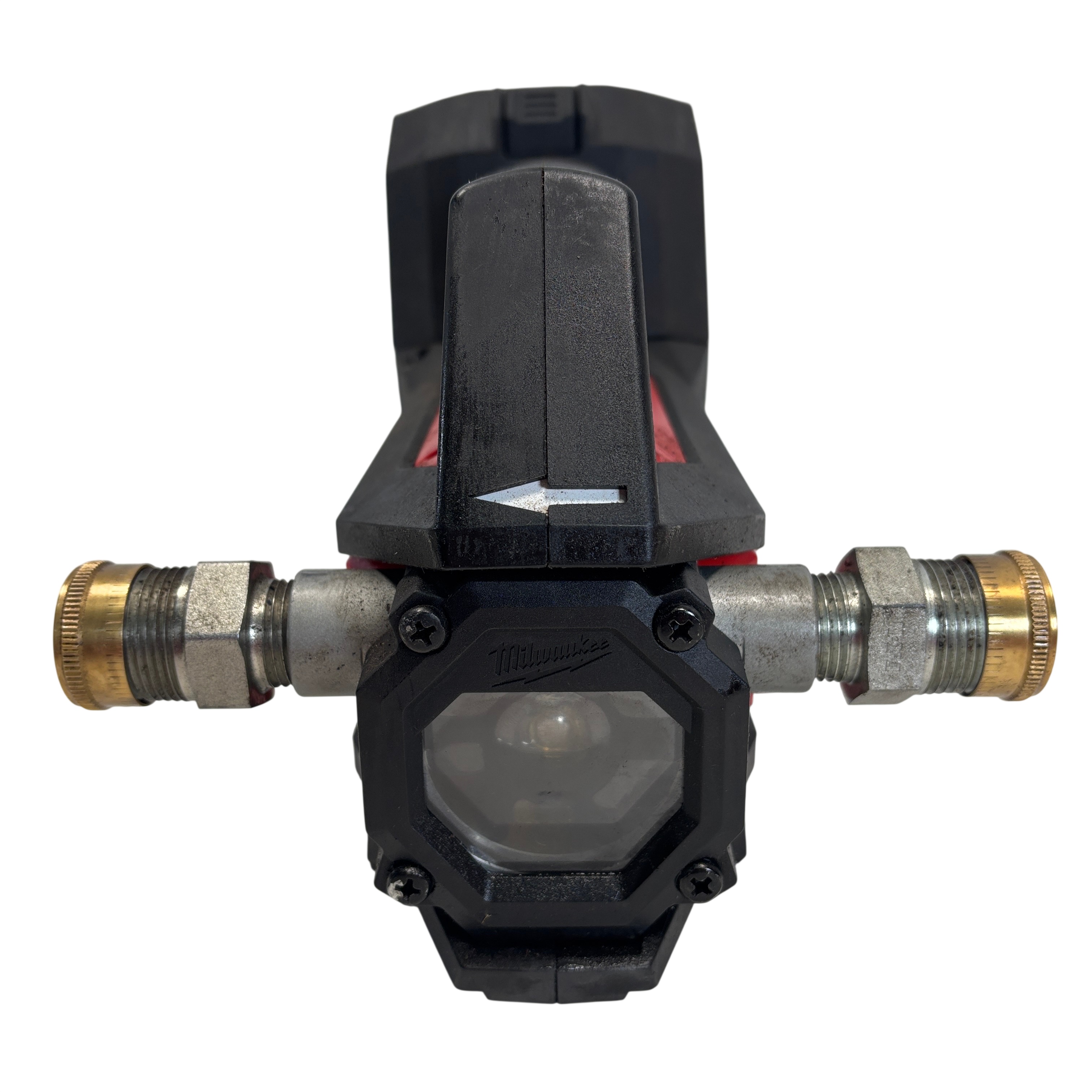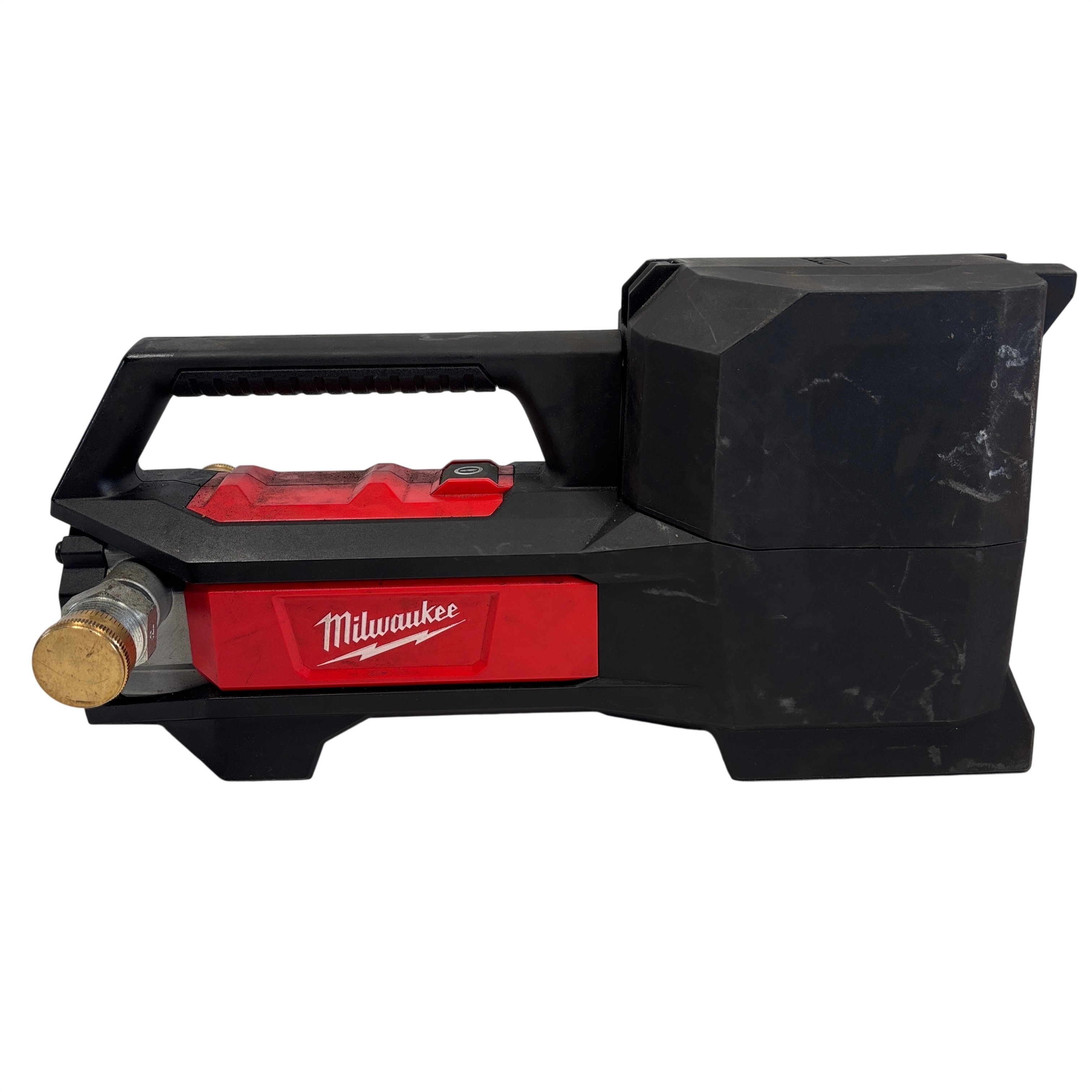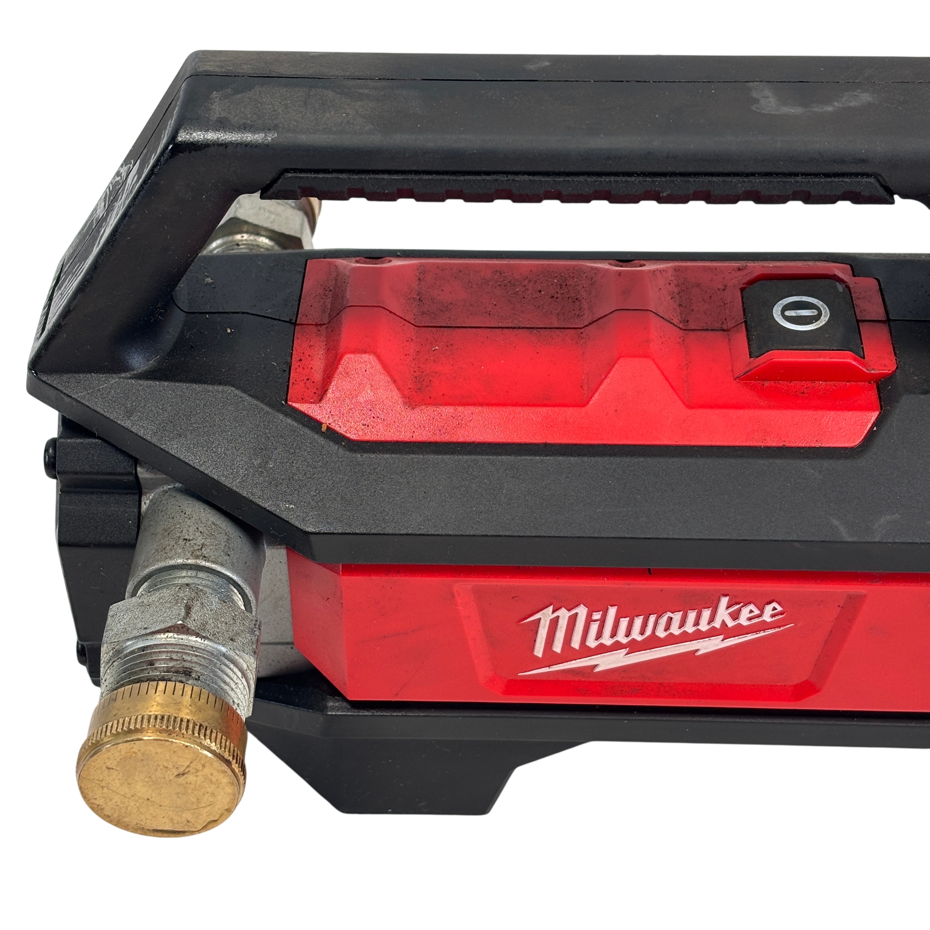 The Milwaukee 2771-20 M18 Cordless Transfer Pump is a durable, battery-powered pump designed for indoor use. Operating at 18 volts, this pump delivers a maximum flow rate of 8 gallons per minute and can handle water temperatures up to 140°F (60°C). It is specifically designed for pumping water only and is non-submersible, making it ideal for transferring water safely without the risk of pumping gasoline or other flammable liquids. Its compact and robust design ensures reliable performance for various water transfer tasks.