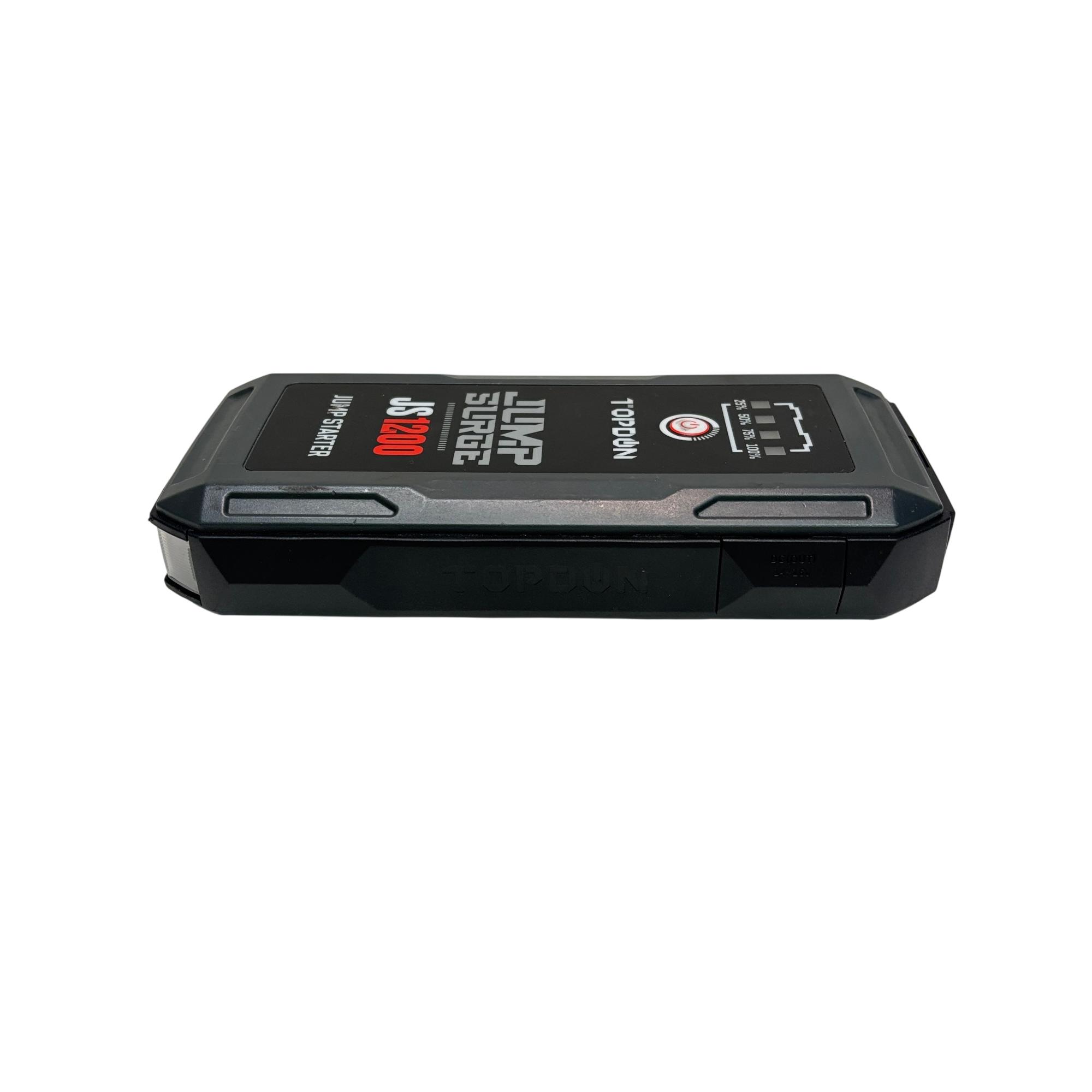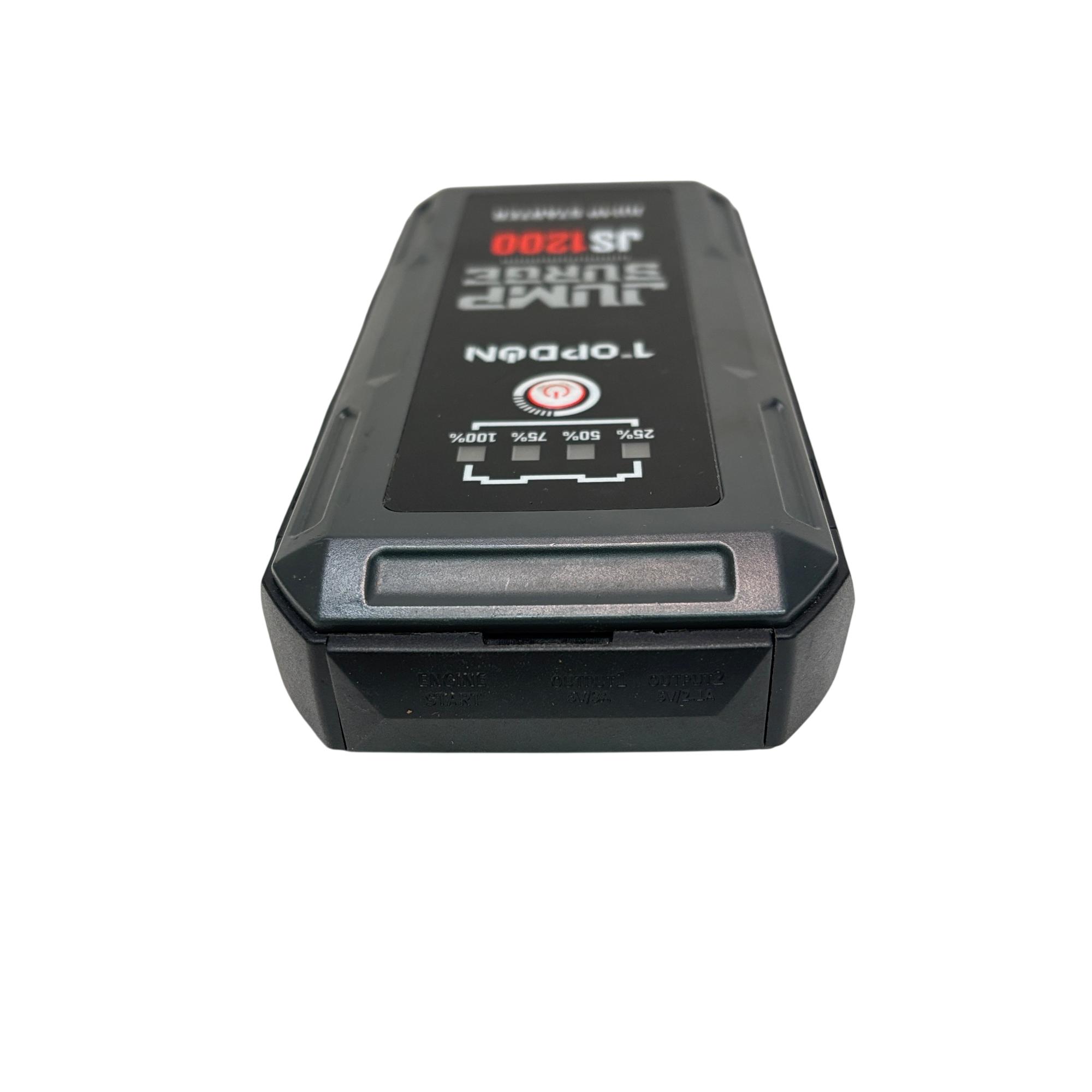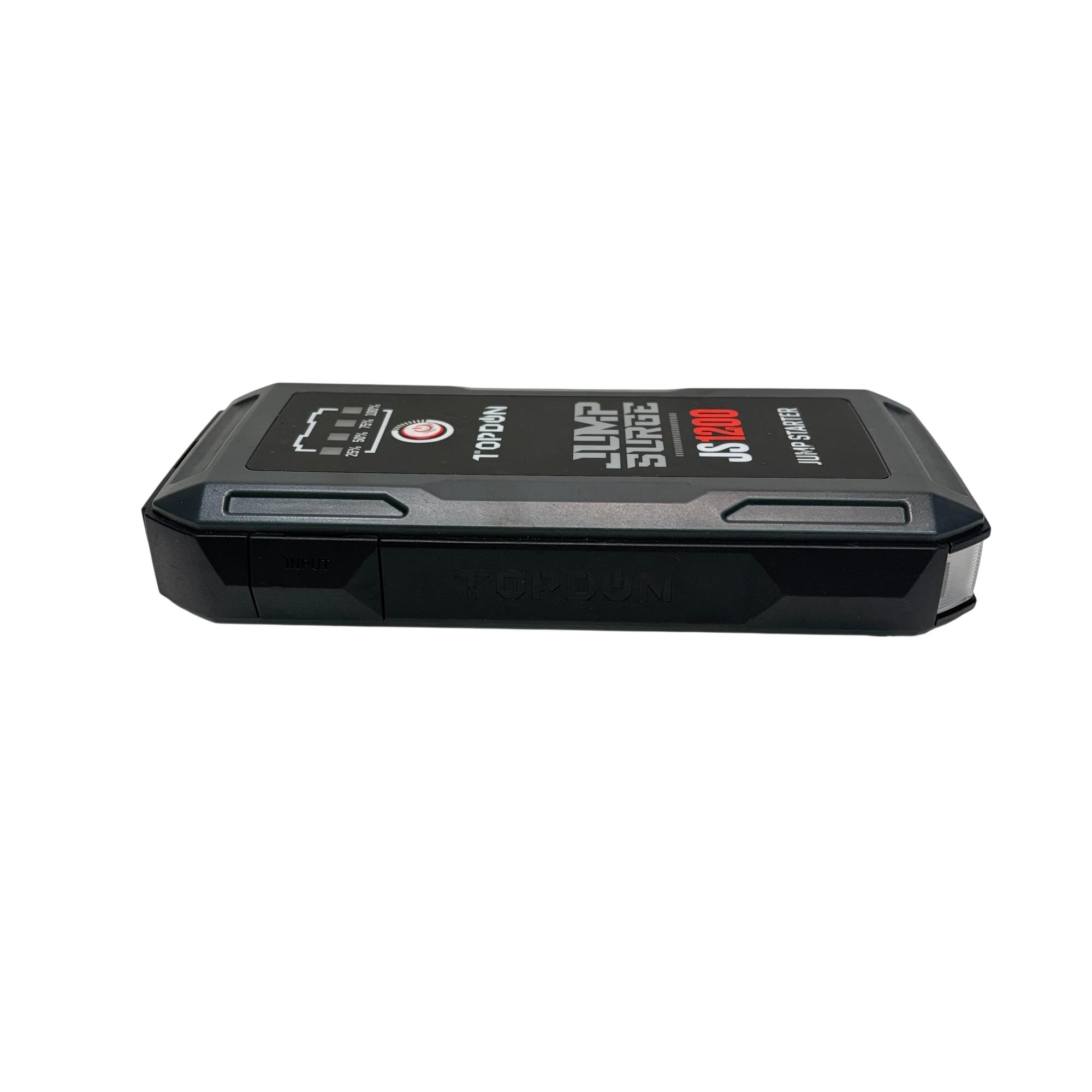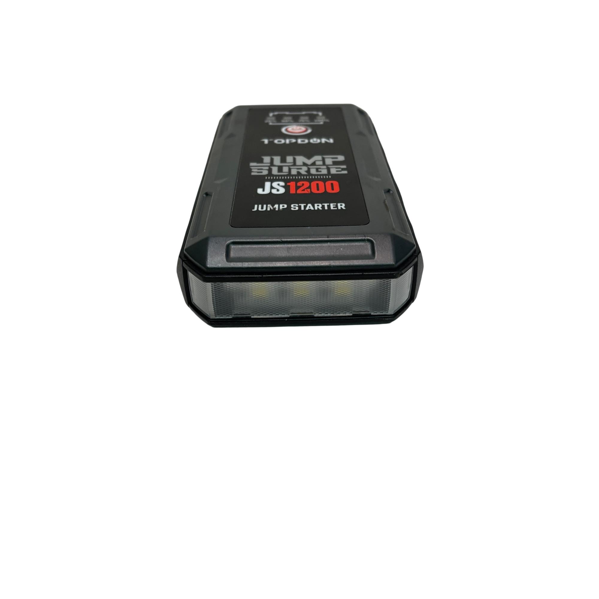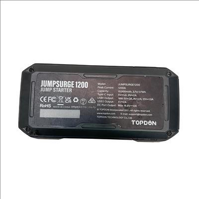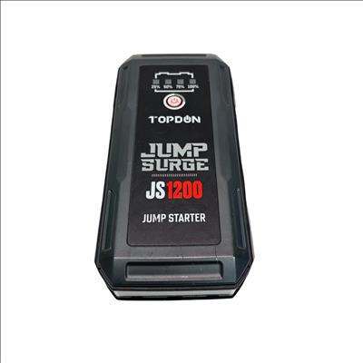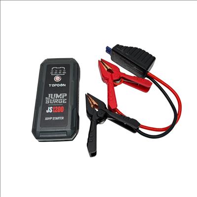 TOPDON JumpSurge JS1200 Jump Starter Power Pack delivers reliable portable power designed to jump-start vehicles quickly and safely. Featuring a compact black rectangular design with clear white text indicators, this device offers a user-friendly interface with multiple power-level indicators. Its robust construction and included jumper cables make it an essential tool for roadside emergencies and vehicle maintenance.
