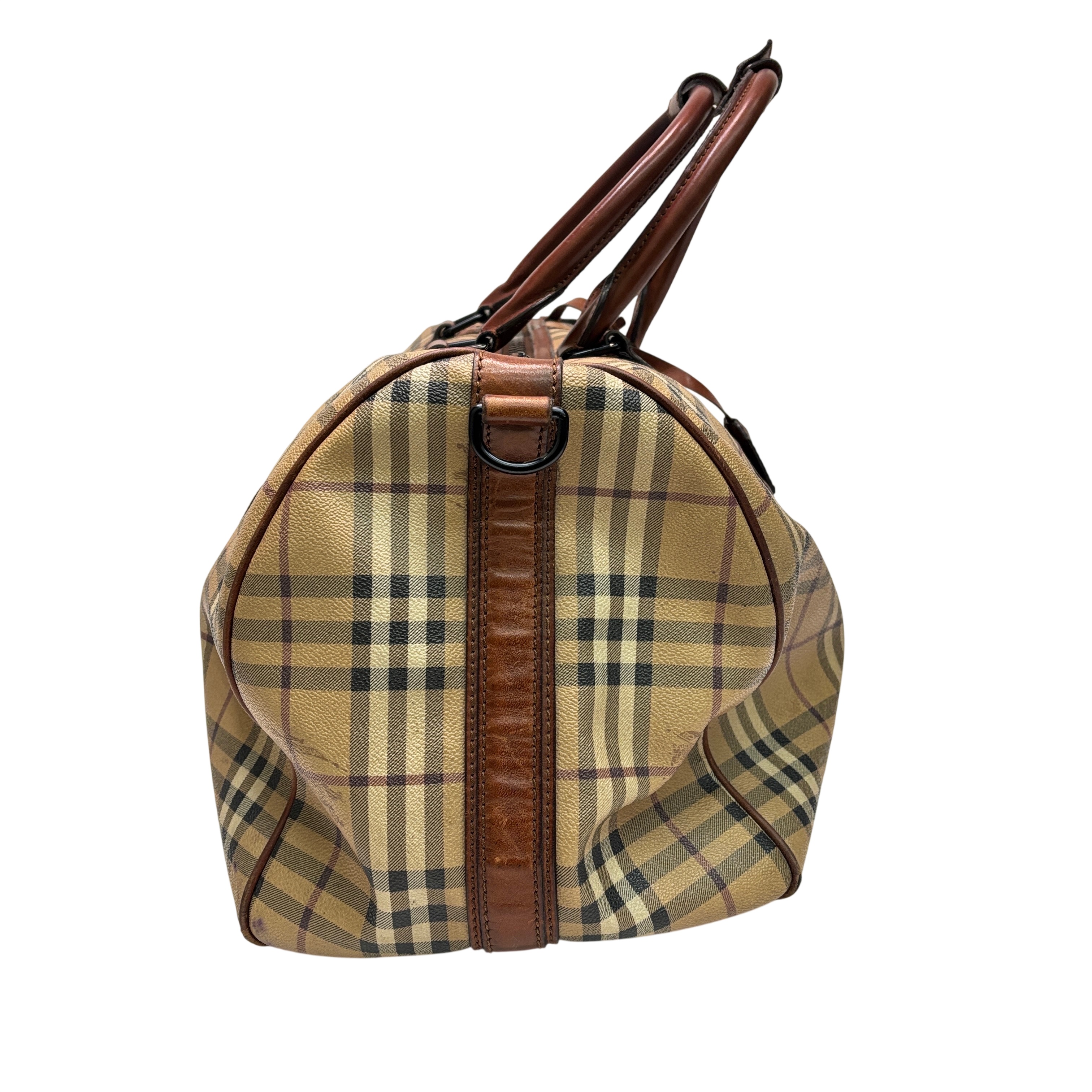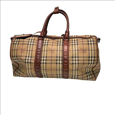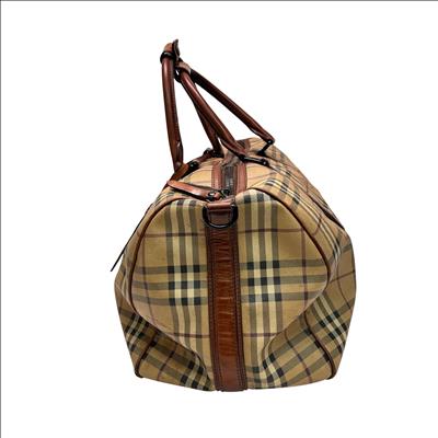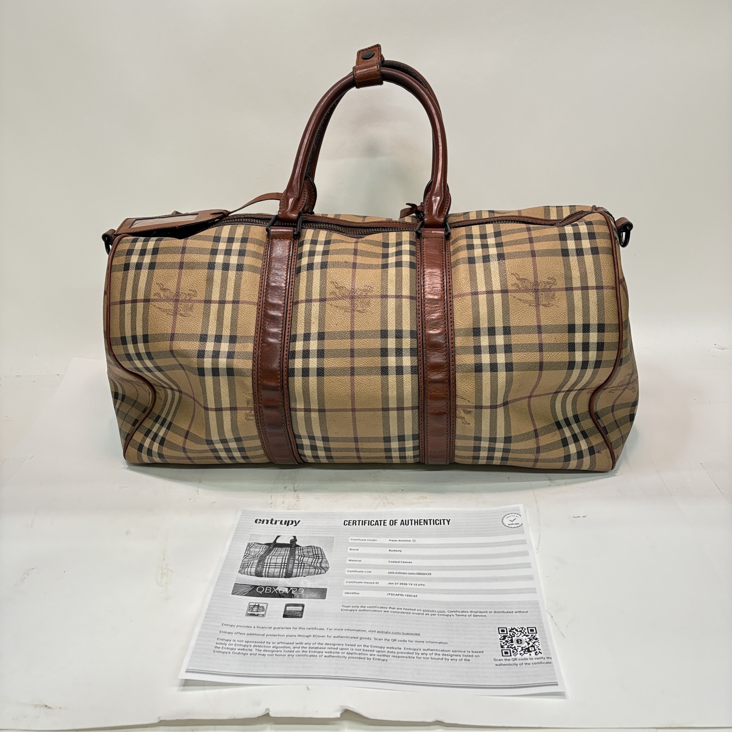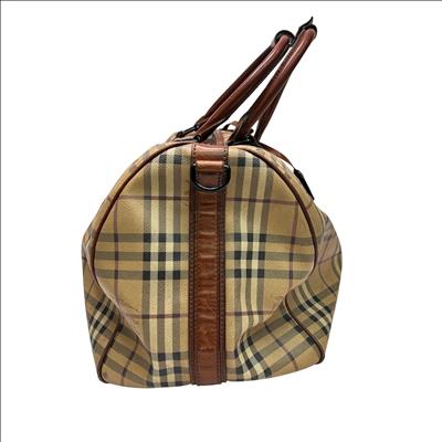 Burberry Itscapel12scat Coated Canvas Luggage is a stylish and authentic duffle bag featuring the iconic Burberry check pattern with brown leather trim. Crafted from durable coated canvas, this luggage piece offers ample space for travel essentials. It comes with a certificate of authenticity from Entrupy, ensuring genuine Burberry craftsmanship. Measuring approximately 22 inches in length, 12 inches in width, and 10 inches in height, this lightweight bag is perfect for weekend trips or carry-on use.