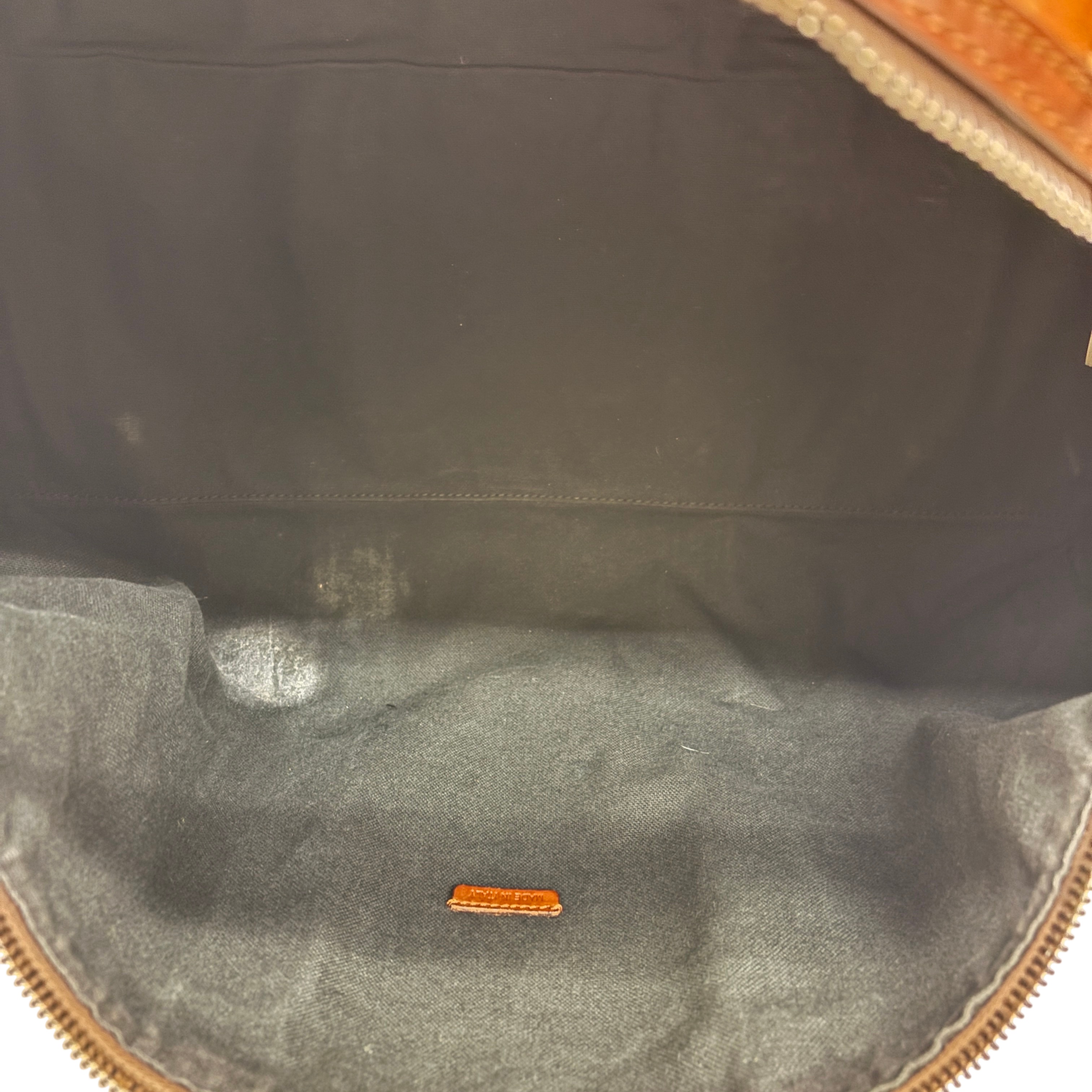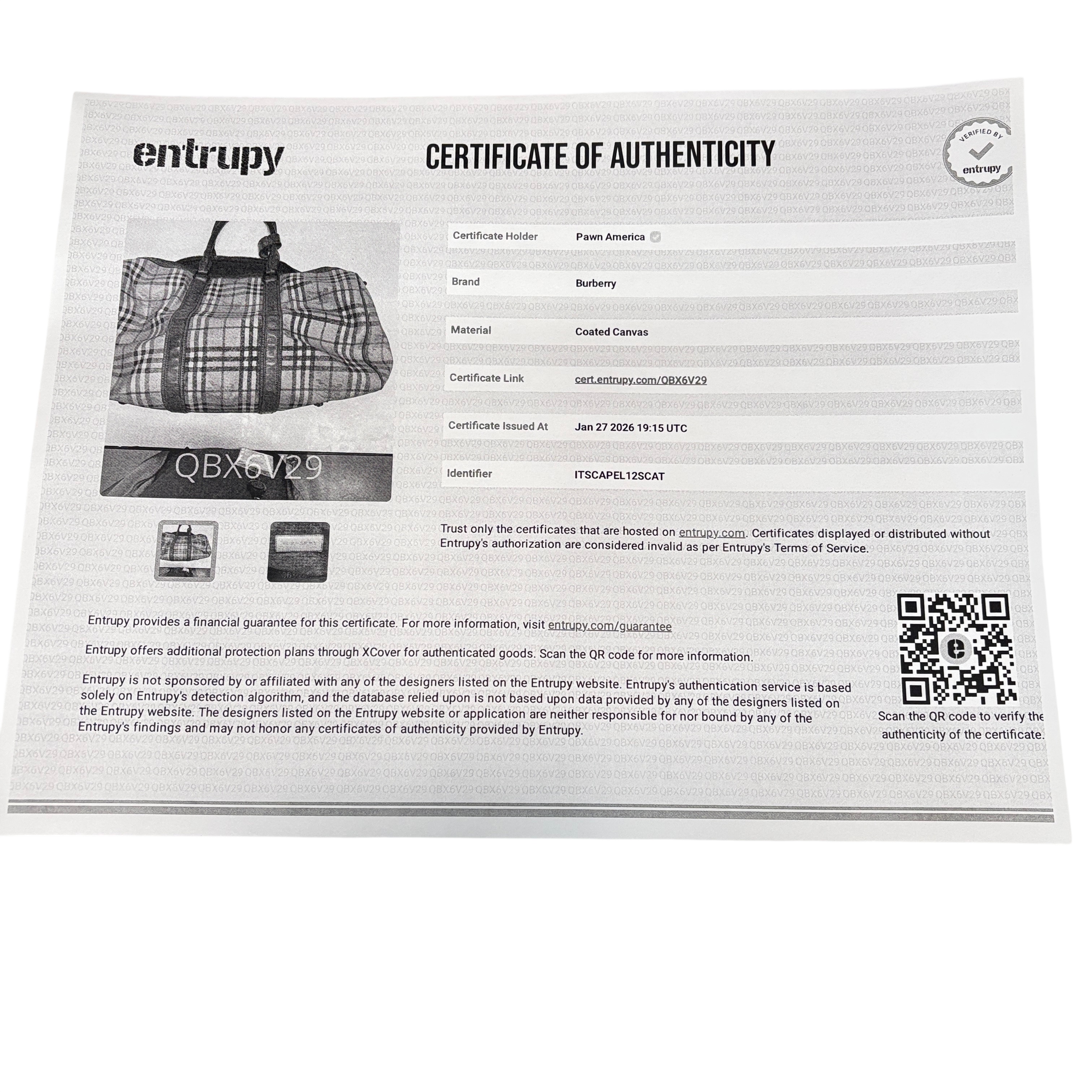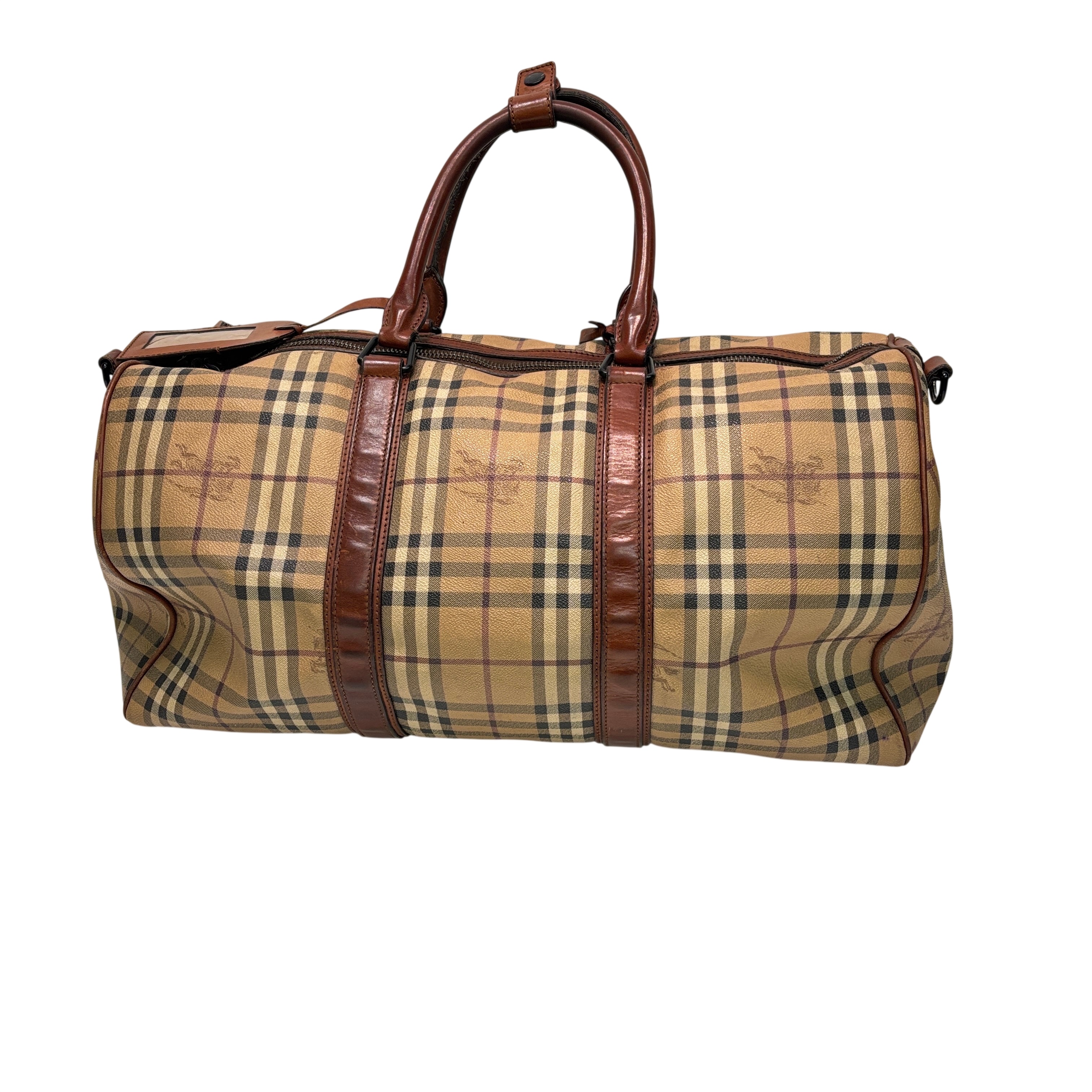 Burberry Itscapel12scat Coated Canvas Luggage is a stylish and authentic duffle bag featuring the iconic Burberry check pattern with brown leather trim. Crafted from durable coated canvas, this luggage piece offers ample space for travel essentials. It comes with a certificate of authenticity from Entrupy, ensuring genuine Burberry craftsmanship. Measuring approximately 22 inches in length, 12 inches in width, and 10 inches in height, this lightweight bag is perfect for weekend trips or carry-on use.