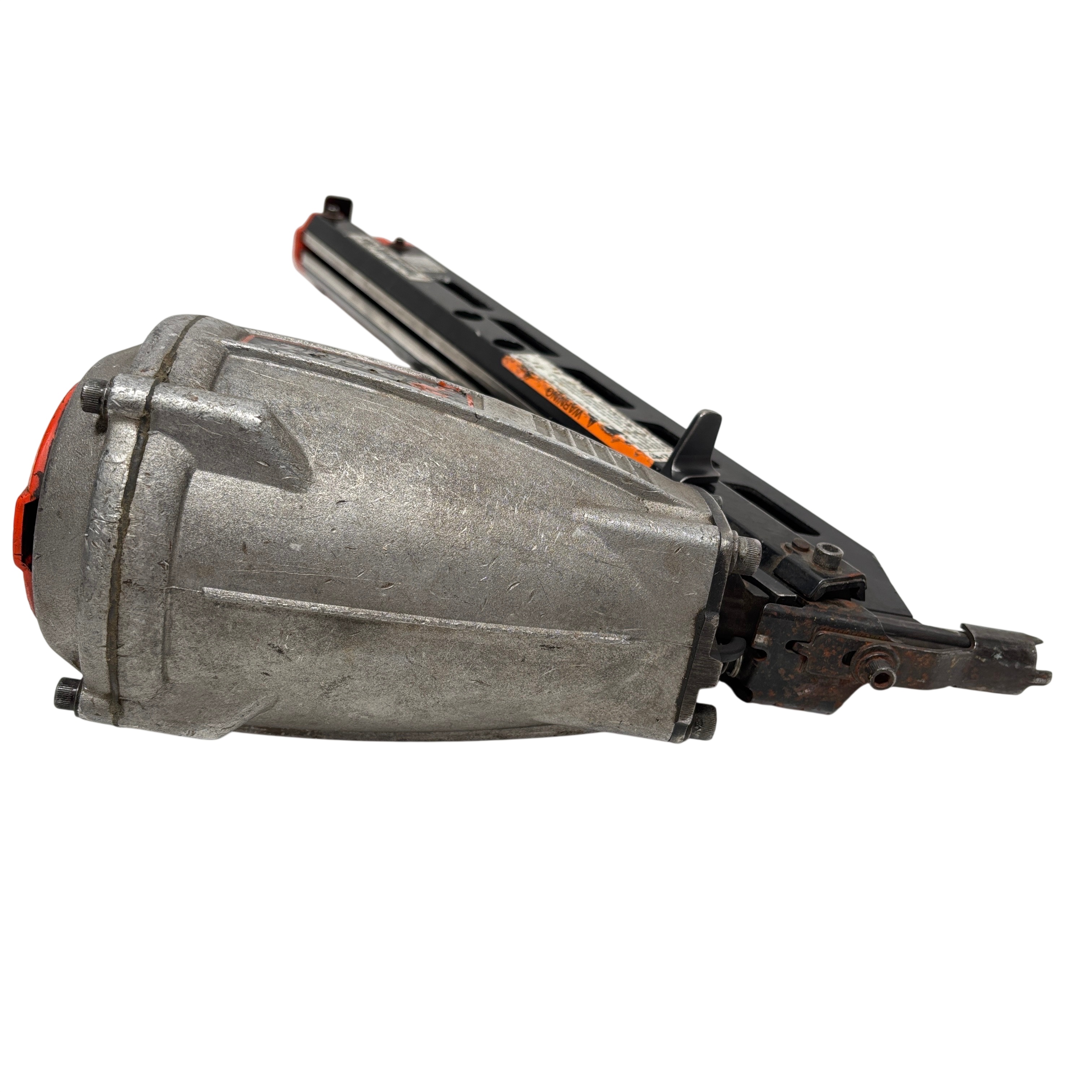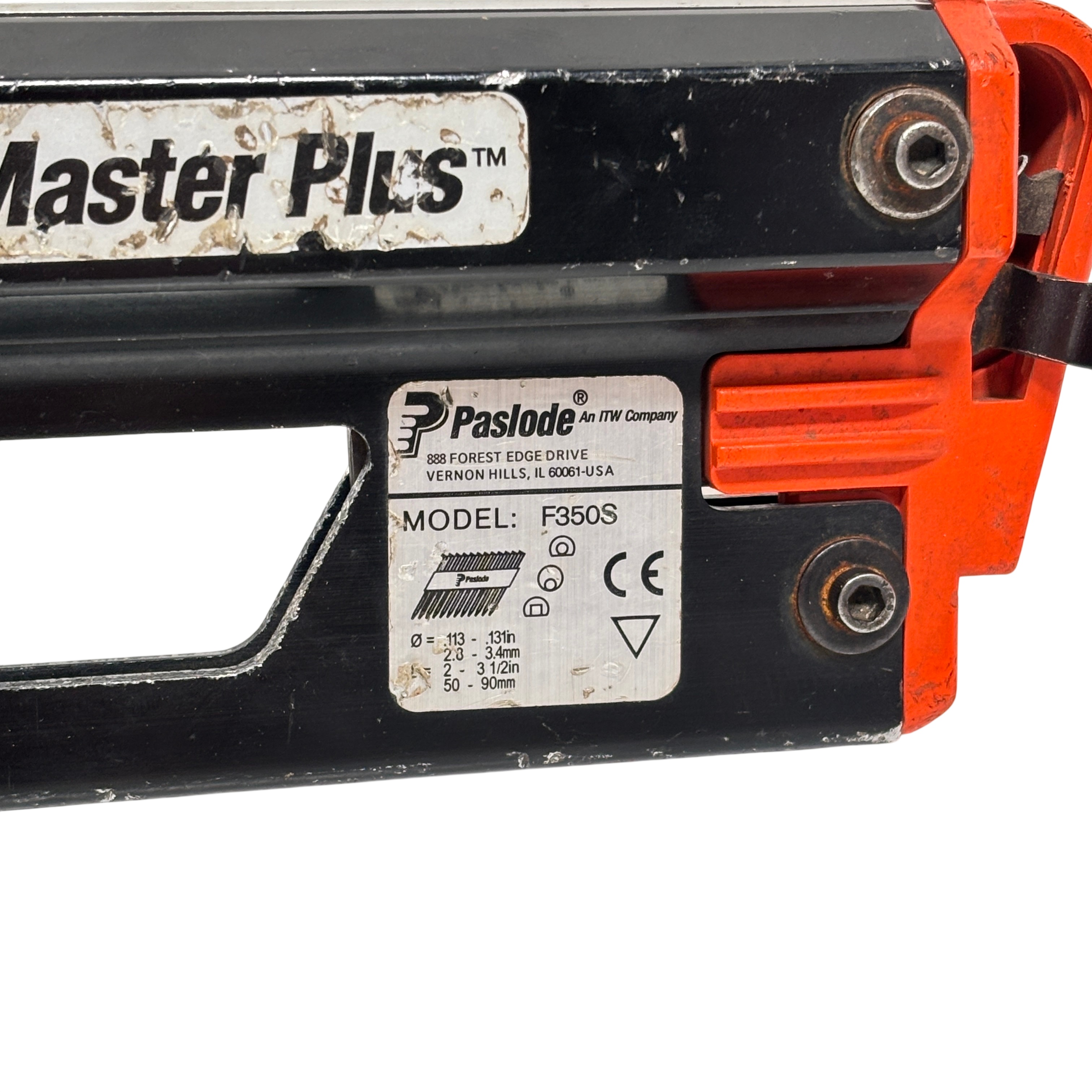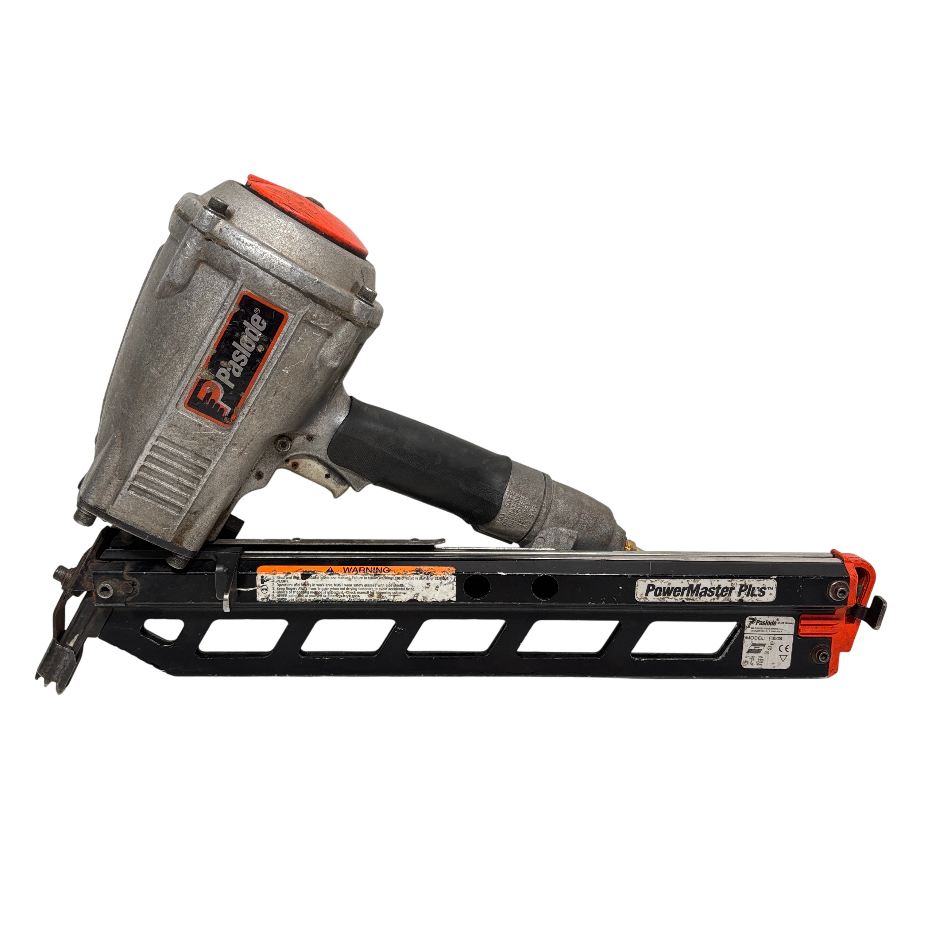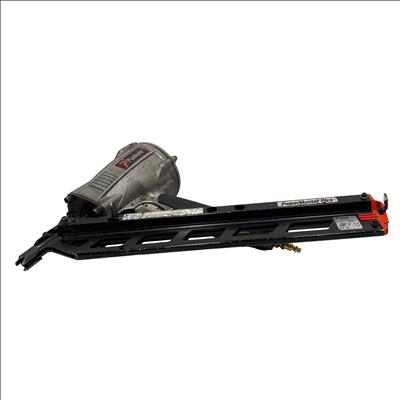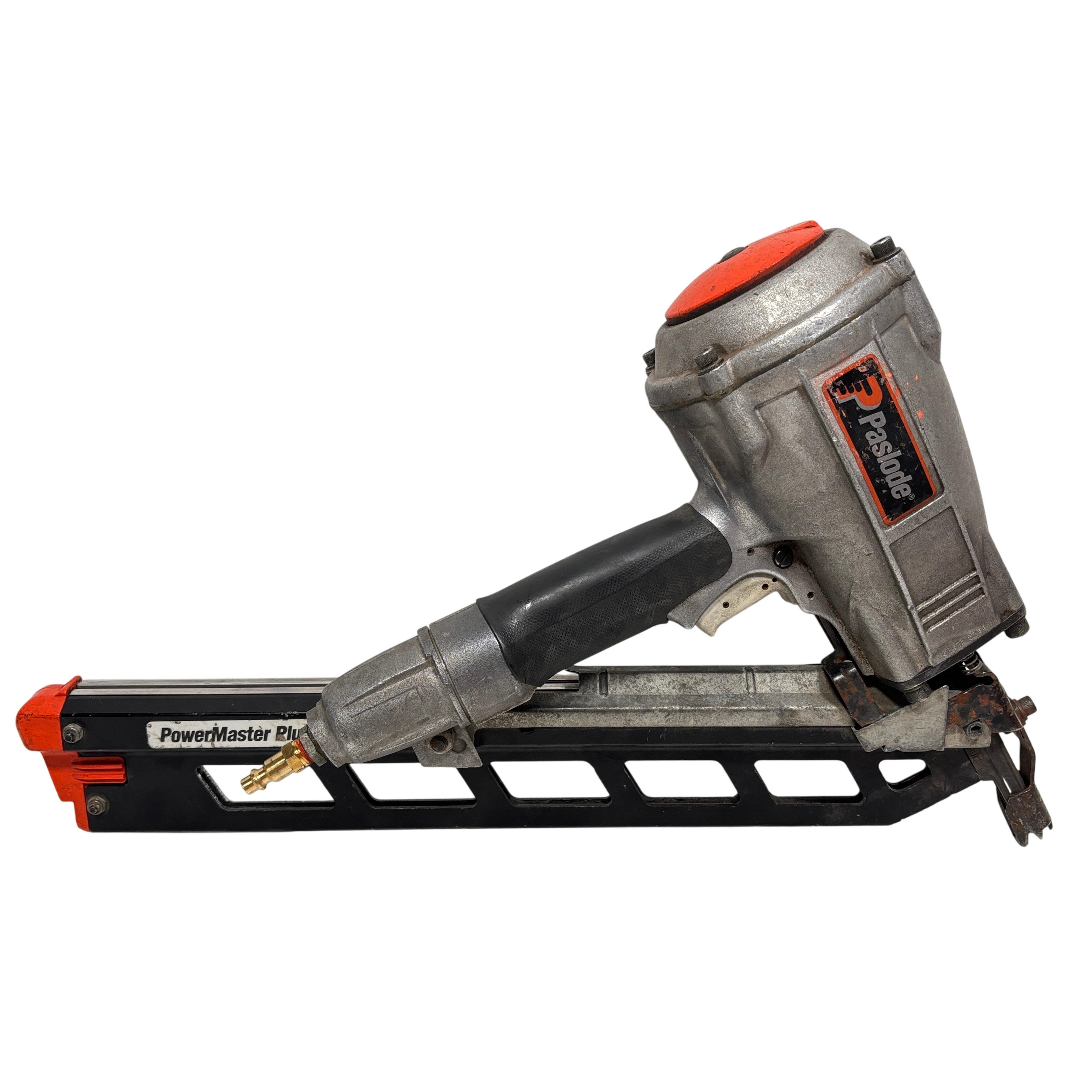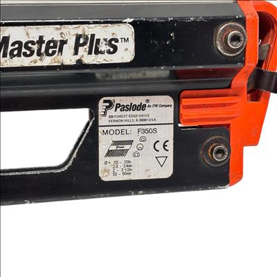 The Paslode F350S PowerMaster Plus air-powered framing nailer, item# 501000, drives paper tape framing nails from 2" to 3-1/2" in length. The F350S uses both Paslode clipped head and roundrive nails. This Paslode paper tape framing nailer features a new valve design for added durability and increased power. Other features on the Paslode F350S include a built-in rafter hook, comfortable molded hand grip, and an adjustable depth of drive to control nail depth. The Paslode F350S framing nailer is great for framing, wall sheathing, roof sheathing, floor decking and more.