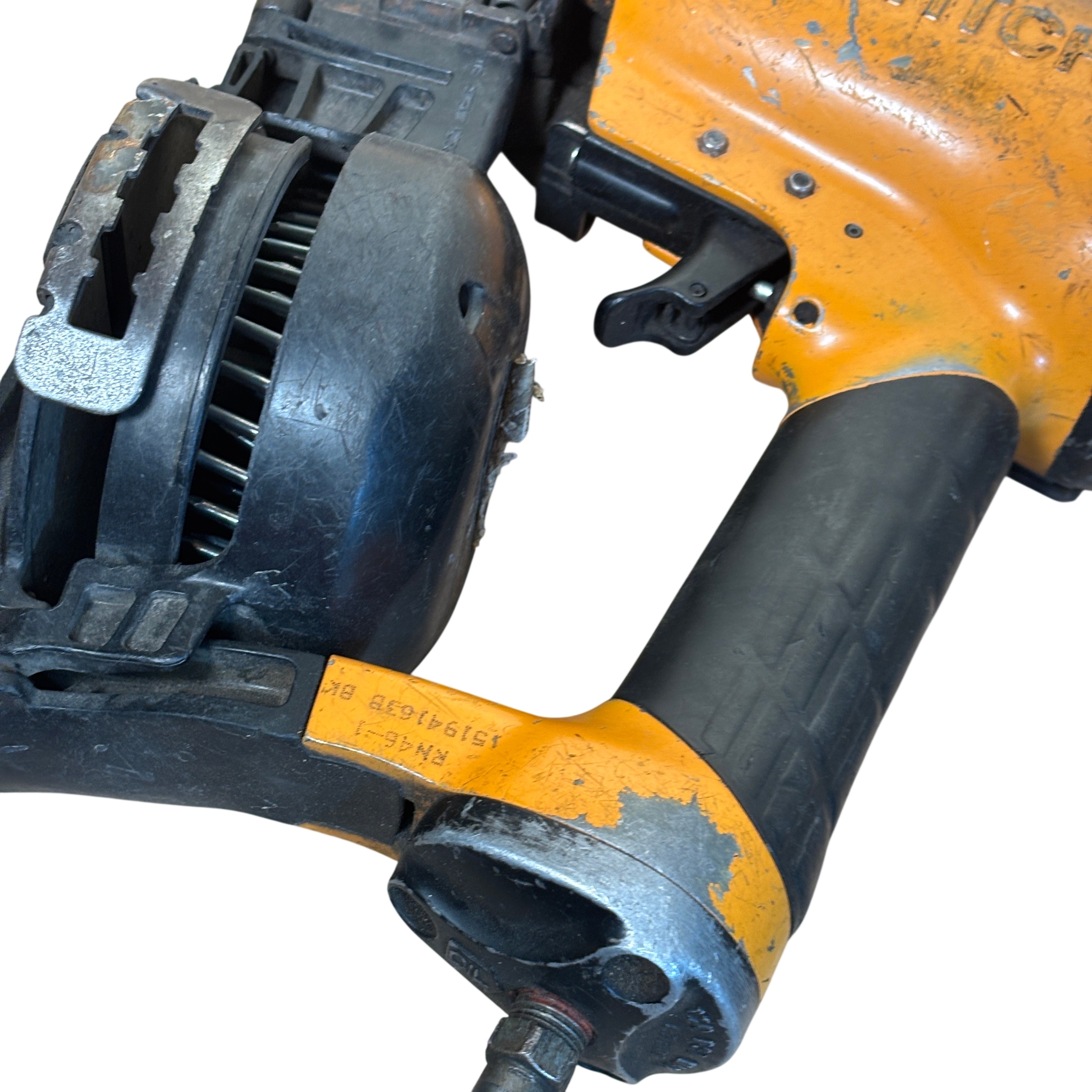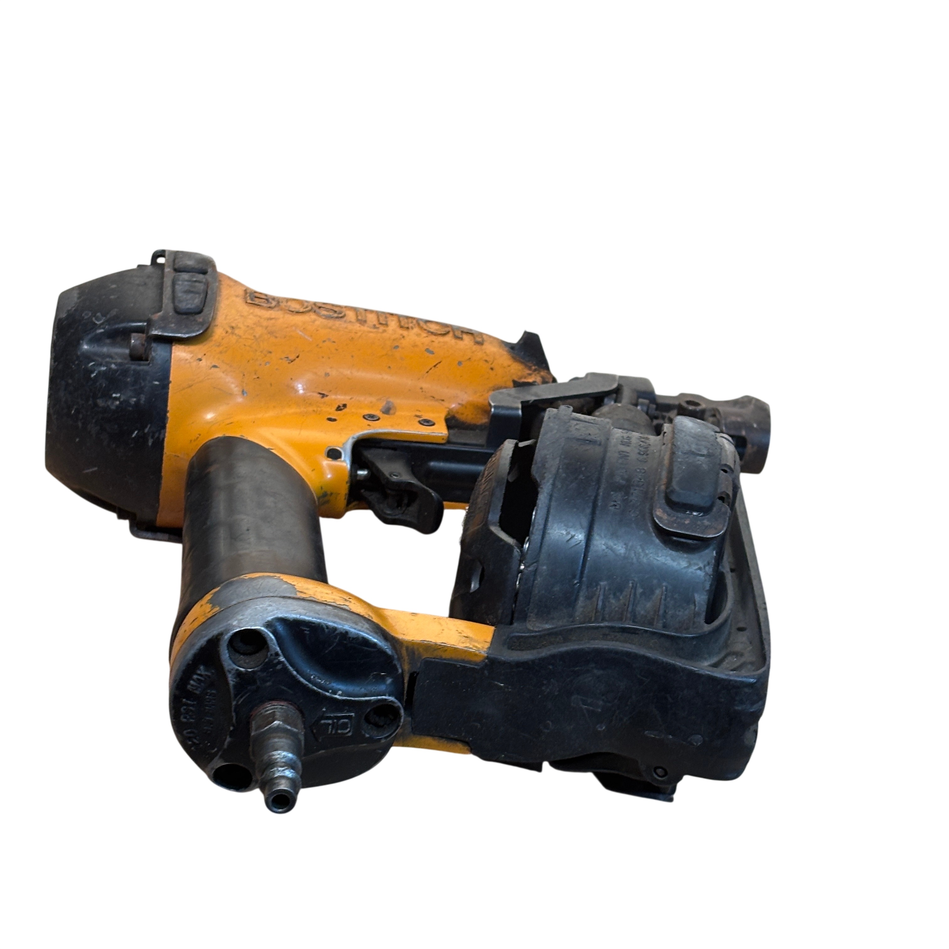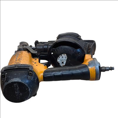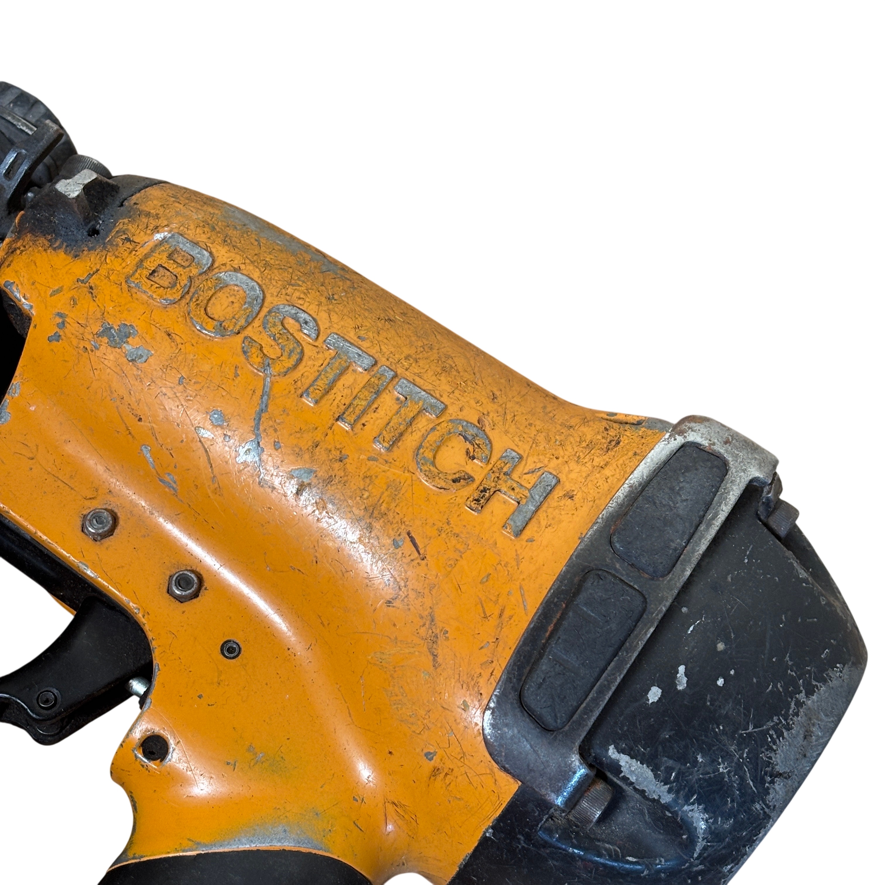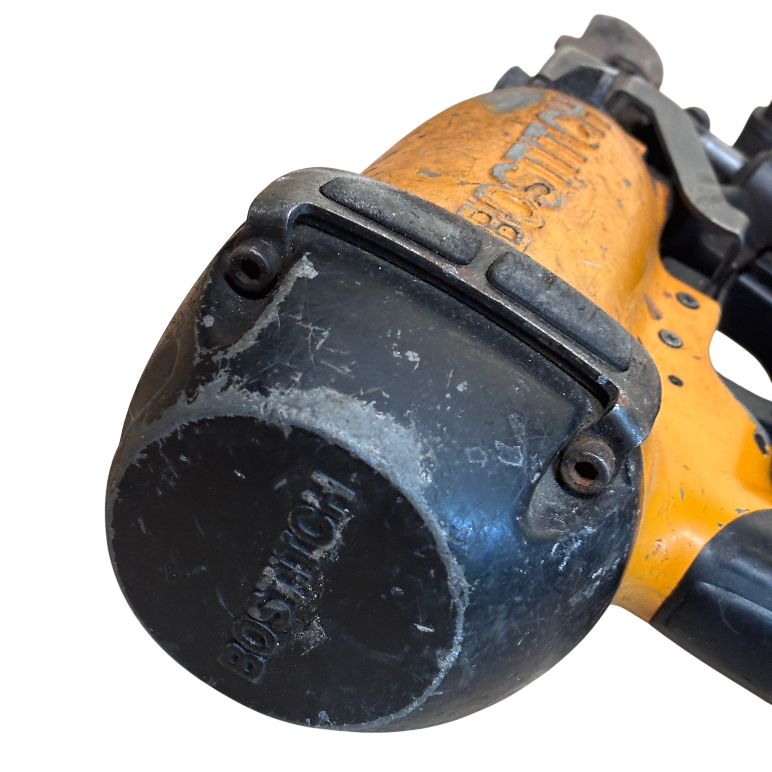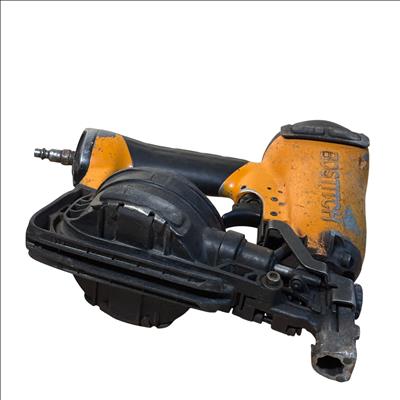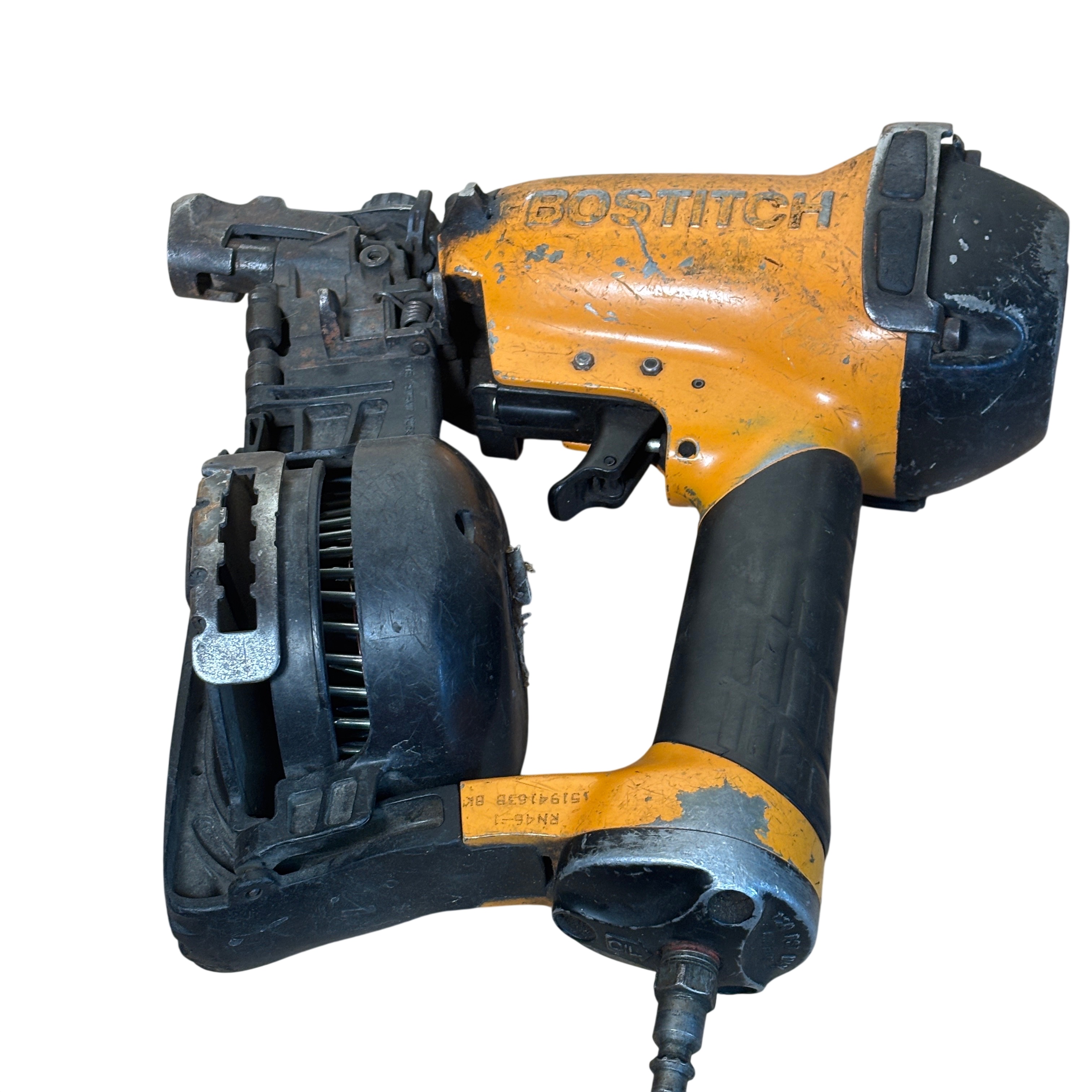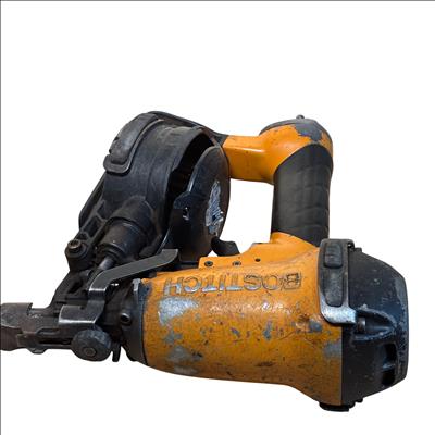 The Bostitch RN461 Coil Roofing Nailer is a pneumatic nail gun designed for efficient and reliable roofing applications. Featuring a coil magazine for roofing nails and a durable metal body with an ergonomic rubber grip, this tool delivers consistent performance powered by an air compressor. Its robust construction and user-friendly design make it ideal for professional roofers and contractors seeking a dependable nailer for heavy-duty use.