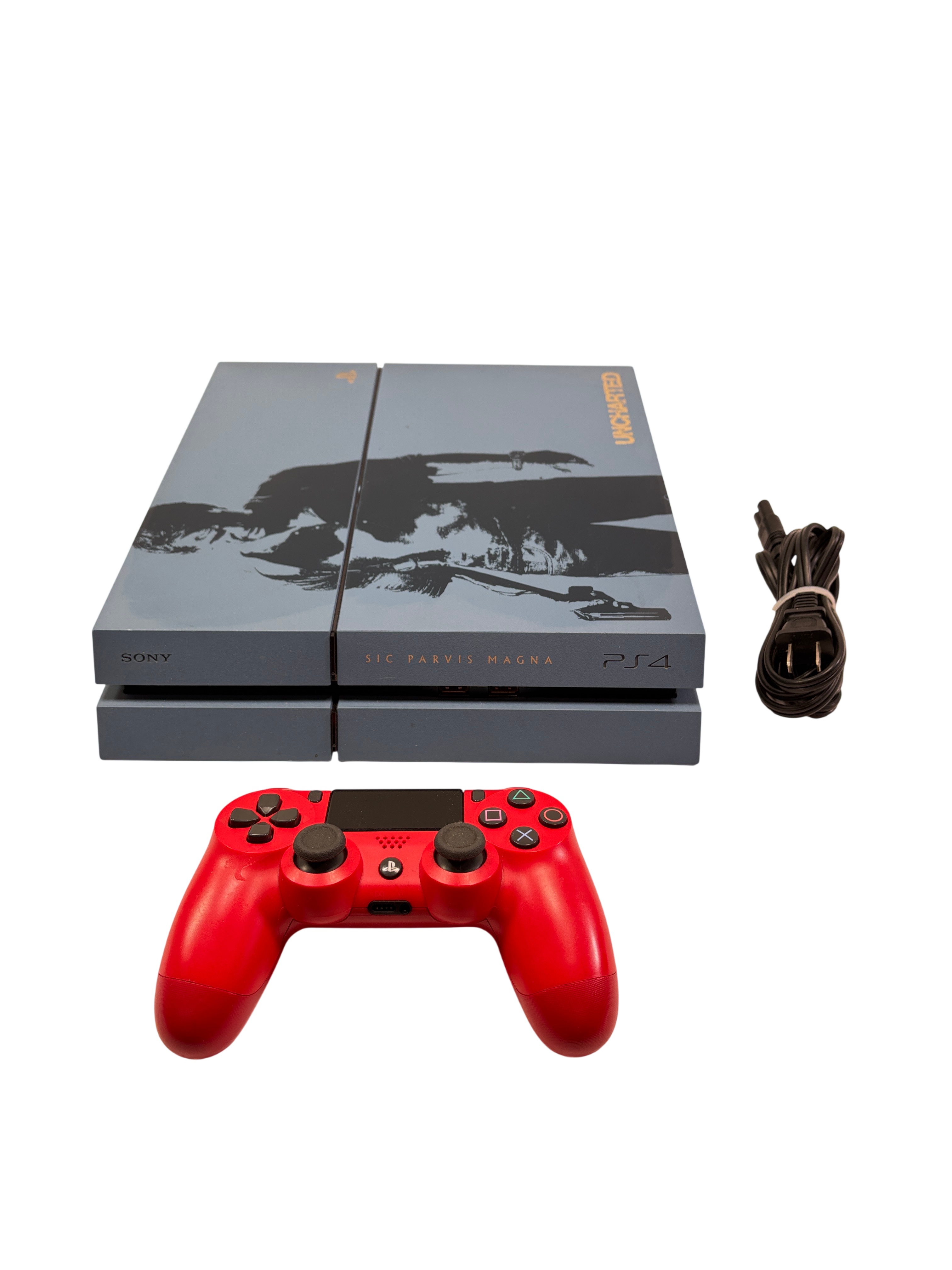 Sony PlayStation 4 Console (Model CUH-1215A) features a 500GB internal hard drive and a unique Uncharted-themed gray design. This bundle includes the console, a vibrant red DualShock 4 wireless controller, and a power cable. Designed for immersive gaming, the PS4 supports a wide range of games and multimedia applications with reliable power input of 100-240V at 230W. Its compact dimensions and iconic design make it a great addition for gamers seeking both performance and style.