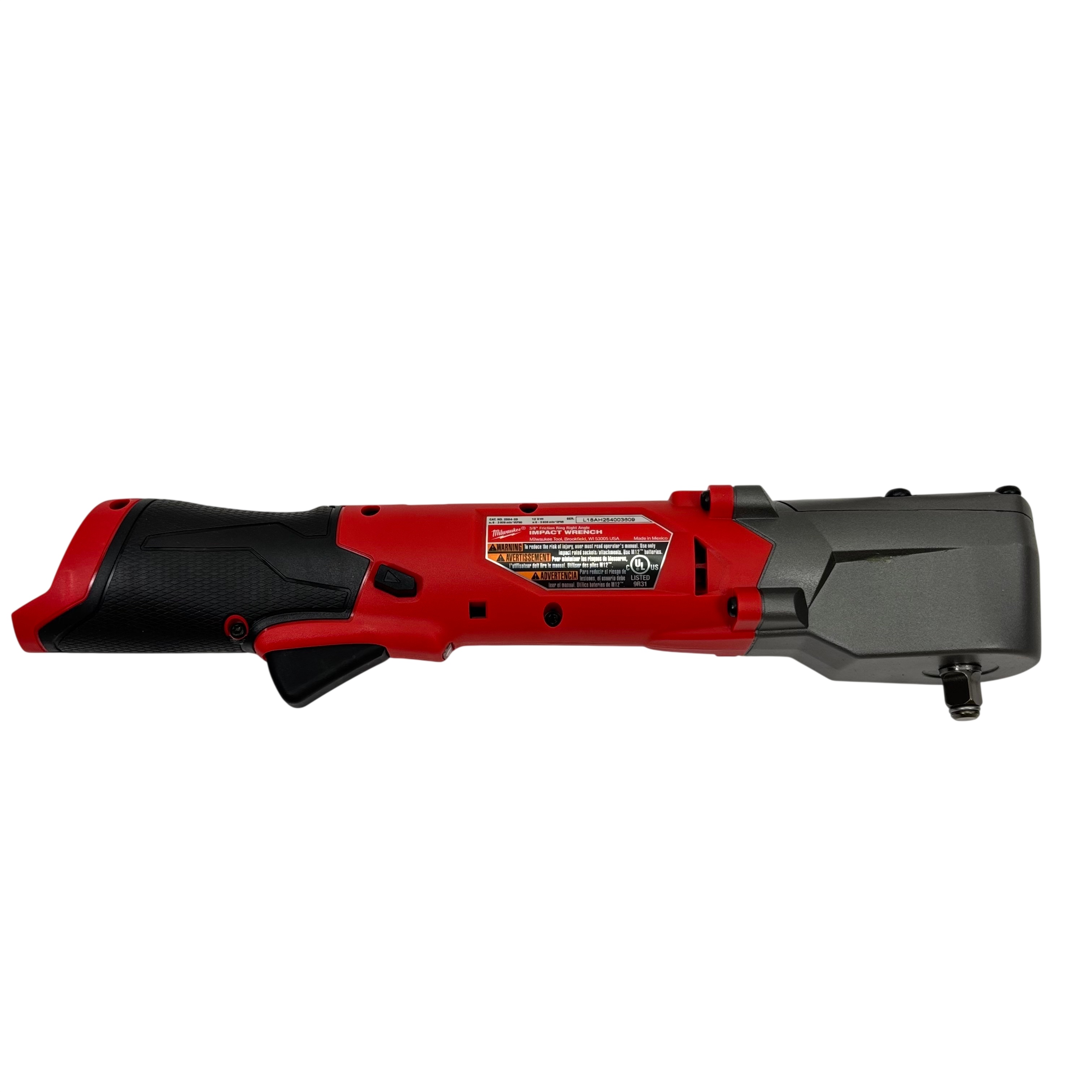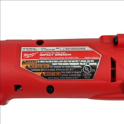 The Milwaukee M12 FUEL 3/8" Friction Ring Right Angle Impact Wrench delivers powerful performance with a 12V brushless motor capable of up to 3,000 RPM and 3,600 impacts per minute. Designed for tight spaces, its compact right angle head and friction ring anvil provide excellent control and versatility. This tool is compatible with Milwaukee's M12 battery system (battery and charger sold separately), making it a perfect addition for professionals needing a lightweight, efficient cordless impact wrench for automotive and mechanical applications.