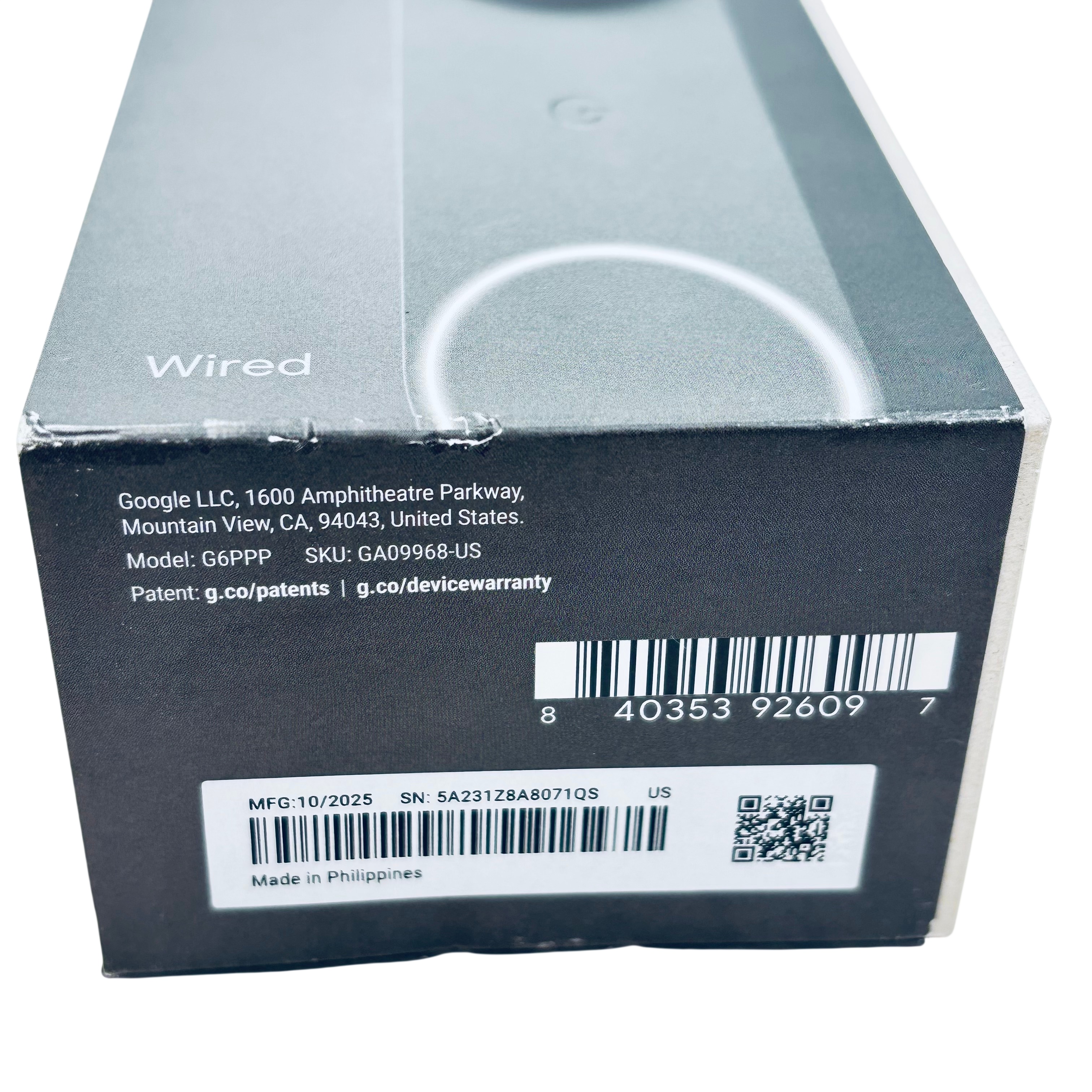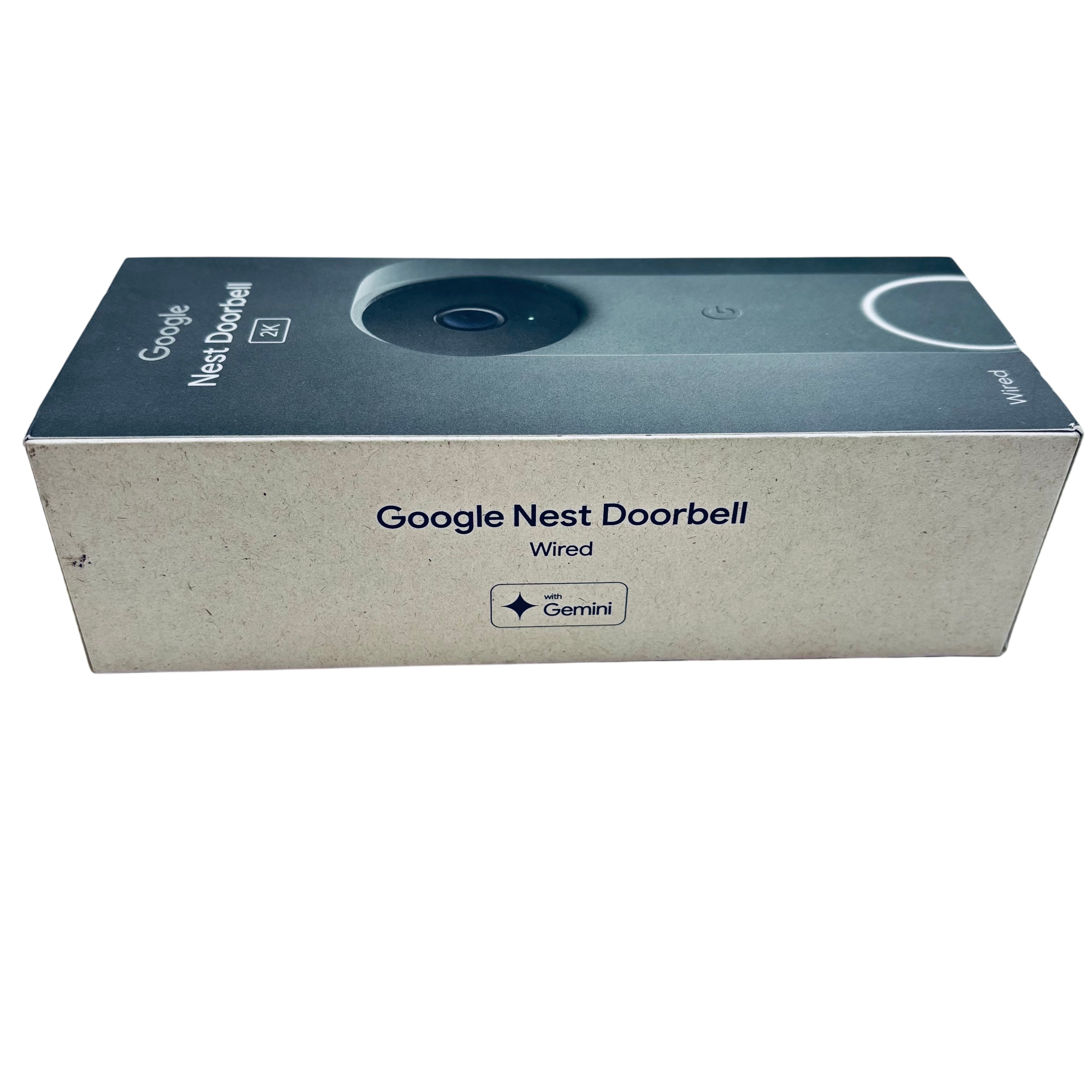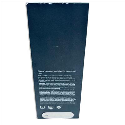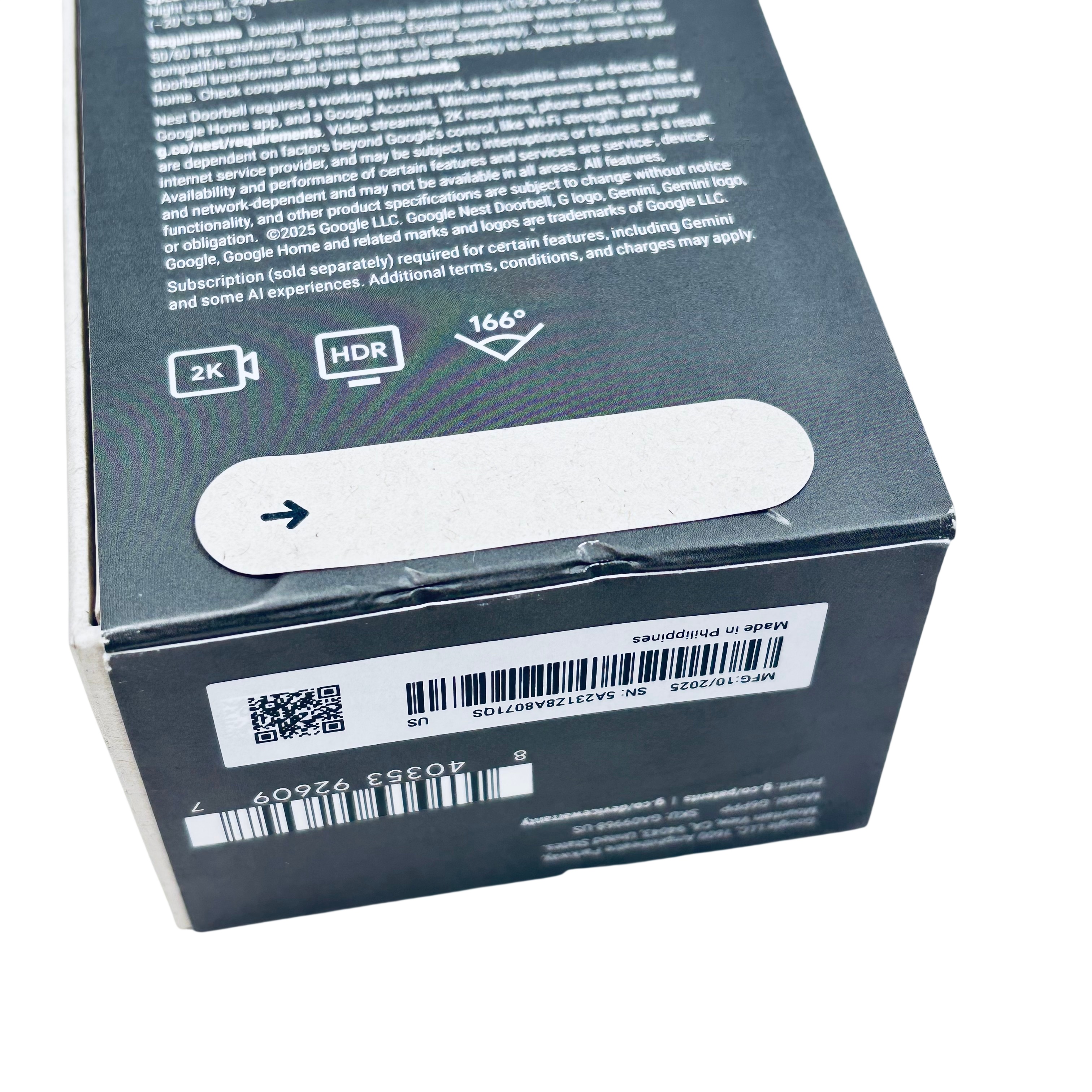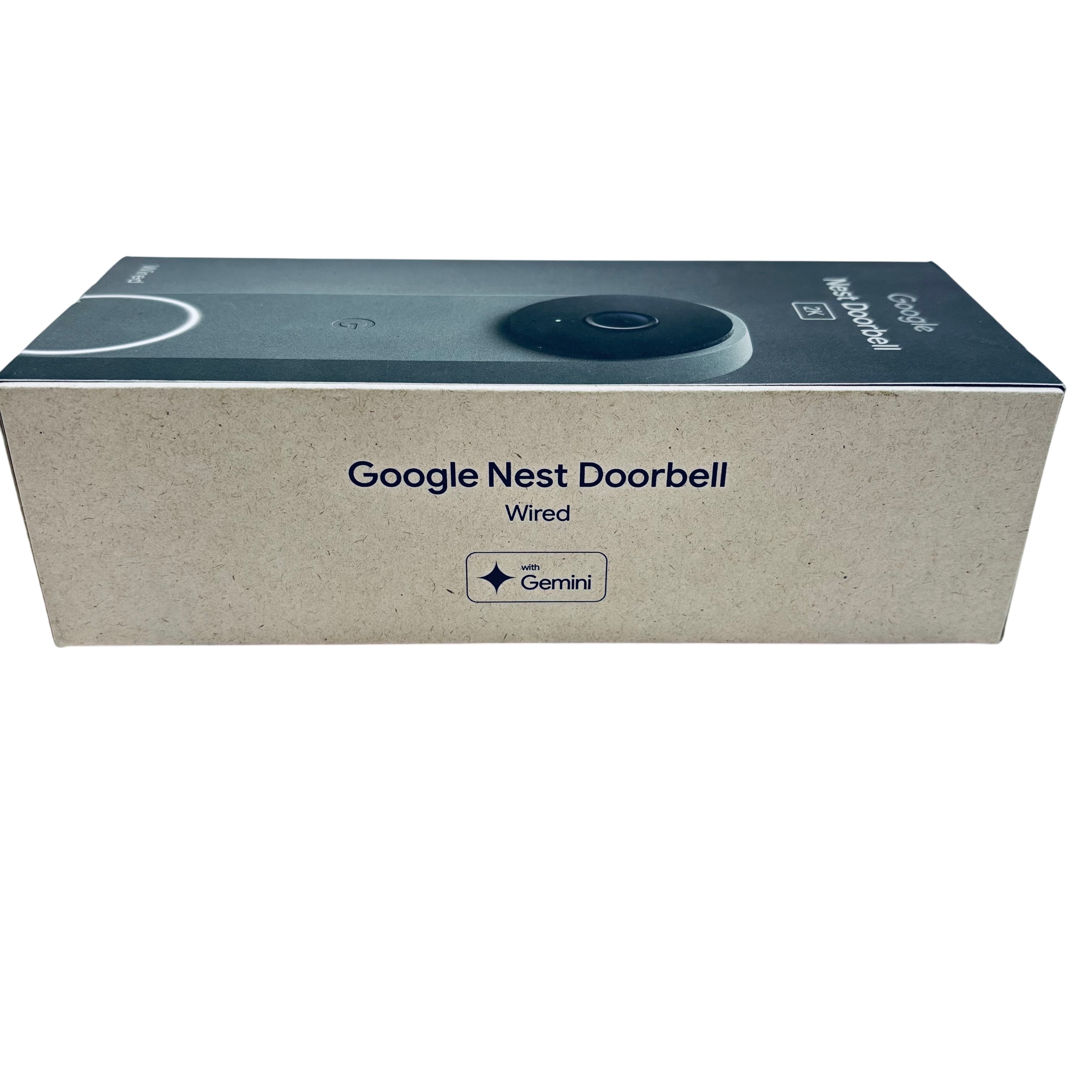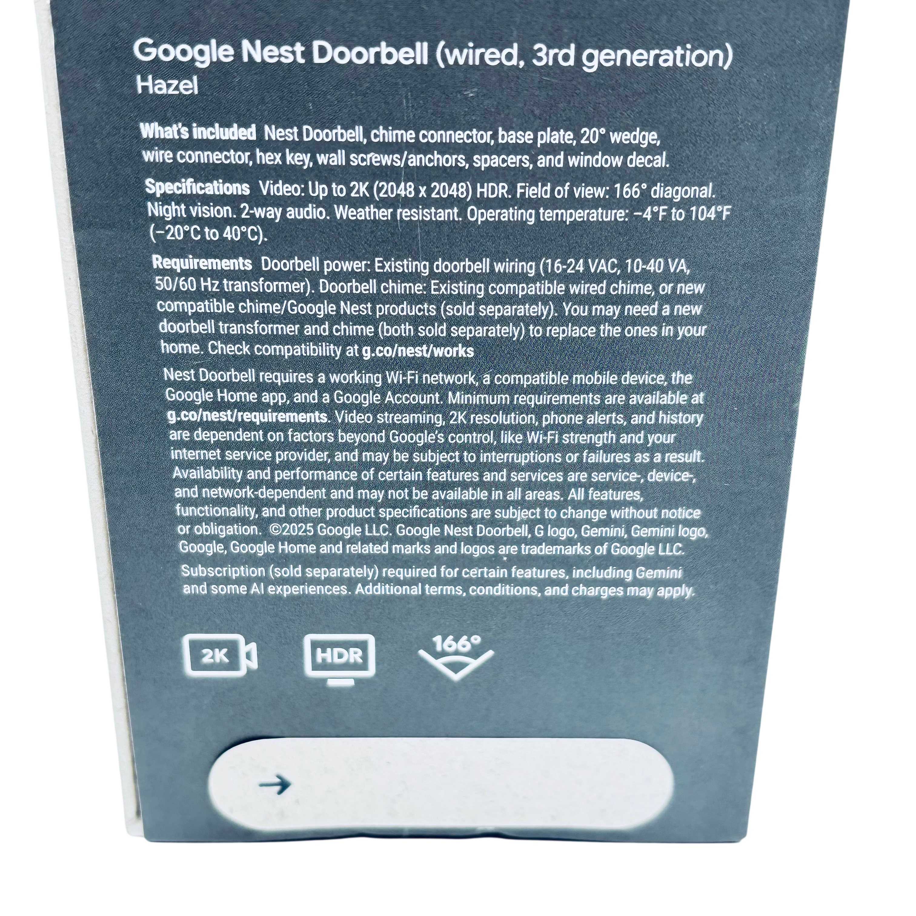 Google Nest Doorbell Wired 3rd Generation (Model G6PPP) offers high-resolution 2K HDR video with a wide 166° diagonal field of view, providing clear and detailed monitoring of your front door. This wired video doorbell features night vision and two-way audio for seamless communication with visitors. Designed for outdoor use, it is weather resistant and operates on existing doorbell wiring (16-24 VAC). The package includes the doorbell, chime connector, base plate, wedge, wire connector, hex key, screws, anchors, spacers, and a window decal for easy installation. Ideal for enhancing home security with smart features and reliable wired power.