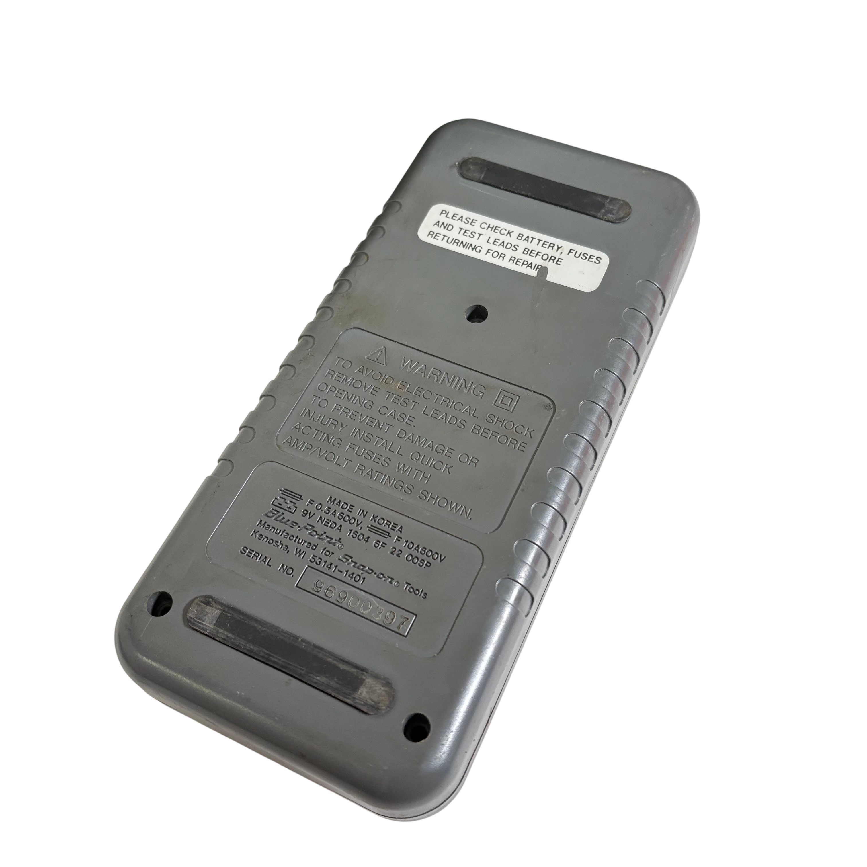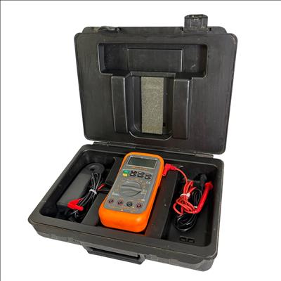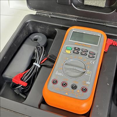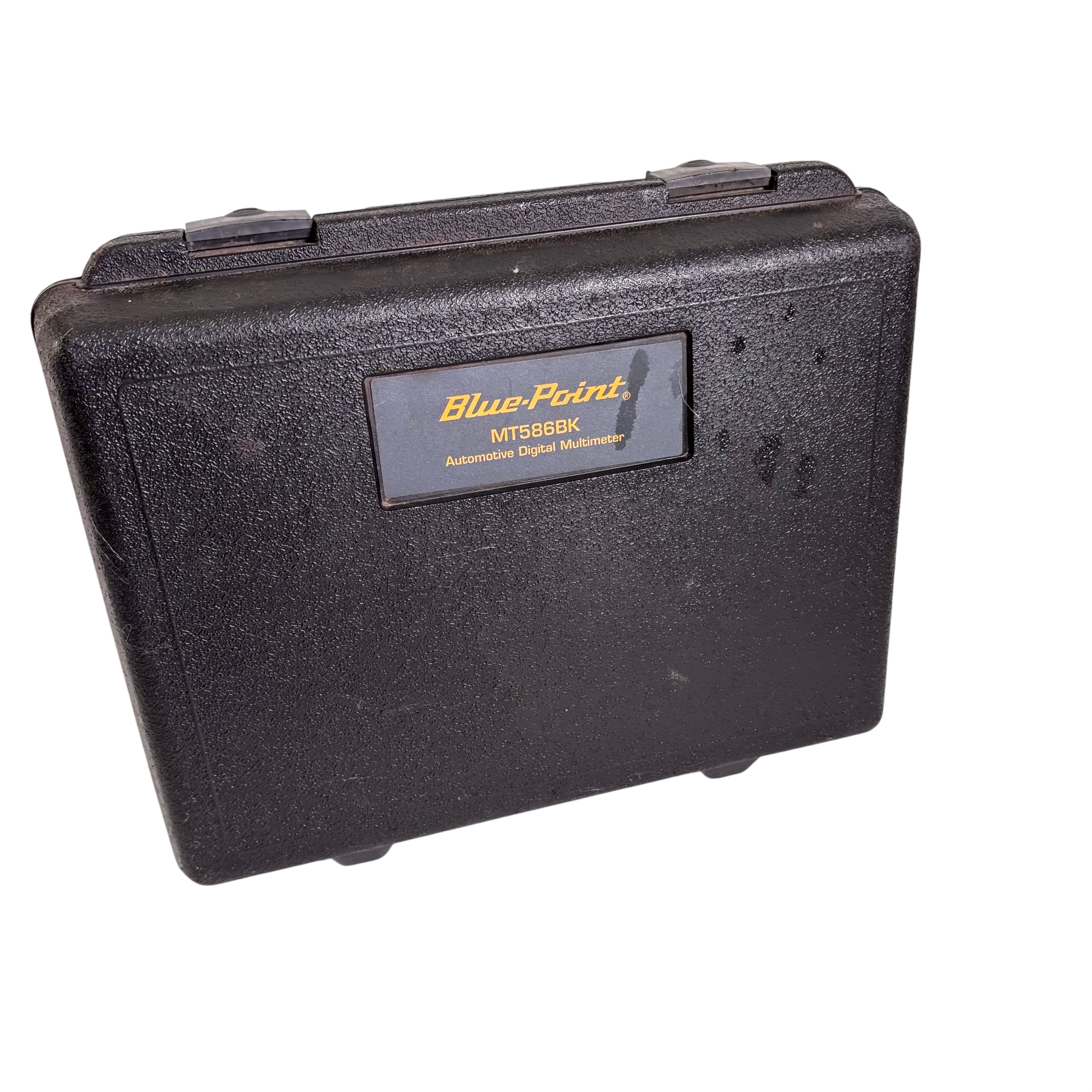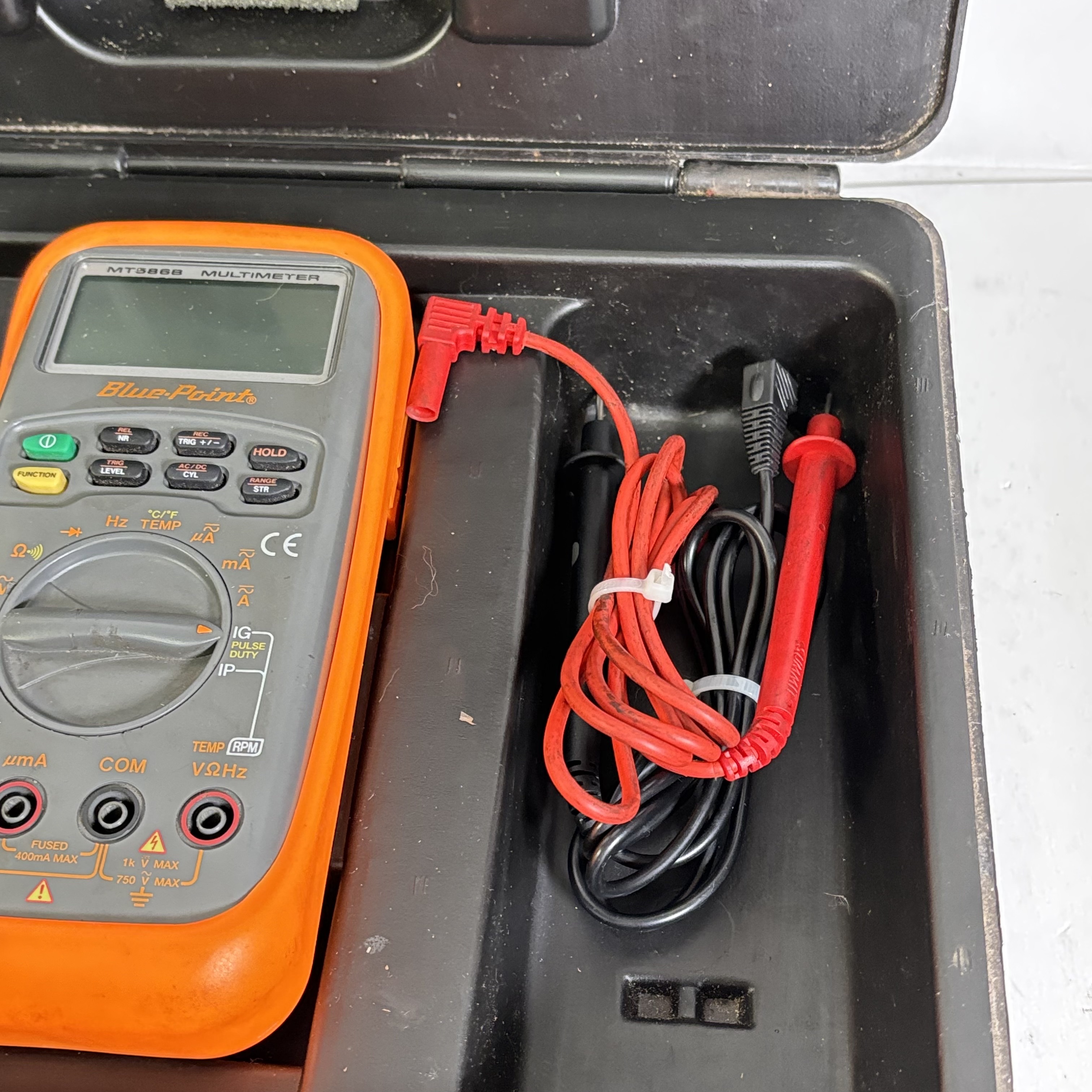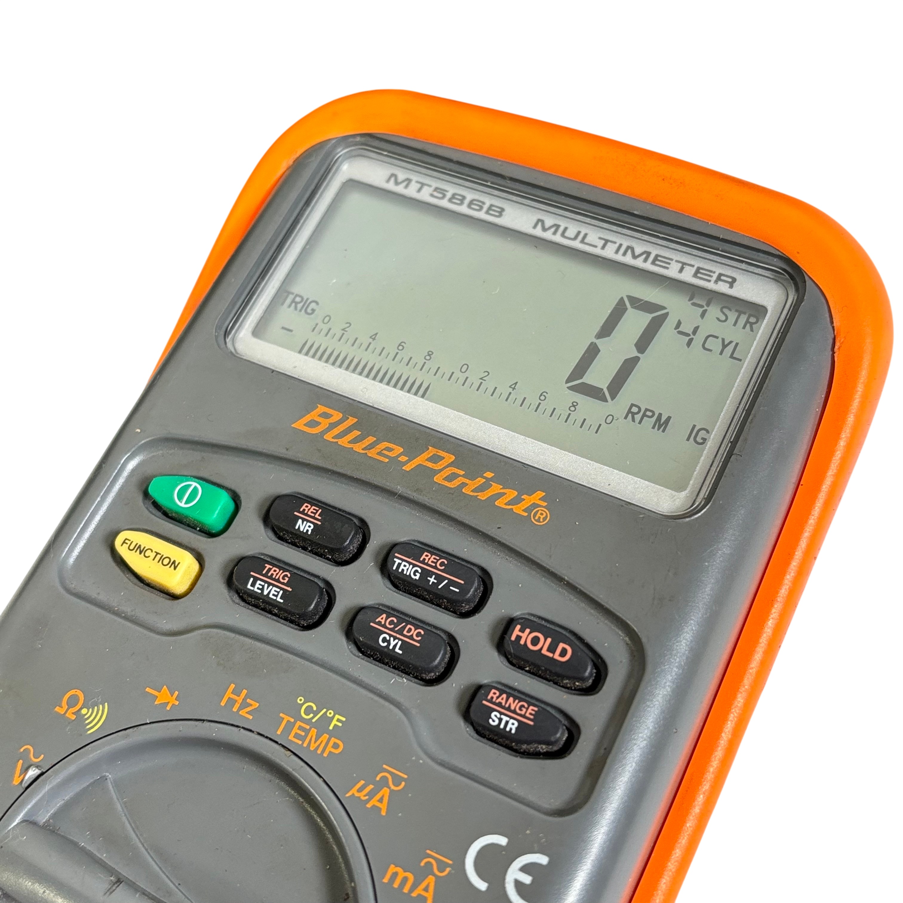 The Blue-Point MT586B Digital Multimeter offers a versatile range of measurement functions including AC/DC voltage, current, resistance, frequency, temperature, and RPM. Designed for automotive and electrical diagnostics, this multimeter features a clear digital display and protective orange rubber holster for durability. The kit includes test leads, a clamp accessory for current measurement, and a sturdy carrying case, making it ideal for professionals and hobbyists needing reliable and accurate readings. Compact and lightweight, it is powered by a 9V battery (not included) and rated for up to 1000V CAT II and 600V CAT III safety standards.