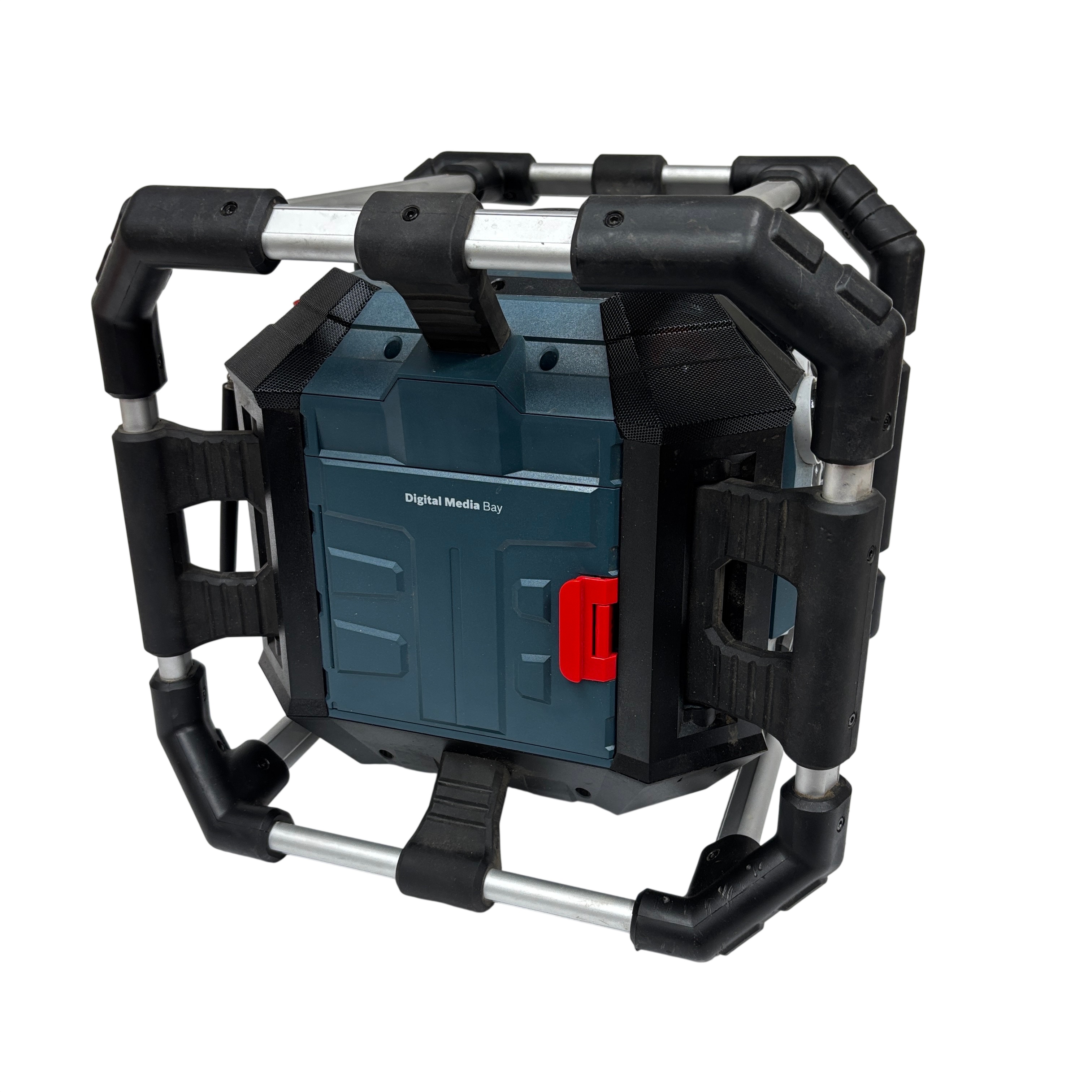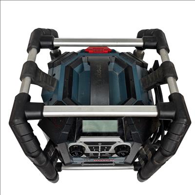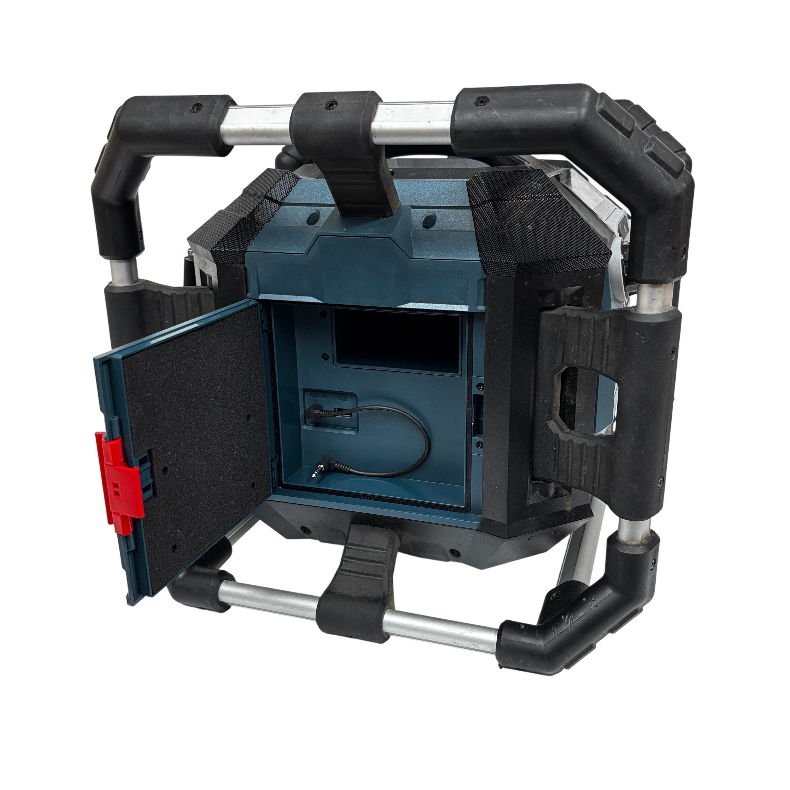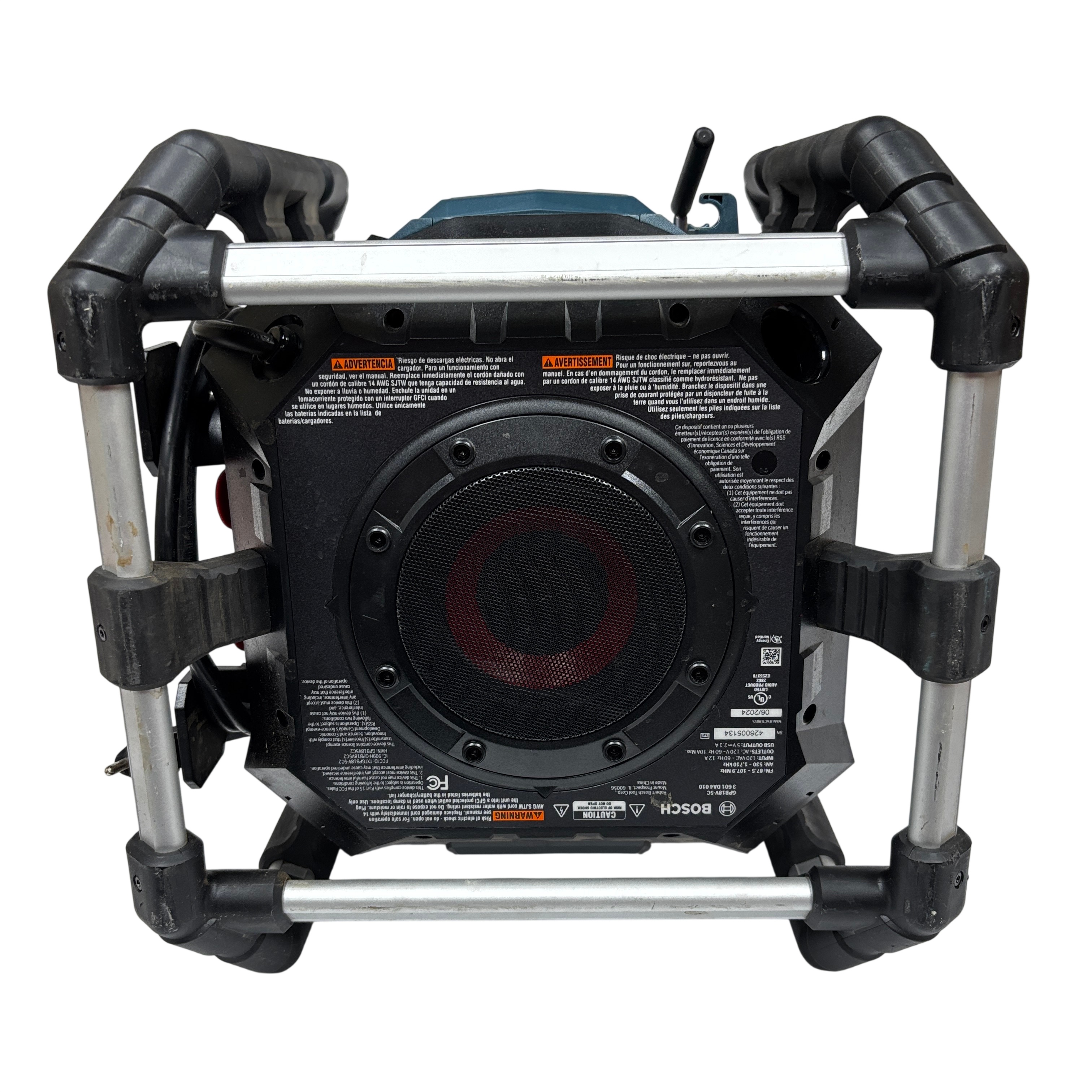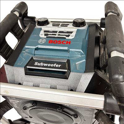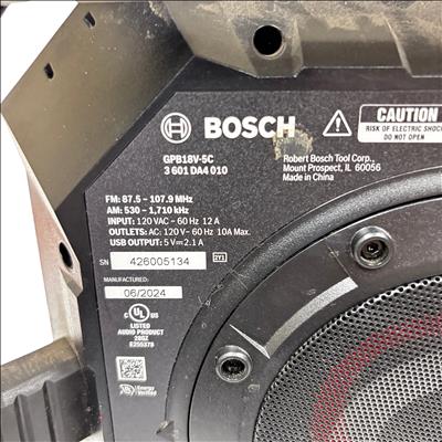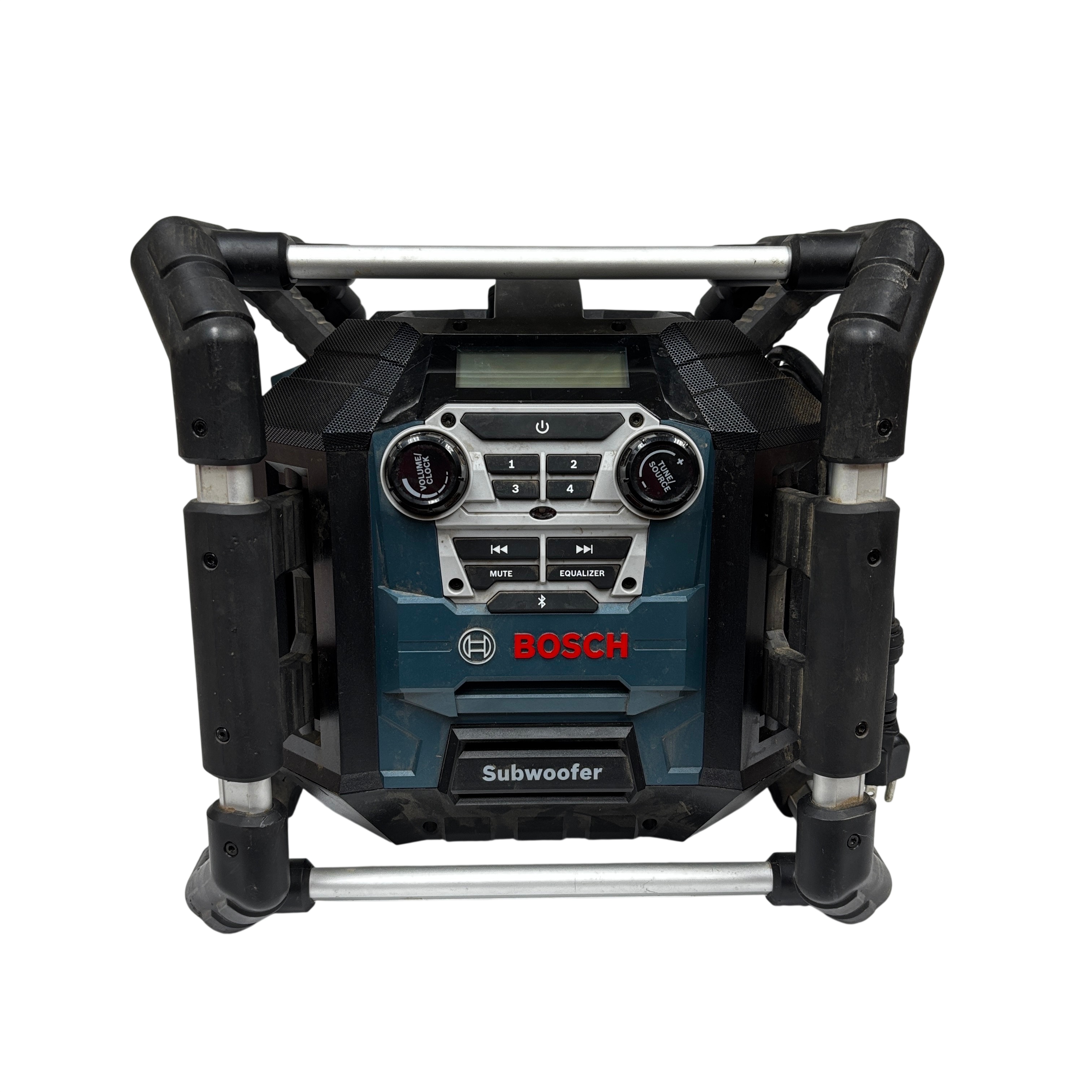 The Bosch GPB18V-5C Jobsite Radio delivers powerful, clear audio with its built-in subwoofer and digital AM/FM tuner covering 87.5 - 107.9 MHz FM and 530 - 1710 kHz AM frequencies. Designed for tough jobsite environments, this radio features a rugged protective frame and offers Bluetooth connectivity for wireless streaming. Powered by 120 VAC with a USB output of 5V/2.1A, it also includes AC outlets for added convenience.