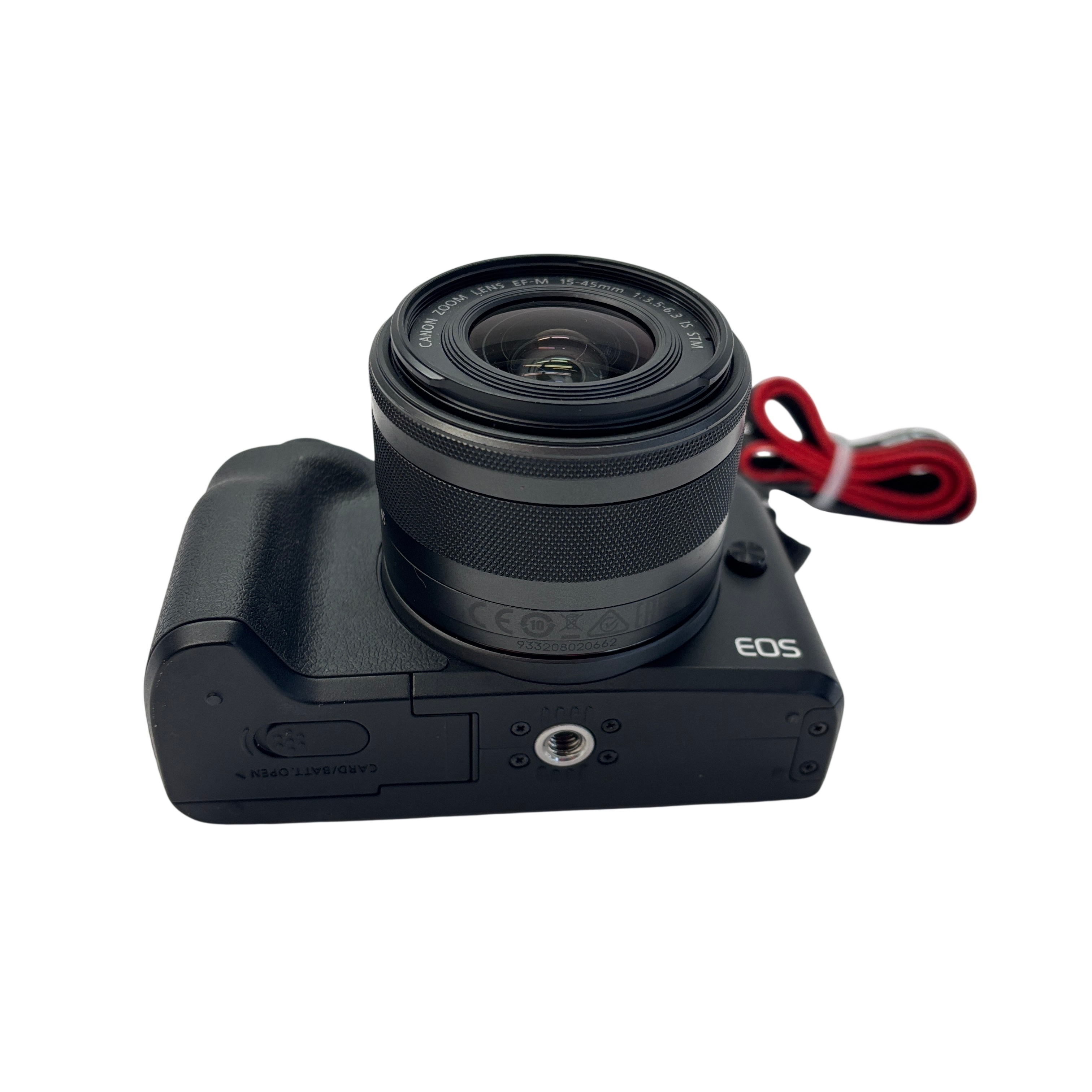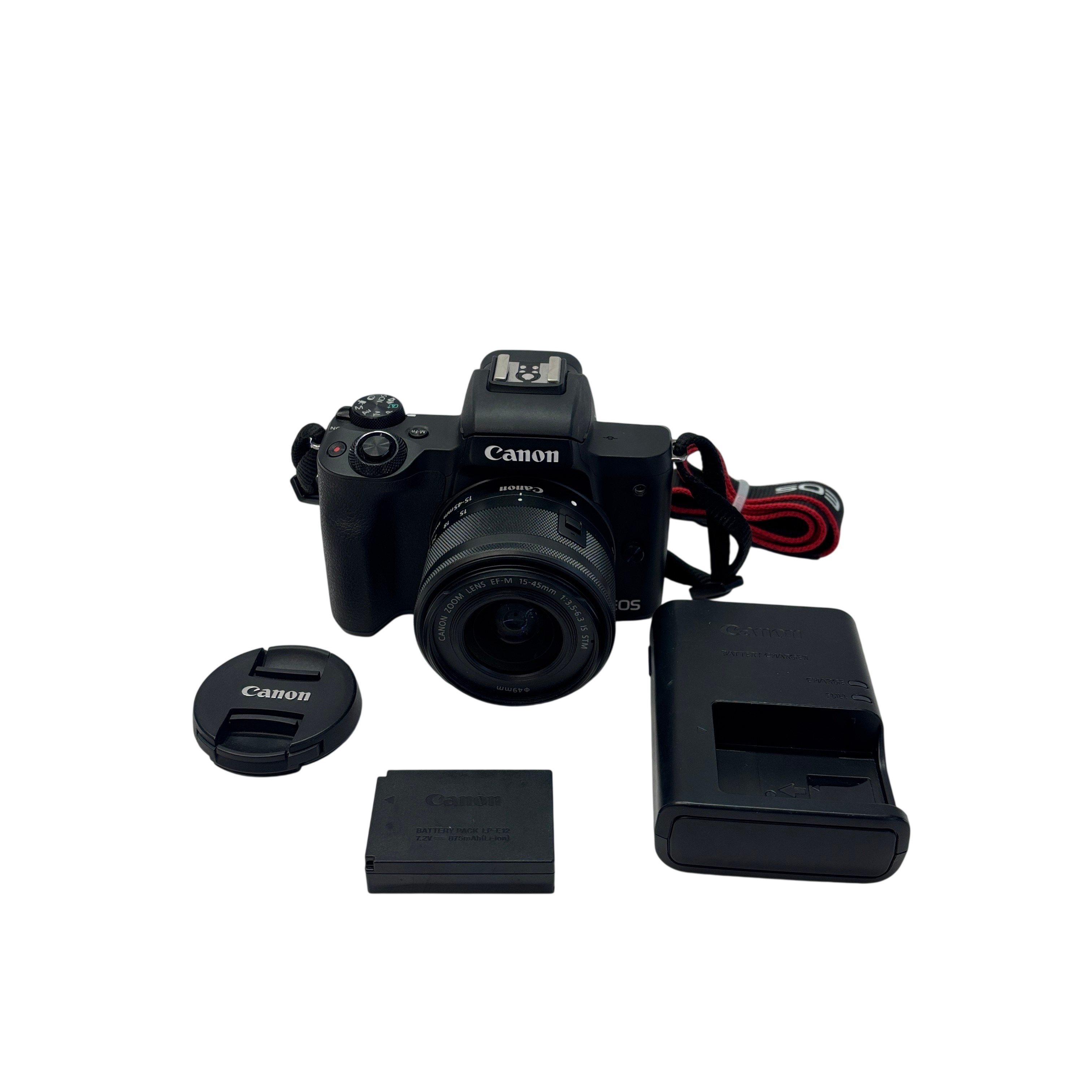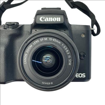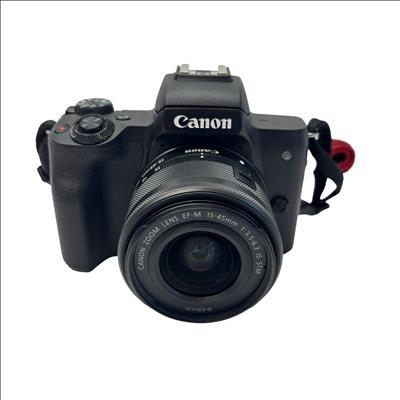 The Canon EOS M50 Mirrorless Camera (Model PC2328) features a 24.1MP APS-C CMOS sensor paired with a versatile EF-M 15-45mm f/3.5-6.3 IS STM zoom lens. This compact and lightweight camera supports 4K UHD video recording and offers built-in Wi-Fi and NFC for easy sharing. Included in this set are the camera body, lens, battery (LP-E12), charger, lens cap, and camera strap, making it ideal for photography enthusiasts seeking high-quality images and portability.
