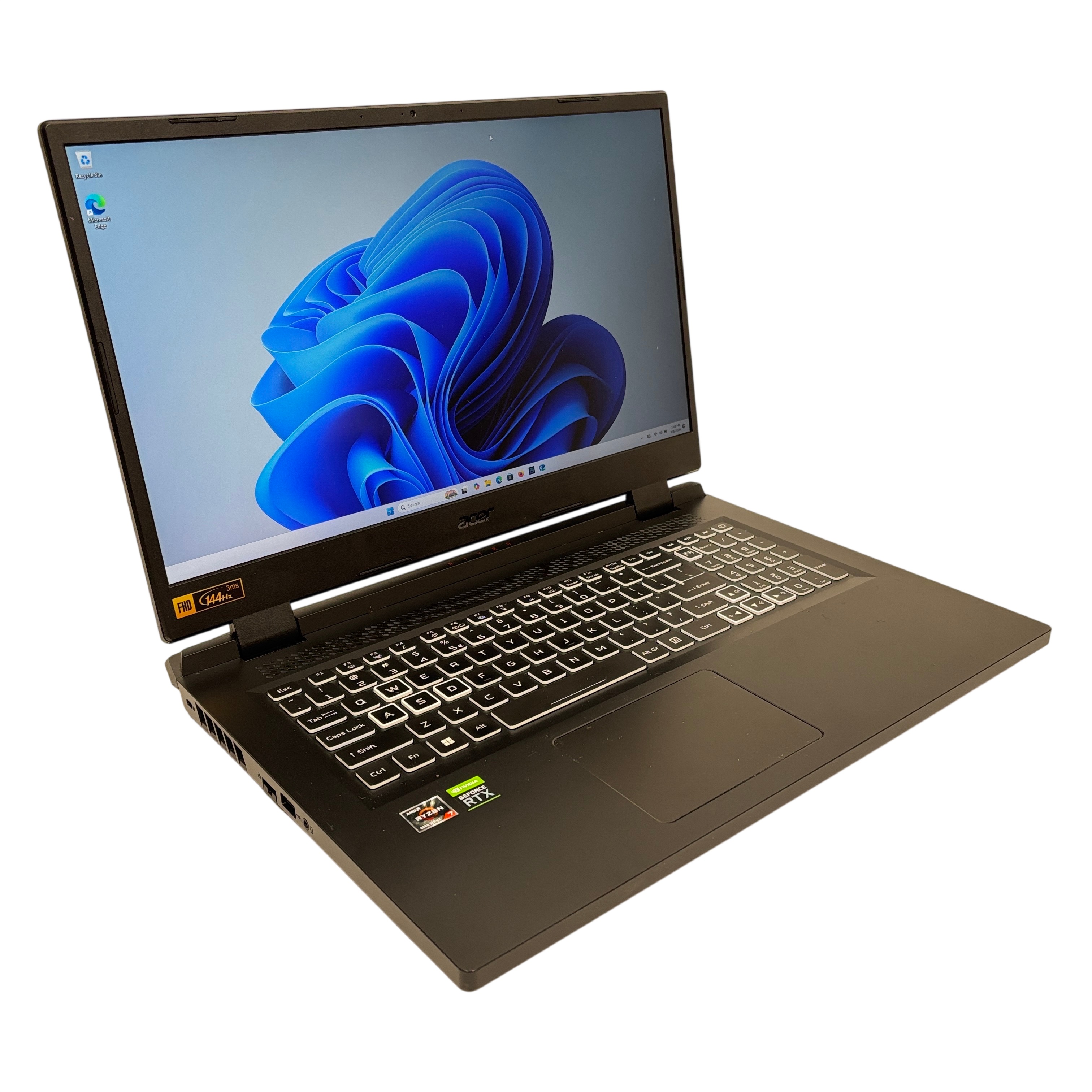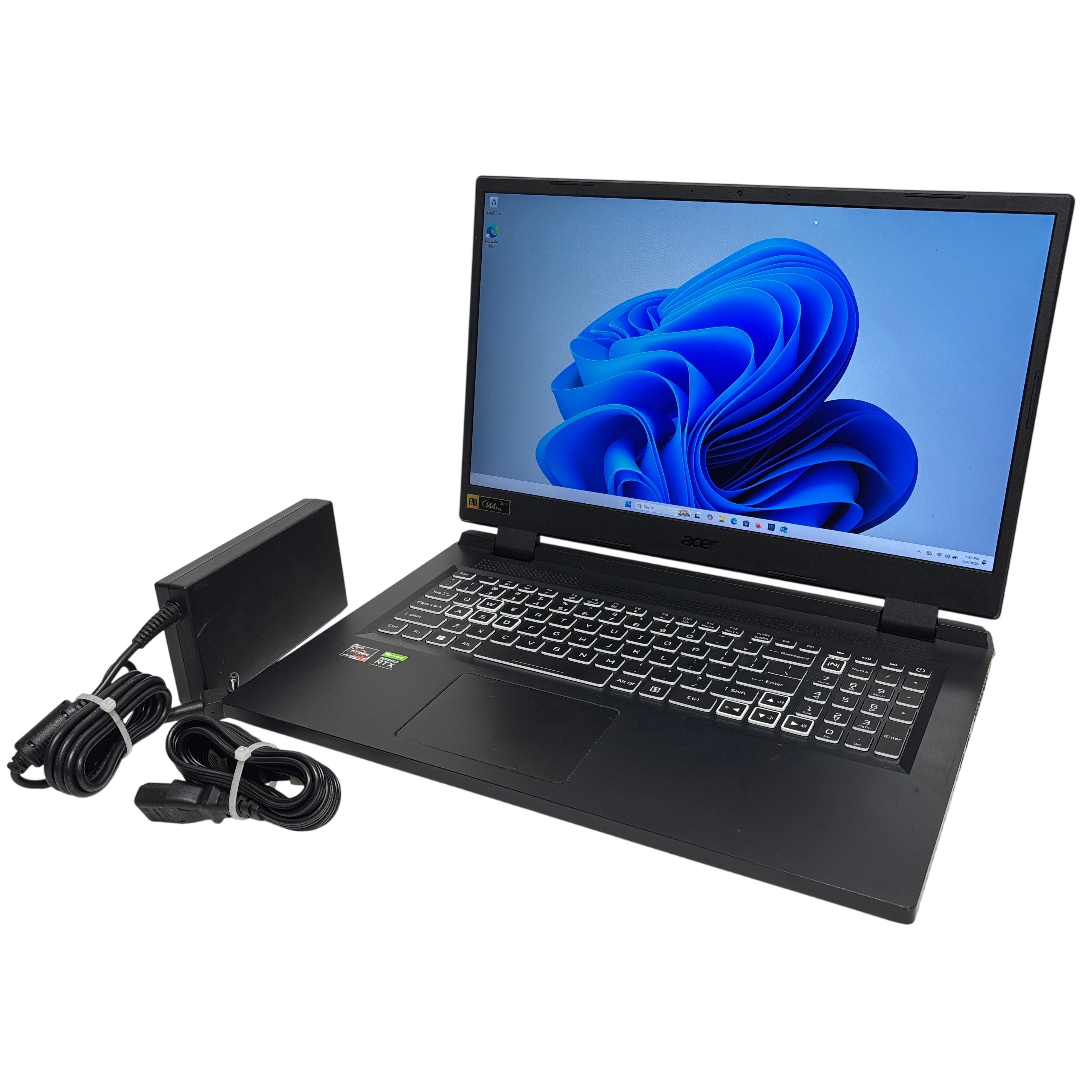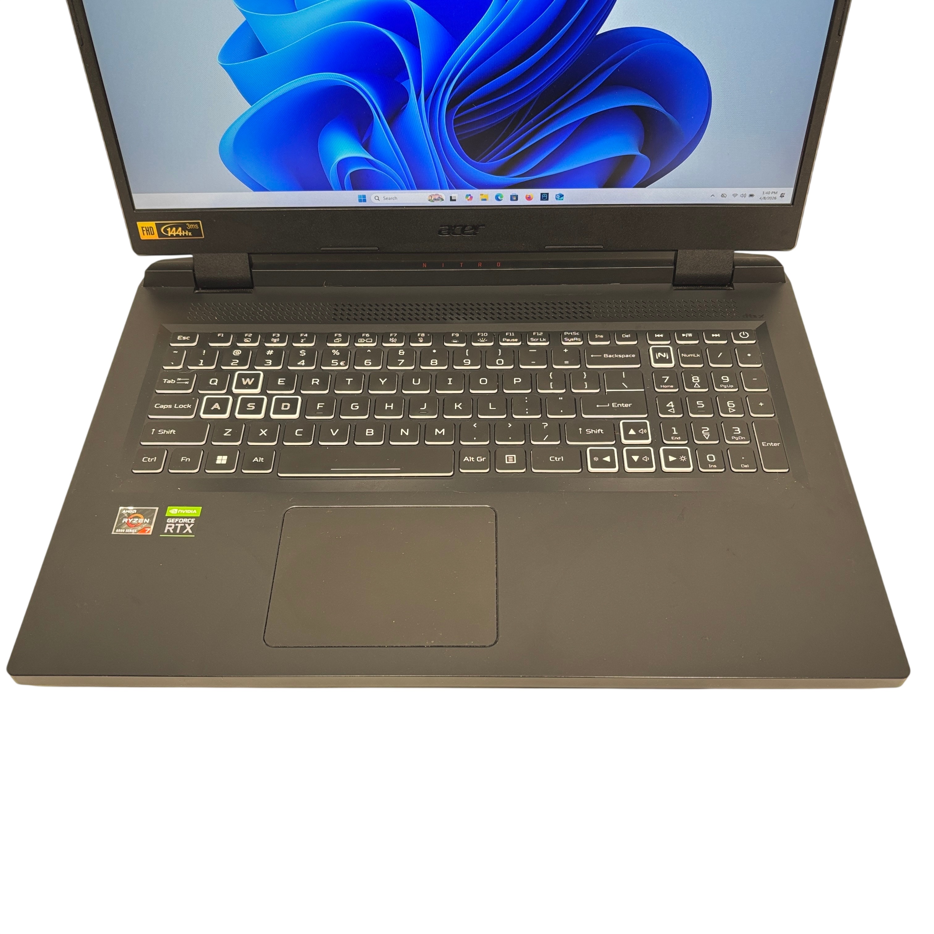 The Acer Nitro 5 N22C2 Gaming Laptop combines a powerful AMD Ryzen 7 6000 series processor with NVIDIA GeForce RTX graphics to deliver smooth and immersive gaming experiences. Featuring a 15.6 inch Full HD display with a 144Hz refresh rate, this laptop offers crisp visuals and fluid gameplay. The laptop comes with a backlit keyboard highlighting the WASD keys for gaming convenience and robust cooling vents to maintain optimal performance. Included in the set are the laptop, AC adapter, and power cord, making it ready for use right out of the box. Its sturdy black chassis and solid build make it a reliable choice for gamers and power users alike.