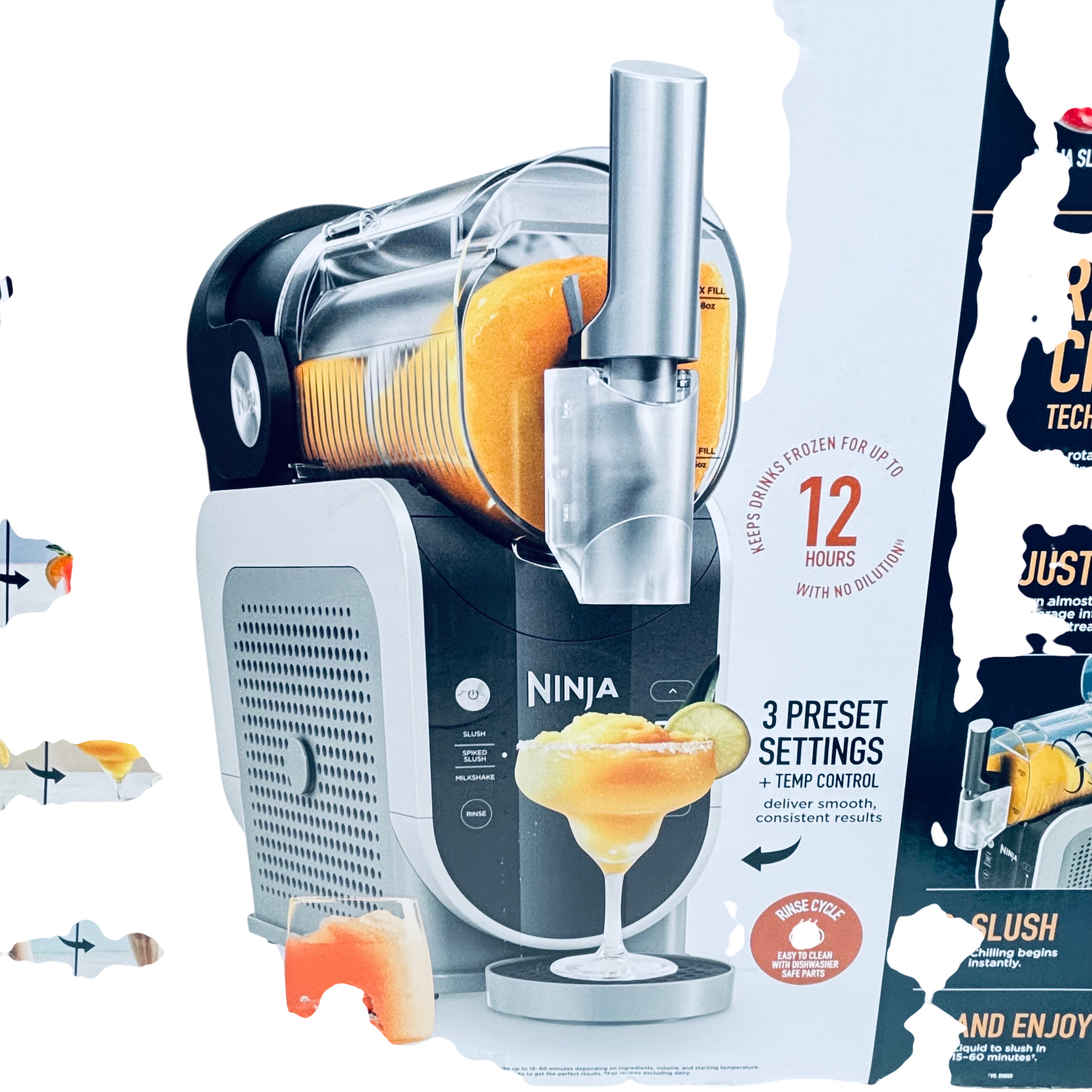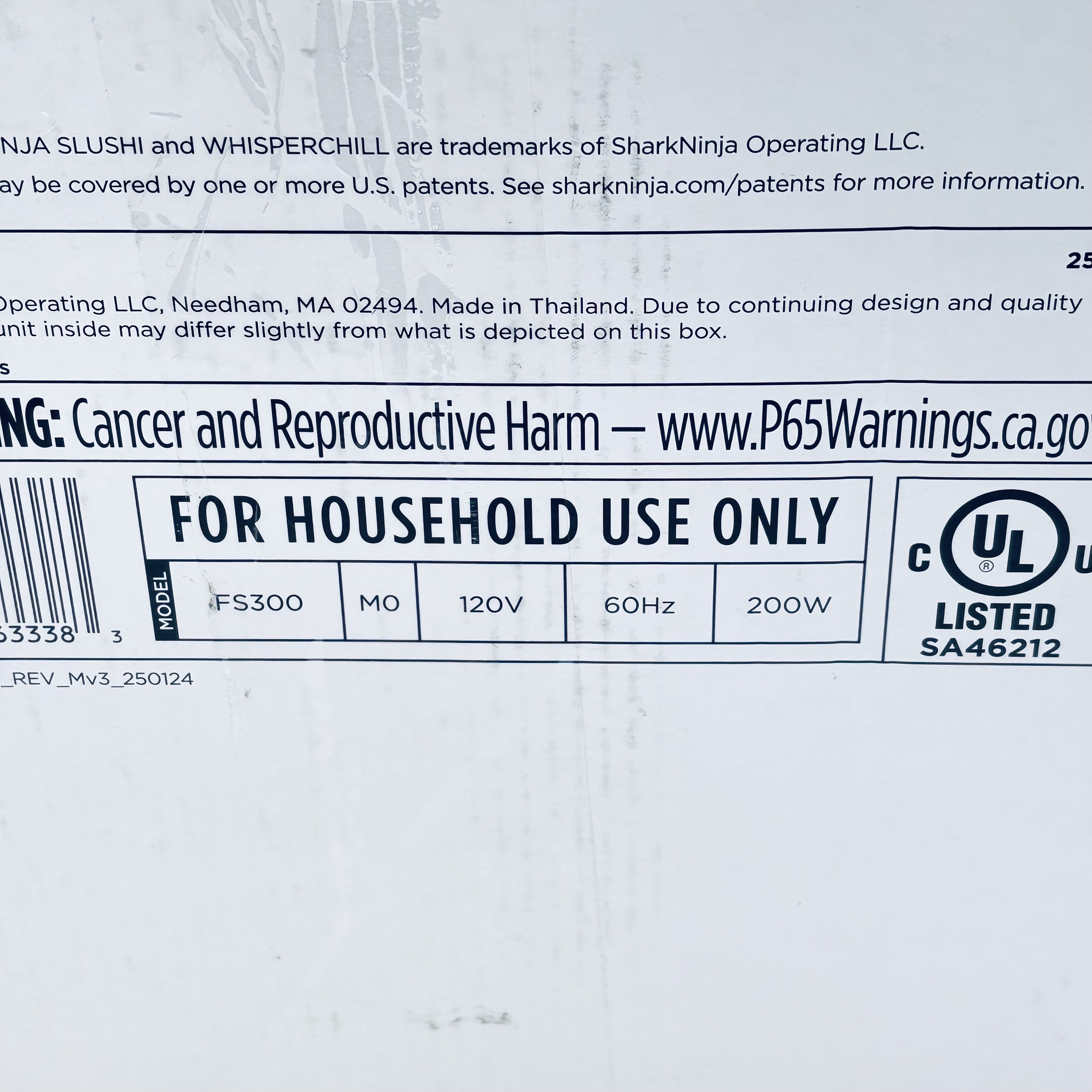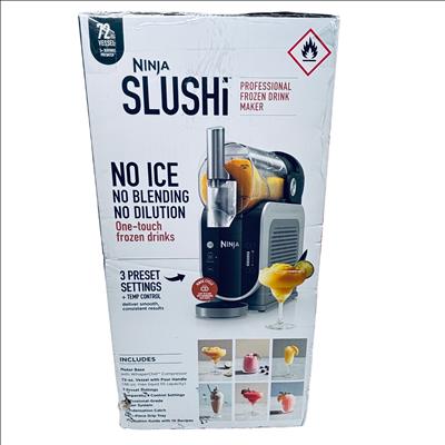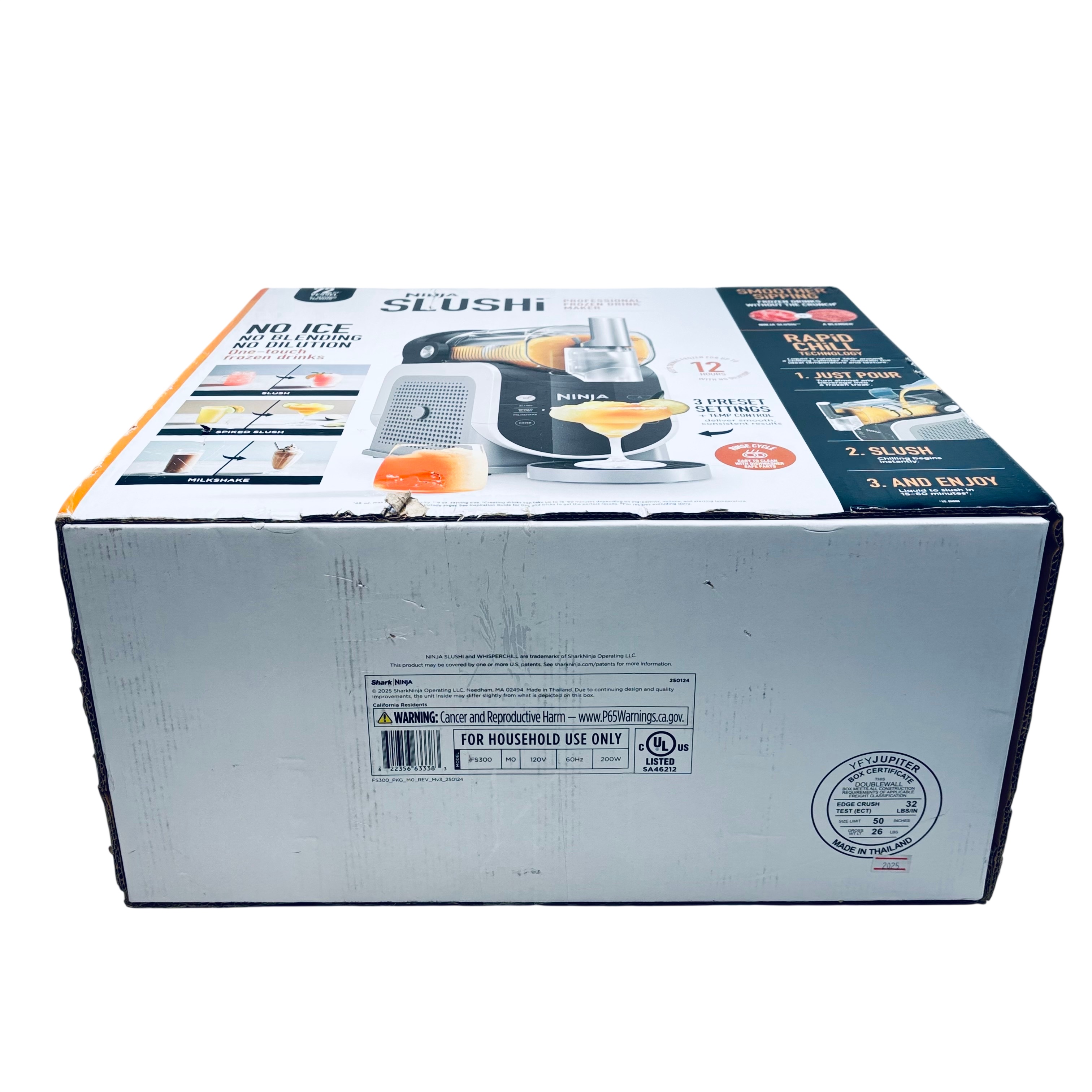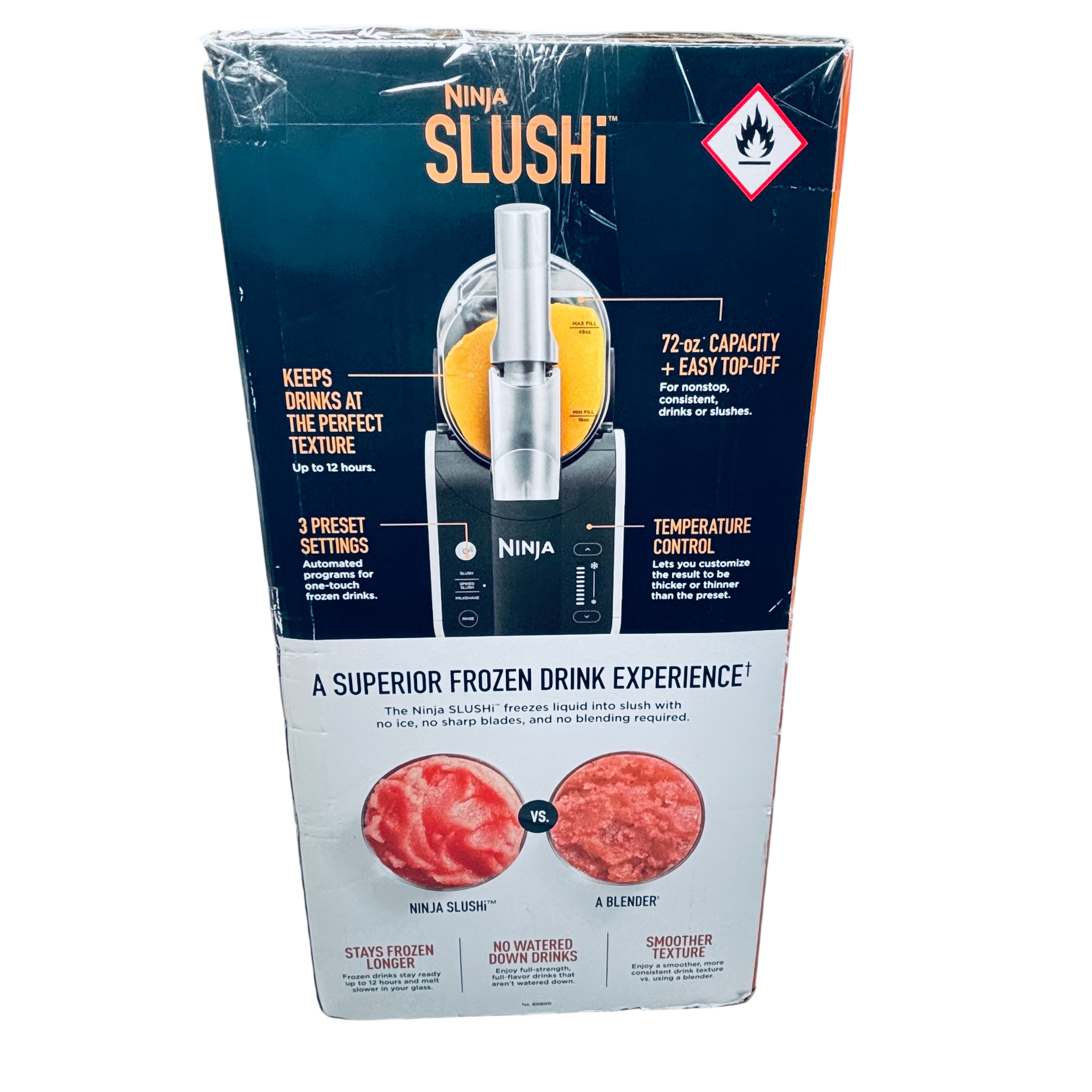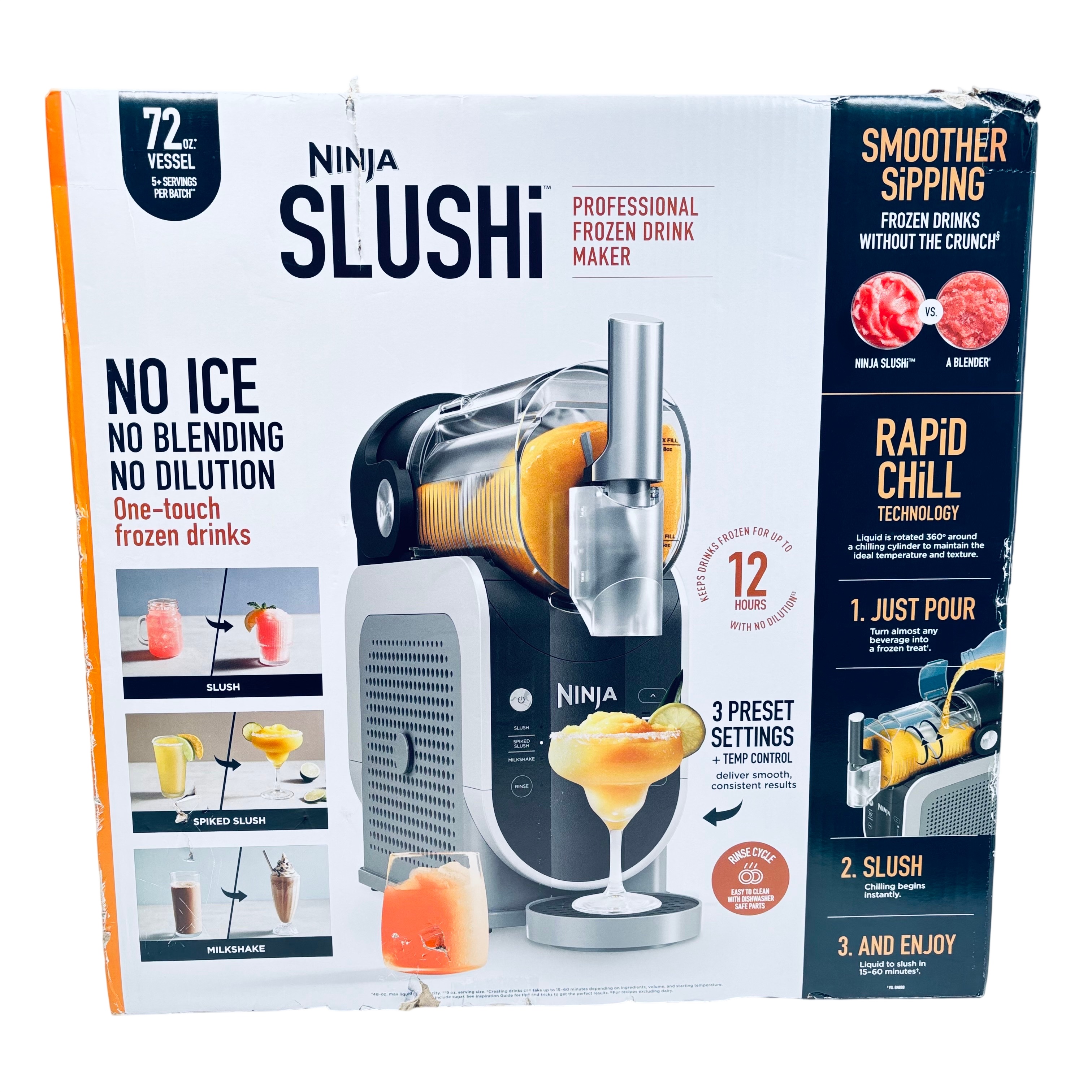The Shark FS300 Ninja SLUSHi Professional Frozen Drink Maker features a 72-ounce capacity vessel and operates at 120V with 200W power. Designed for household use, it offers three preset settings with temperature control to deliver smooth, consistent frozen drinks without ice, blending, or dilution. Equipped with Rapid Chill Technology and a WhisperChill compressor, this machine keeps drinks frozen for up to 12 hours. Its easy top-off design and rinse cycle with dishwasher-safe parts make it convenient and user-friendly for creating slushes, spiked slushes, and milkshakes.