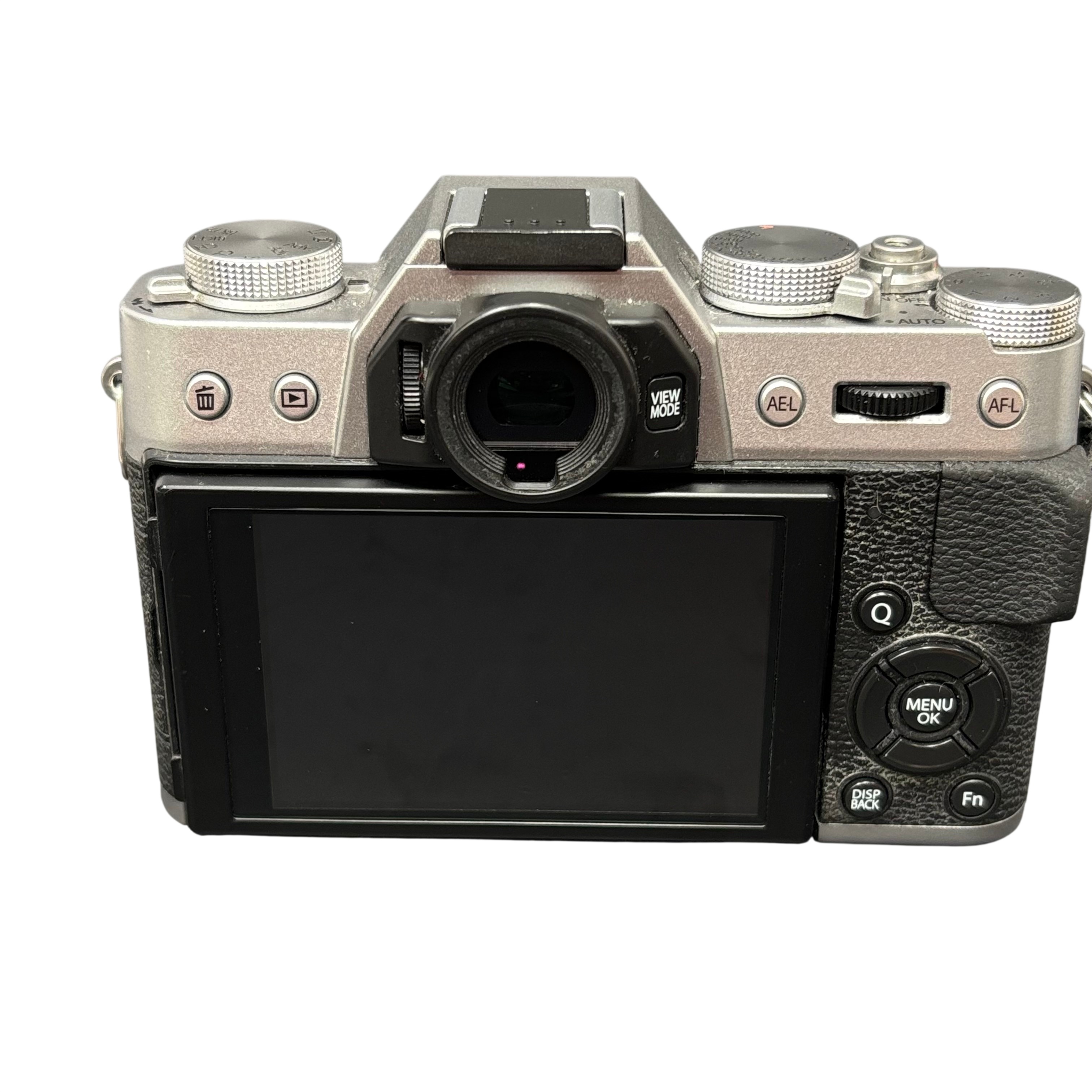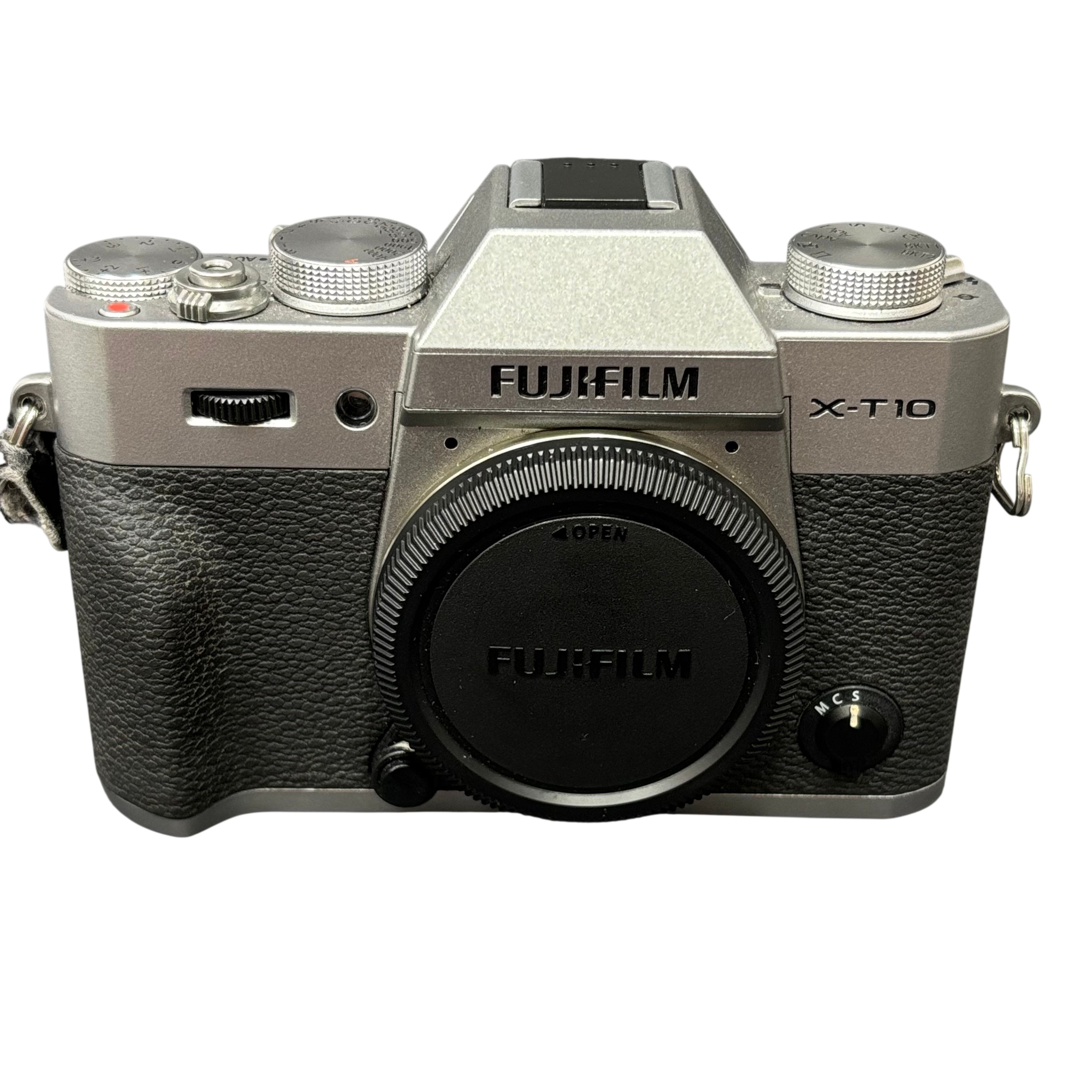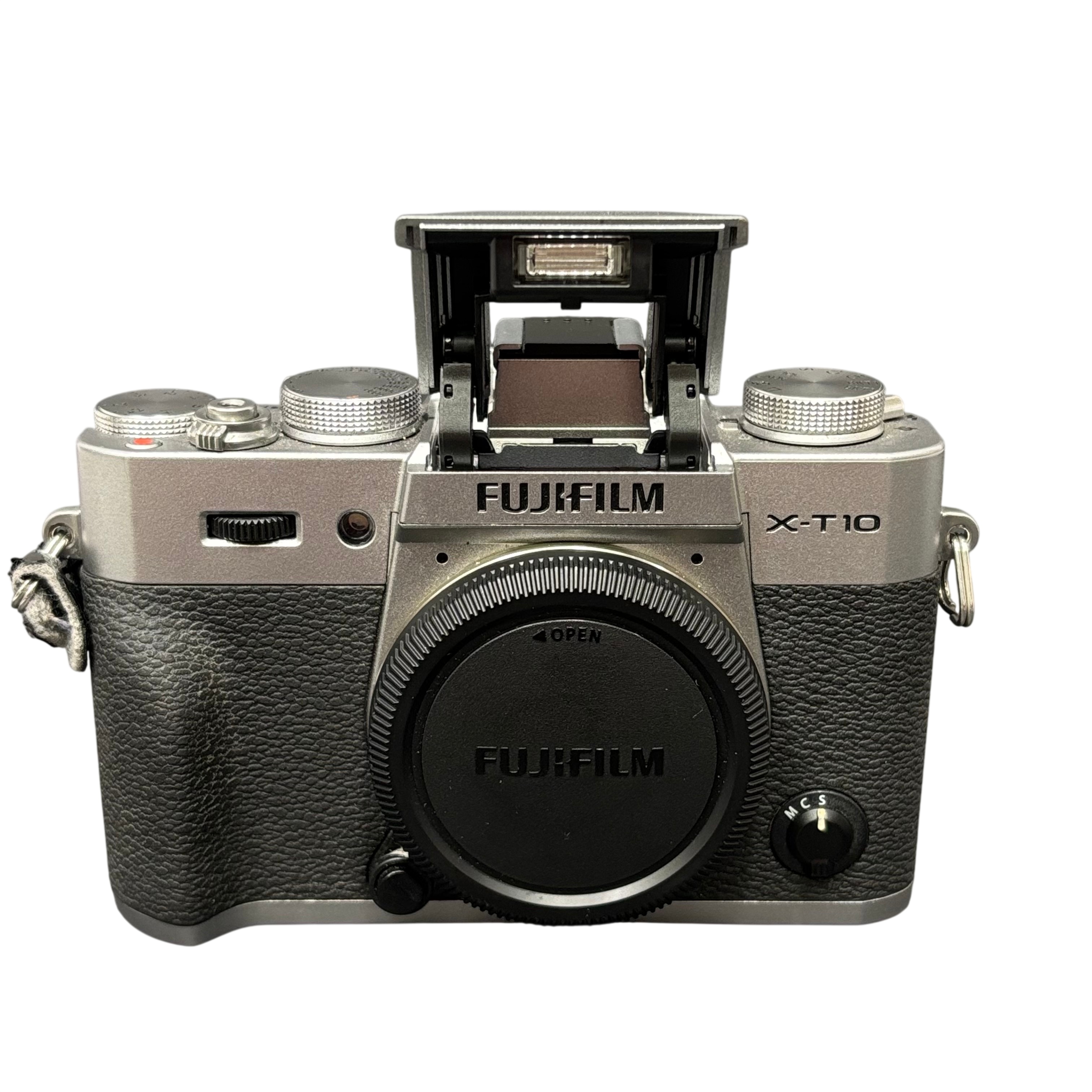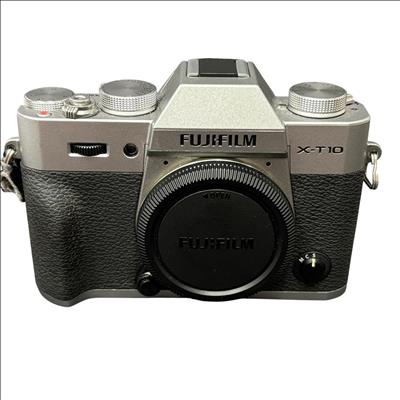 The Fujifilm X-T10 Mirrorless Digital Camera offers a 16.3MP APS-C X-Trans CMOS II sensor delivering high-quality images with excellent color reproduction. This compact and stylish silver and black camera features Full HD 1080p video recording and a built-in electronic viewfinder for precise framing.