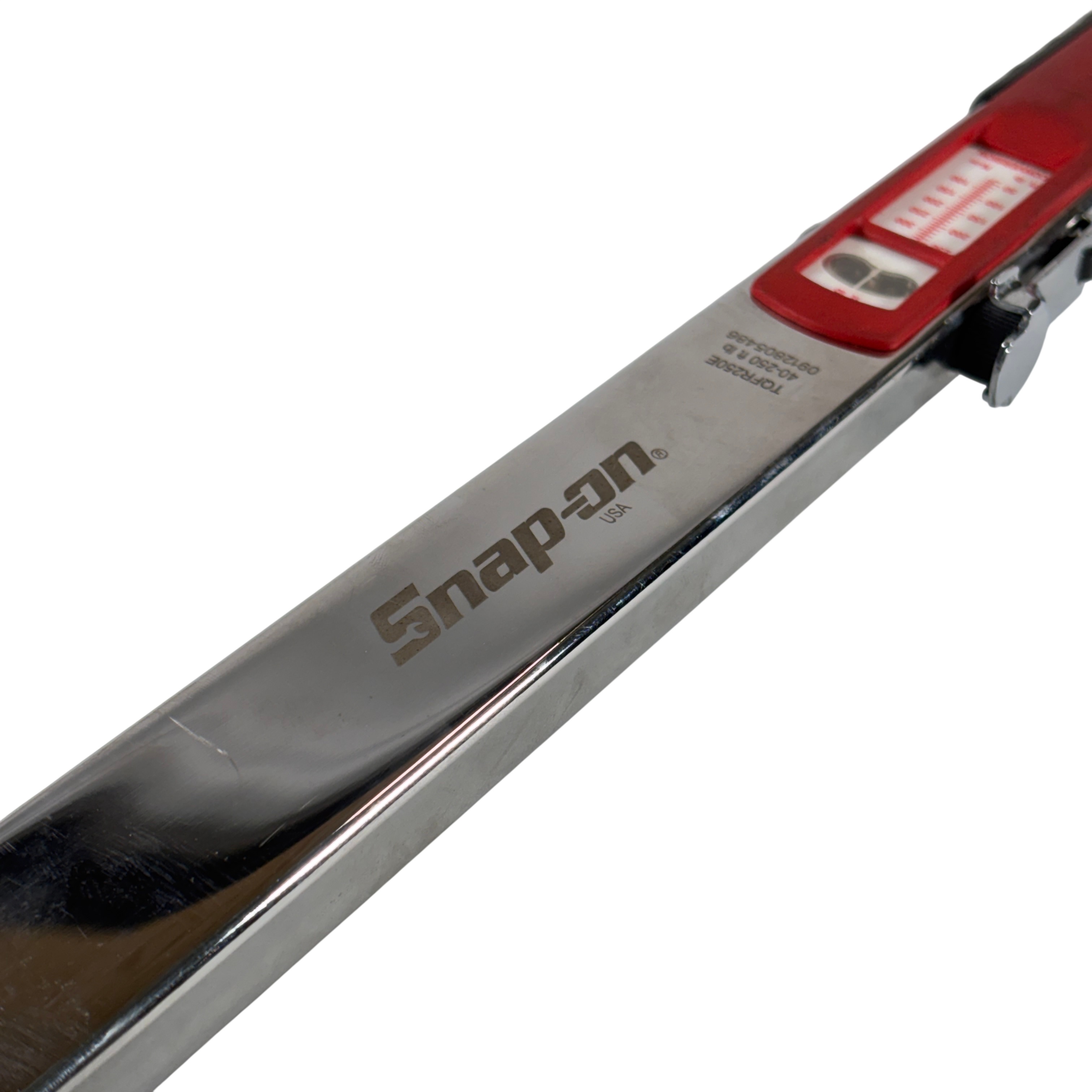 The Snap-on TQFR250E 1/2-inch drive flex-head torque wrench delivers precise torque control with a 40–250 ft-lb range and ±4% clockwise accuracy across most of its operating scale. Its flex-head design improves access in tight or obstructed areas, allowing up to 15° of movement for better positioning during use.