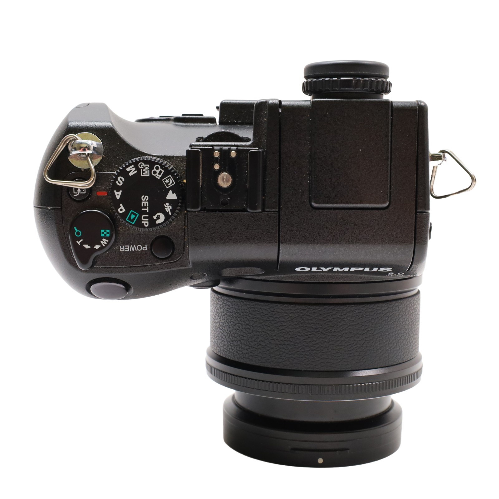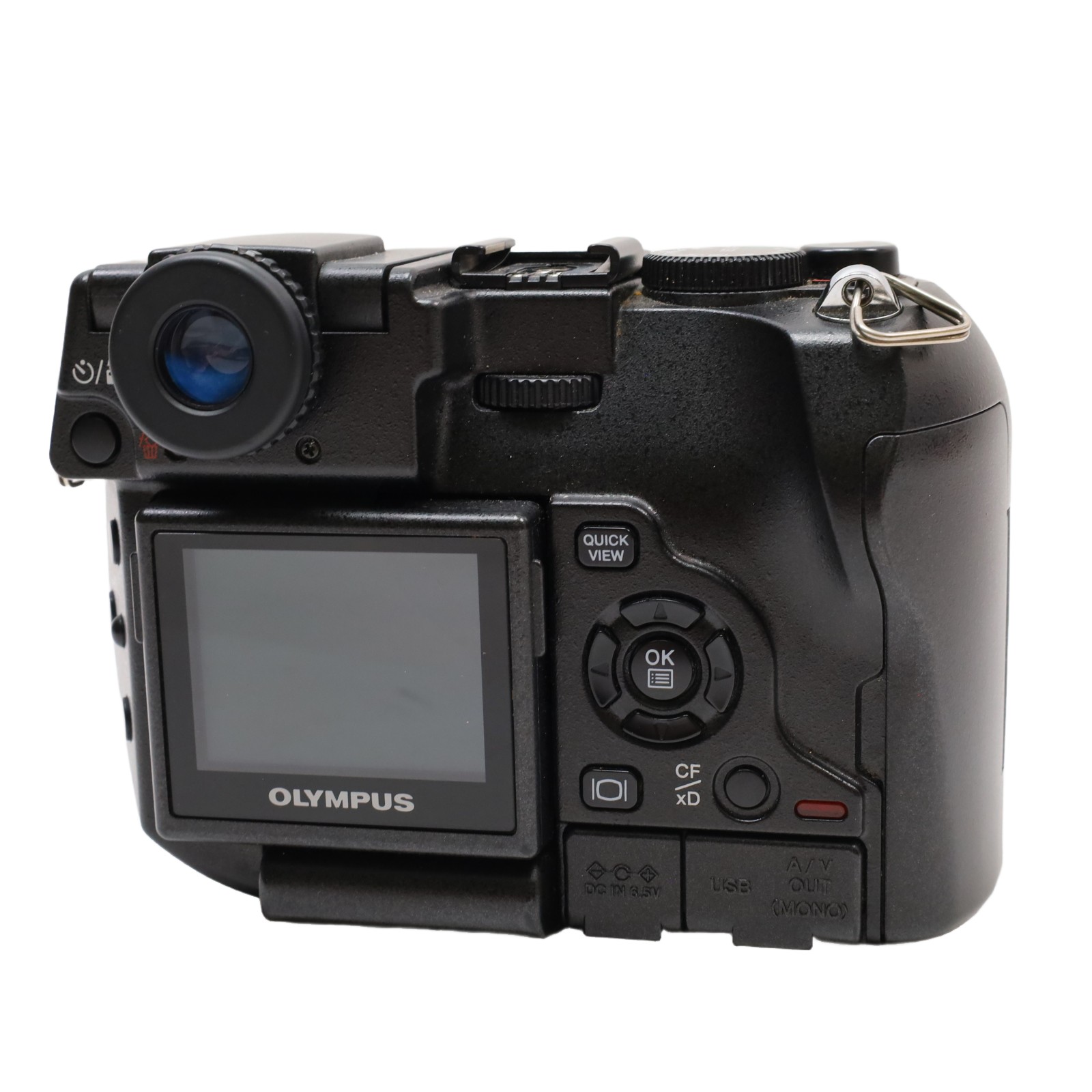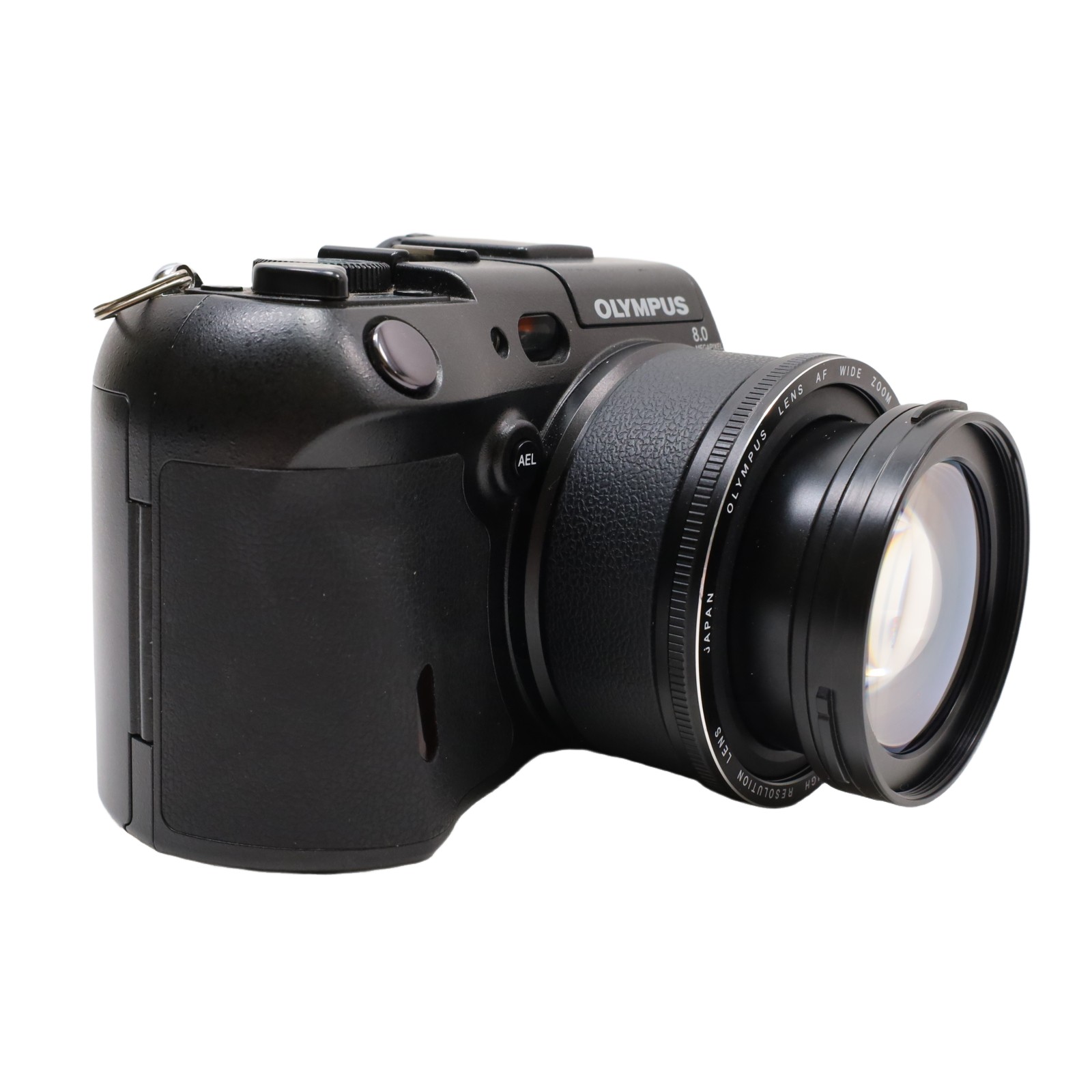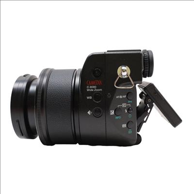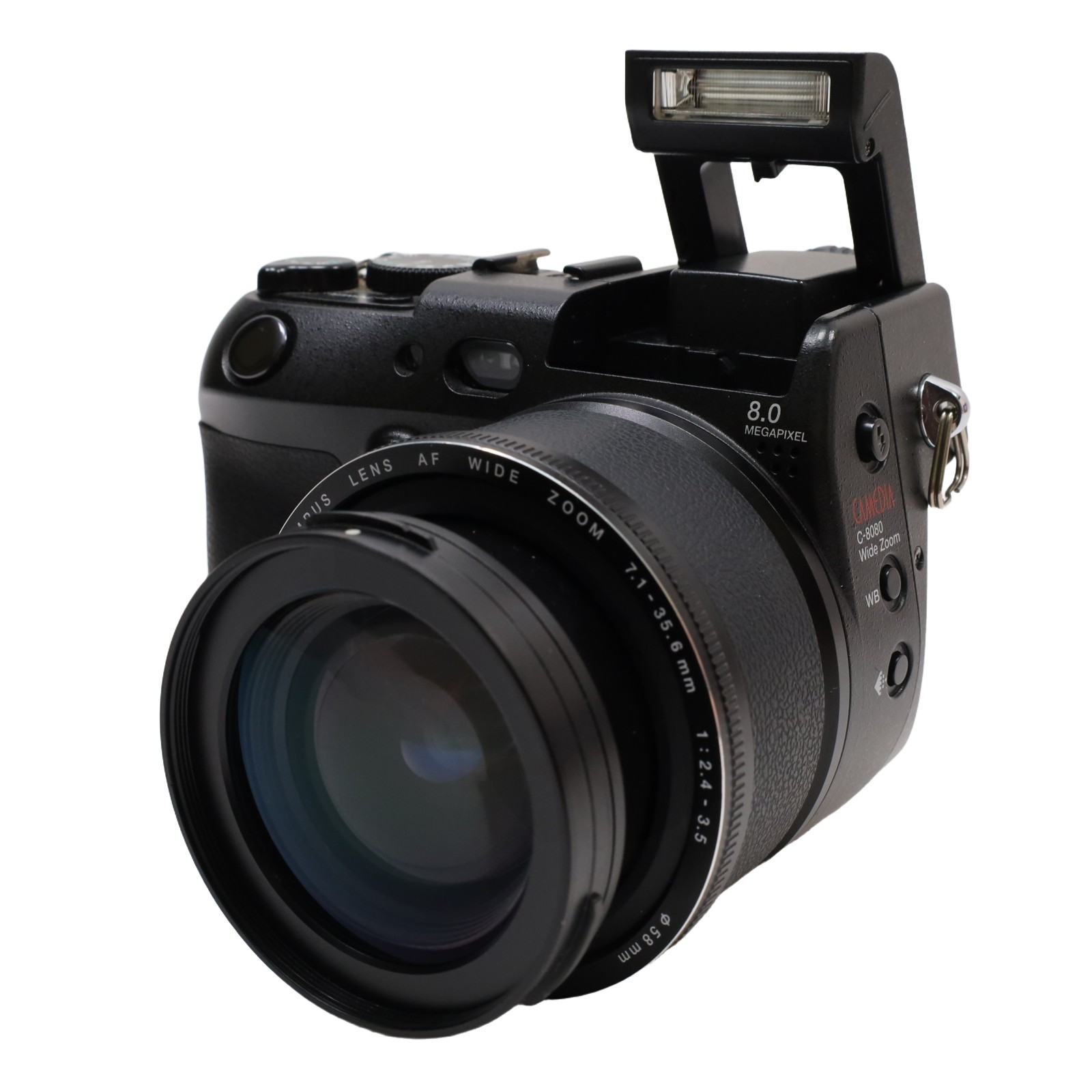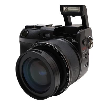 A digital camera equipped with an 8-megapixel sensor and a 5x zoom lens, constructed within a magnesium alloy chassis. It features a 1.8-inch LCD monitor with a resolution of 134,000 pixels, mounted on an articulating arm that allows the screen to tilt upward or downward and secure in four positions, including flat against the body. A 240,000 pixel electronic viewfinder is included for alternative composition. Data storage is handled through dual slots designed for xD-Picture Card and CompactFlash Type I/II memory cards.
