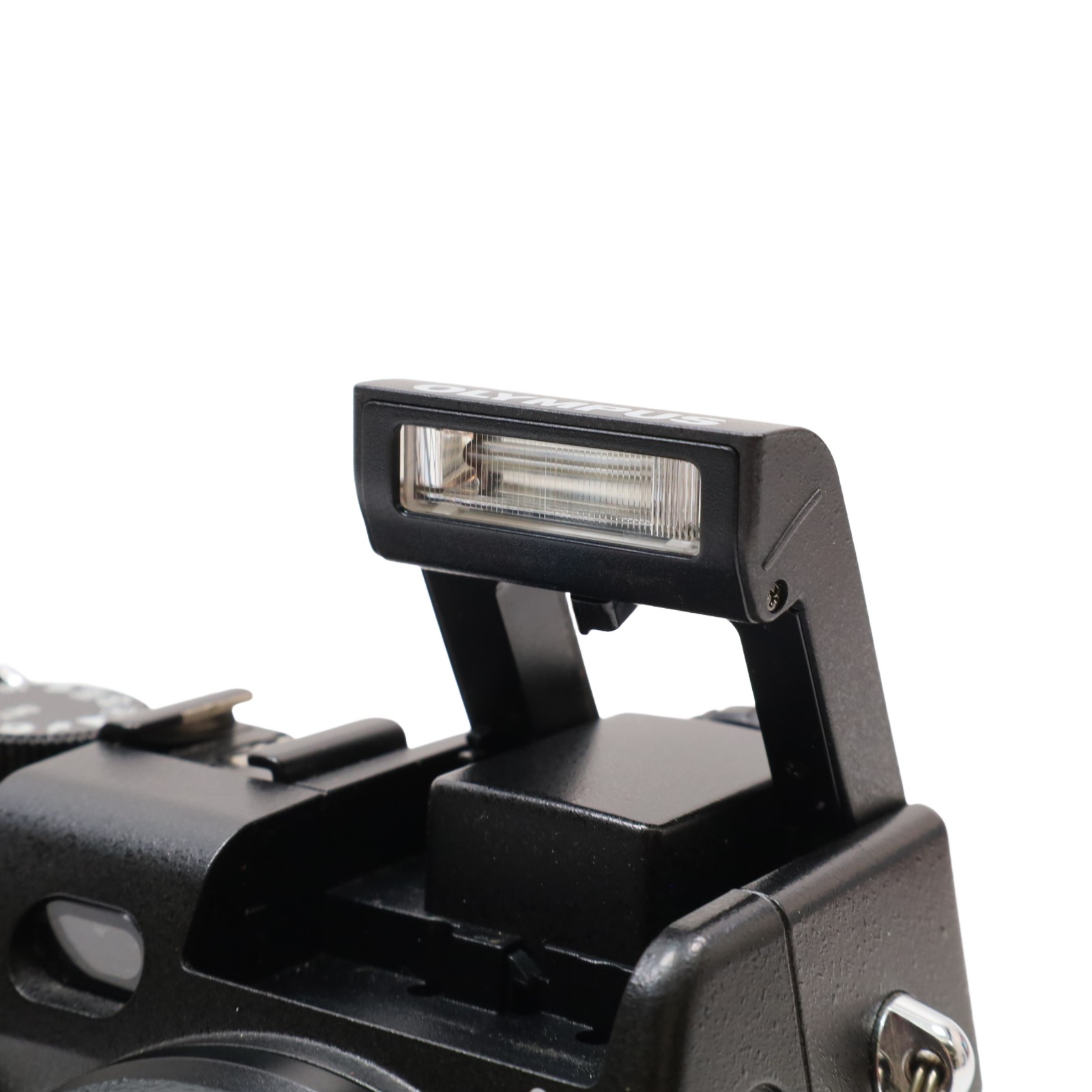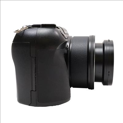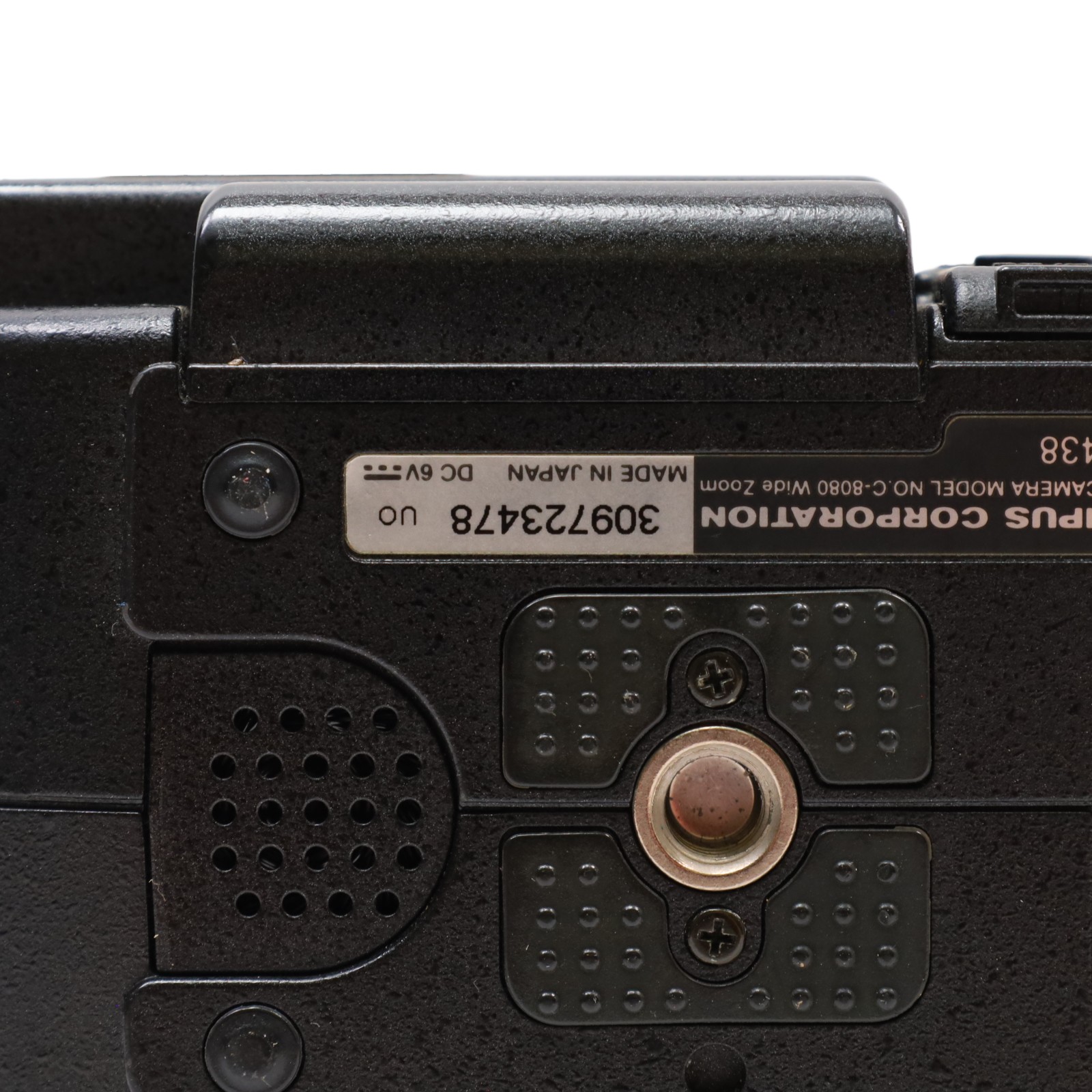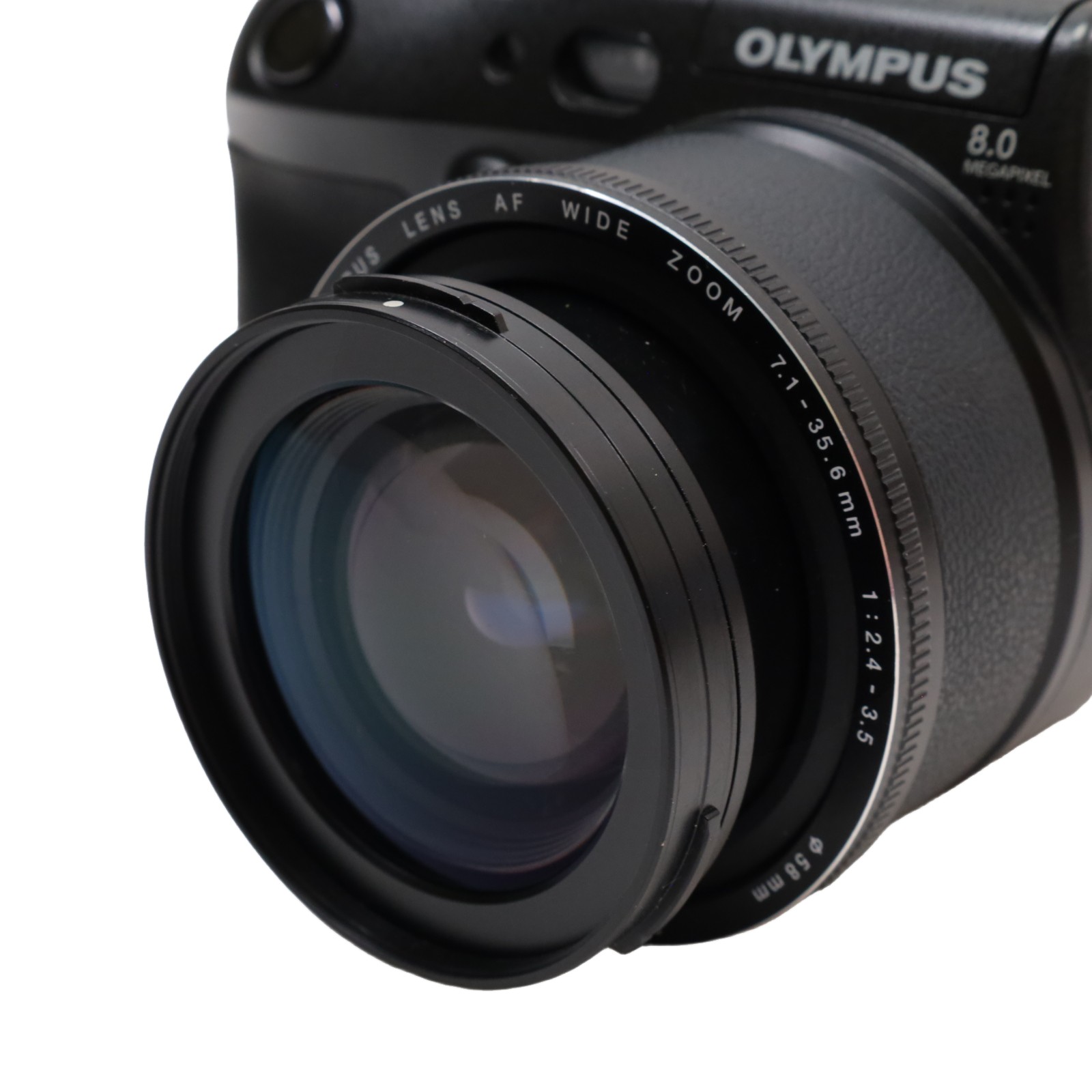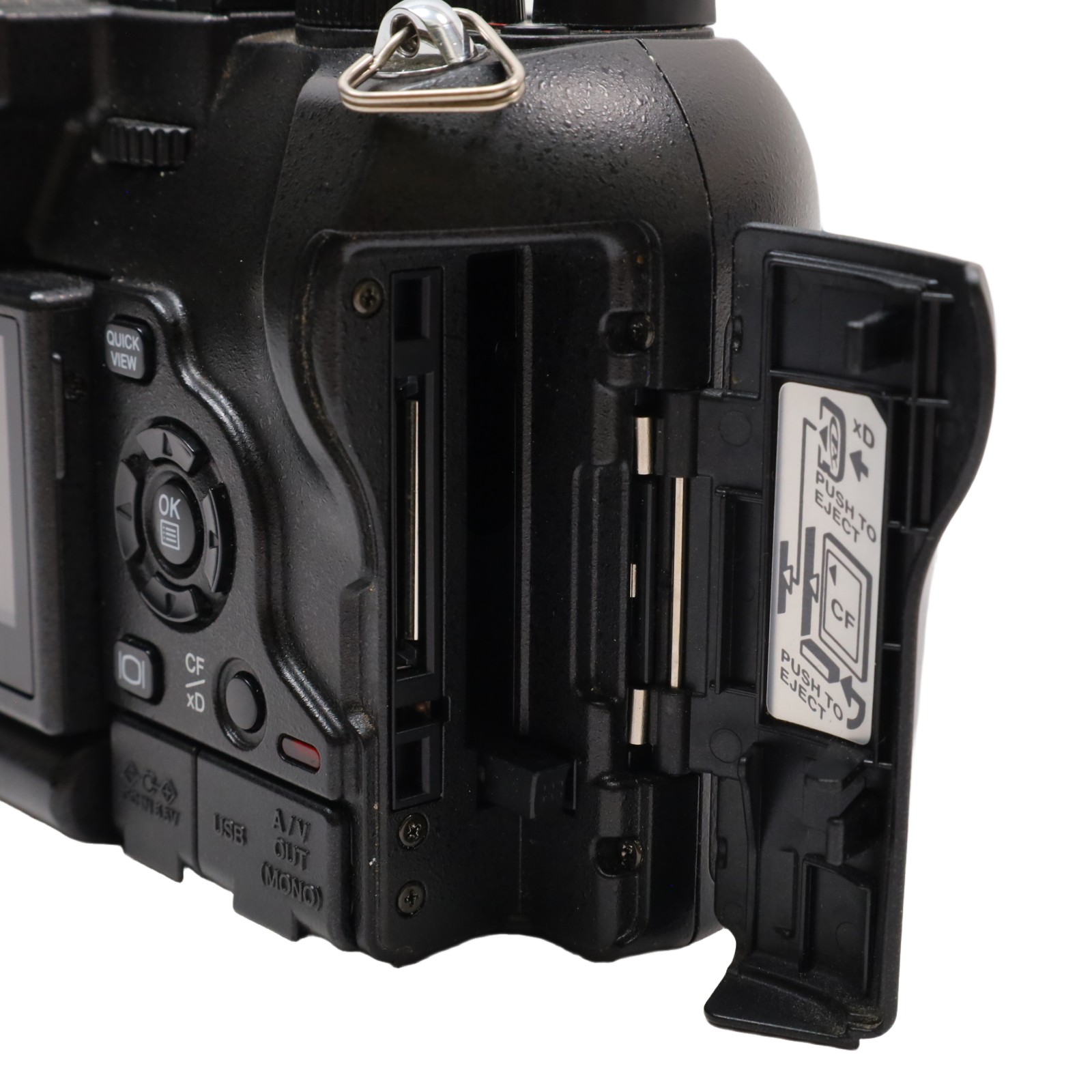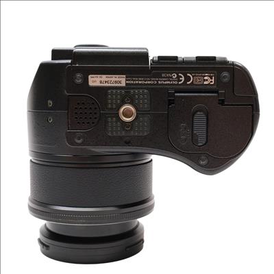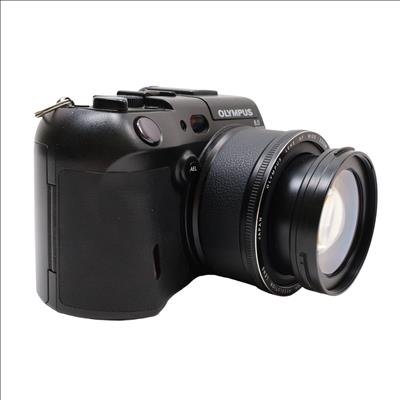 A digital camera equipped with an 8-megapixel sensor and a 5x zoom lens, constructed within a magnesium alloy chassis. It features a 1.8-inch LCD monitor with a resolution of 134,000 pixels, mounted on an articulating arm that allows the screen to tilt upward or downward and secure in four positions, including flat against the body. A 240,000 pixel electronic viewfinder is included for alternative composition. Data storage is handled through dual slots designed for xD-Picture Card and CompactFlash Type I/II memory cards.