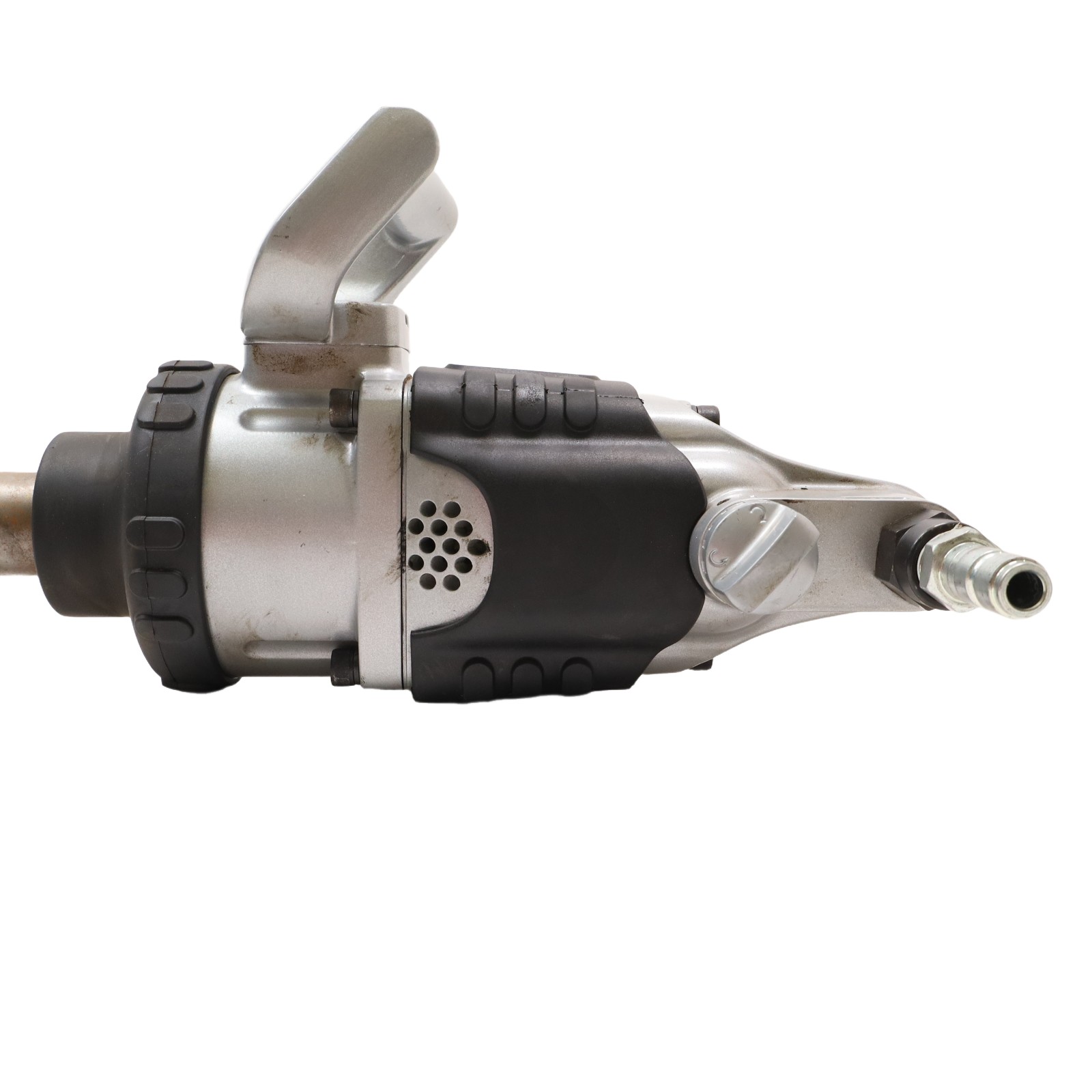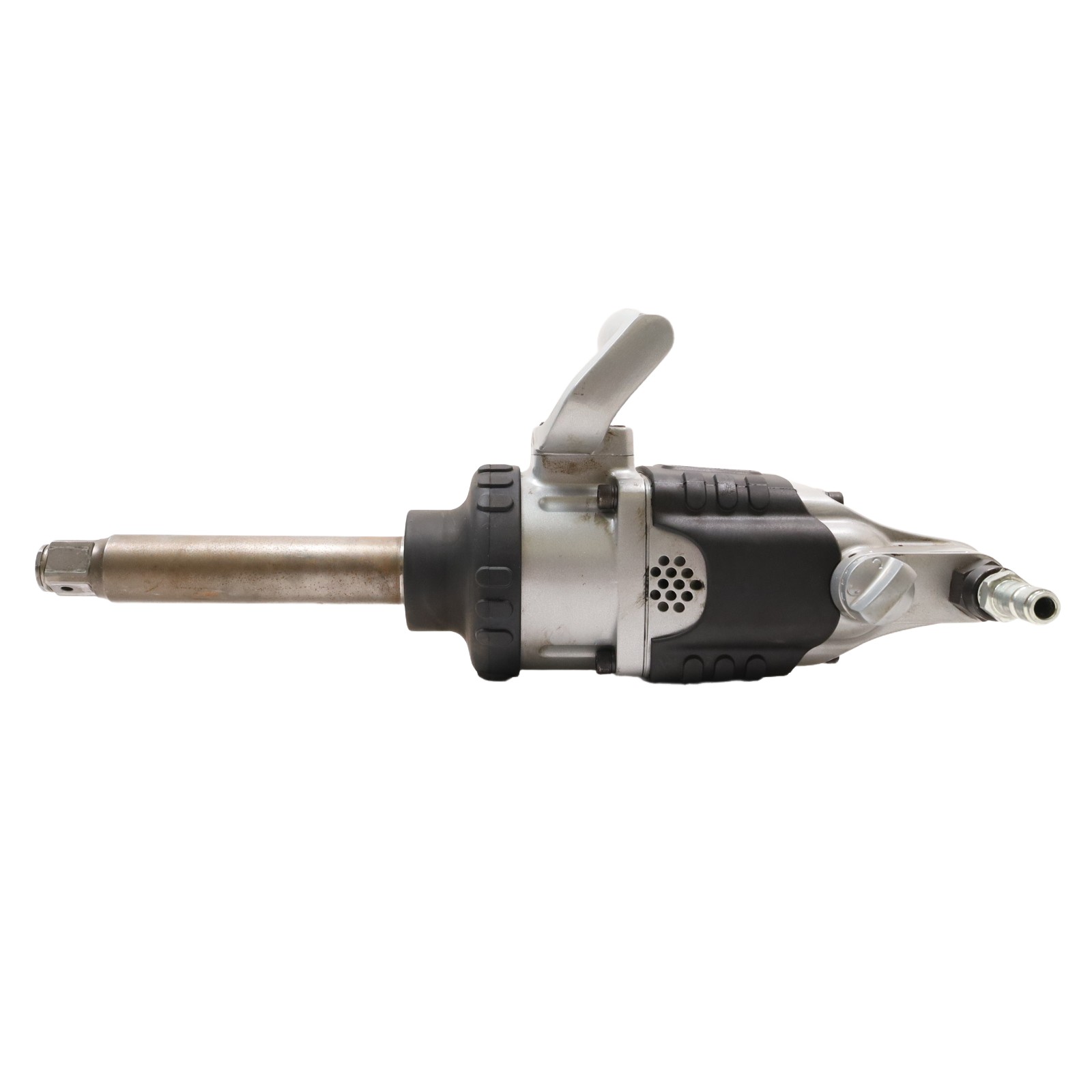 Engineered for demanding applications, delivering up to 1475 ft-lbs (2000 Nm) of forward and reverse torque with a free speed of 5250 RPM and 700 blows per minute. Its extended anvil with square, hog-ring, and thru-hole drive options provides secure socket retention and easier access to hard-to-reach areas. Built with a steel hammer case and metal housing, this tool is designed to endure repeated drops and harsh environments. The rocking dog mechanism ensures powerful impacts with efficient air use, while phenolic vanes improve durability in tough conditions. A protective rubber tool boot, feather-touch trigger for precise control, and rugged design make this impact wrench a strong choice for vehicle repair, heavy trucks, tire service, and maintenance operations.