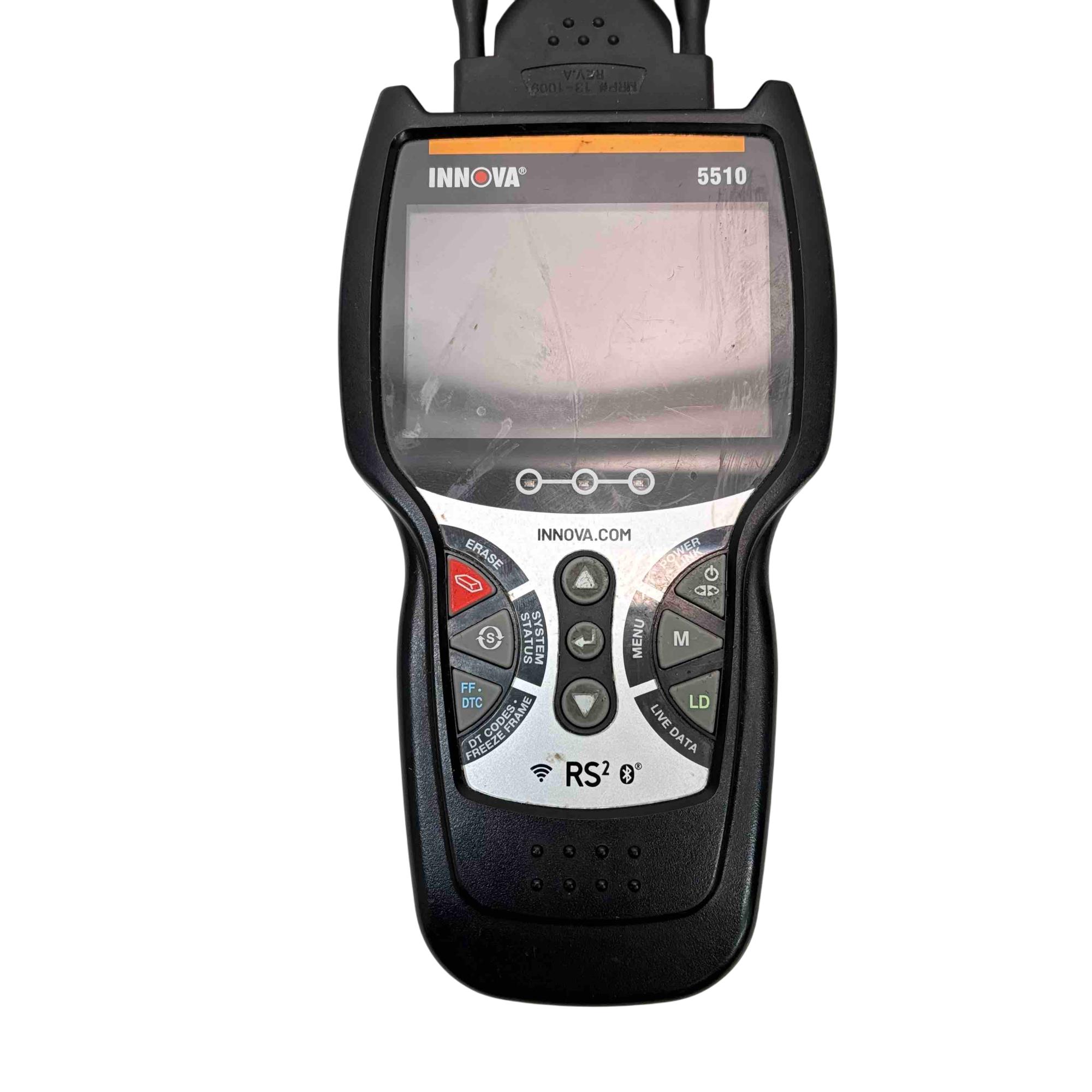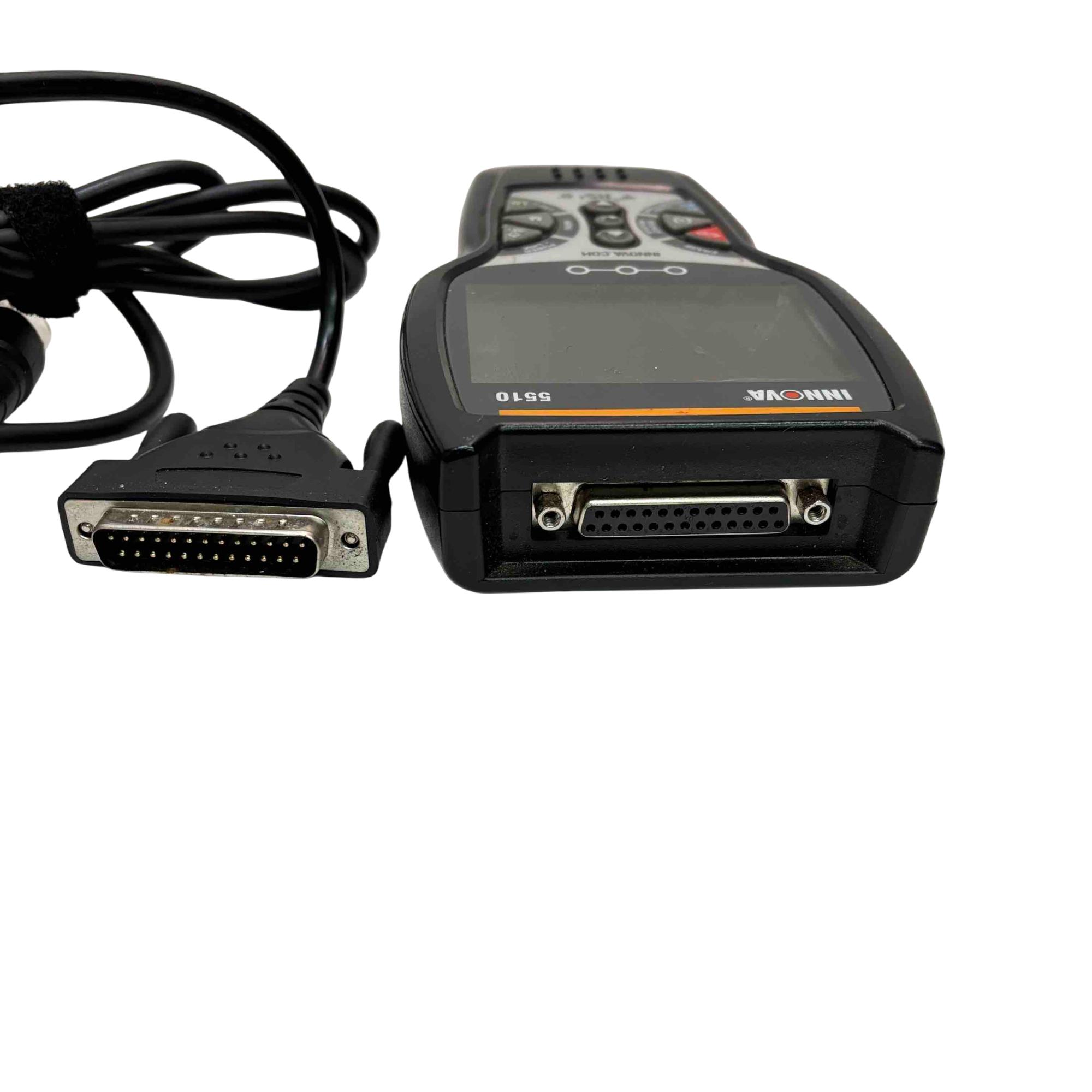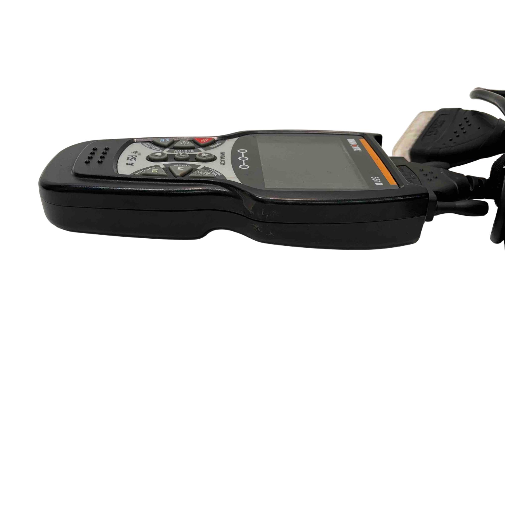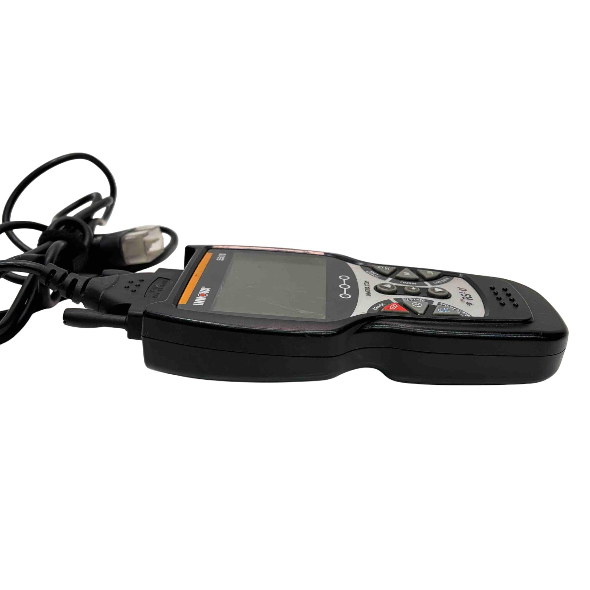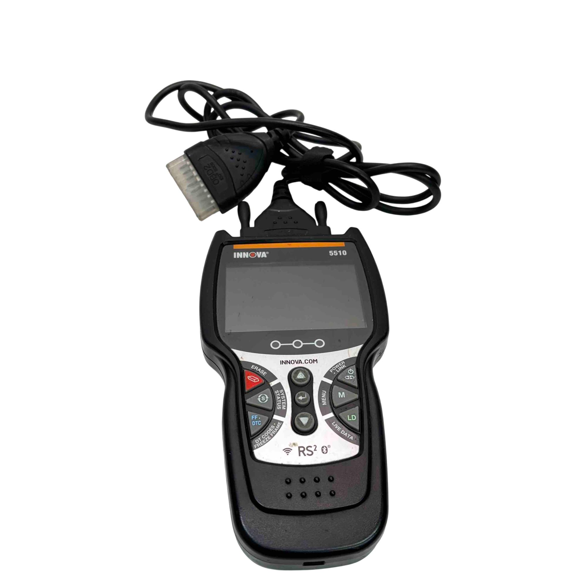 A versatile automotive diagnostic tool designed to help maintain peak vehicle performance and safety. It allows users to easily identify and resolve automotive issues with its OBD2 Bluetooth app, RepairSolutions2, offering real-time troubleshooting solutions, access to a comprehensive database, and assistance in finding the right parts for repairs. This scanner excels in reading and clearing check engine lights, and provides diagnostics for ABS, brake pad life, oil system, tire pressure, and transmission temperature. Additionally, it can test hybrid battery cells. The Innova 5510 features capabilities to graph, record, and playback vehicle data for thorough analysis. It also aids in self-diagnosis of emission status, helping users anticipate smog test results.