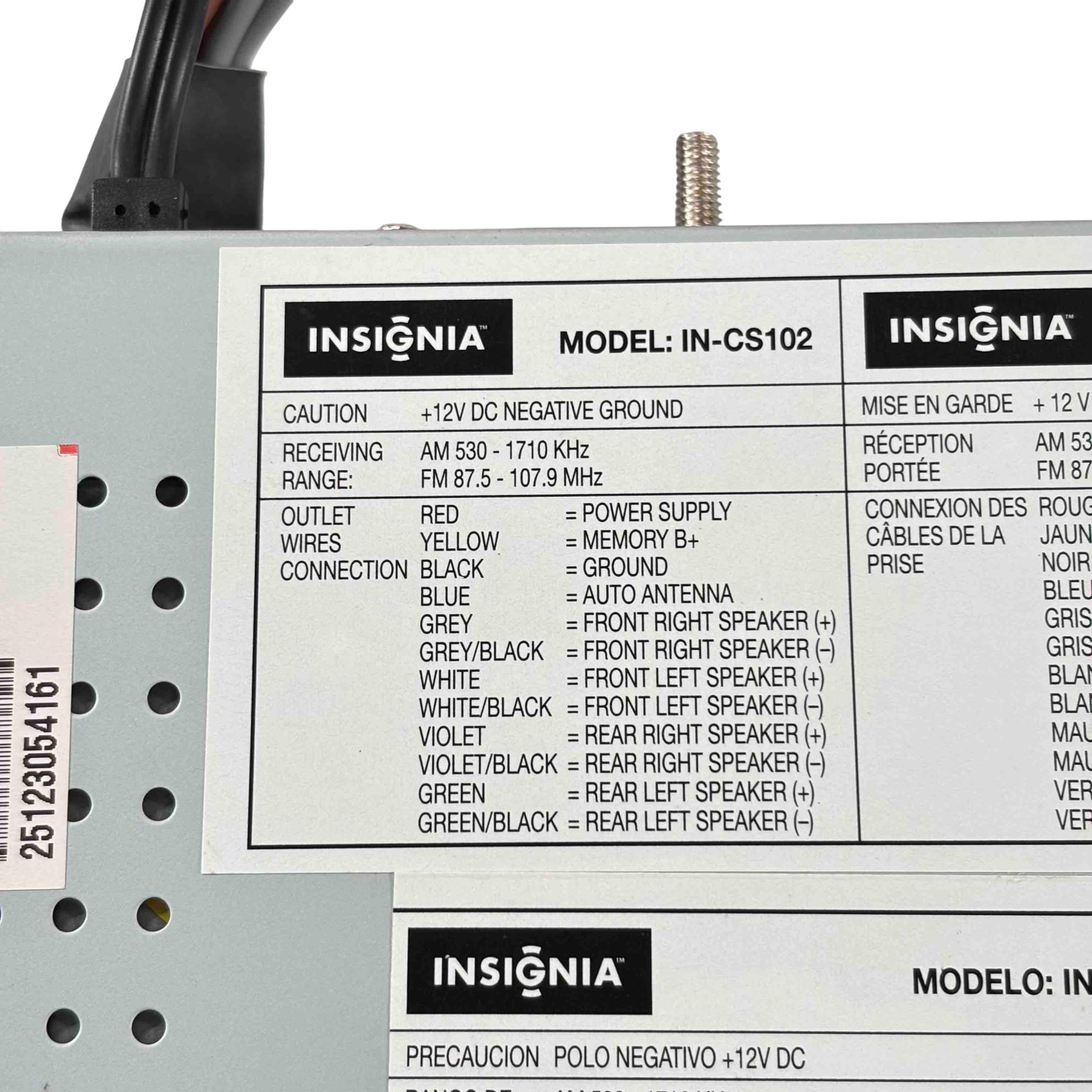 The Insignia IN-CS102 Single-DIN In-Dash Receiver enhances your car audio system with support for CDs, MP3s, and WMAs. It features a bright blue digital display, multiple input options, and simple controls for a user-friendly experience. Designed for clear sound and easy installation, it offers a reliable upgrade for in-vehicle entertainment.