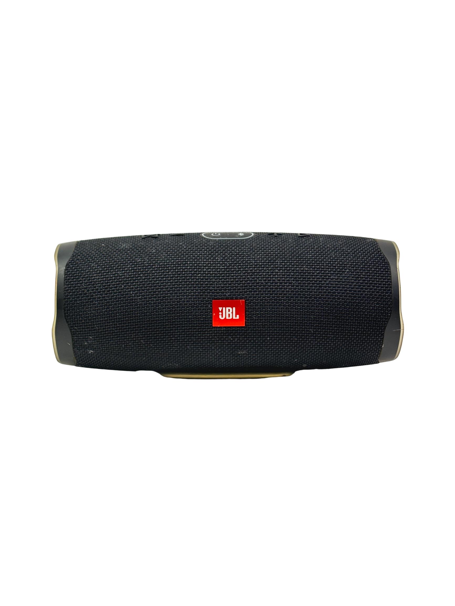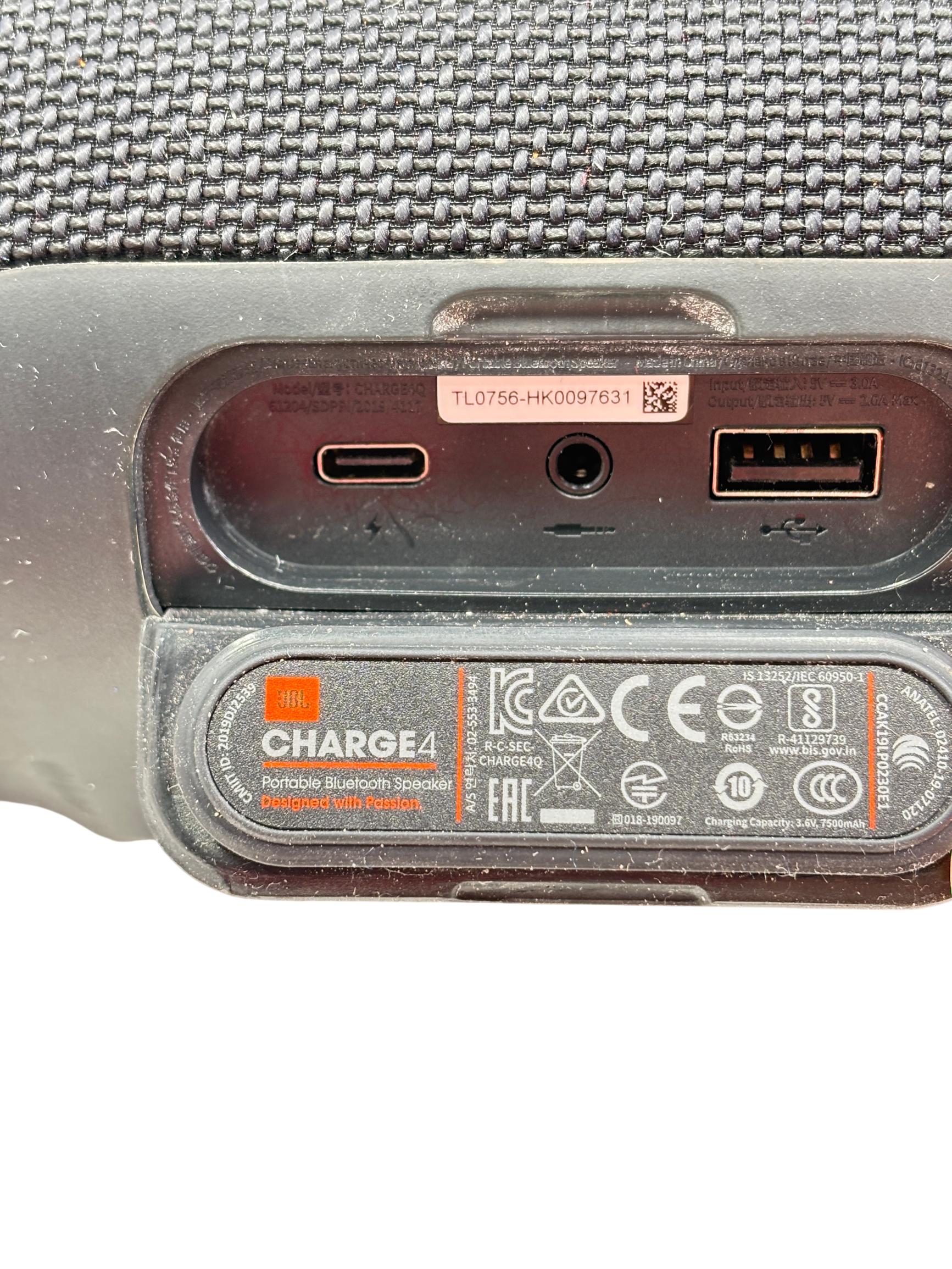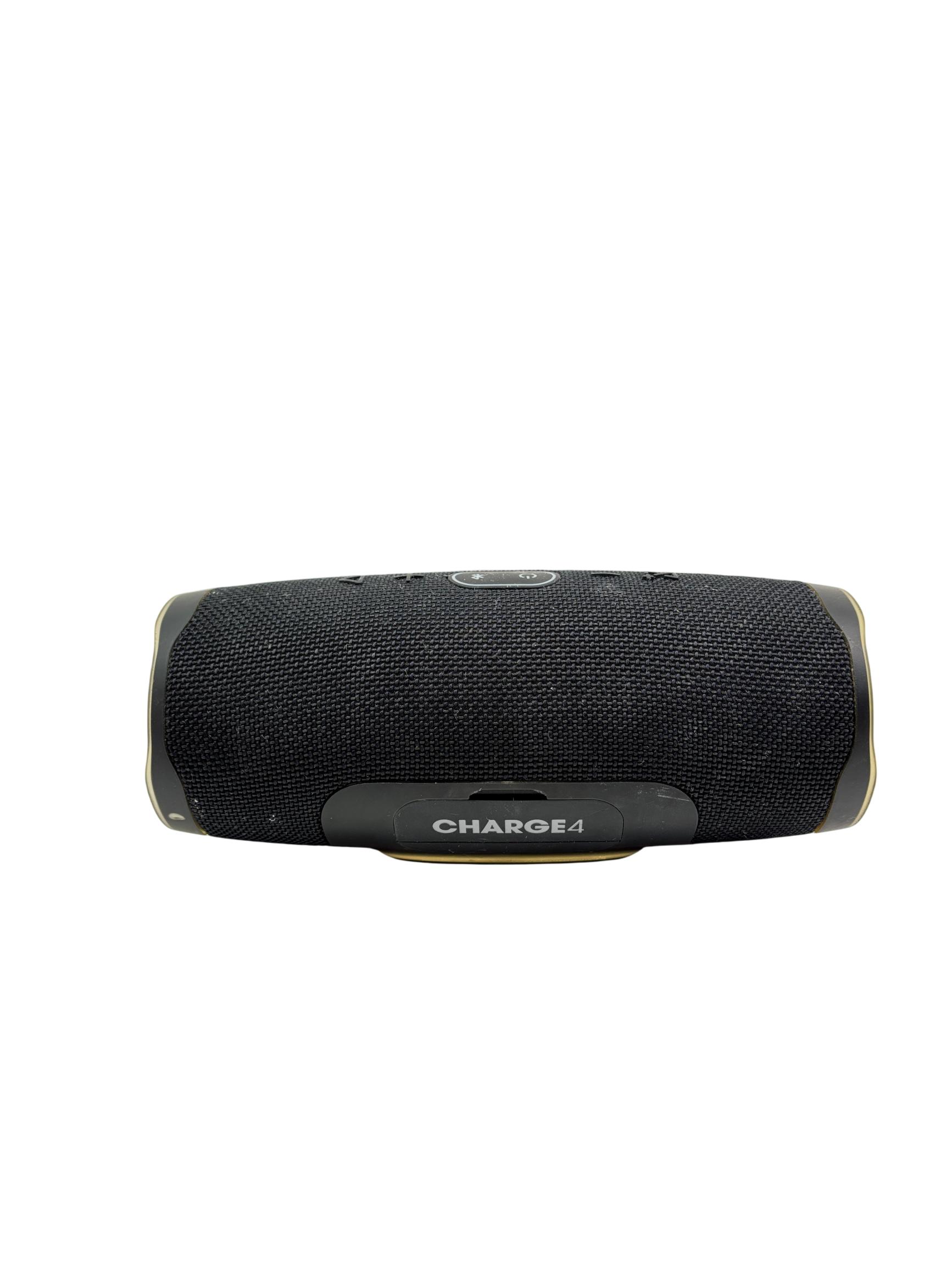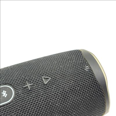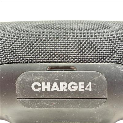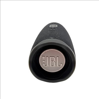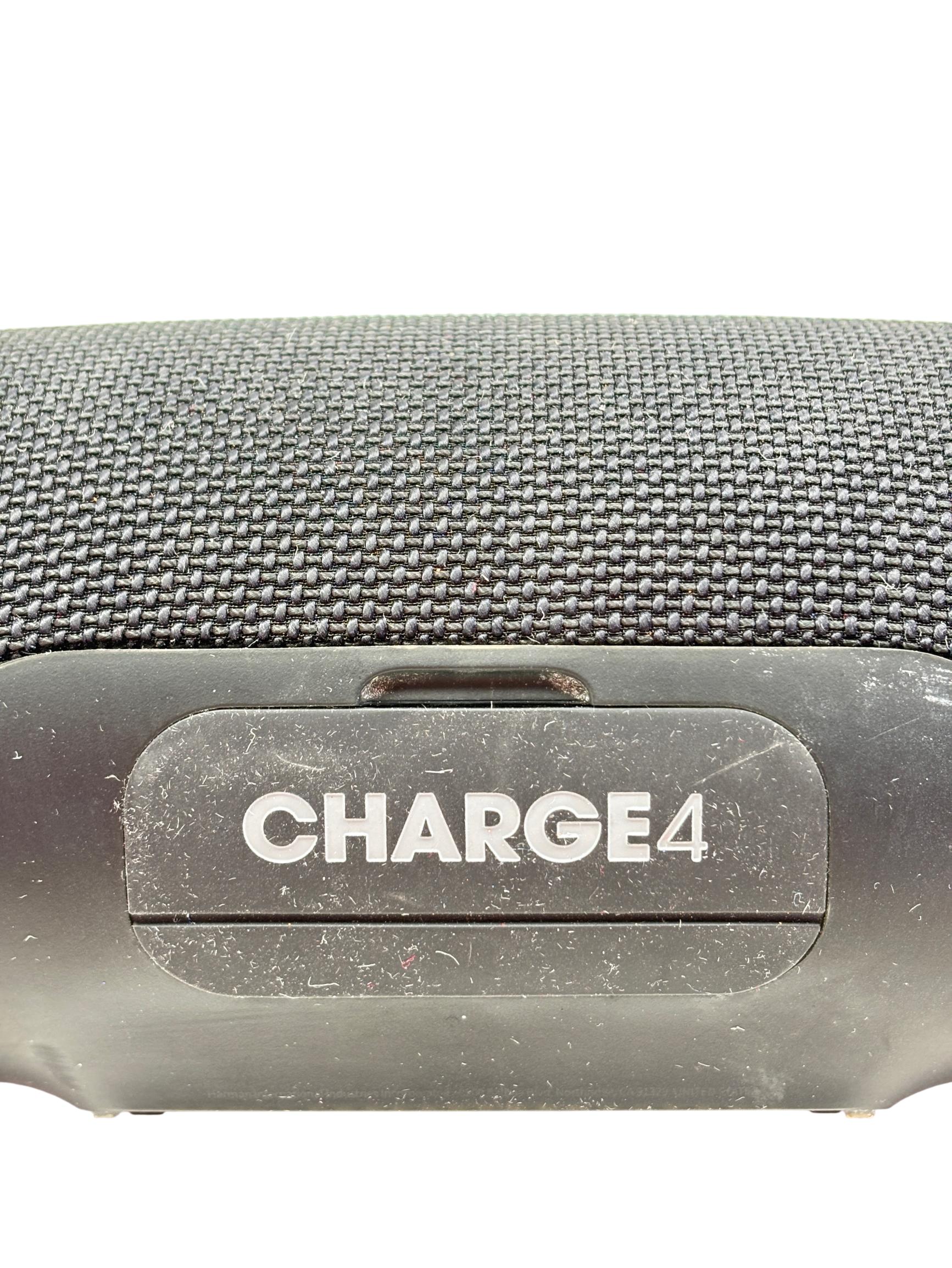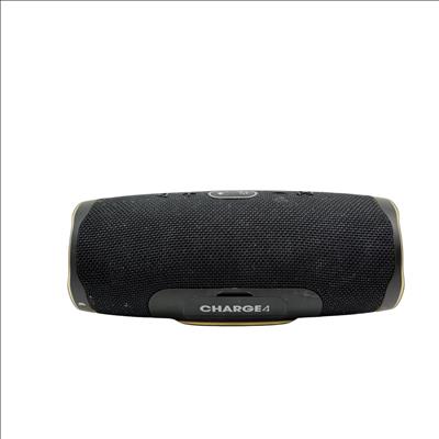JBL Charge 4 Portable Bluetooth Speaker in black delivers powerful audio with deep bass and clear, balanced sound. Designed for outdoor use, it features a durable, waterproof build and convenient button controls for easy operation on the go.