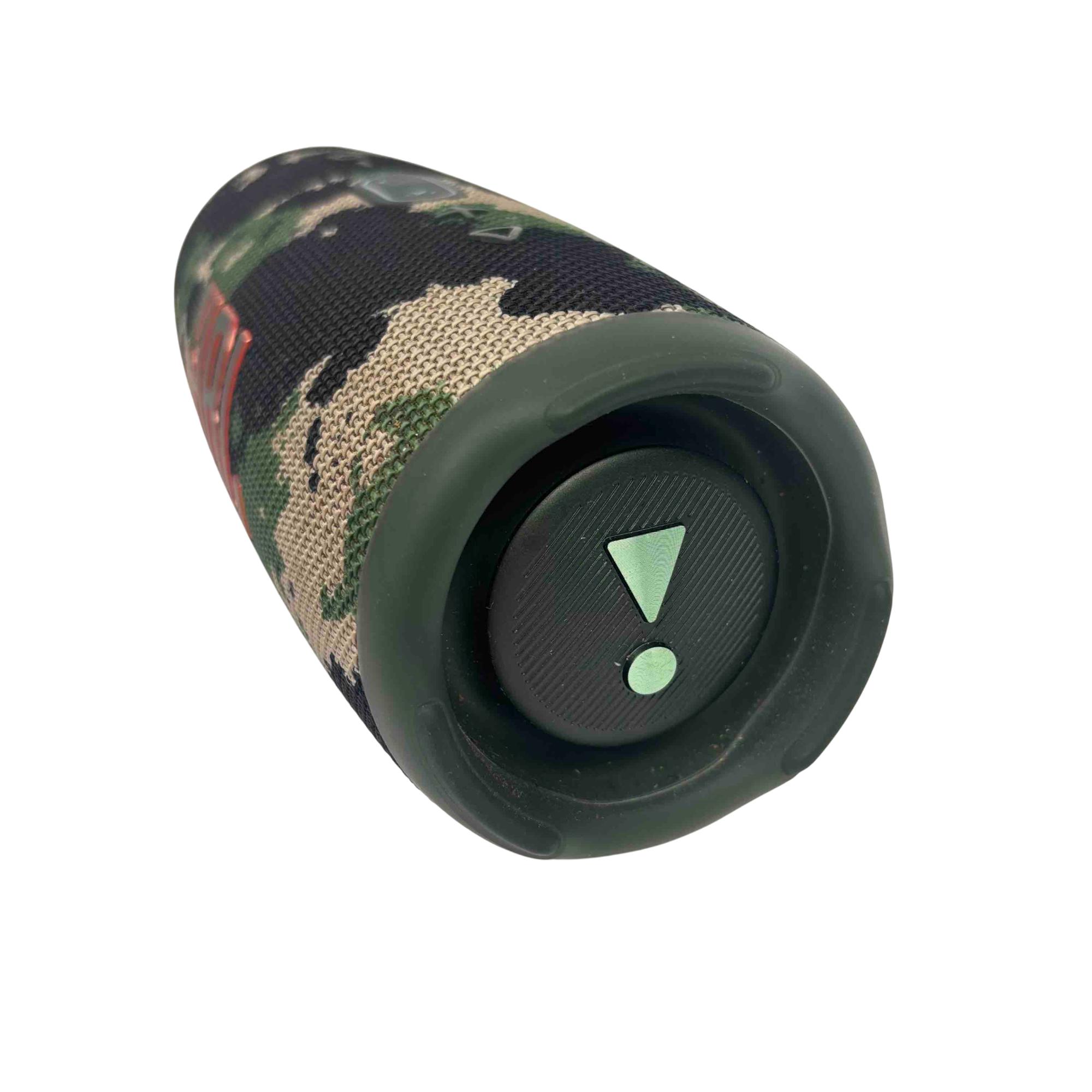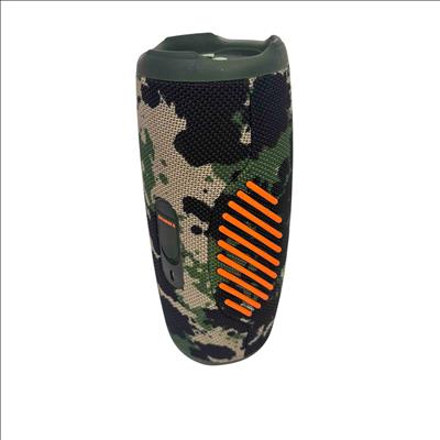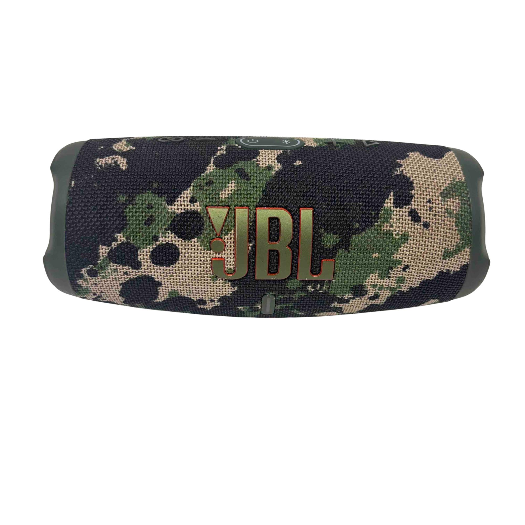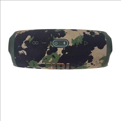 The JBL Charge 5 Portable Bluetooth Speaker in camouflage features a rugged design combined with powerful, clear audio performance. Its water-resistant and durable build makes it ideal for outdoor use, delivering bold sound with deep bass through a compact and travel-friendly form factor.