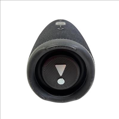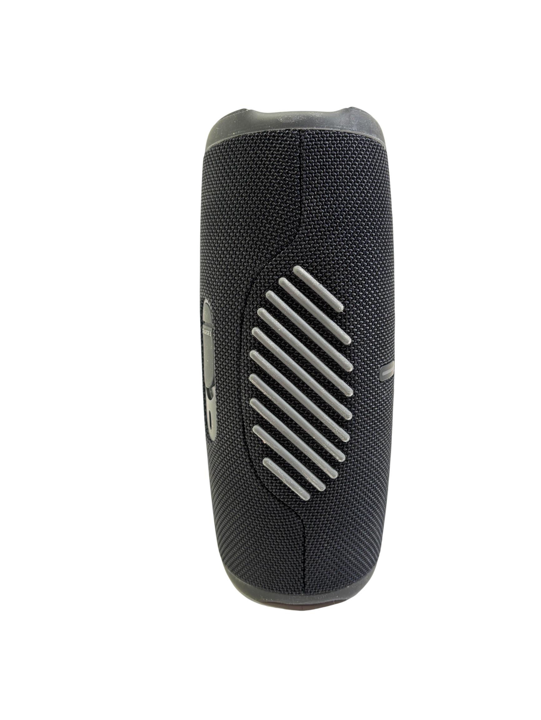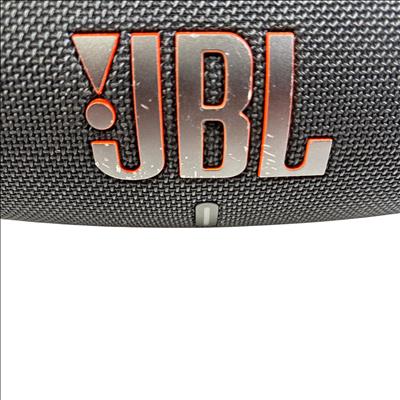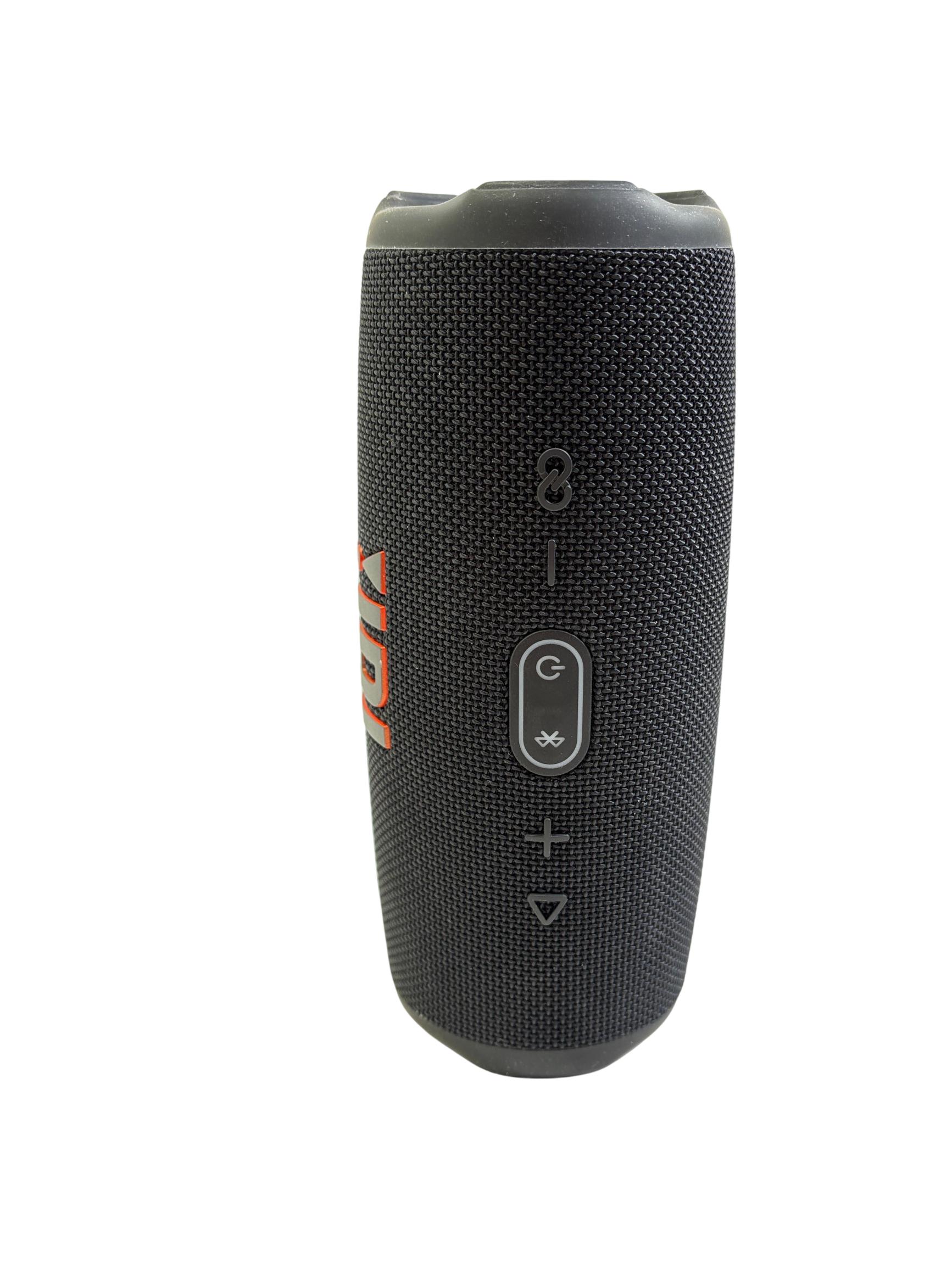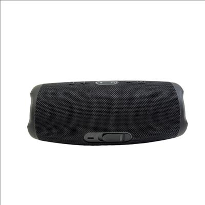 JBL Charge 5 Portable Waterproof Bluetooth Speaker in black delivers powerful, bold sound with deep bass and clear highs. Designed for durability, this speaker features a waterproof construction and an easy-to-use interface with tactile buttons and distinct design elements that make it ideal for both indoor and outdoor use.