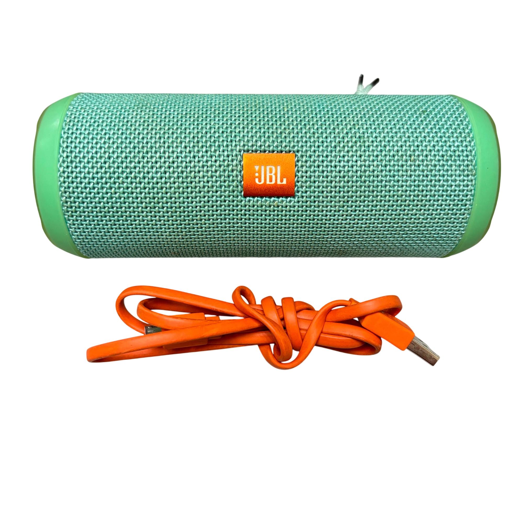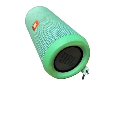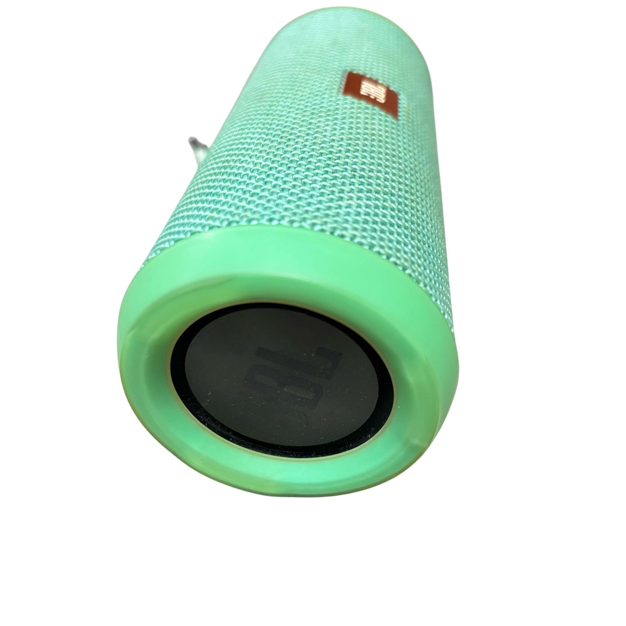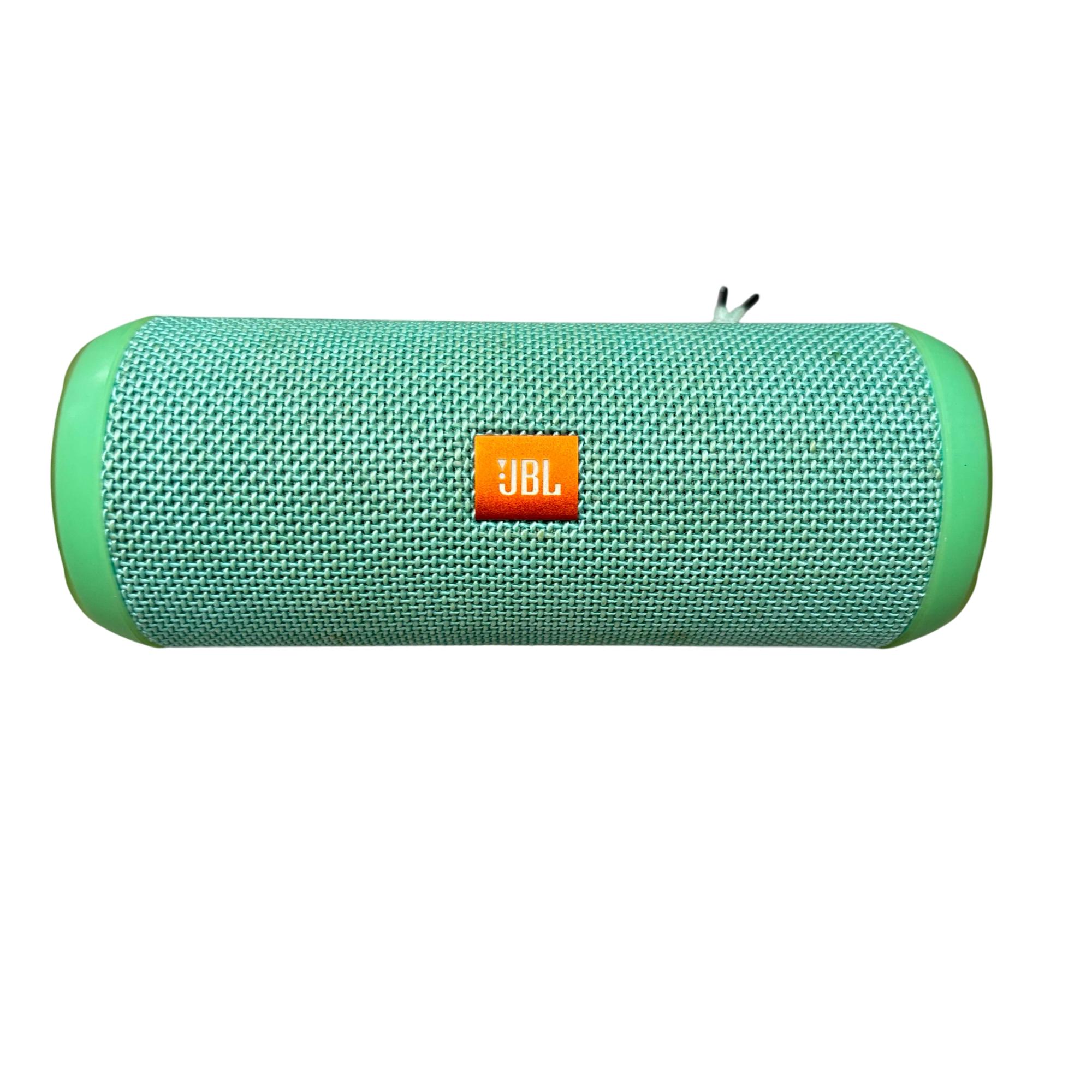 The JBL Flip 3 Portable Bluetooth Speaker in green delivers powerful stereo sound with its robust drivers housed in a compact, cylindrical design. This wireless speaker features a durable build ideal for both indoor and outdoor use, offering seamless Bluetooth connectivity for easy pairing with a variety of devices.