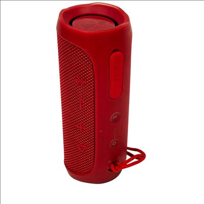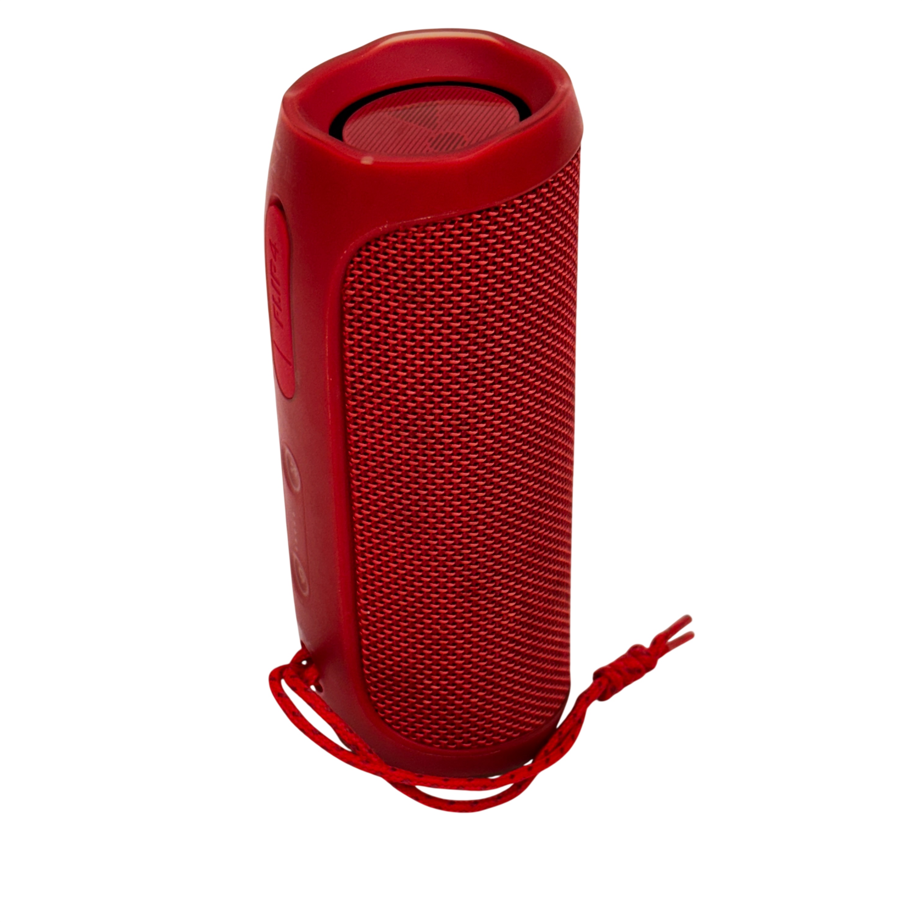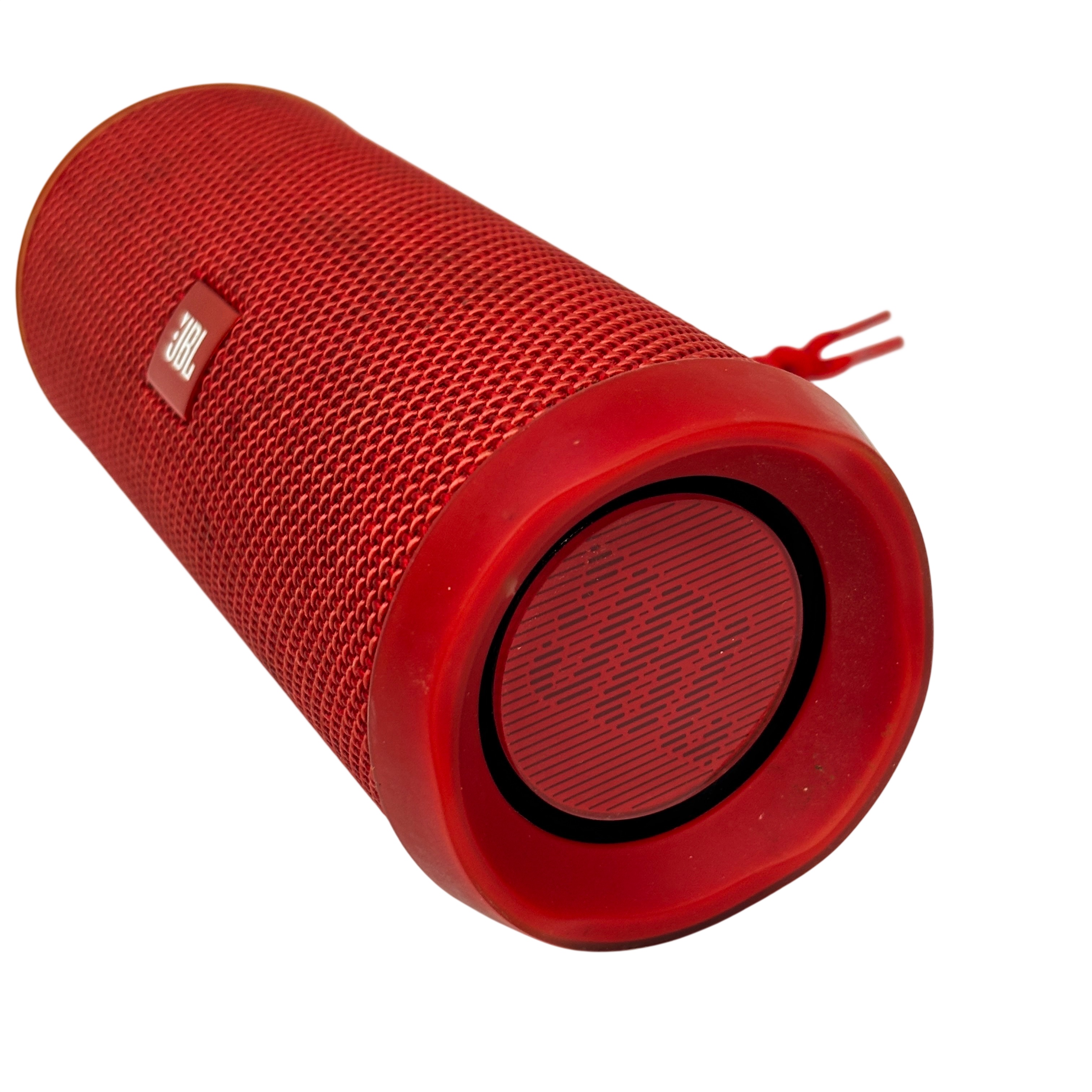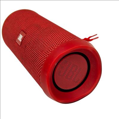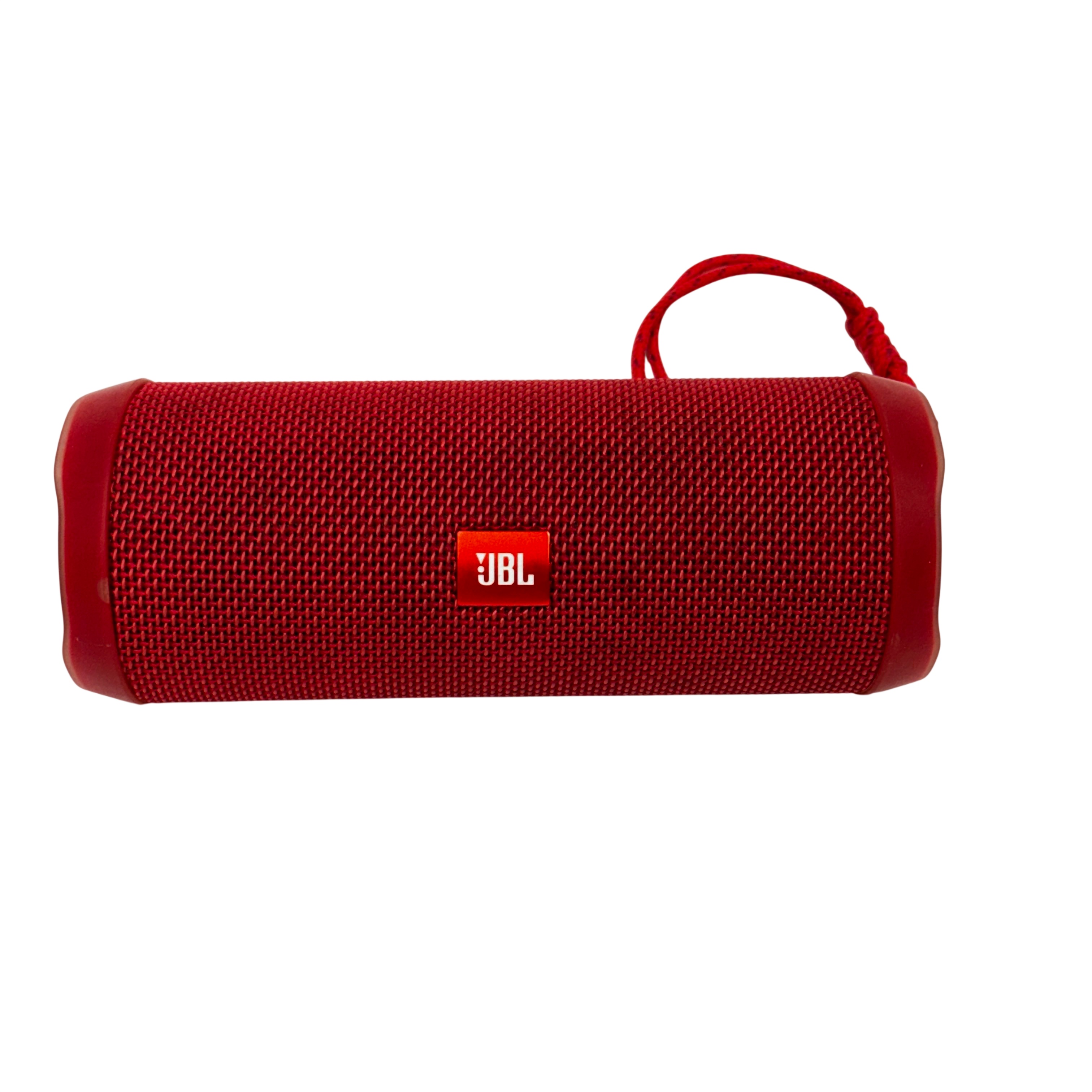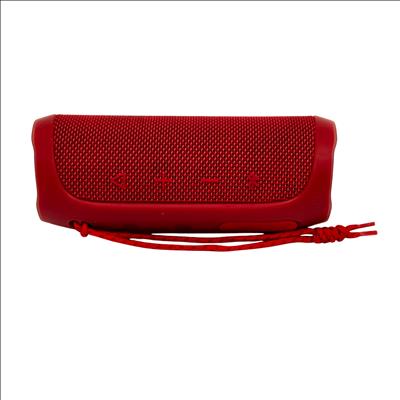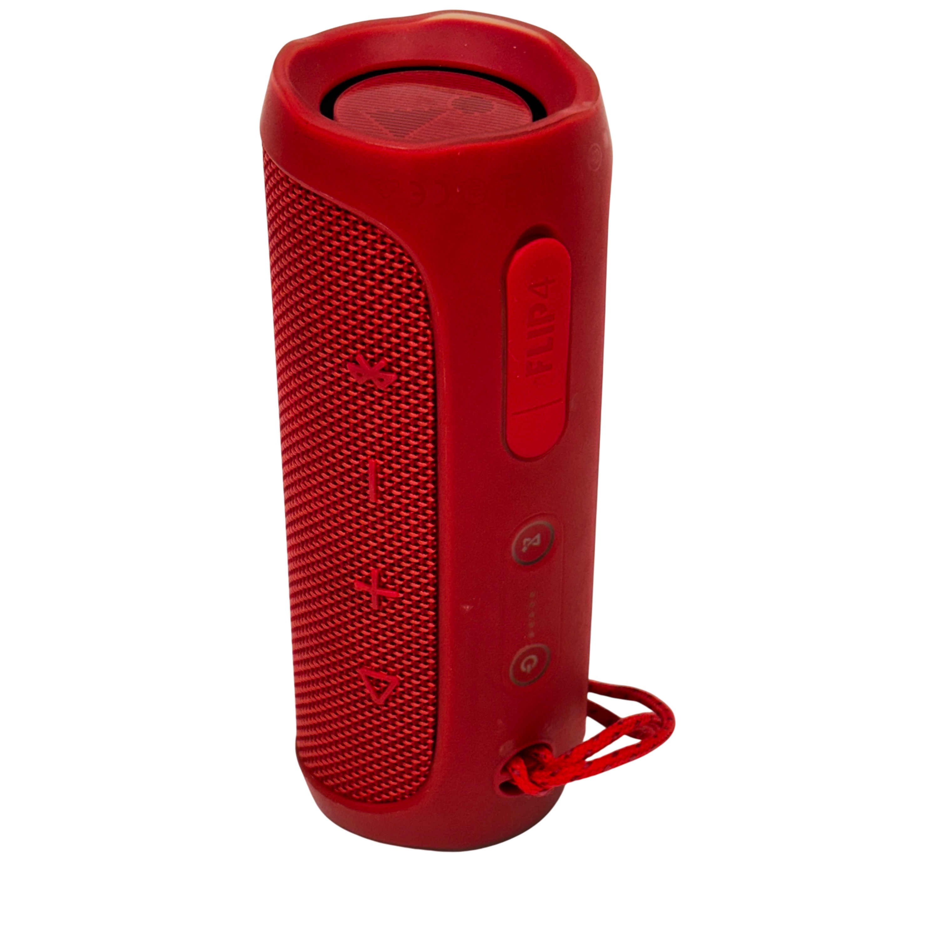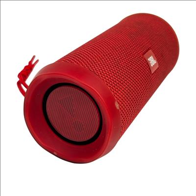 This JBL Flip4 Portable Bluetooth Speaker offers a vibrant red design with powerful sound and a compact form factor. This waterproof speaker features Bluetooth connectivity and a built-in microphone, making it perfect for outdoor adventures.