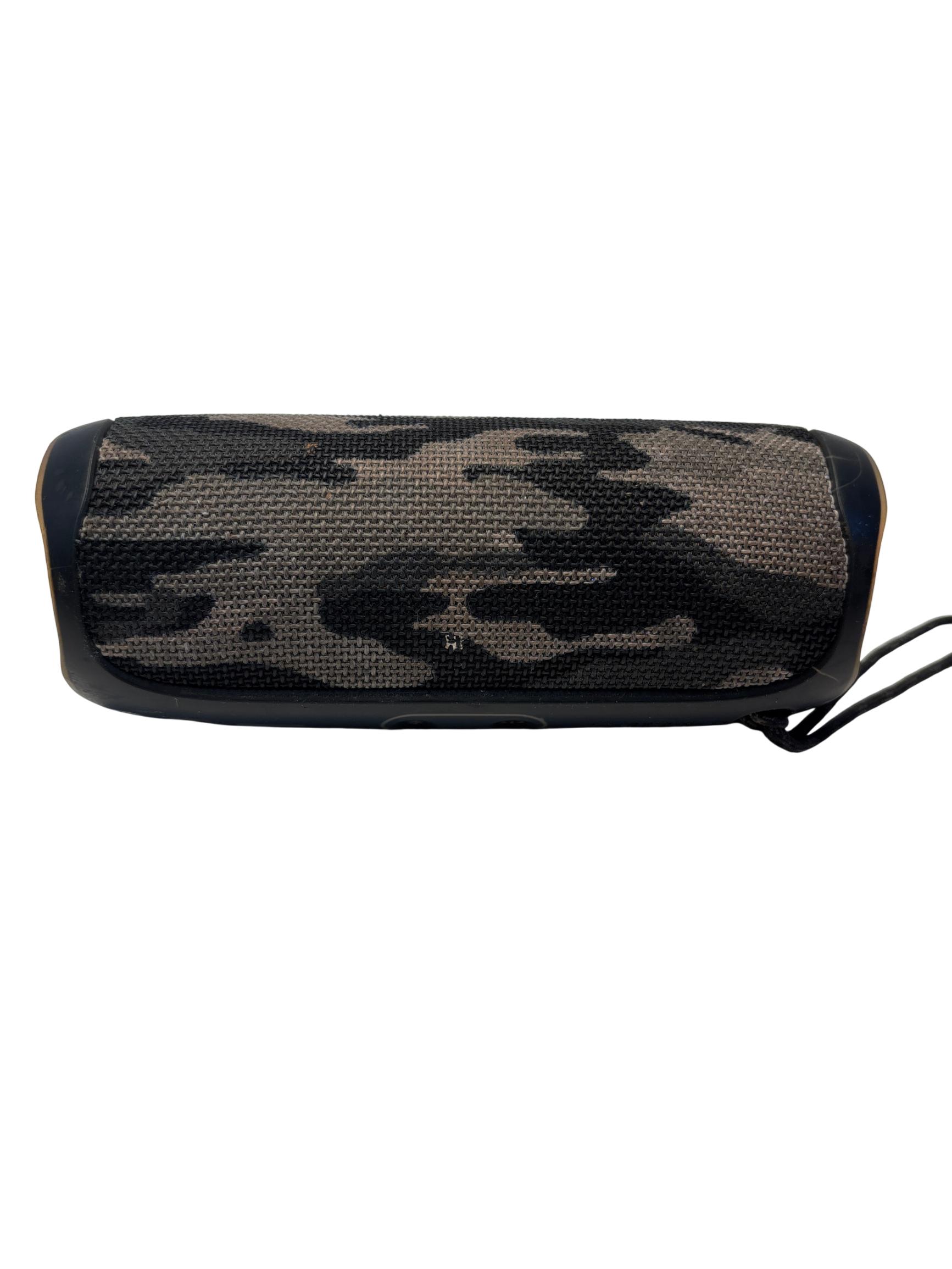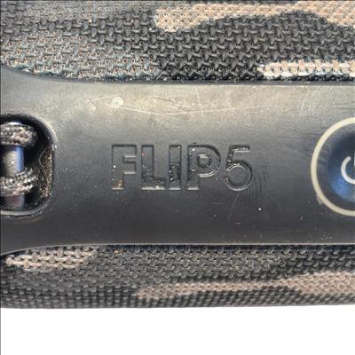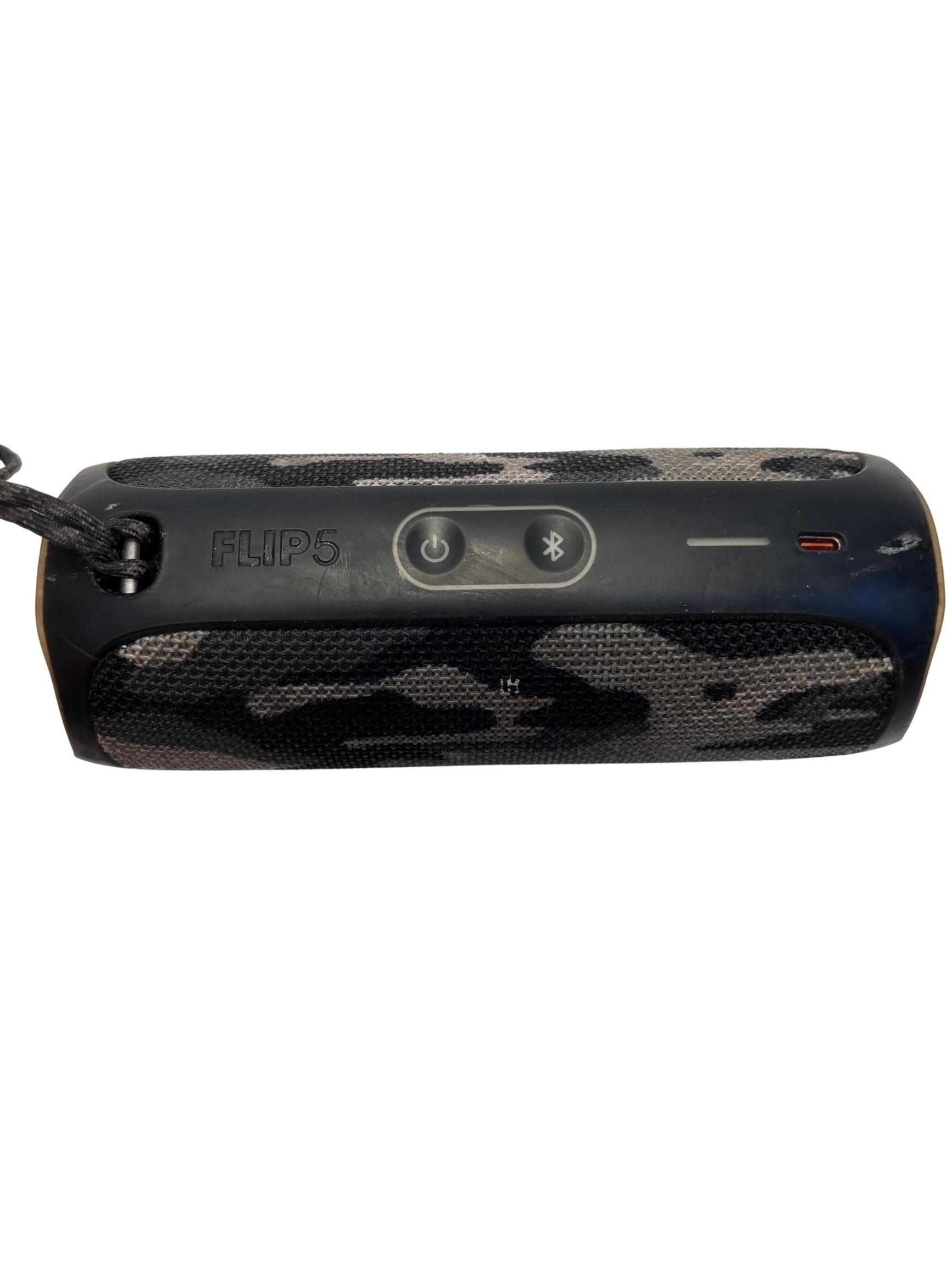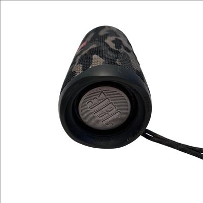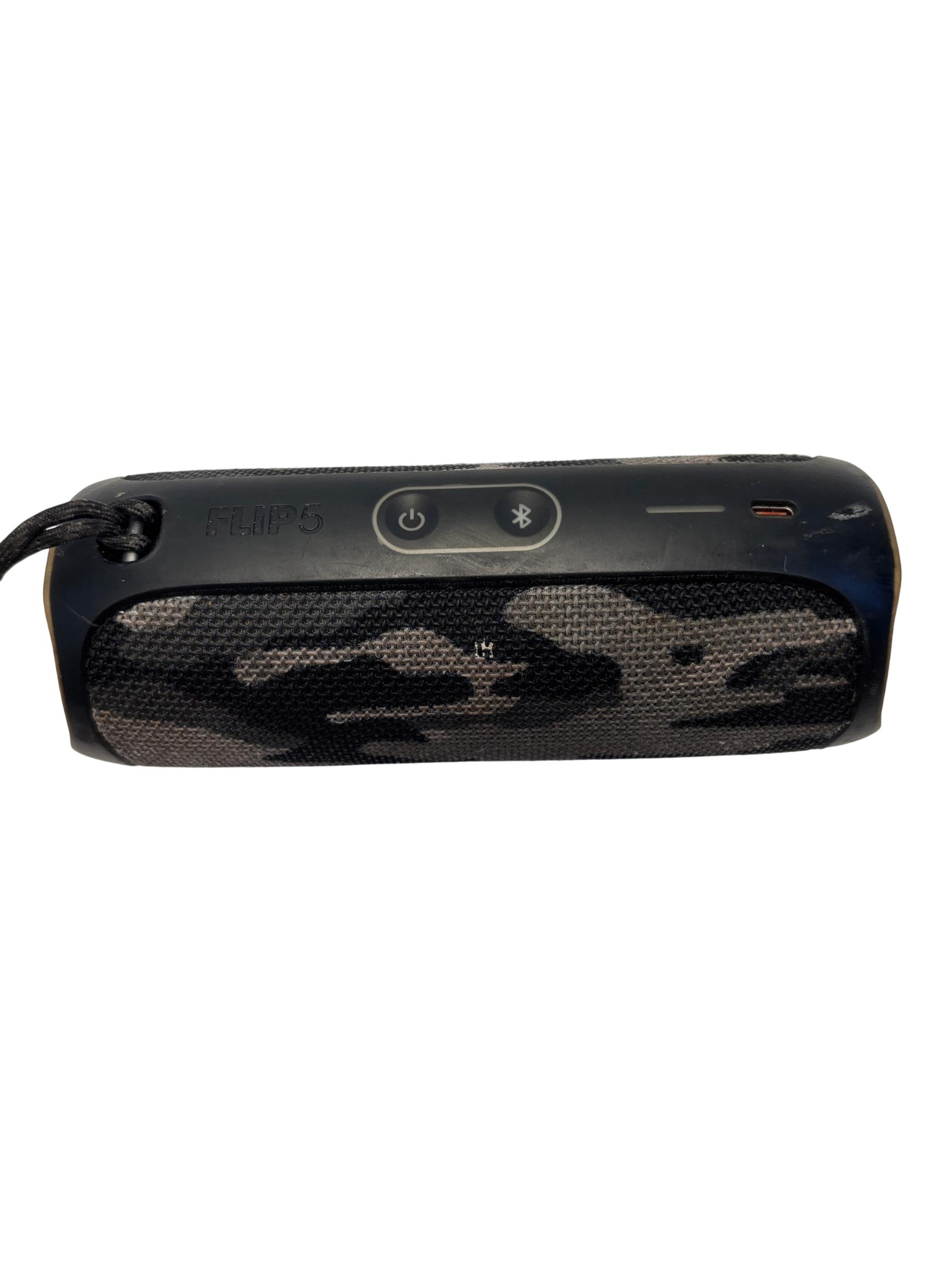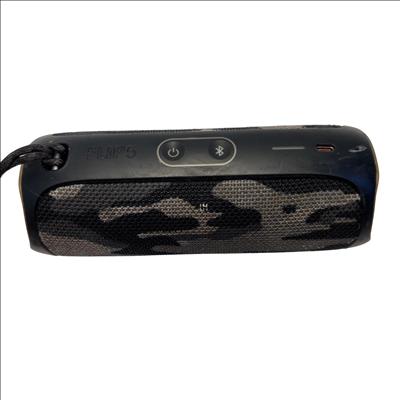 The JBL Flip 5 Portable Waterproof Bluetooth Speaker delivers powerful, clear sound with its rugged and splashproof design, perfect for outdoor and everyday use. Featuring a sleek black and grey camouflage pattern with a distinctive red logo, this compact speaker offers reliable wireless connectivity and robust performance in various environments.