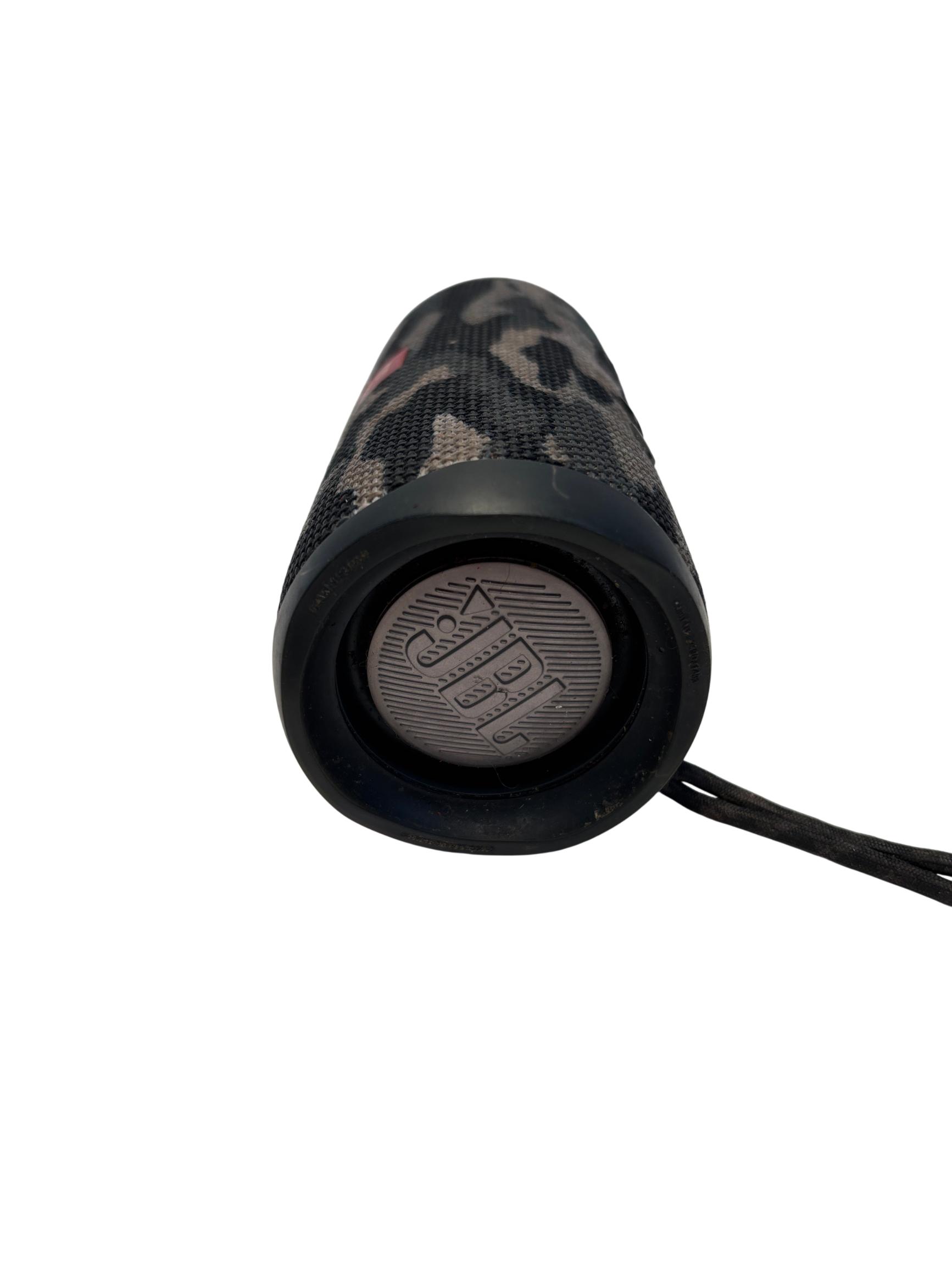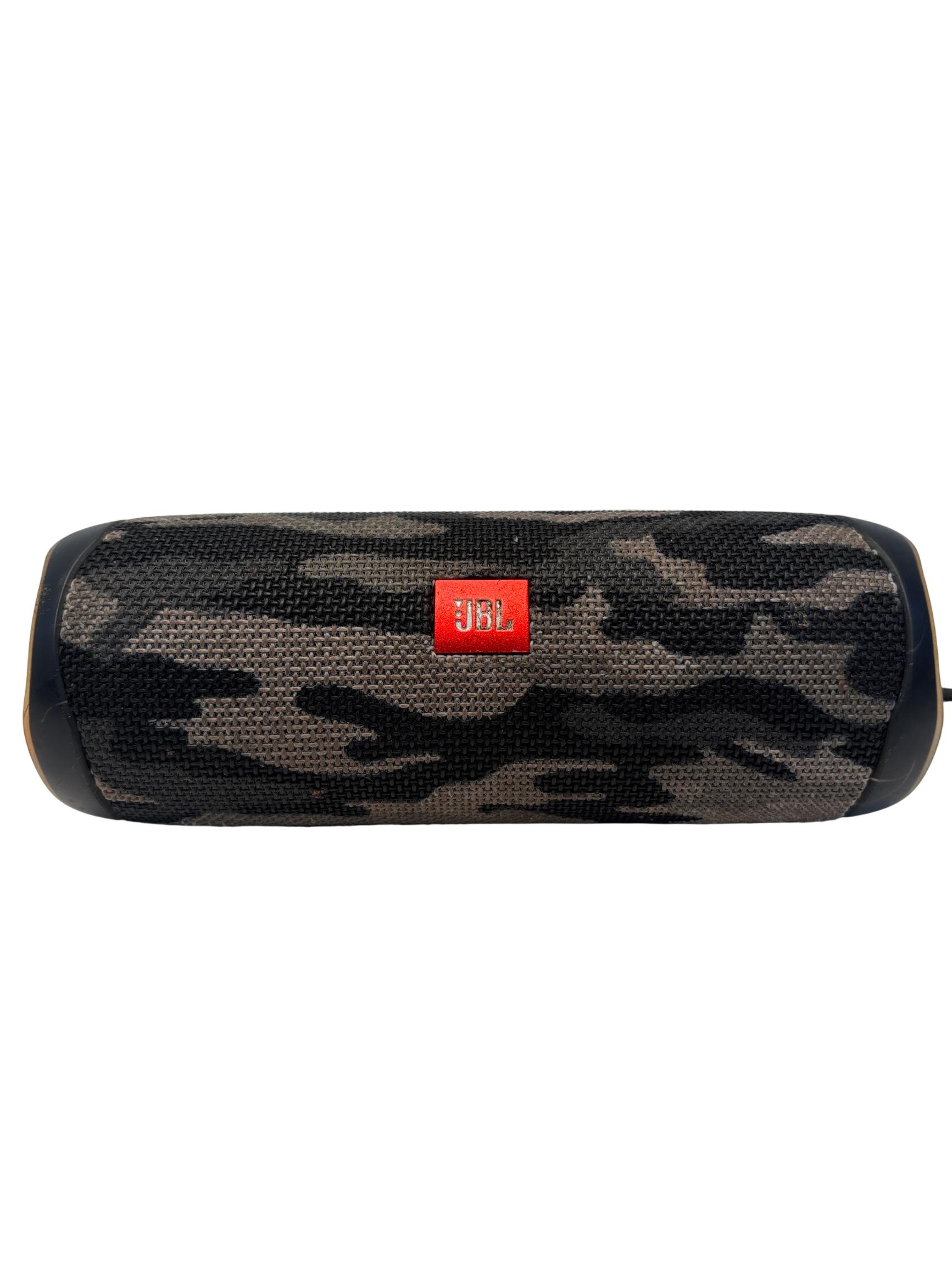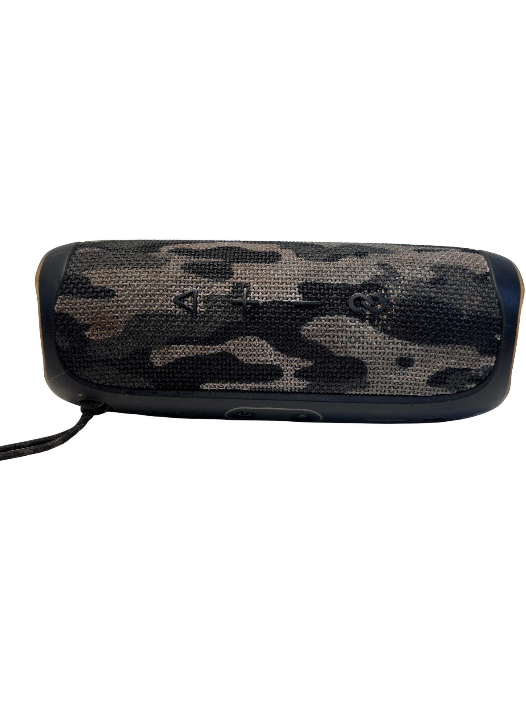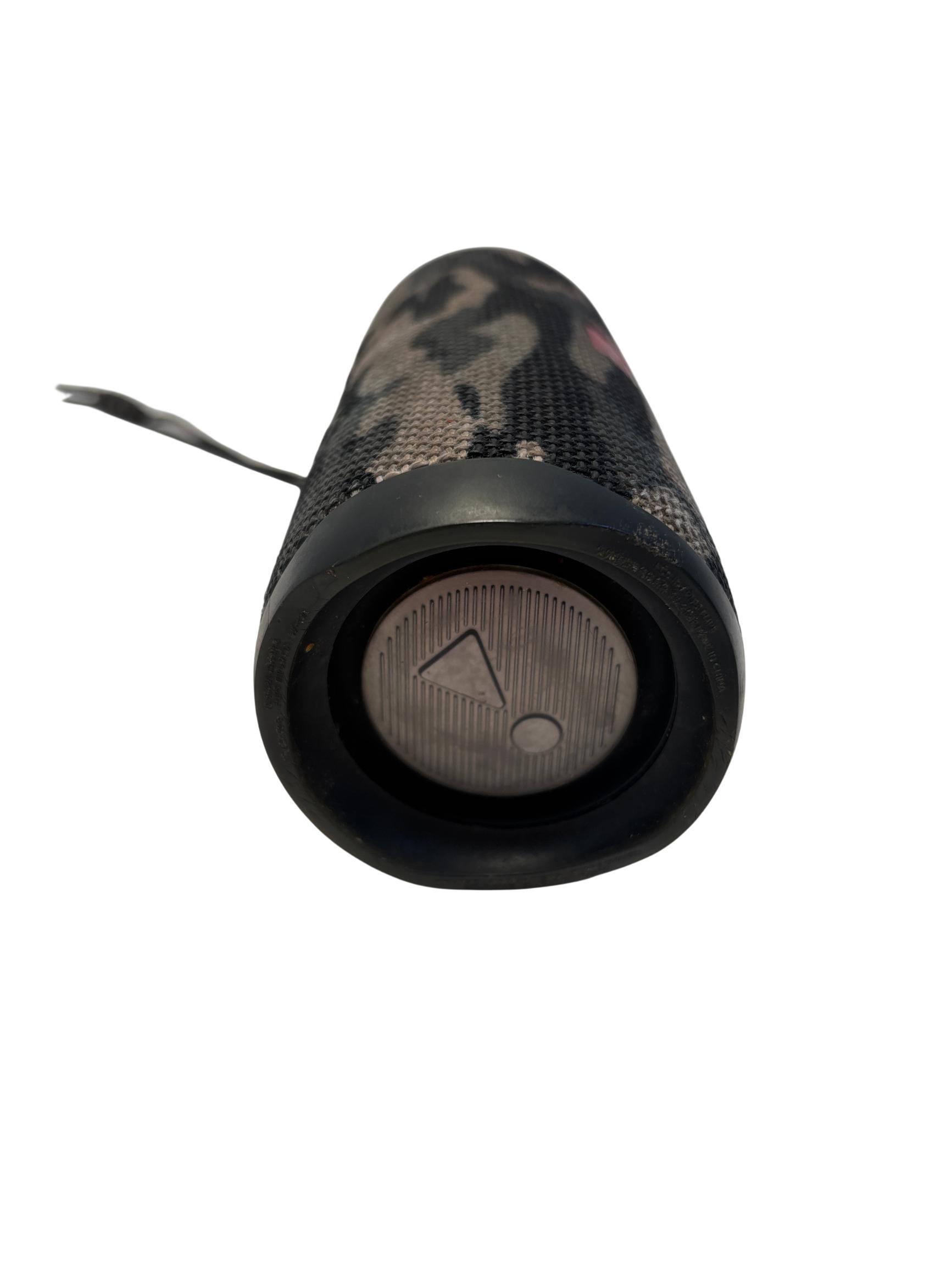 The JBL Flip 5 Portable Waterproof Bluetooth Speaker delivers powerful, clear sound with its rugged and splashproof design, perfect for outdoor and everyday use. Featuring a sleek black and grey camouflage pattern with a distinctive red logo, this compact speaker offers reliable wireless connectivity and robust performance in various environments.