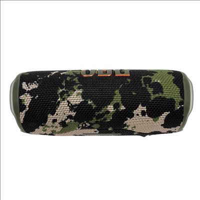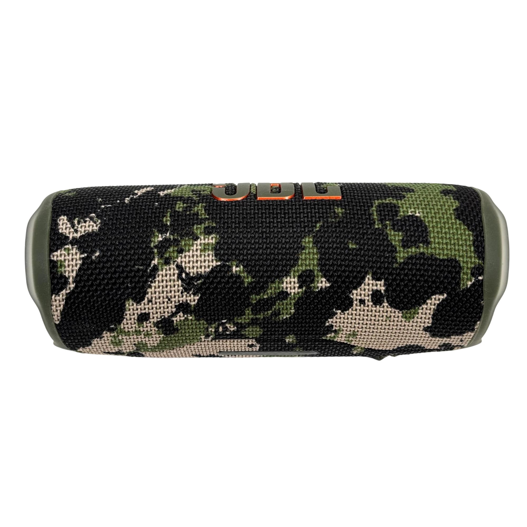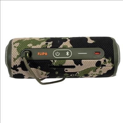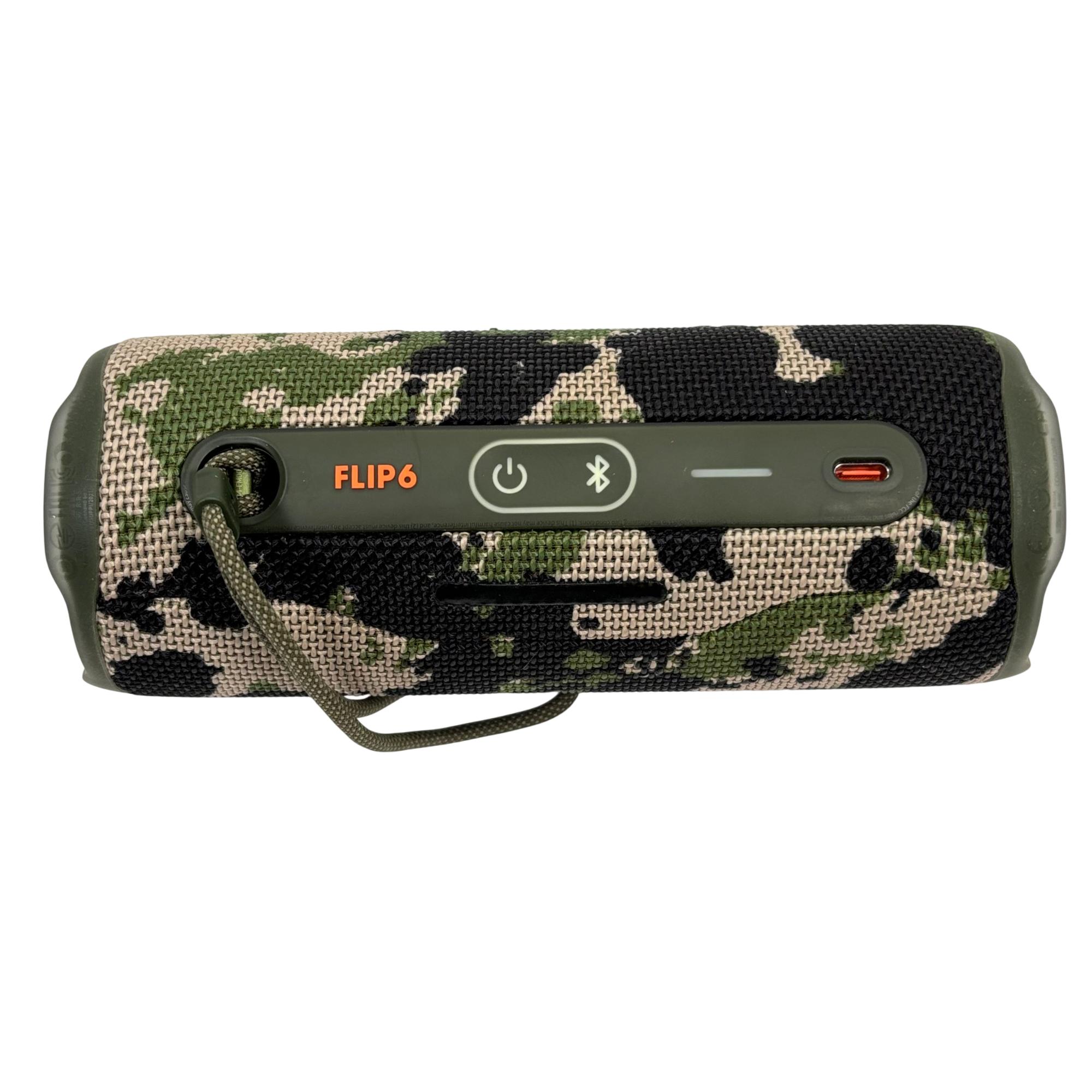 JBL Flip 6 portable Bluetooth speaker features a rugged camouflage design combined with high-performance audio technology for clear, powerful sound suitable for both indoor and outdoor use. This compact, waterproof speaker delivers deep bass and crisp highs, making it ideal for on-the-go music enjoyment in various environments.