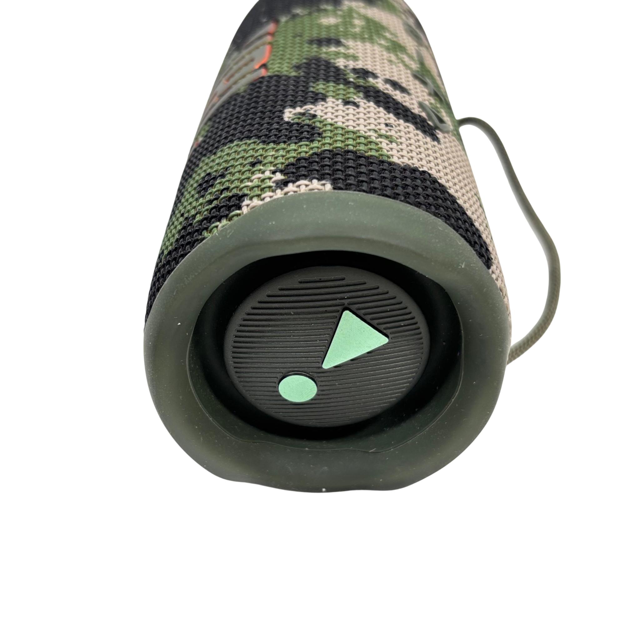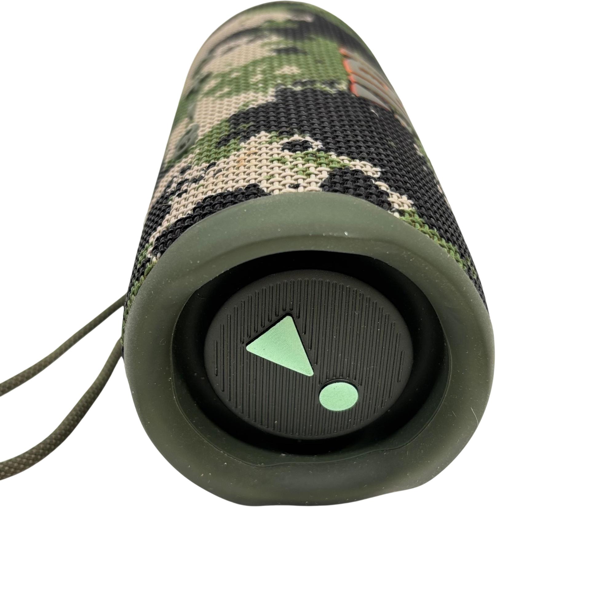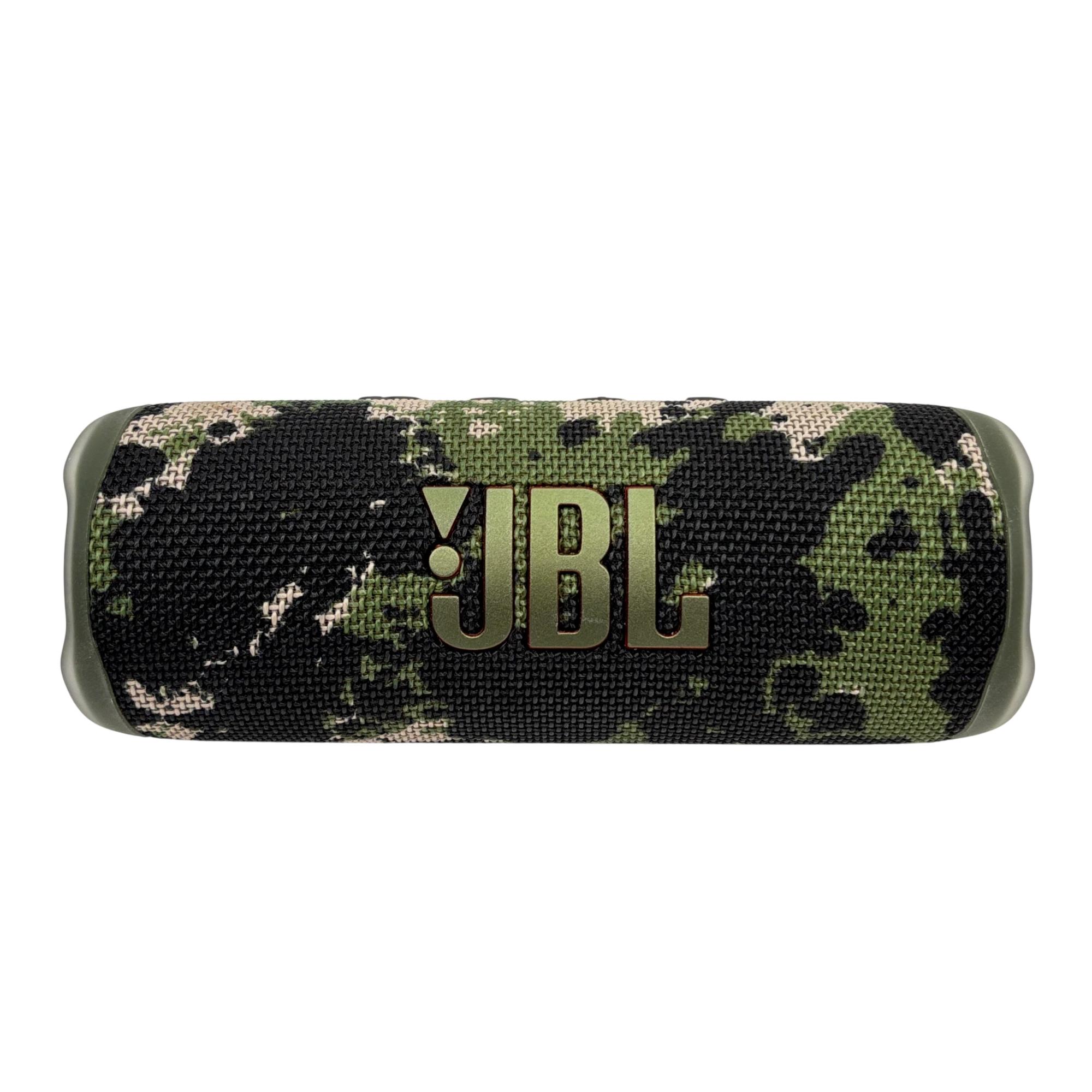 JBL Flip 6 portable Bluetooth speaker features a rugged camouflage design combined with high-performance audio technology for clear, powerful sound suitable for both indoor and outdoor use. This compact, waterproof speaker delivers deep bass and crisp highs, making it ideal for on-the-go music enjoyment in various environments.