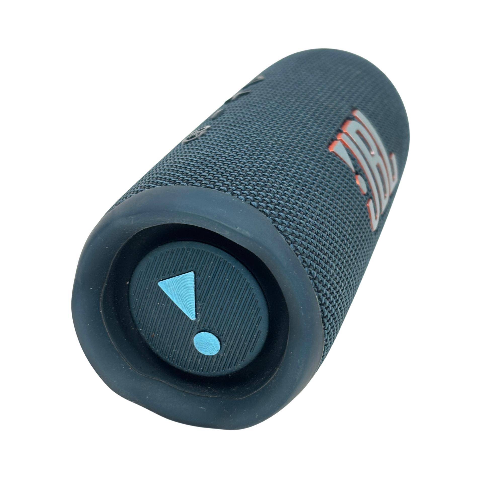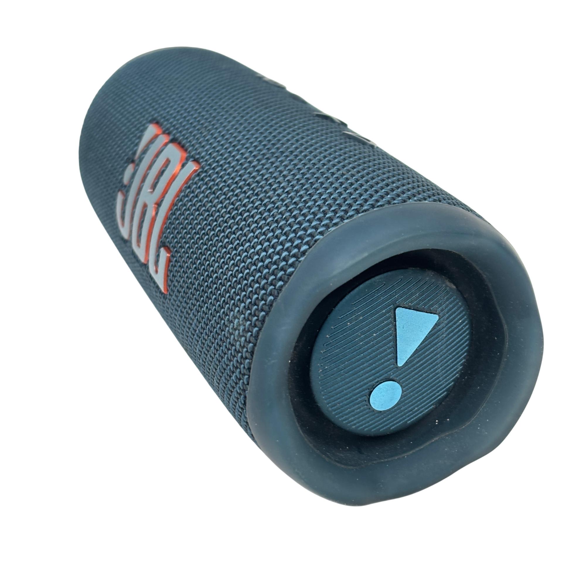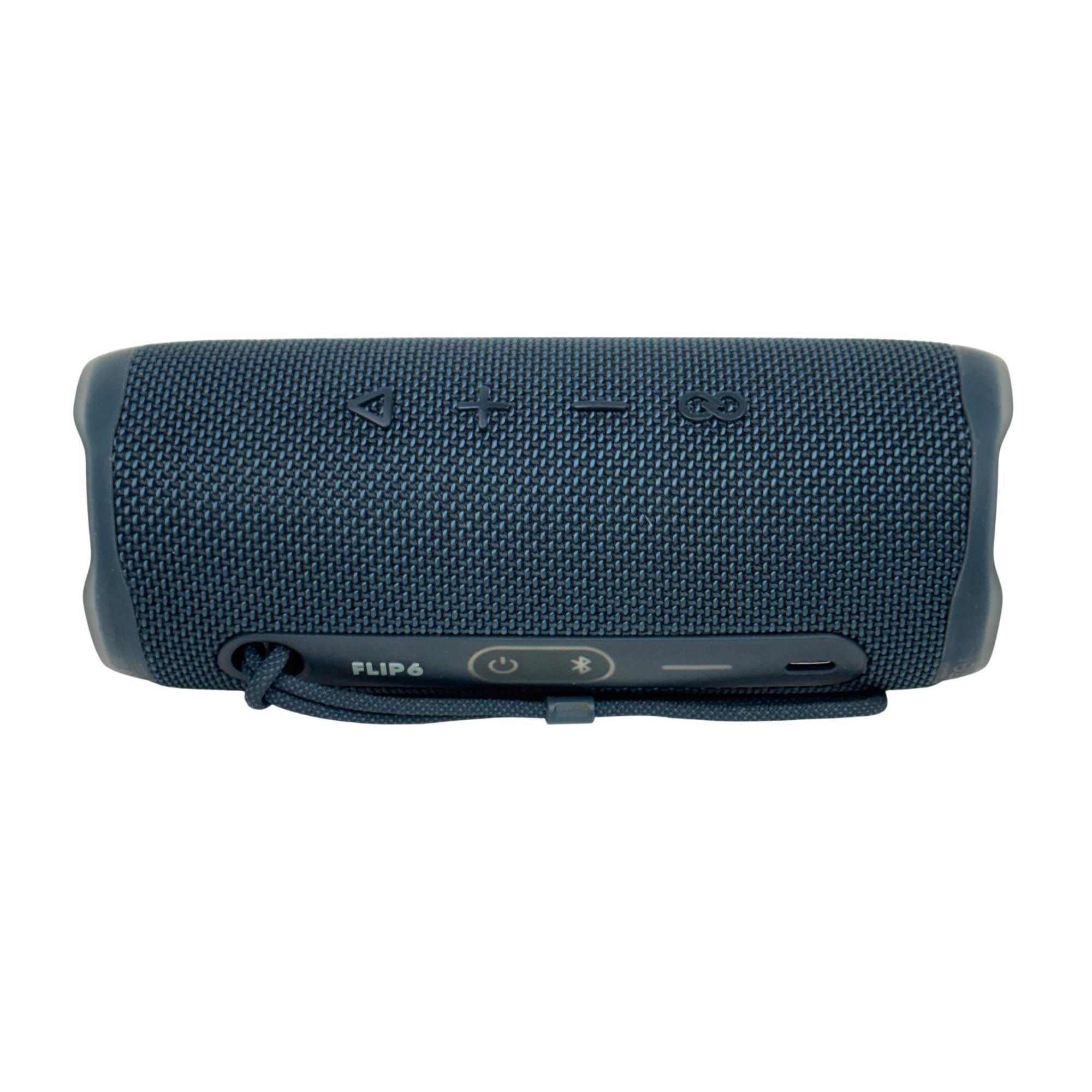 This JBL Flip 6 Portable Waterproof Bluetooth Speaker in blue delivers powerful sound with deep bass in a compact, durable design. This speaker features a sturdy strap for easy portability and a water-resistant body, making it perfect for outdoor use and on-the-go listening.