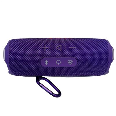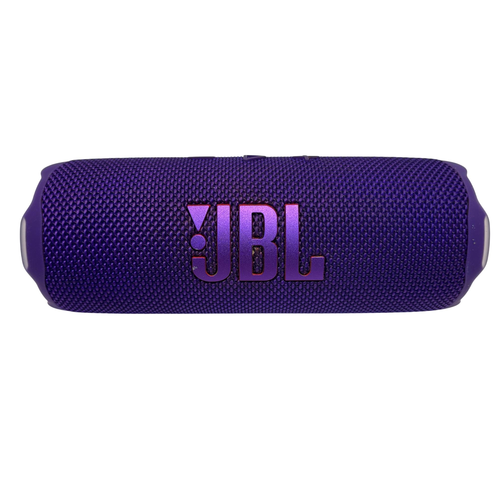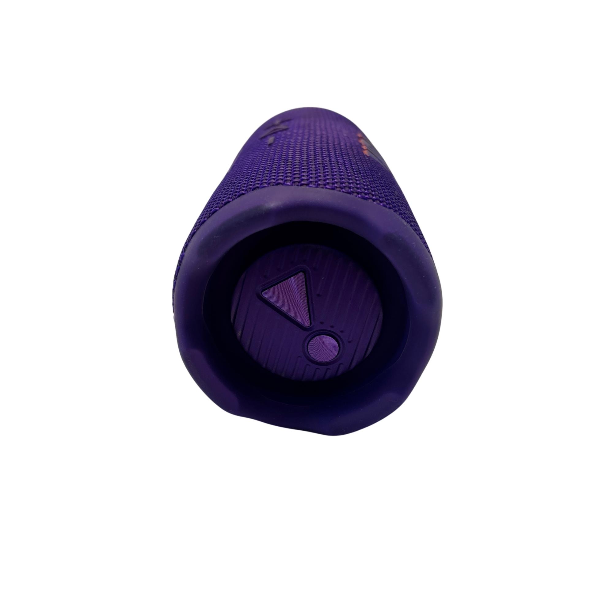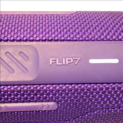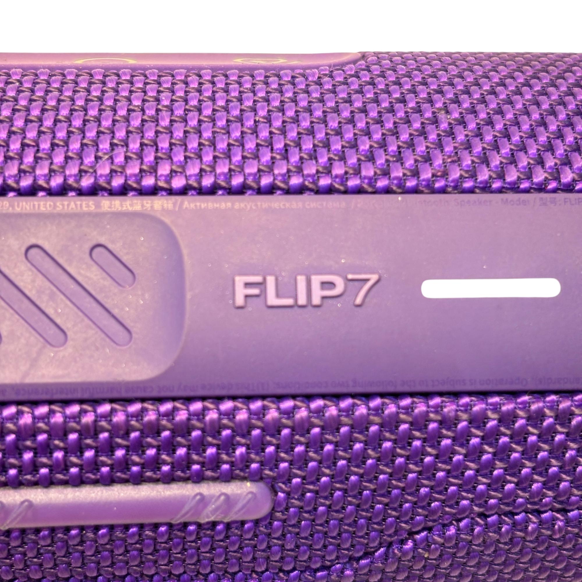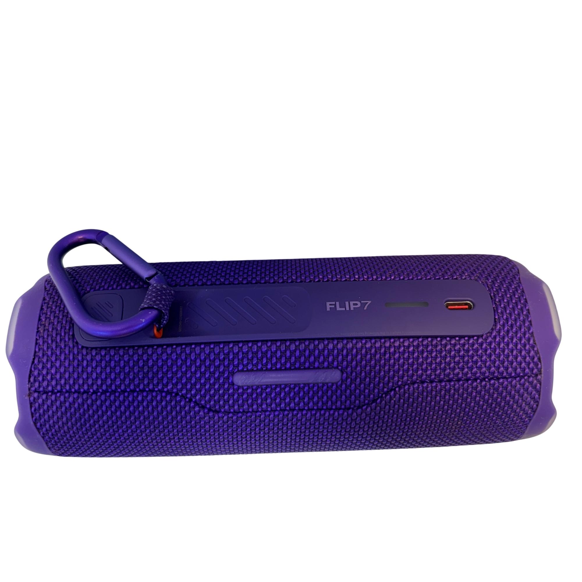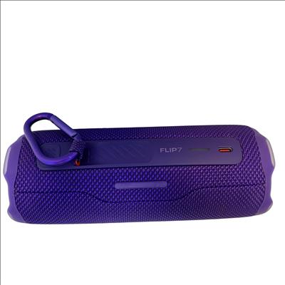 The JBL Flip 7 Portable Waterproof Bluetooth Speaker in purple delivers powerful 35-watt RMS sound with deep bass and clear highs, perfect for outdoor and indoor use. This compact speaker features a rugged design with a built-in clip for easy portability, and it is engineered to withstand water exposure, making it ideal for active lifestyles.