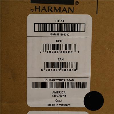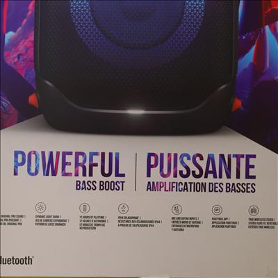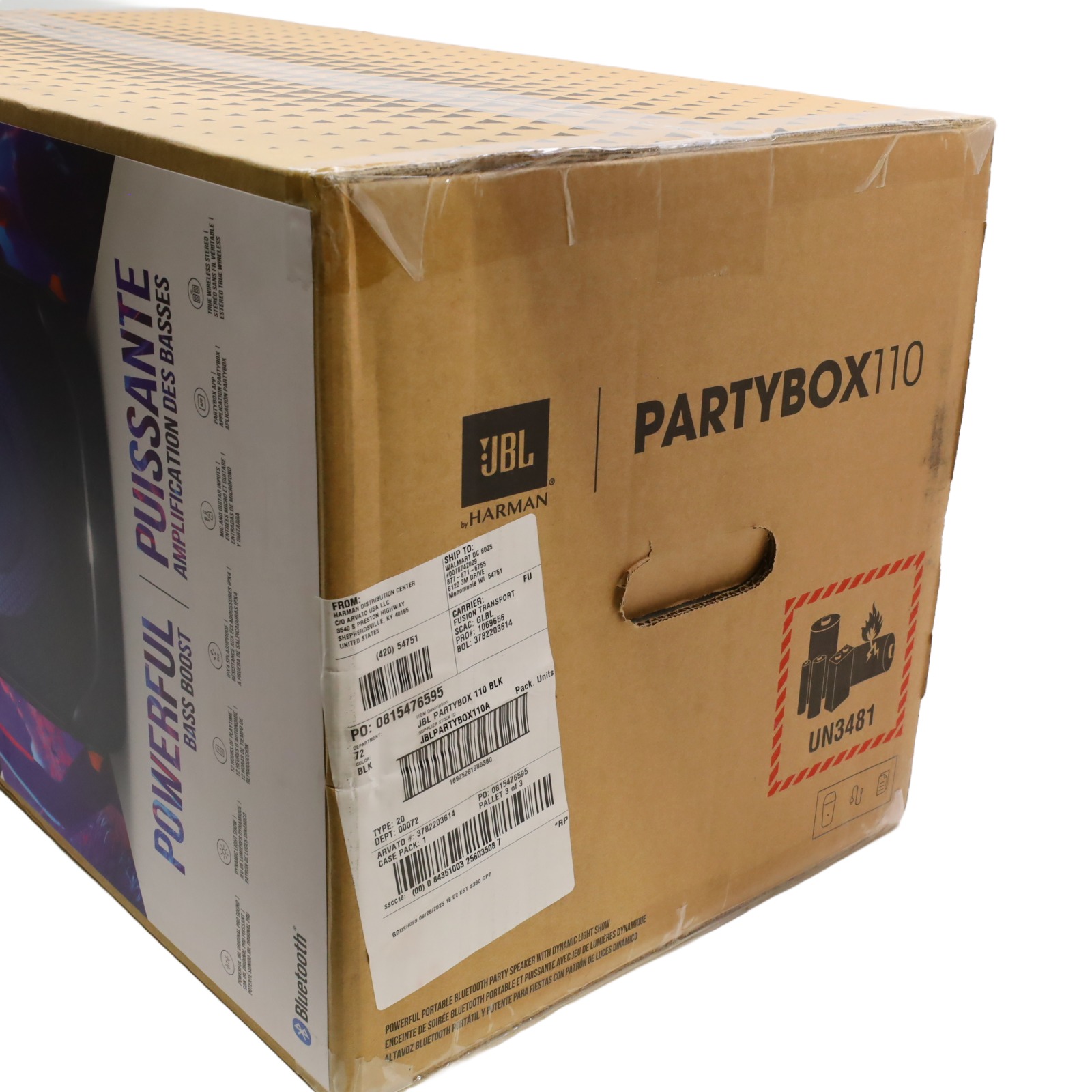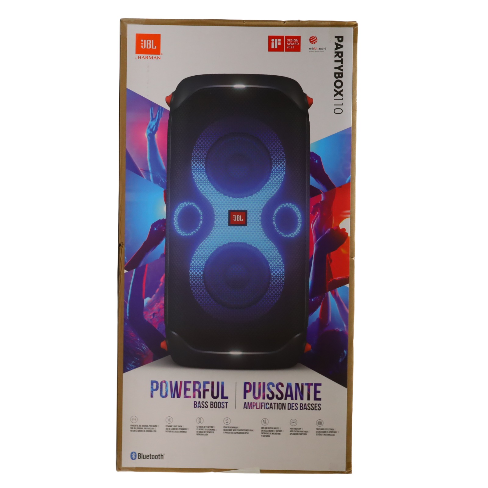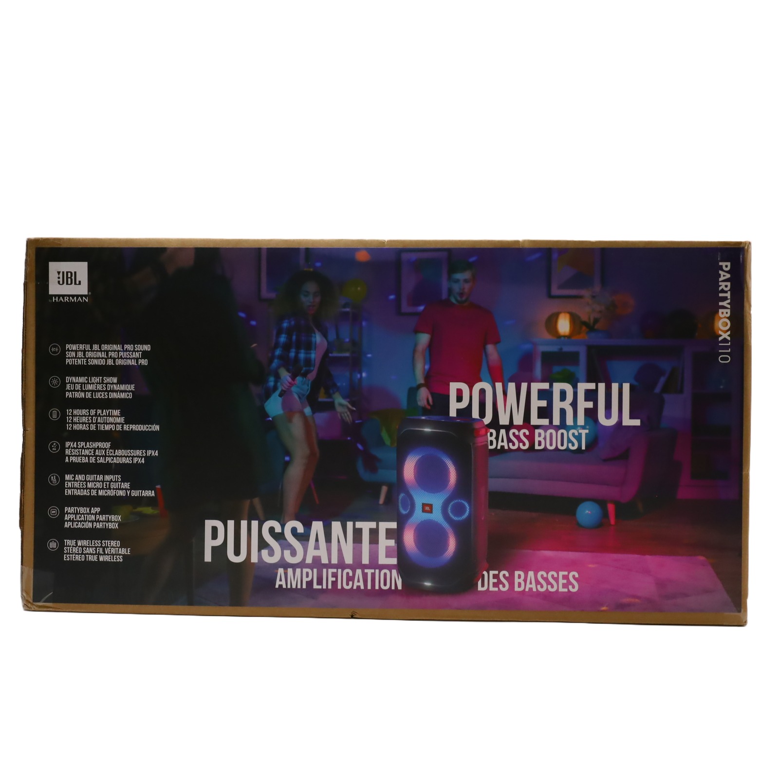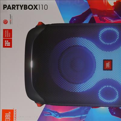 A portable party speaker delivering 160 watts of powerful JBL Original Pro Sound, enhanced by two levels of adjustable bass. It features dynamic LED lighting effects that sync with your music for an immersive visual experience. Built with an IPX4 splashproof rating, it’s suitable for outdoor use near pools or beaches. The speaker includes inputs for a microphone and guitar, making it easy to perform or host karaoke sessions. Playback options include Bluetooth streaming, USB, and aux input, and two PartyBox 110 units can be paired via cable or TWS for expanded sound. Control over audio and lighting settings is accessible through the dedicated PartyBox app.