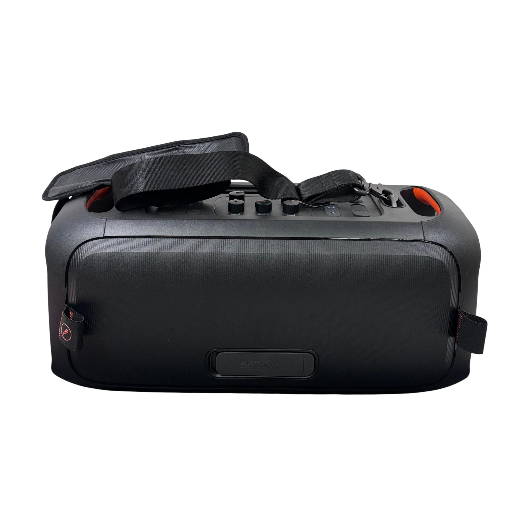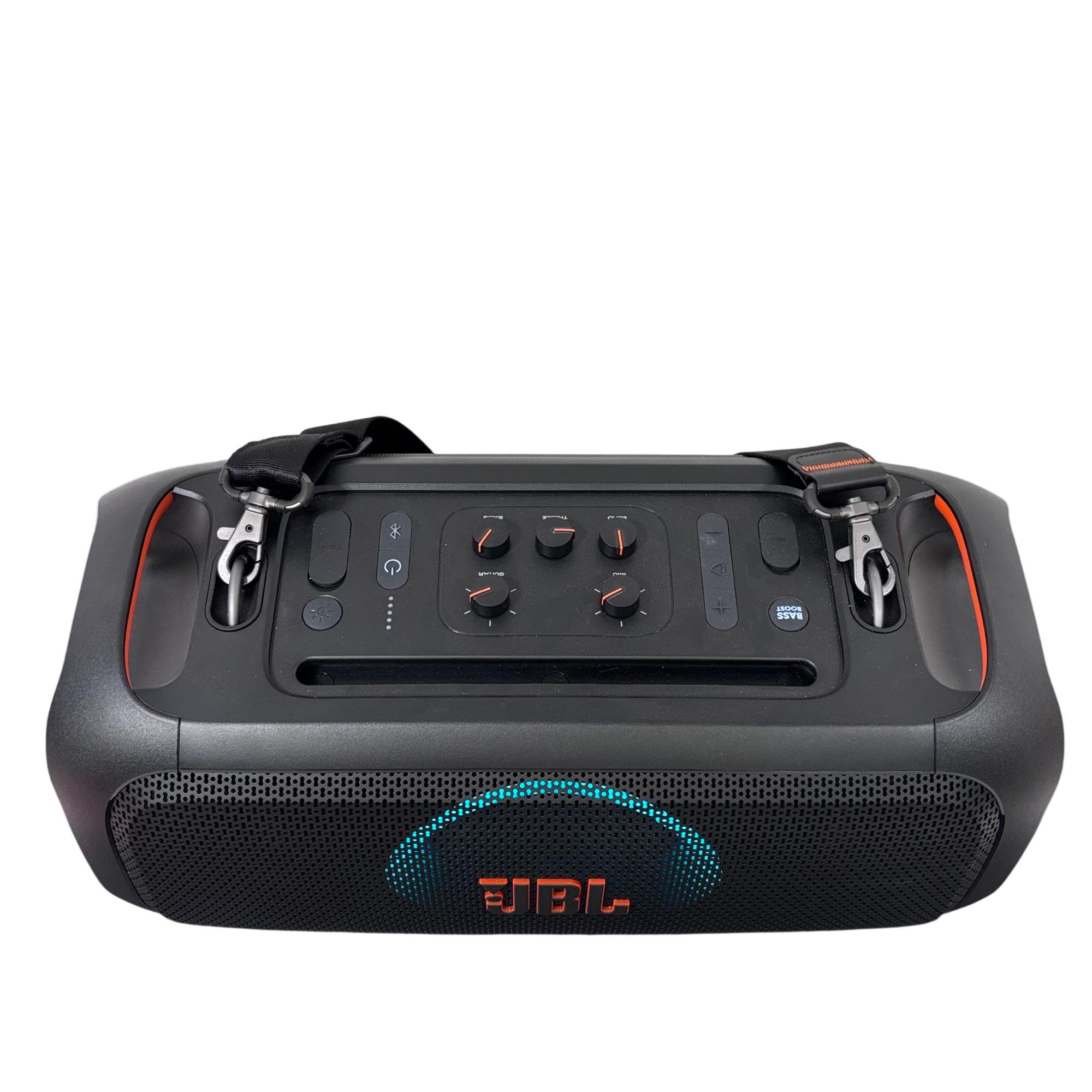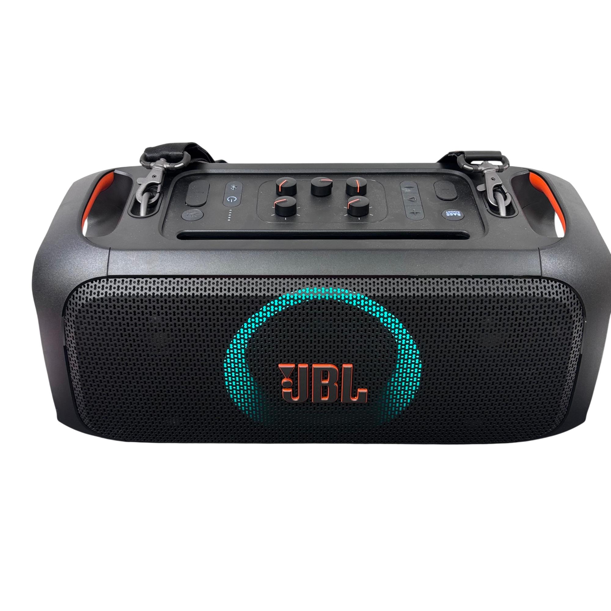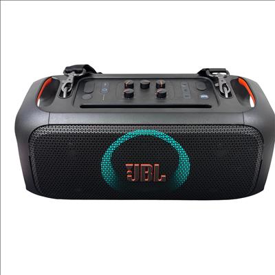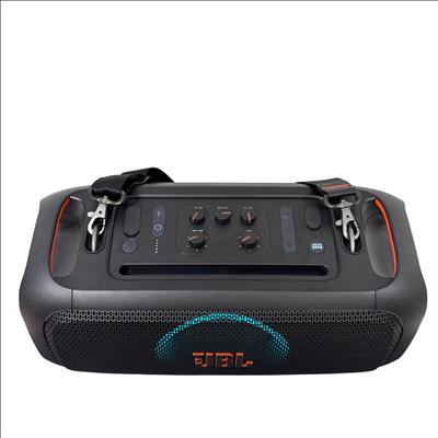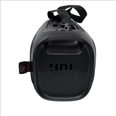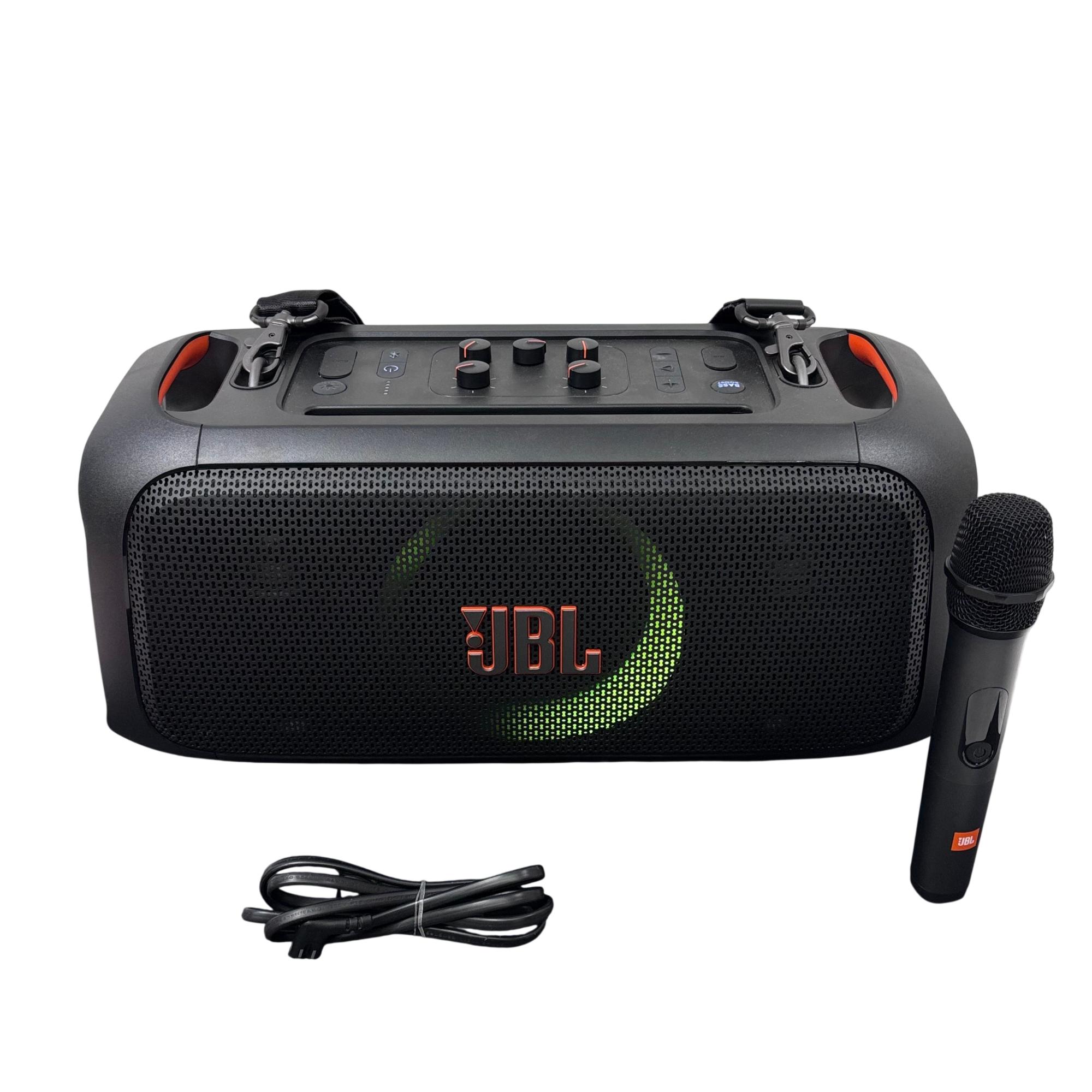 JBL PartyBox On-The-Go Essential Portable Bluetooth Speaker with Microphone delivers powerful bass and clear sound in a compact, rectangular design featuring intuitive control buttons and an adjustable strap for easy portability. This speaker supports wireless Bluetooth connectivity and includes a built-in microphone, making it ideal for parties and karaoke sessions with high-quality audio performance.