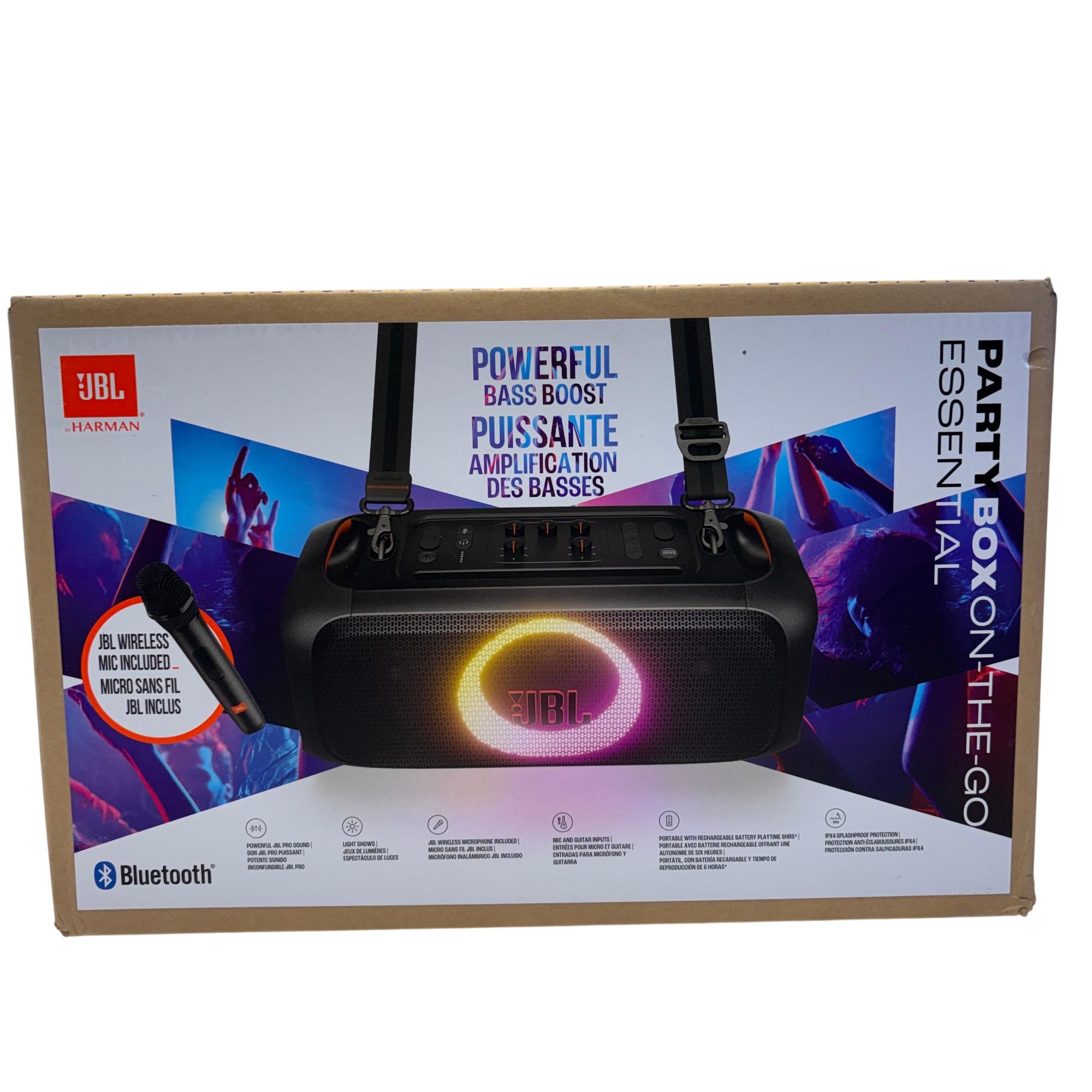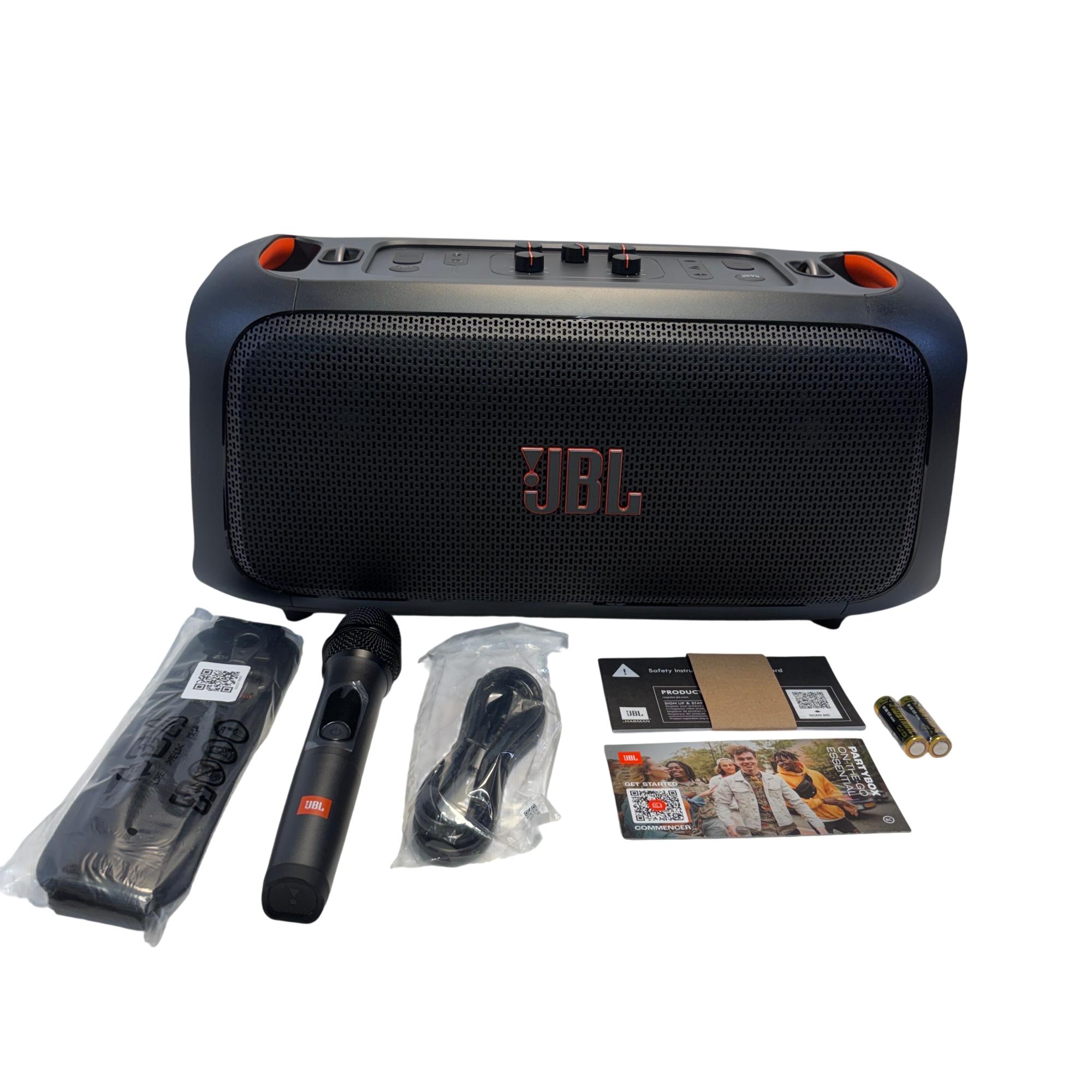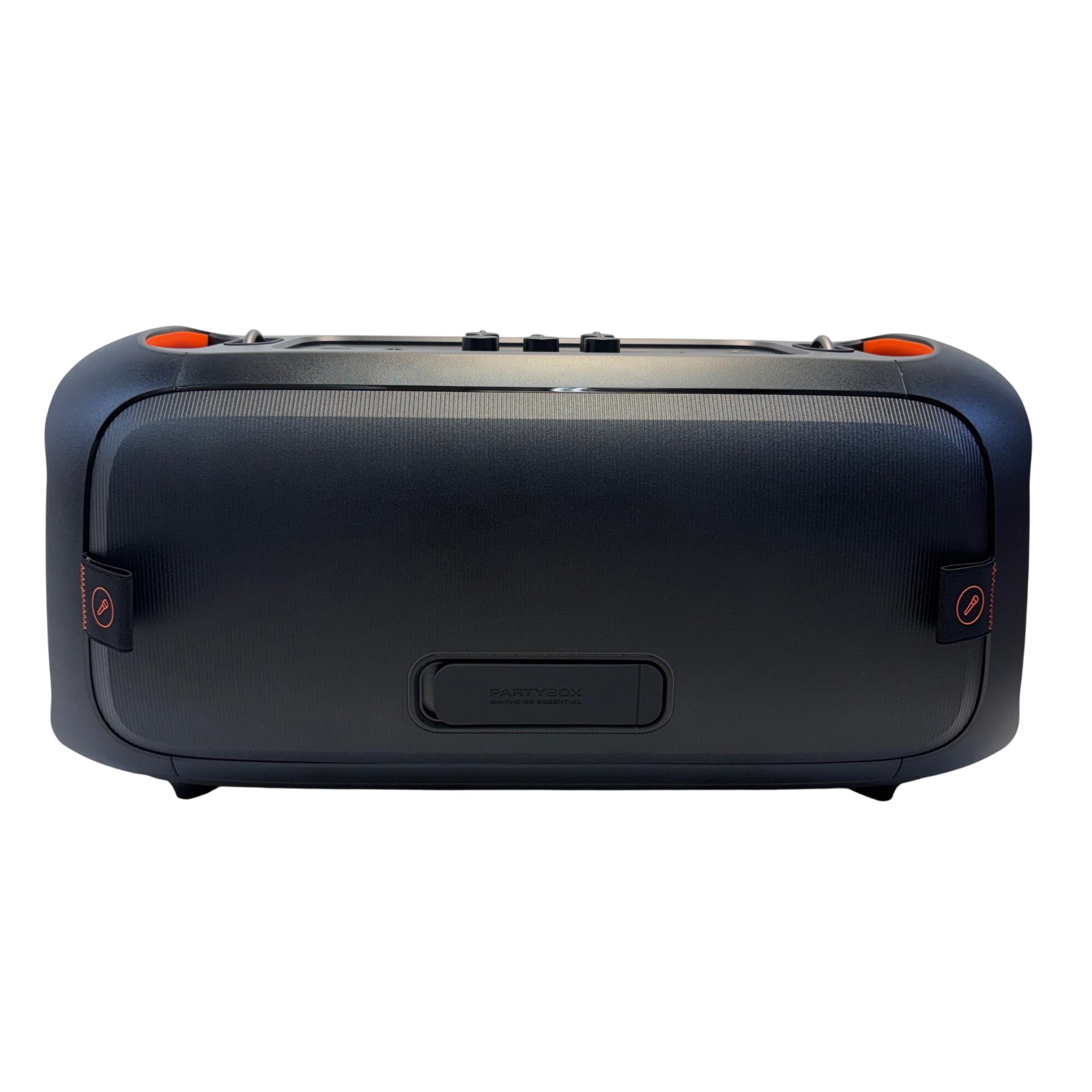 The JBL PartyBox On-The-Go Portable Bluetooth Speaker with Wireless Microphone delivers powerful sound with enhanced portability, featuring vibrant red and orange accents on a sleek black design. This compact speaker is equipped for dynamic outdoor and indoor use, optimized to provide clear audio performance and seamless Bluetooth connectivity for an immersive party experience.