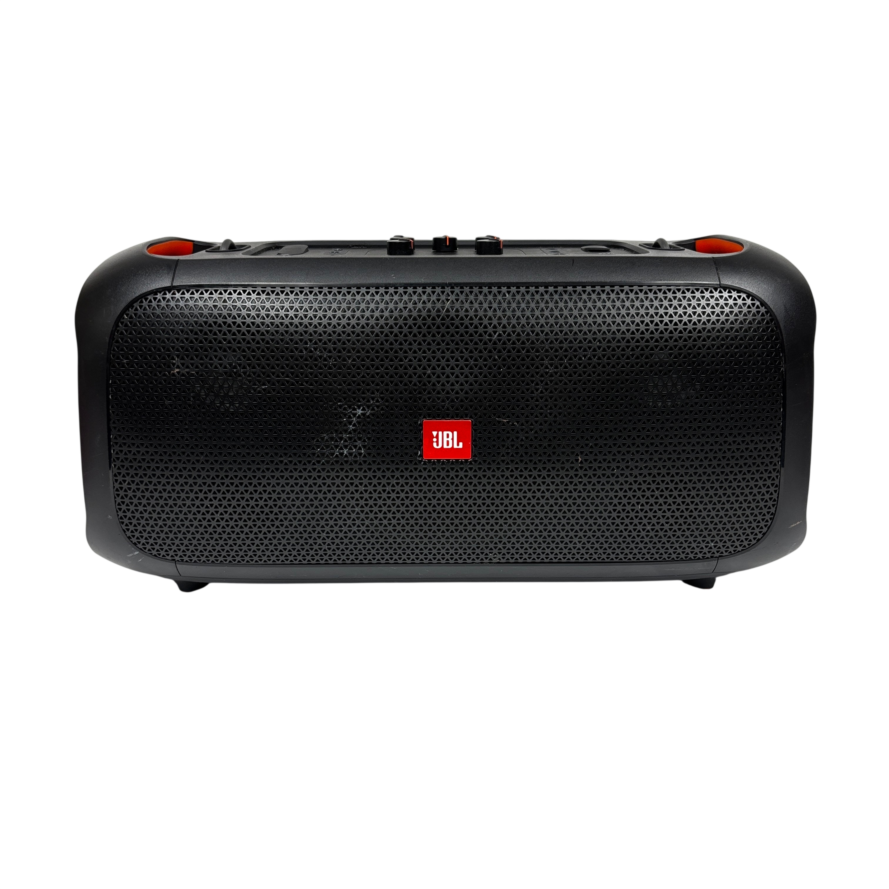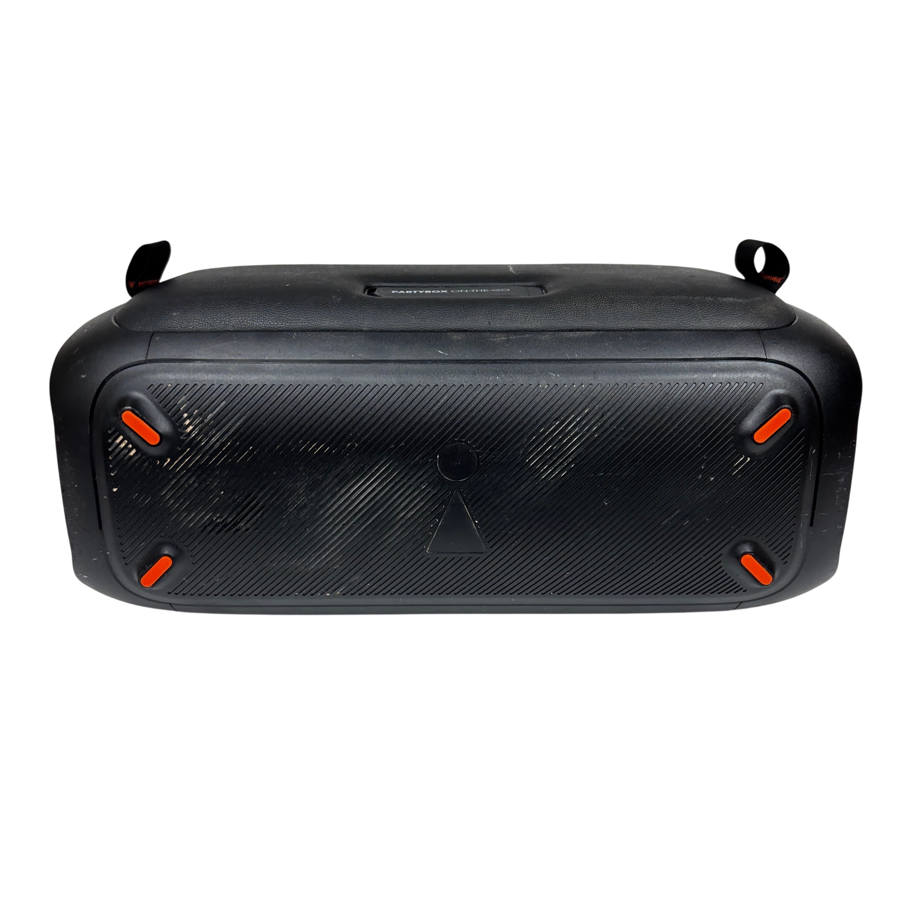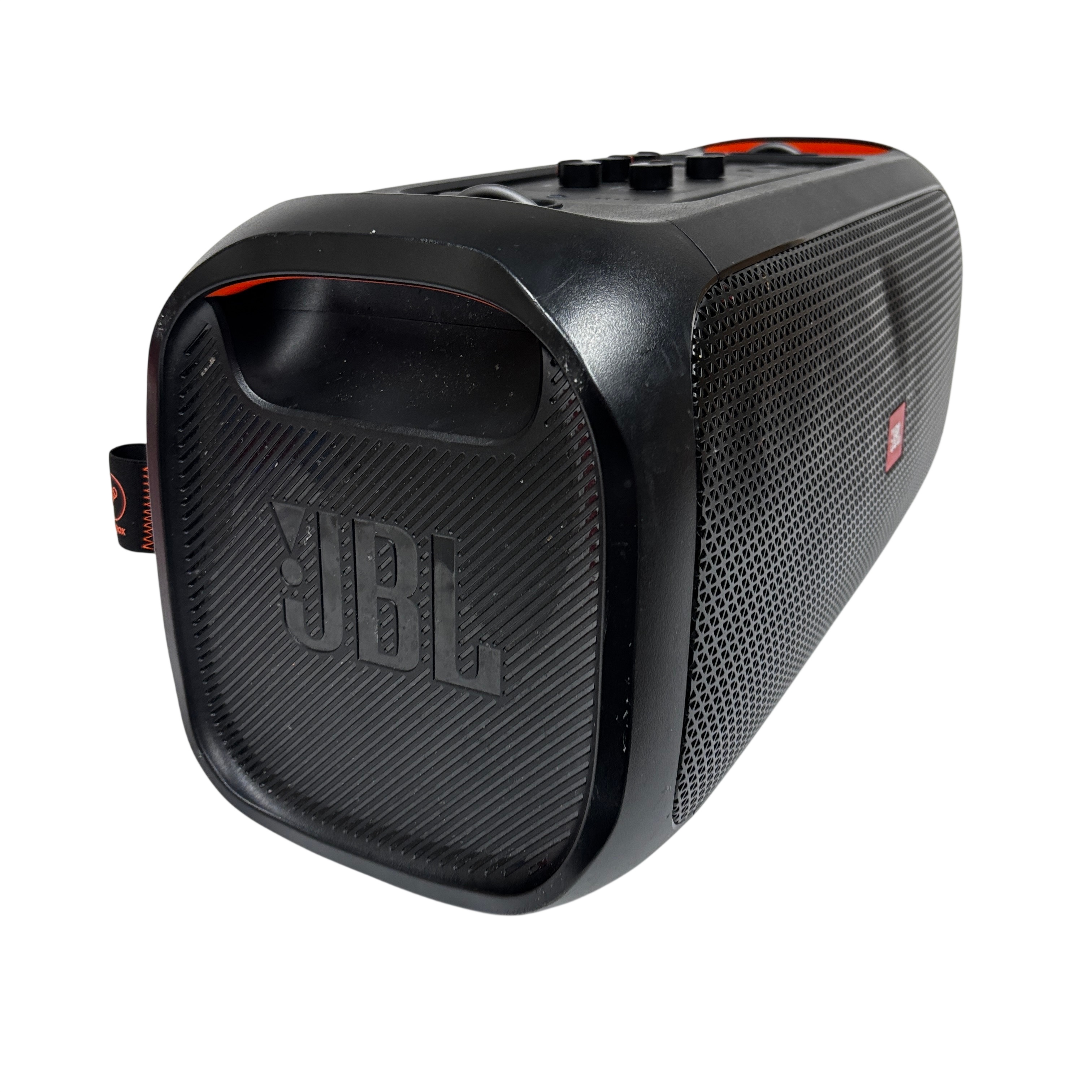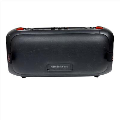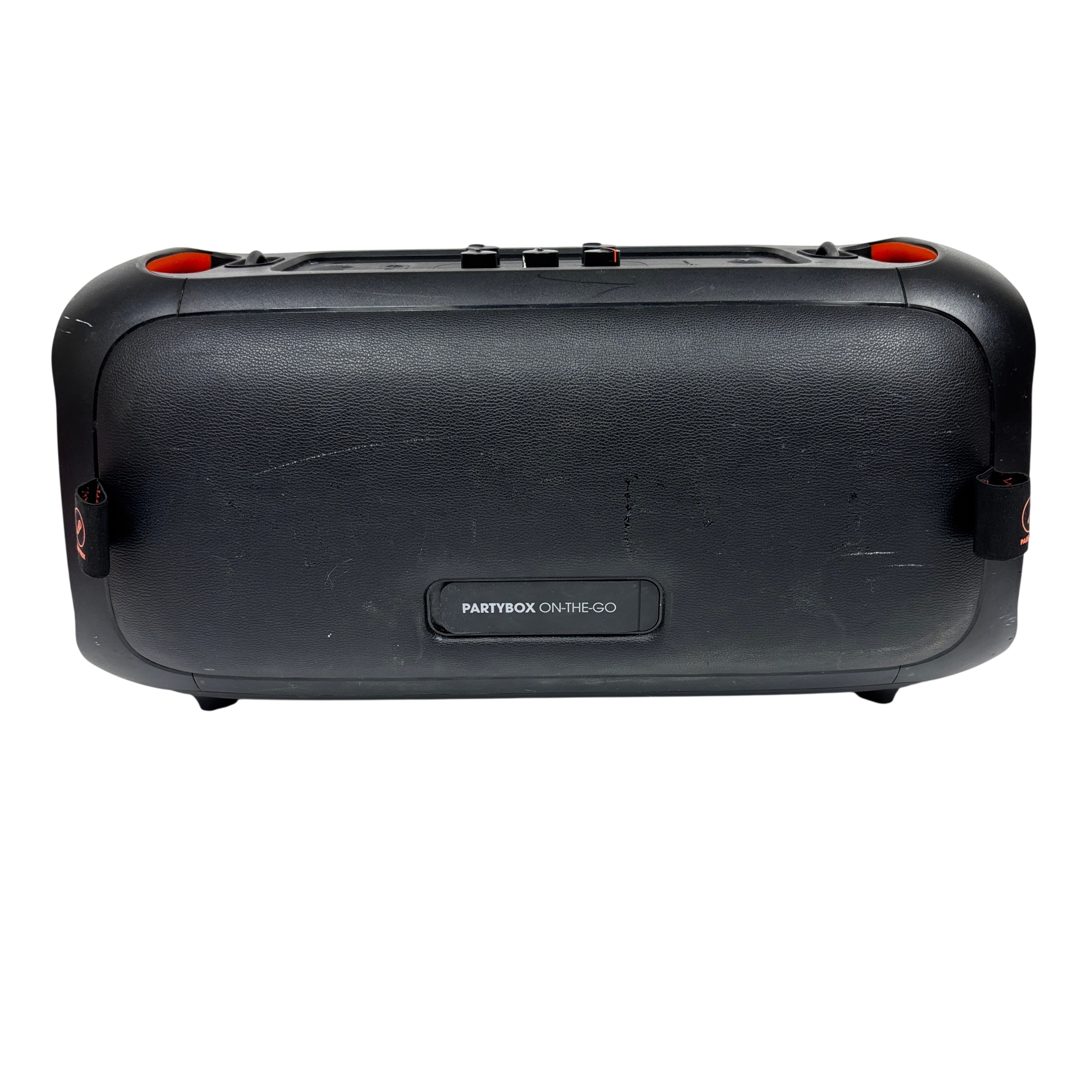 The JBL PartyBox On-The-Go portable Bluetooth speaker offers powerful sound in a compact, easy-to-carry design. Featuring a rechargeable battery, this speaker delivers wireless audio with Bluetooth connectivity, plus wired options via a 3.5mm aux input. It includes multiple control knobs for volume, bass, treble, and echo adjustments, making it ideal for parties and outdoor use. The built-in handles and USB charging port add convenience for on-the-go entertainment.