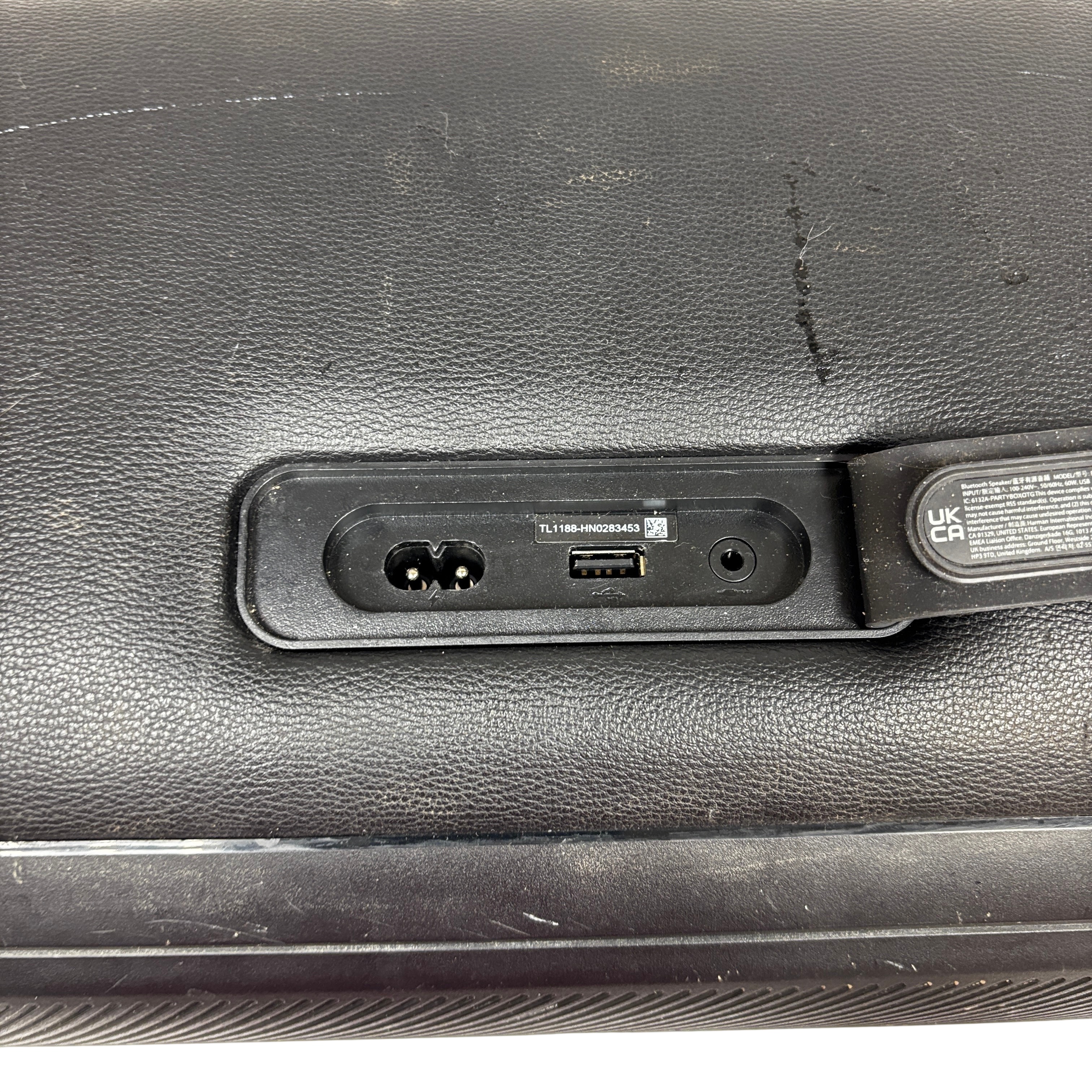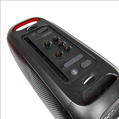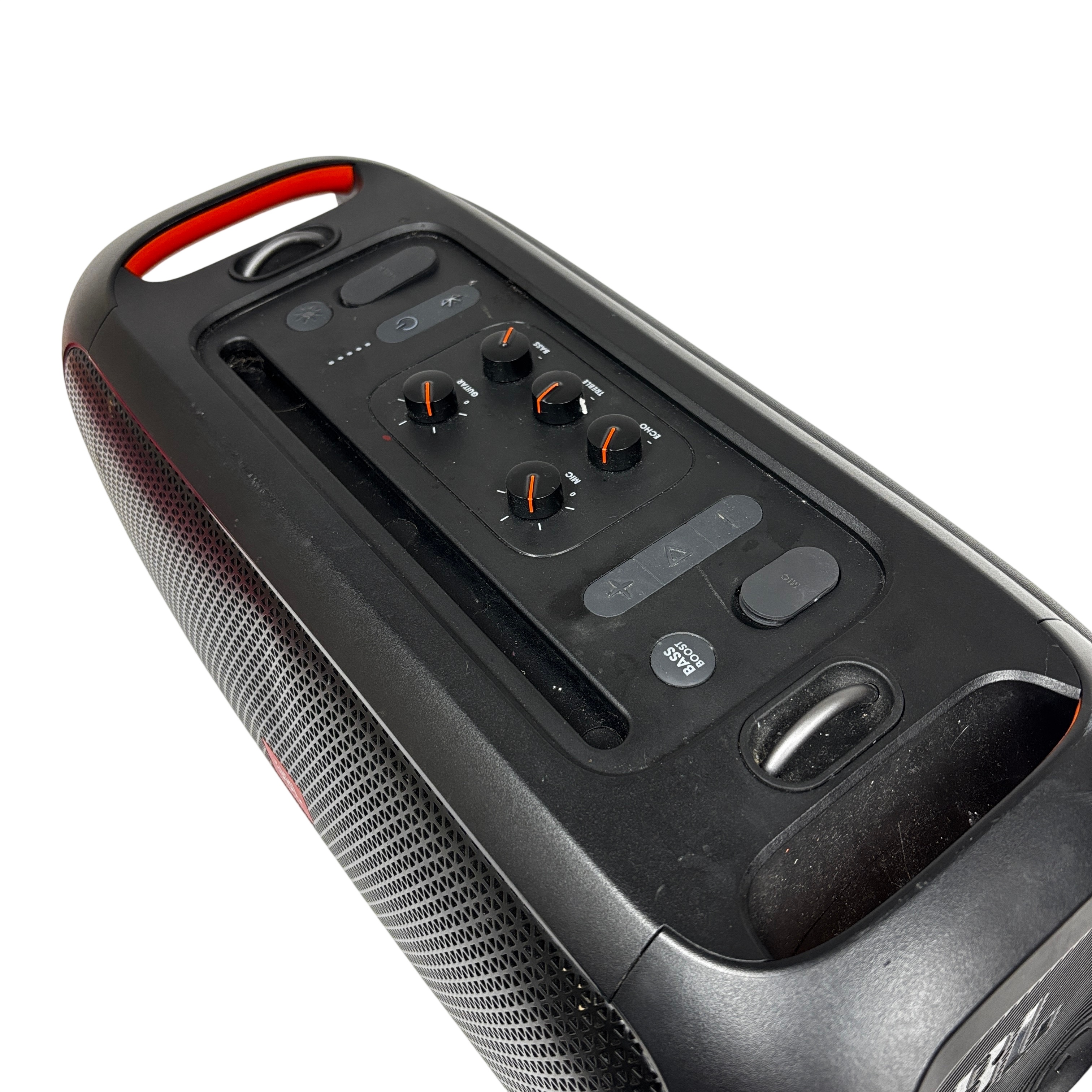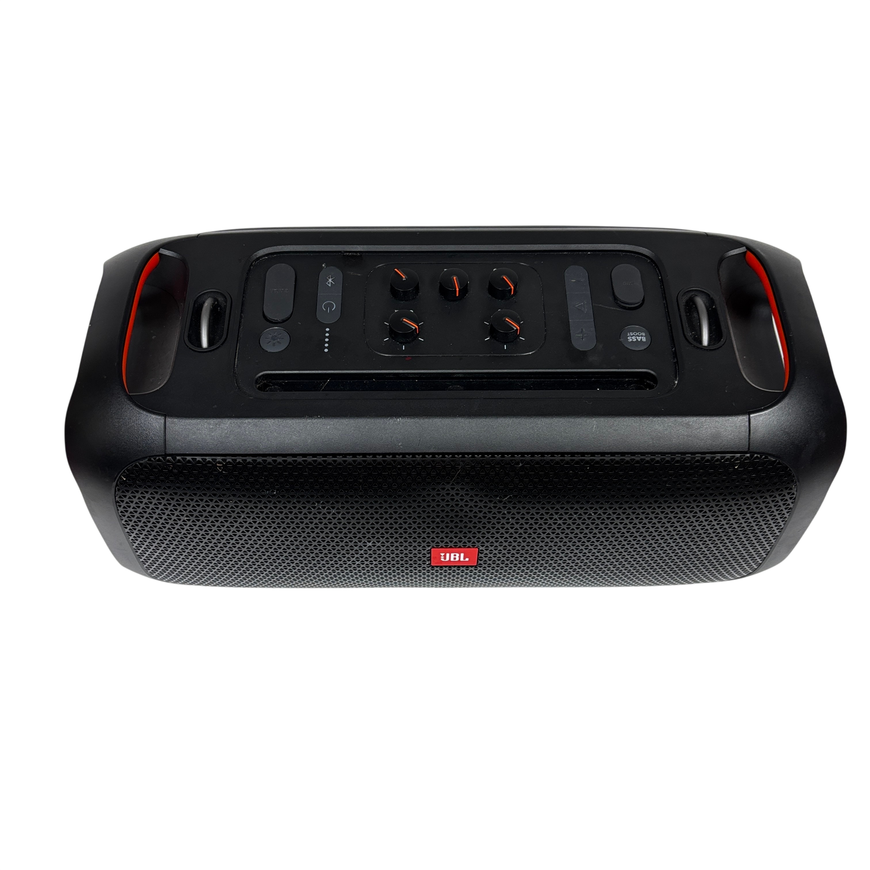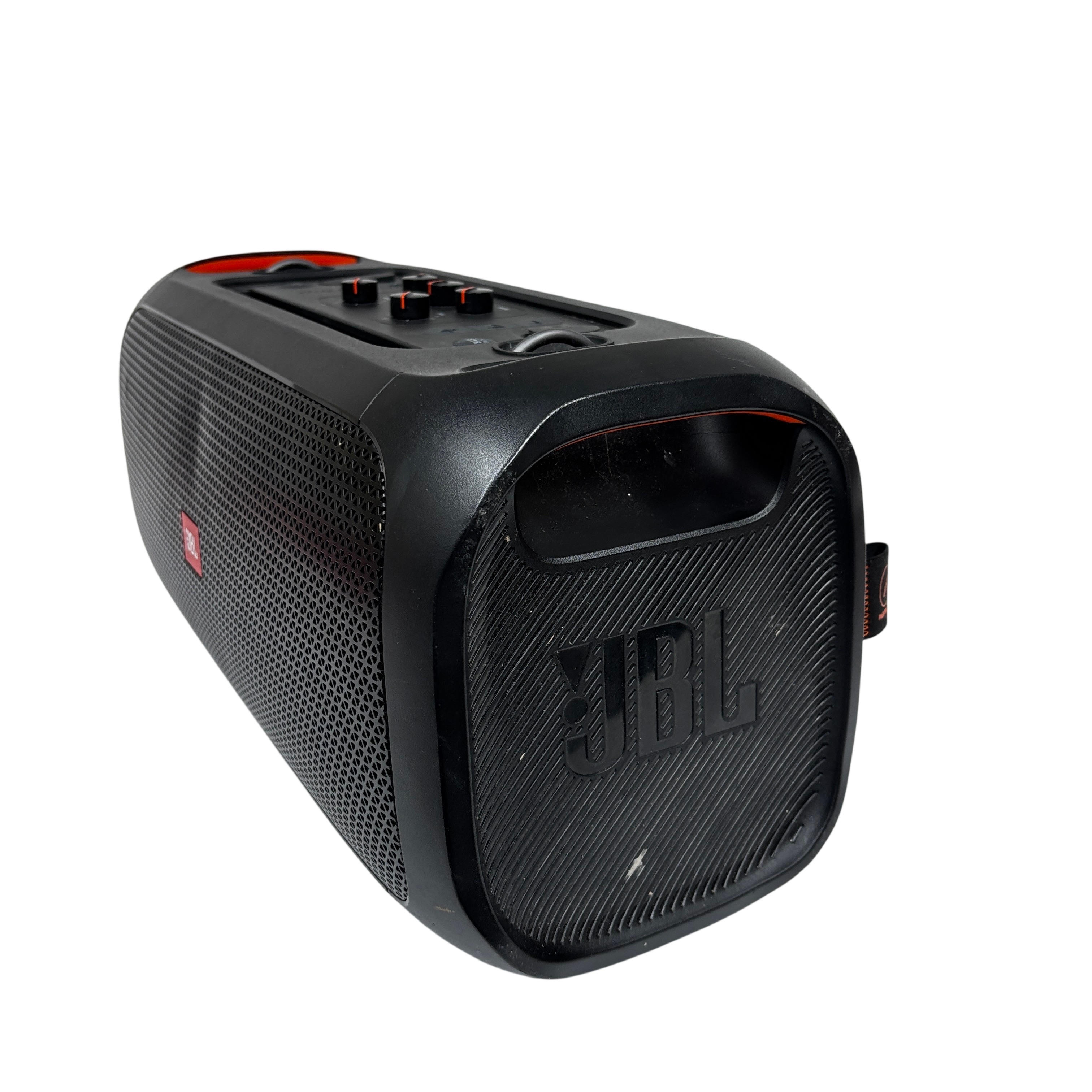 The JBL PartyBox On-The-Go portable Bluetooth speaker offers powerful sound in a compact, easy-to-carry design. Featuring a rechargeable battery, this speaker delivers wireless audio with Bluetooth connectivity, plus wired options via a 3.5mm aux input. It includes multiple control knobs for volume, bass, treble, and echo adjustments, making it ideal for parties and outdoor use. The built-in handles and USB charging port add convenience for on-the-go entertainment.