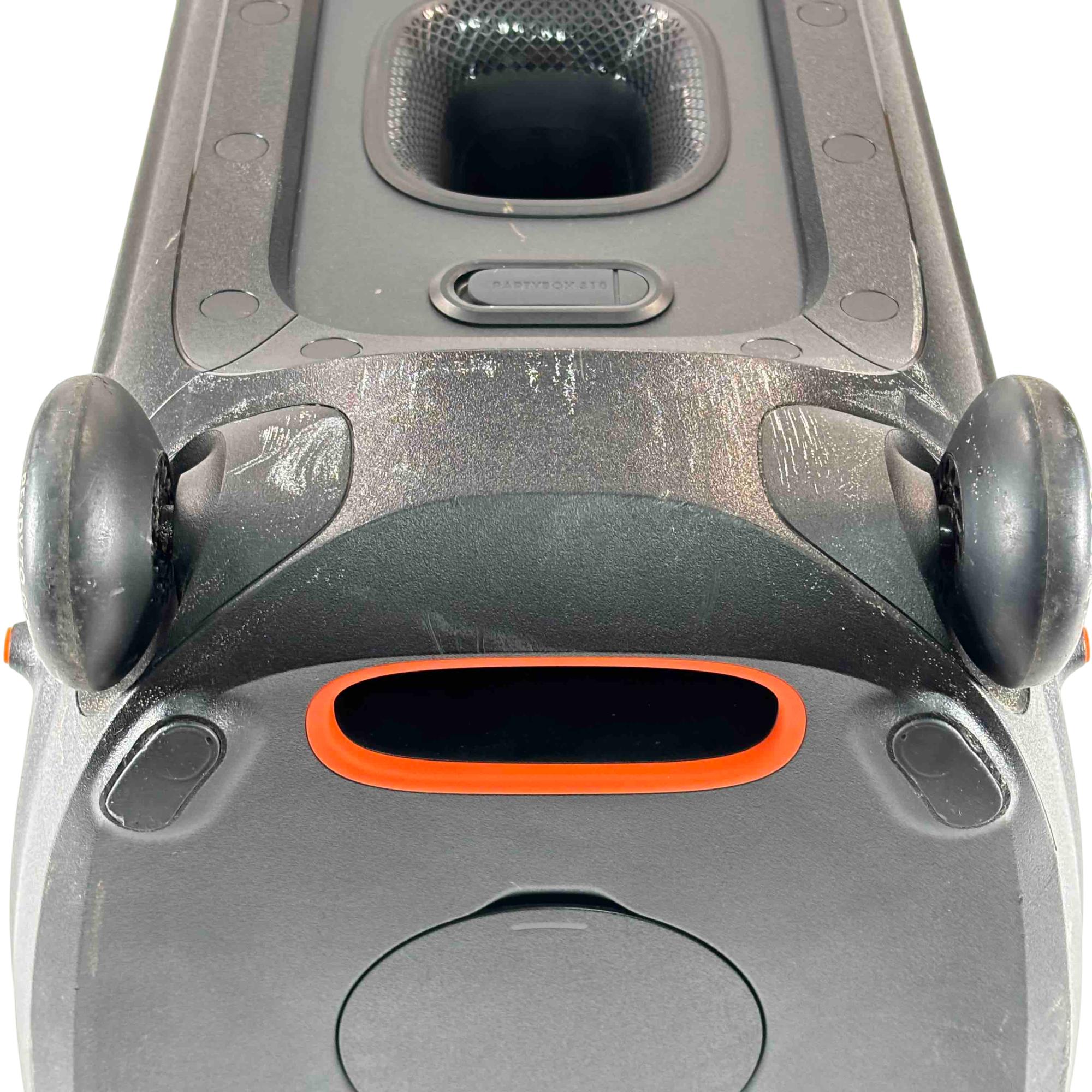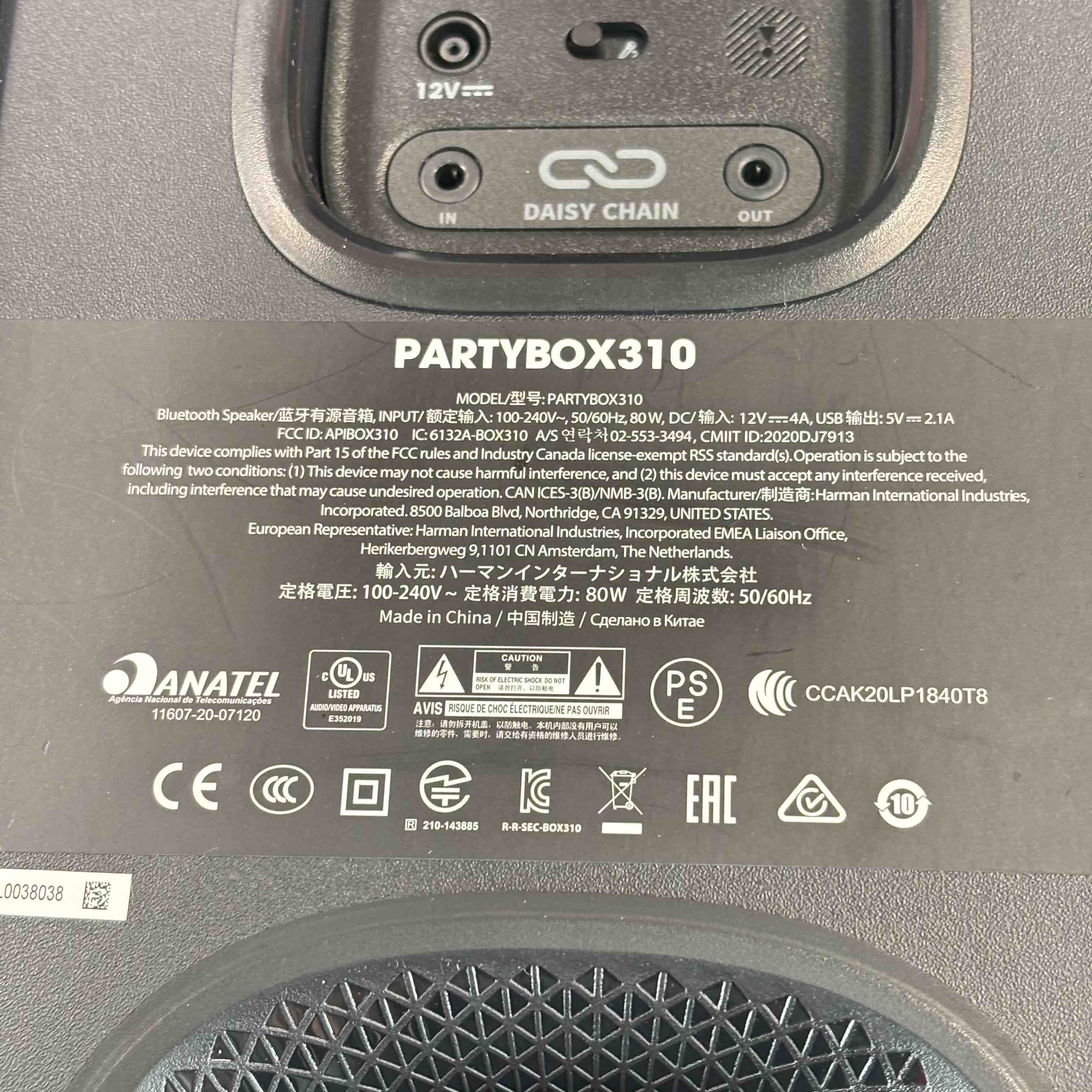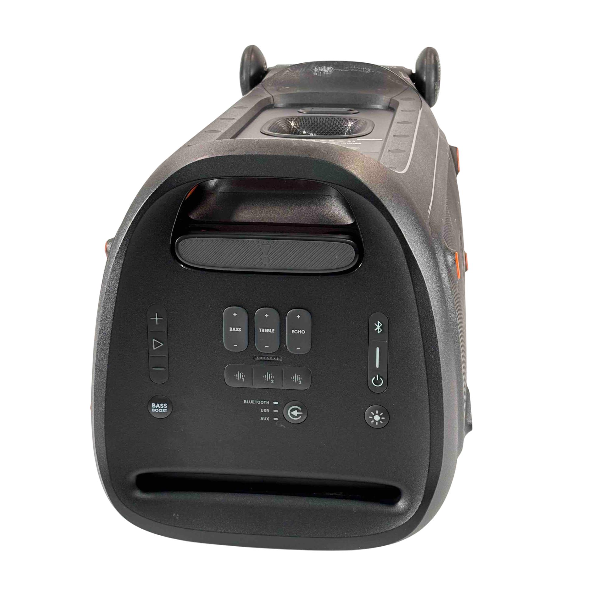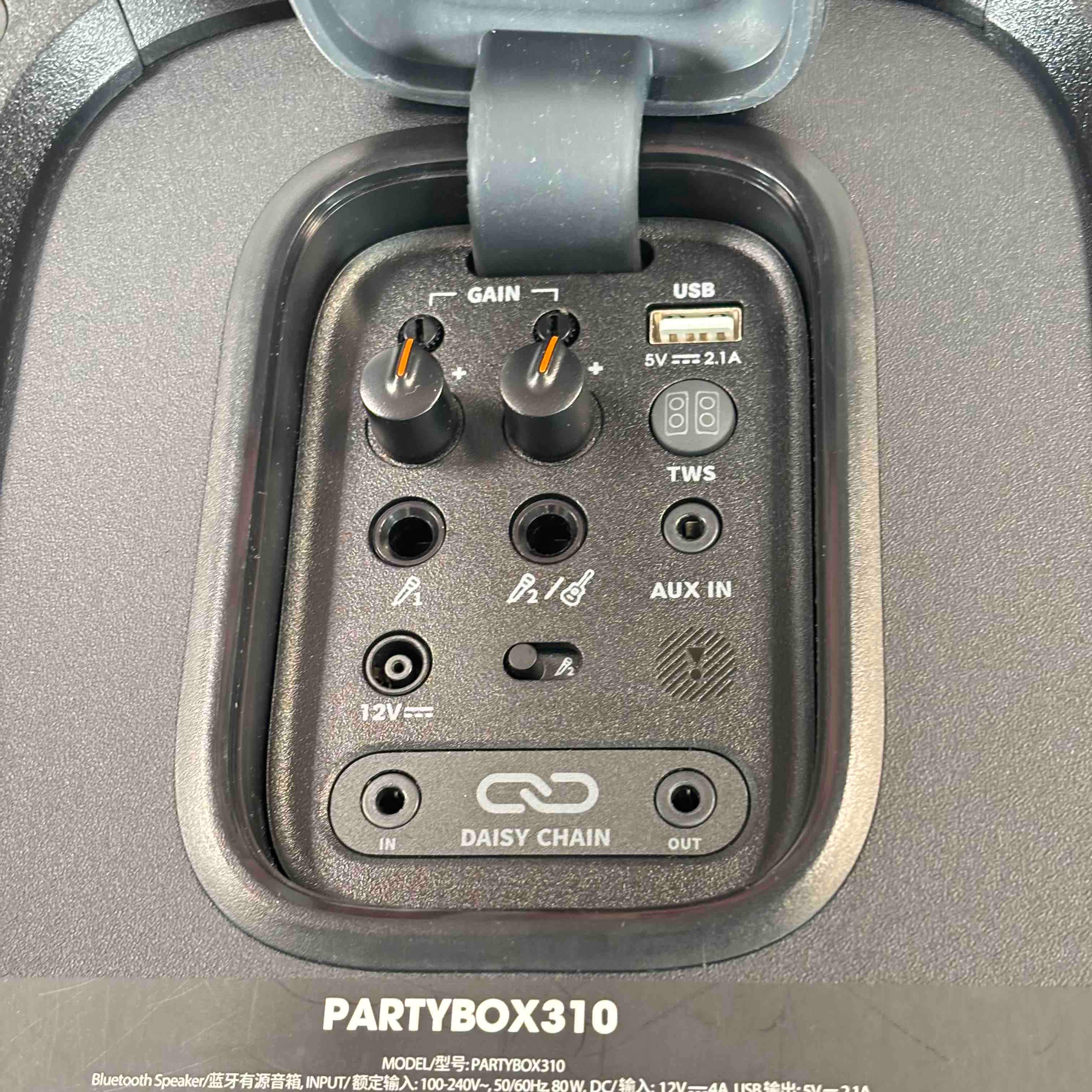 Huge sound, dazzling lights and unbelievable power set this speaker apart from the crowd. The JBL PartyBox 310 packs a full party into a transportable, splashproof sound machine like no other. Turn up your favorite playlists anywhere, from get-togethers at home to dance parties on the beach. Bring big party vibes with 240 watts of JBL Pro Sound and a synced light show that grooves to the beat. Plug in and keep the fun going all night or wheel over to the campfire and take advantage of its impressive 18-hour battery life. Start a party with the JBL PartyBox 310.