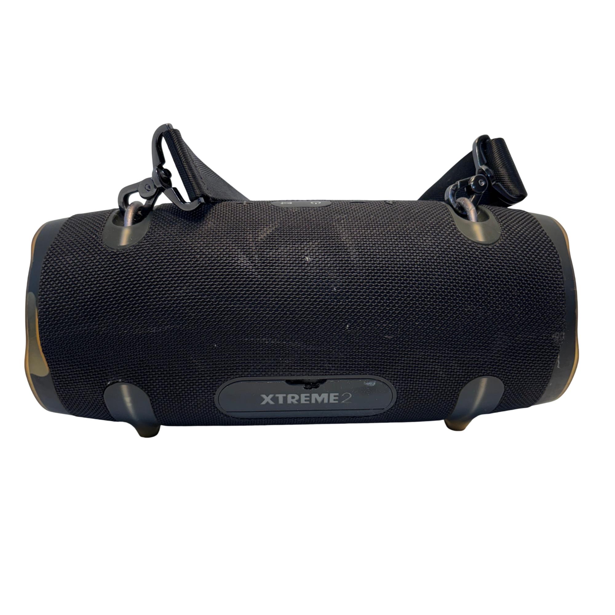 The JBL Xtreme 2 Portable Waterproof Bluetooth Speaker delivers powerful, high-quality sound with robust bass in a sleek black design. Featuring a durable fabric exterior and a convenient strap for easy mobility, this speaker is engineered for outdoor use and resistant to water. Its wireless Bluetooth connectivity and integrated dual passive radiators provide immersive audio performance in various environments.