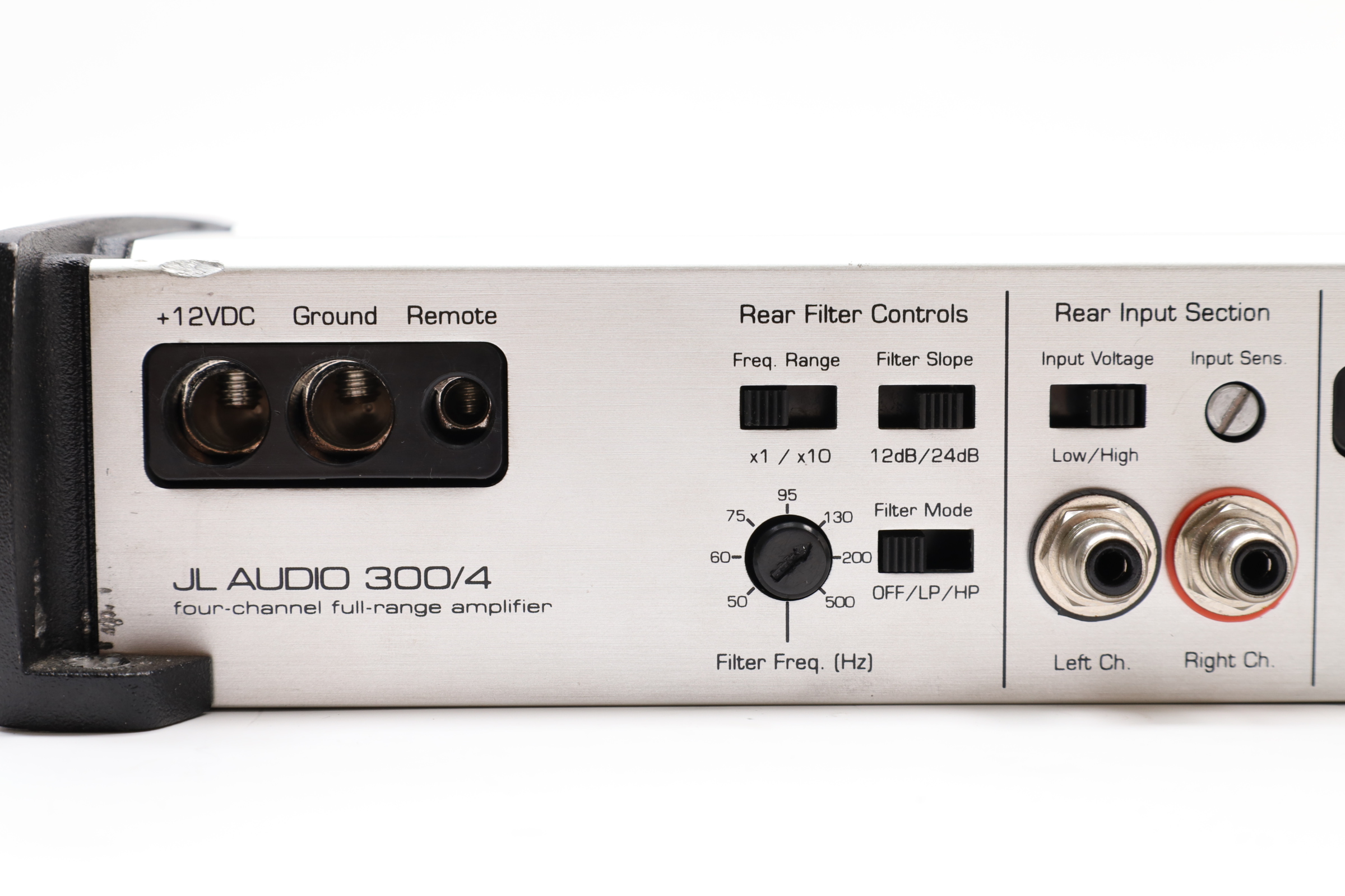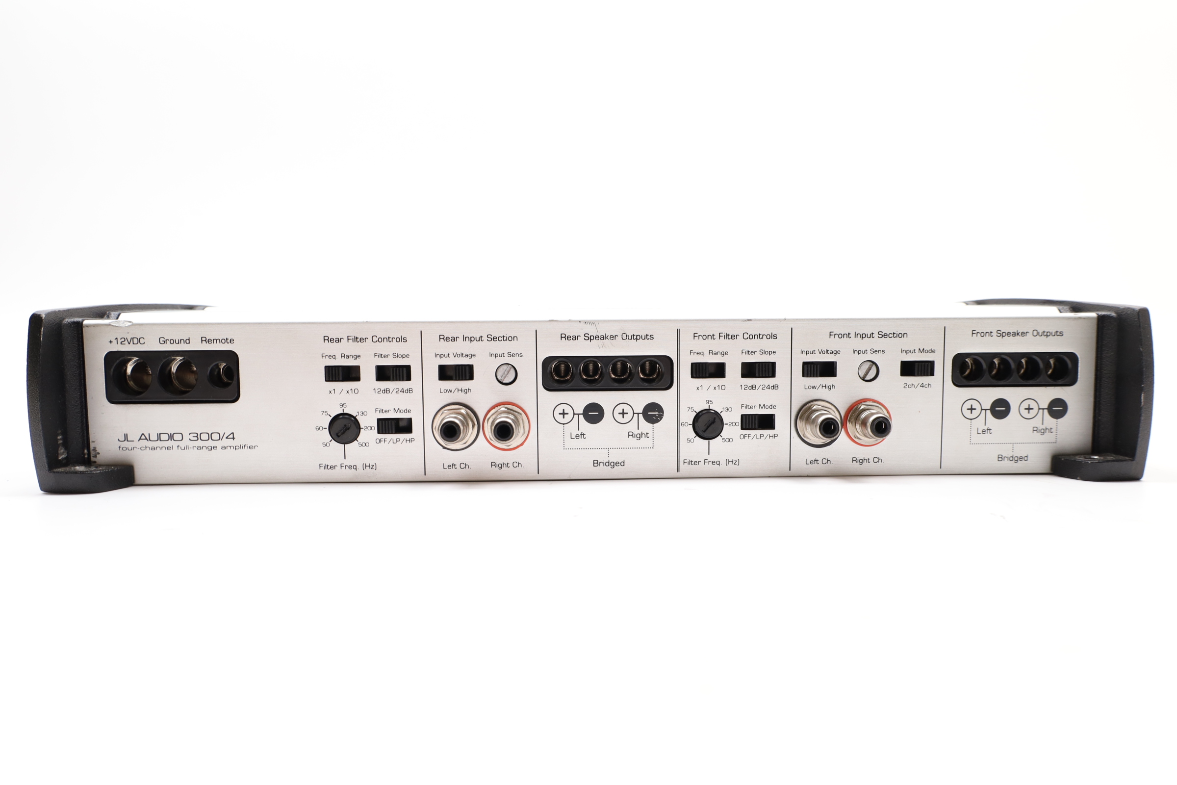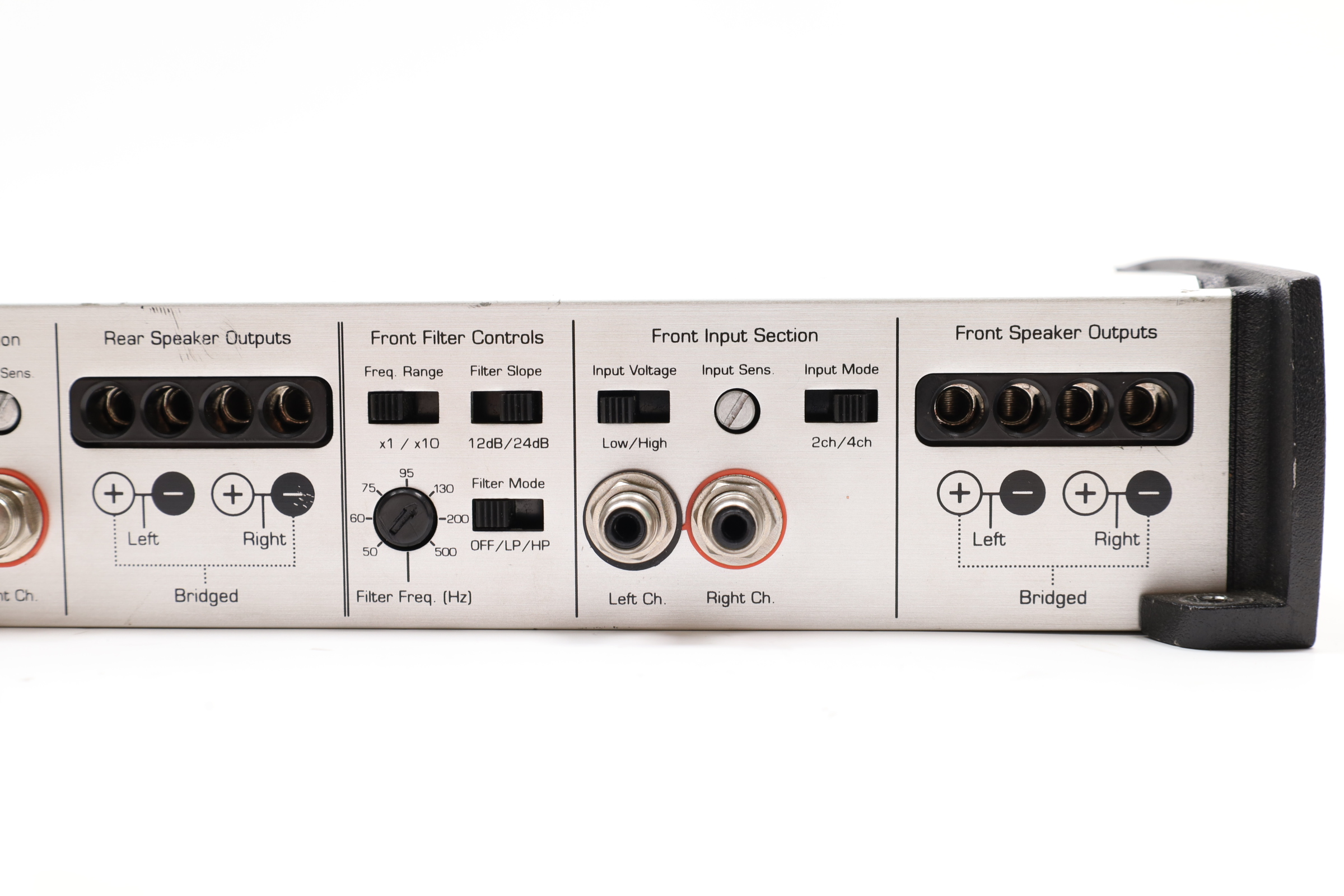 A four-channel full-range amplifier designed with Absolute Symmetry Class AB technology for optimal performance across all channels. It features the R.I.P.S. power supply system, which adjusts output for channel pairs depending on impedance (1.5 to 4 ohms per channel). The amplifier can operate in two main configurations: as a full-system amplifier in bi-amp mode (75W x 2 for subwoofers and 75W x 2 for speakers) or as a four-channel satellite amplifier providing high-passed signals to front and rear speakers. Its flexible input and crossover options allow for various system setups, supporting both single and separate input configurations for front and rear channels, depending on the source unit's output capabilities.
