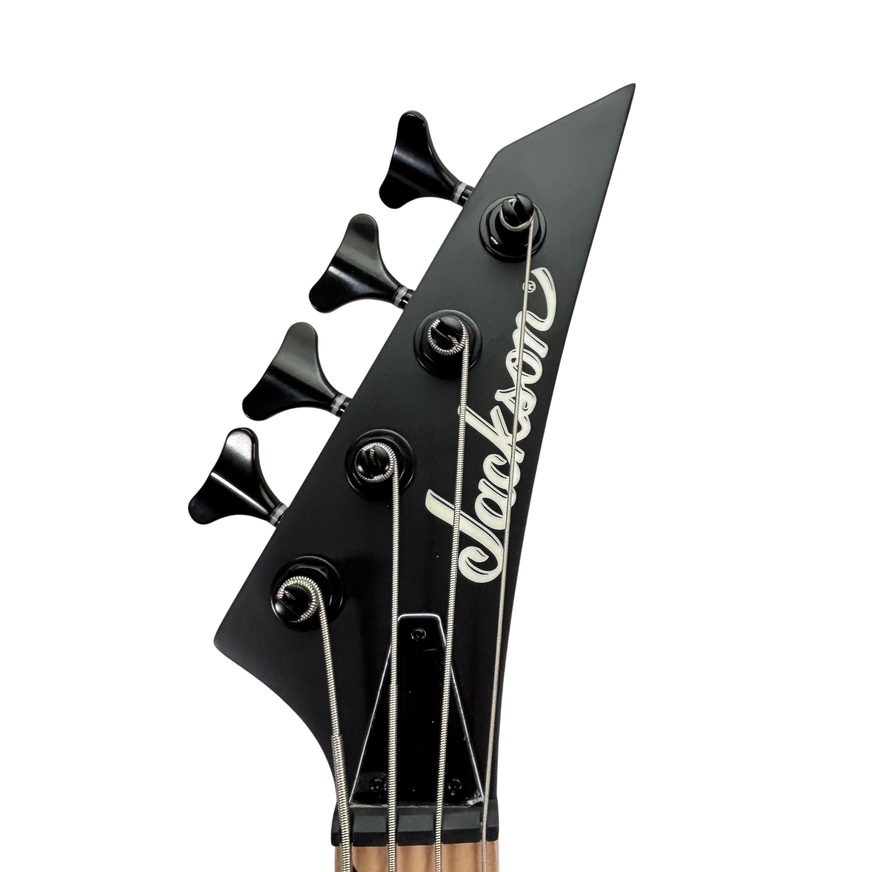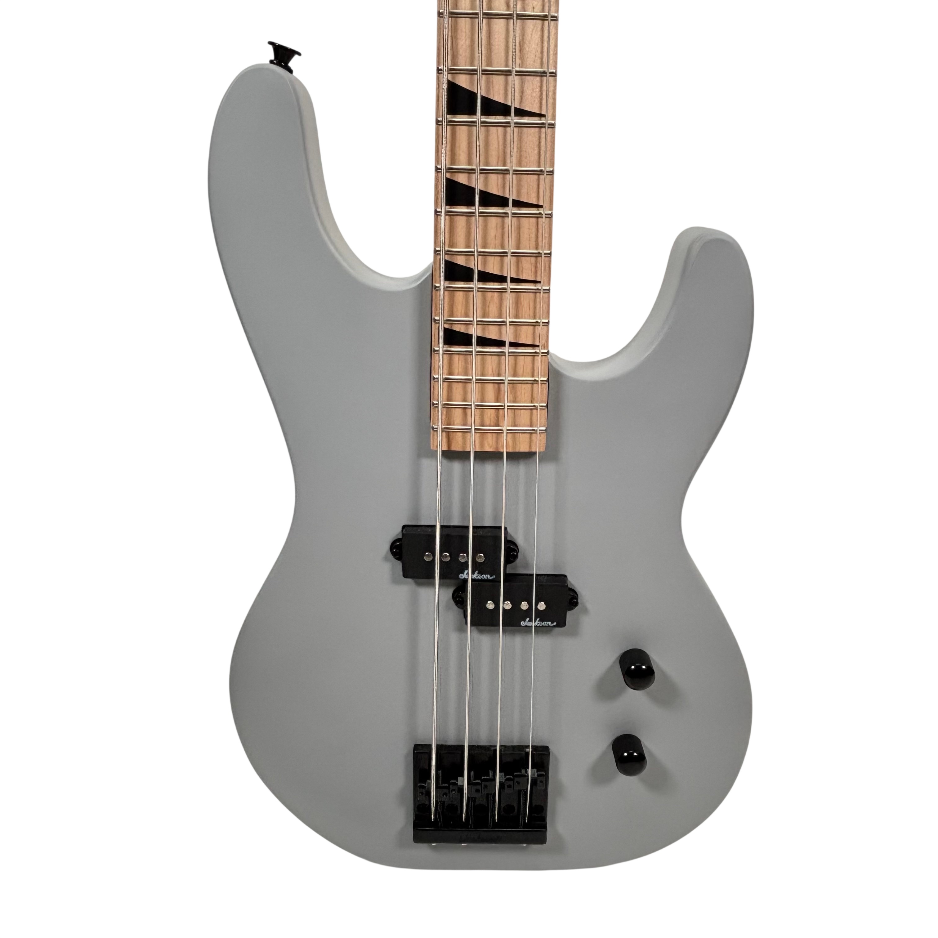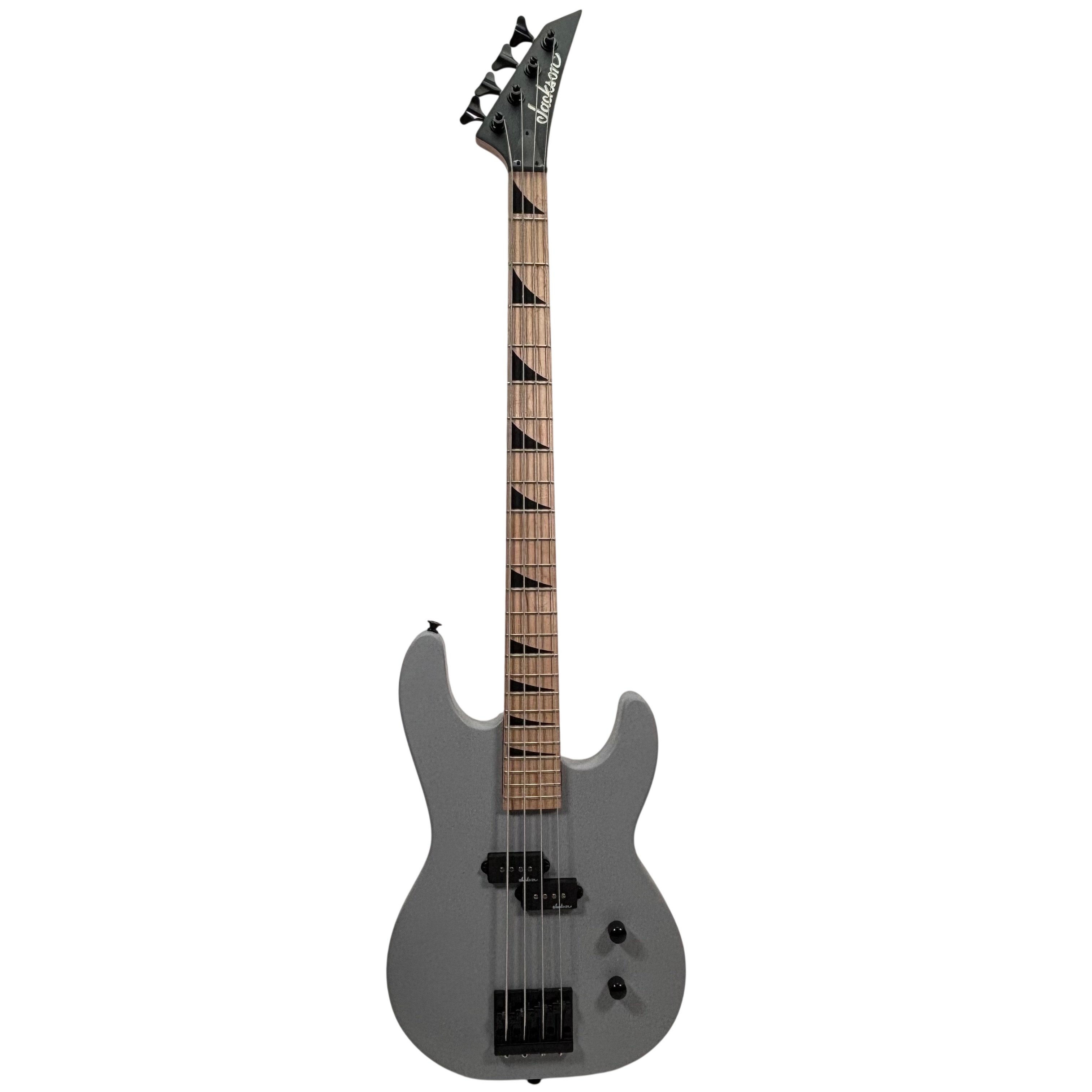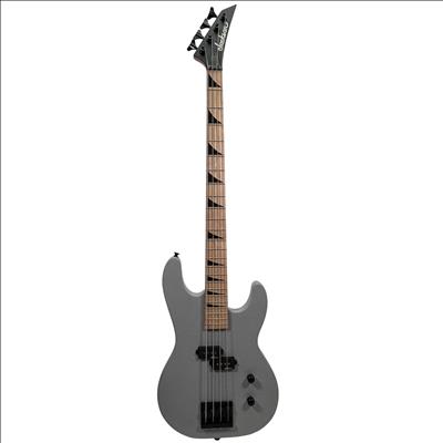 Jackson Electric Bass Guitar features a sleek gray body with a natural wood neck and distinctive black hardware. This 4-string bass guitar is crafted for players seeking solid performance and style, with sharktooth inlays on the fretboard and reliable pickups for clear sound. Ideal for beginners and intermediate musicians, it offers a comfortable playing experience and classic Jackson design elements.
