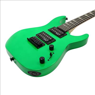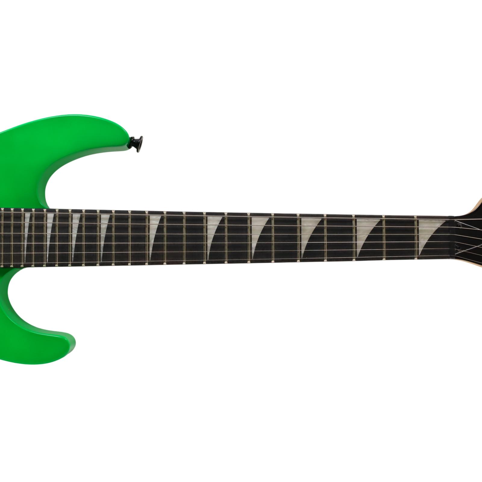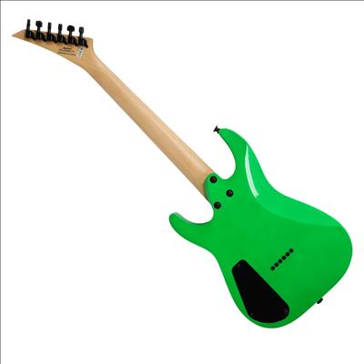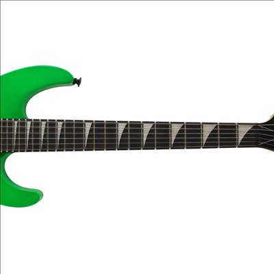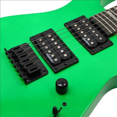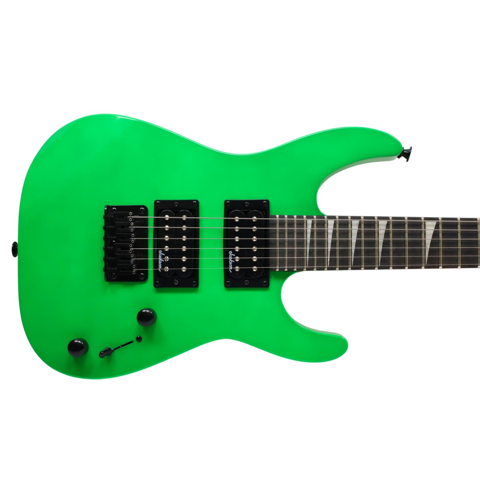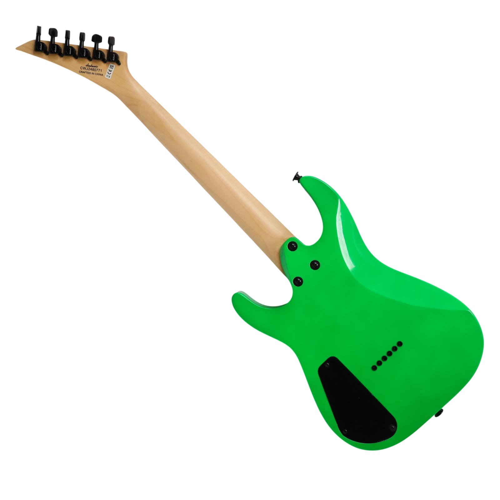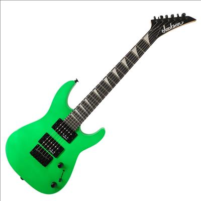 A compact right-handed 6-string electric guitar built around a 2/3-scale 22.5 inch length, featuring a poplar body, bolt-on maple neck with graphite reinforcement rods, and an amaranth fingerboard with a 12 inch radius, 24 jumbo frets, and pearloid sharkfin position inlays; it uses an angled 6-in-line headstock, sculpted heel for upper-fret access, and a string-through-body hardtail bridge with block saddles for stable tuning and sustain, while dual Jackson high-output ceramic humbuckers in an HH configuration are controlled by a three-position blade switch with master volume and tone controls, finished in neon green with black hardware for a compact travel-friendly instrument that retains full electric guitar functionality.