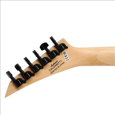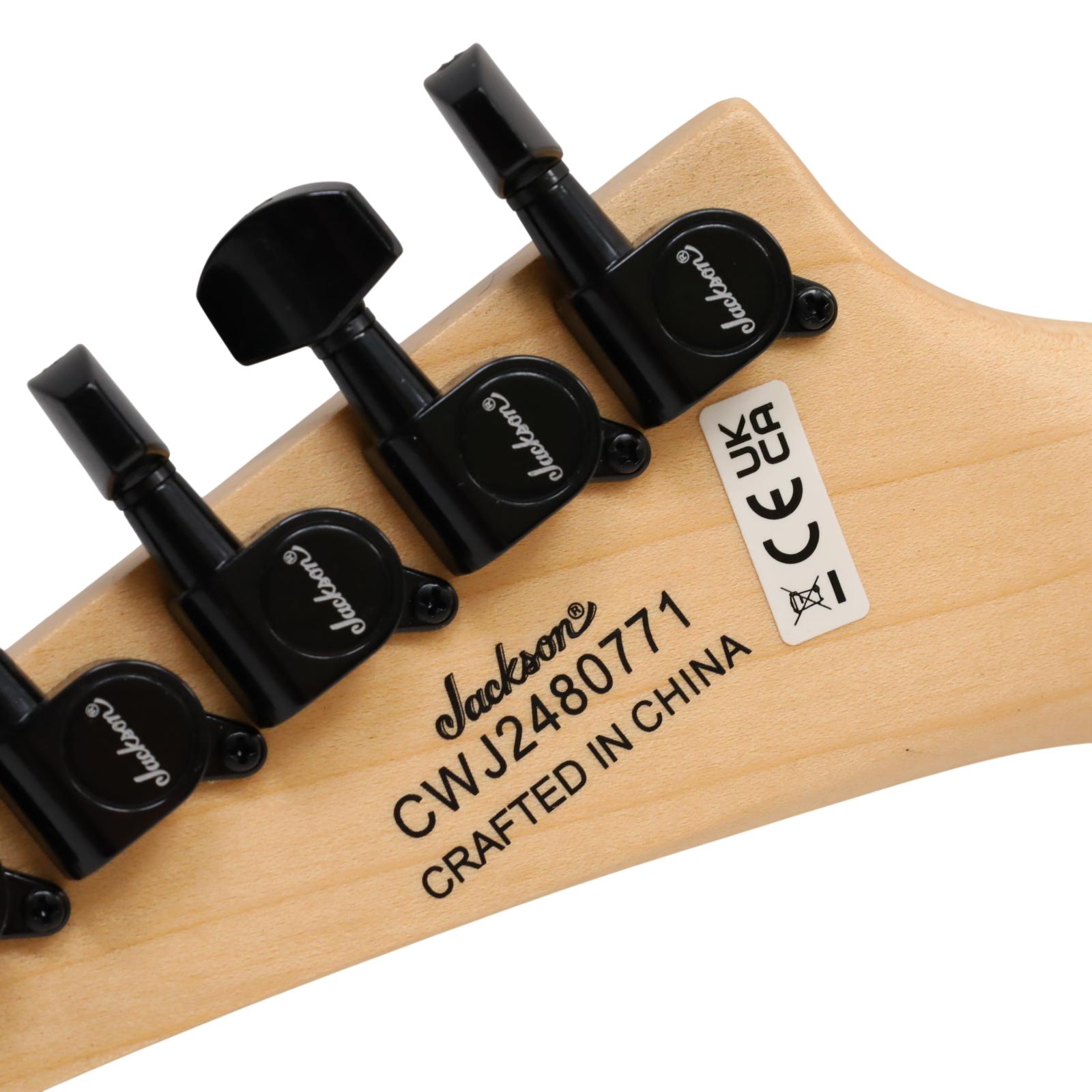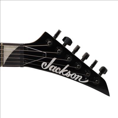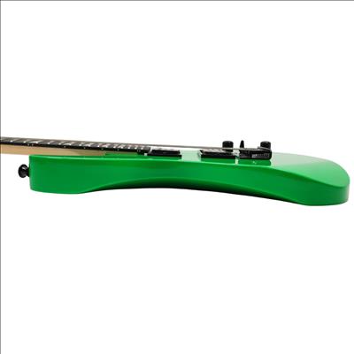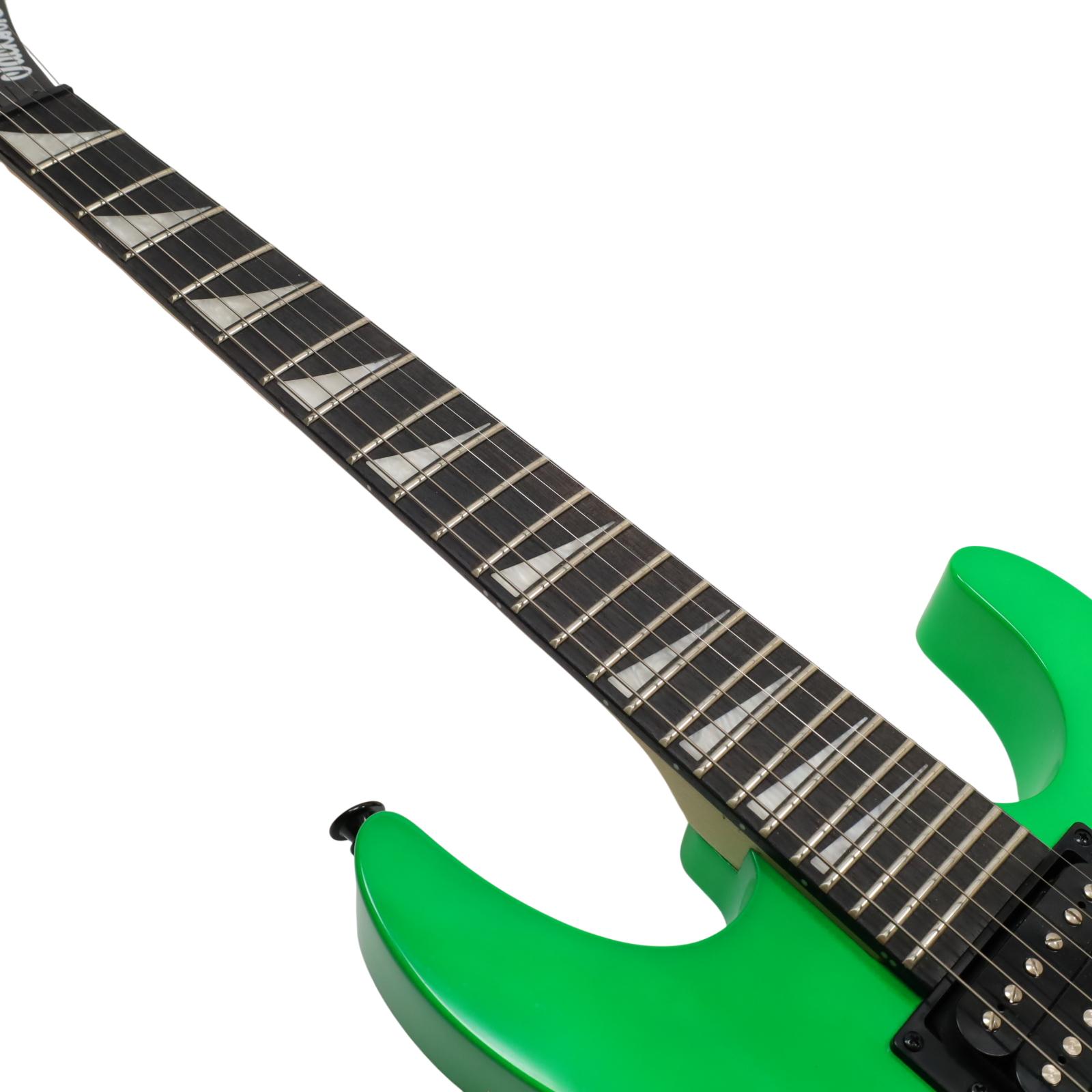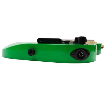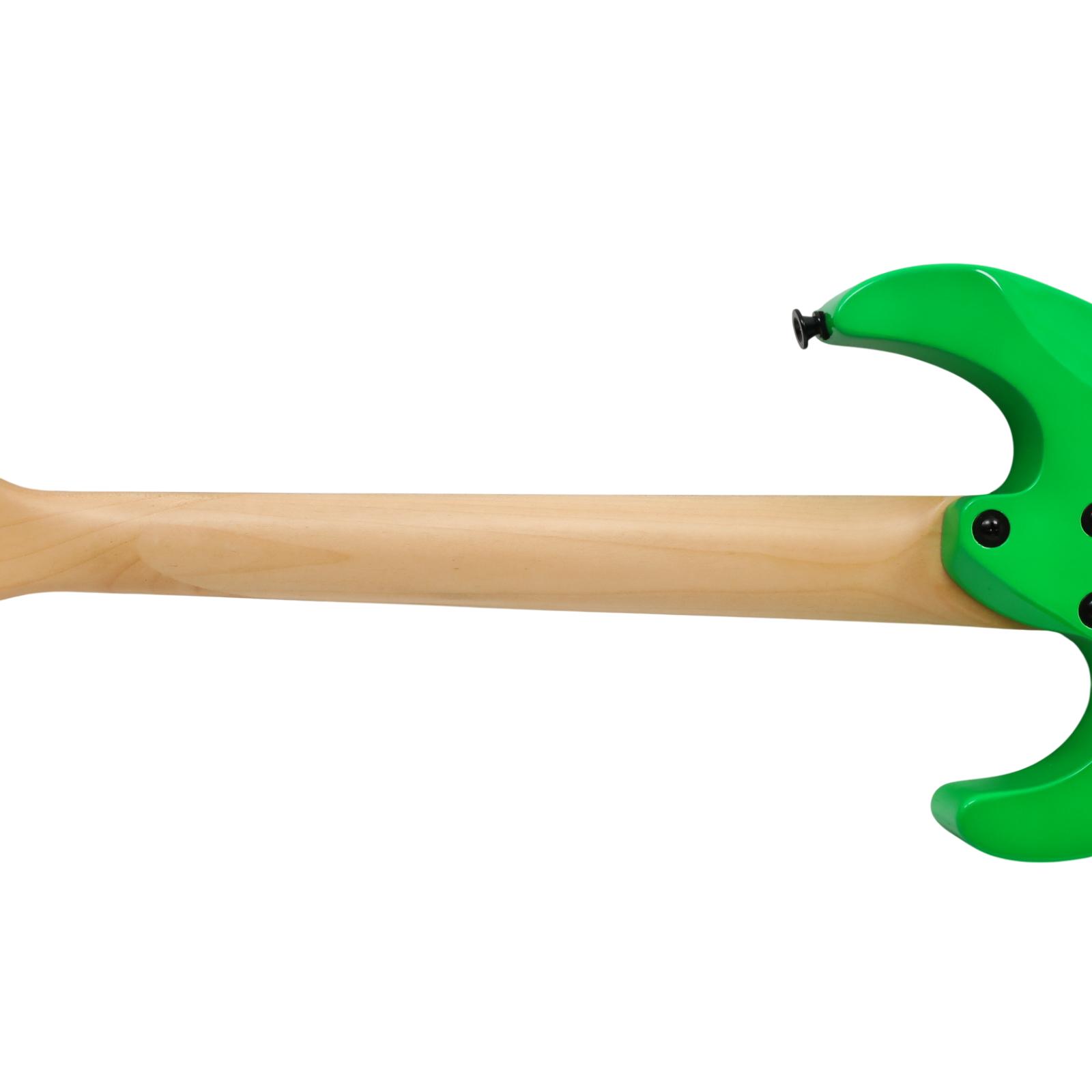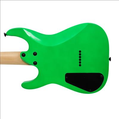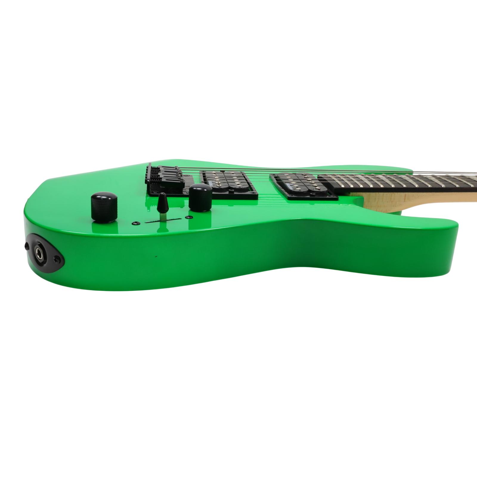 A compact right-handed 6-string electric guitar built around a 2/3-scale 22.5 inch length, featuring a poplar body, bolt-on maple neck with graphite reinforcement rods, and an amaranth fingerboard with a 12 inch radius, 24 jumbo frets, and pearloid sharkfin position inlays; it uses an angled 6-in-line headstock, sculpted heel for upper-fret access, and a string-through-body hardtail bridge with block saddles for stable tuning and sustain, while dual Jackson high-output ceramic humbuckers in an HH configuration are controlled by a three-position blade switch with master volume and tone controls, finished in neon green with black hardware for a compact travel-friendly instrument that retains full electric guitar functionality.