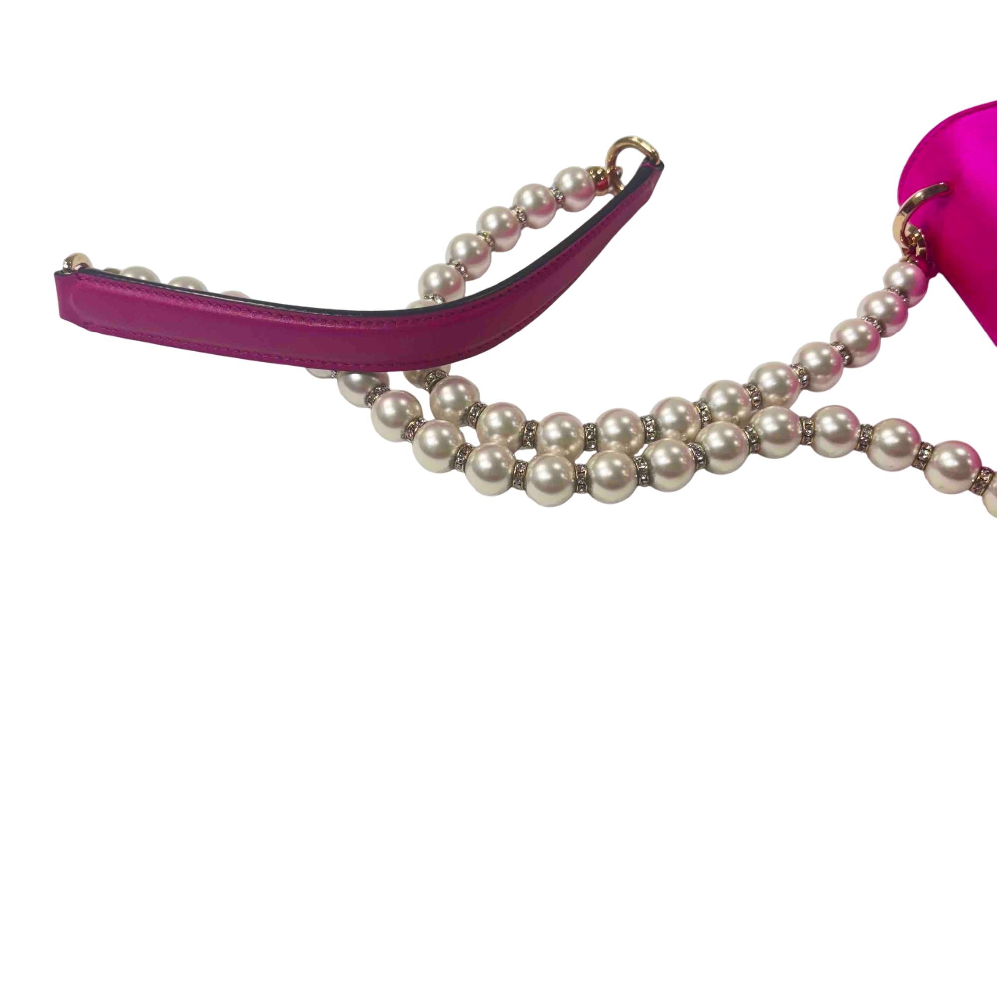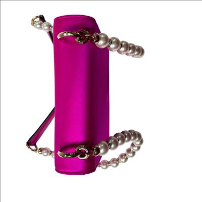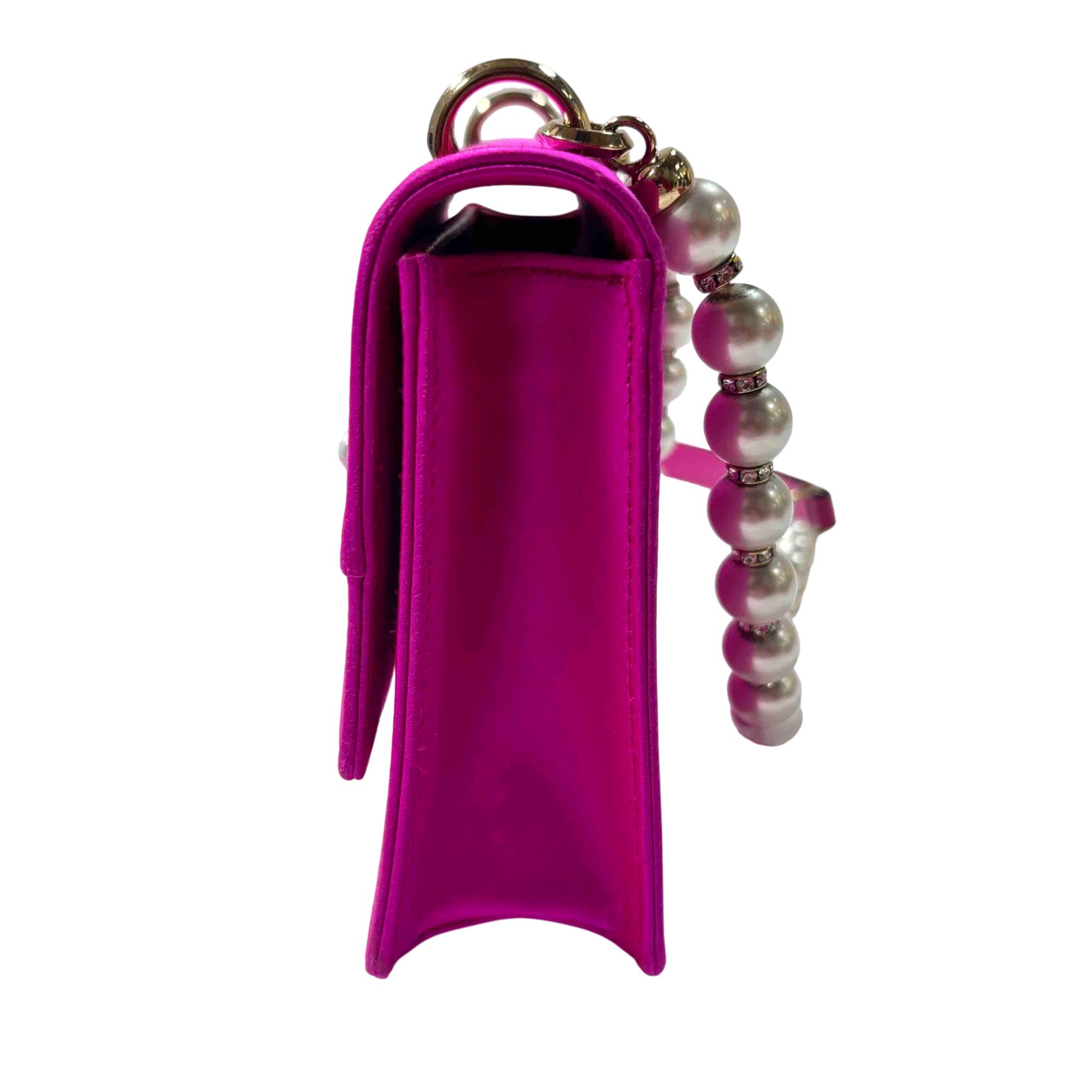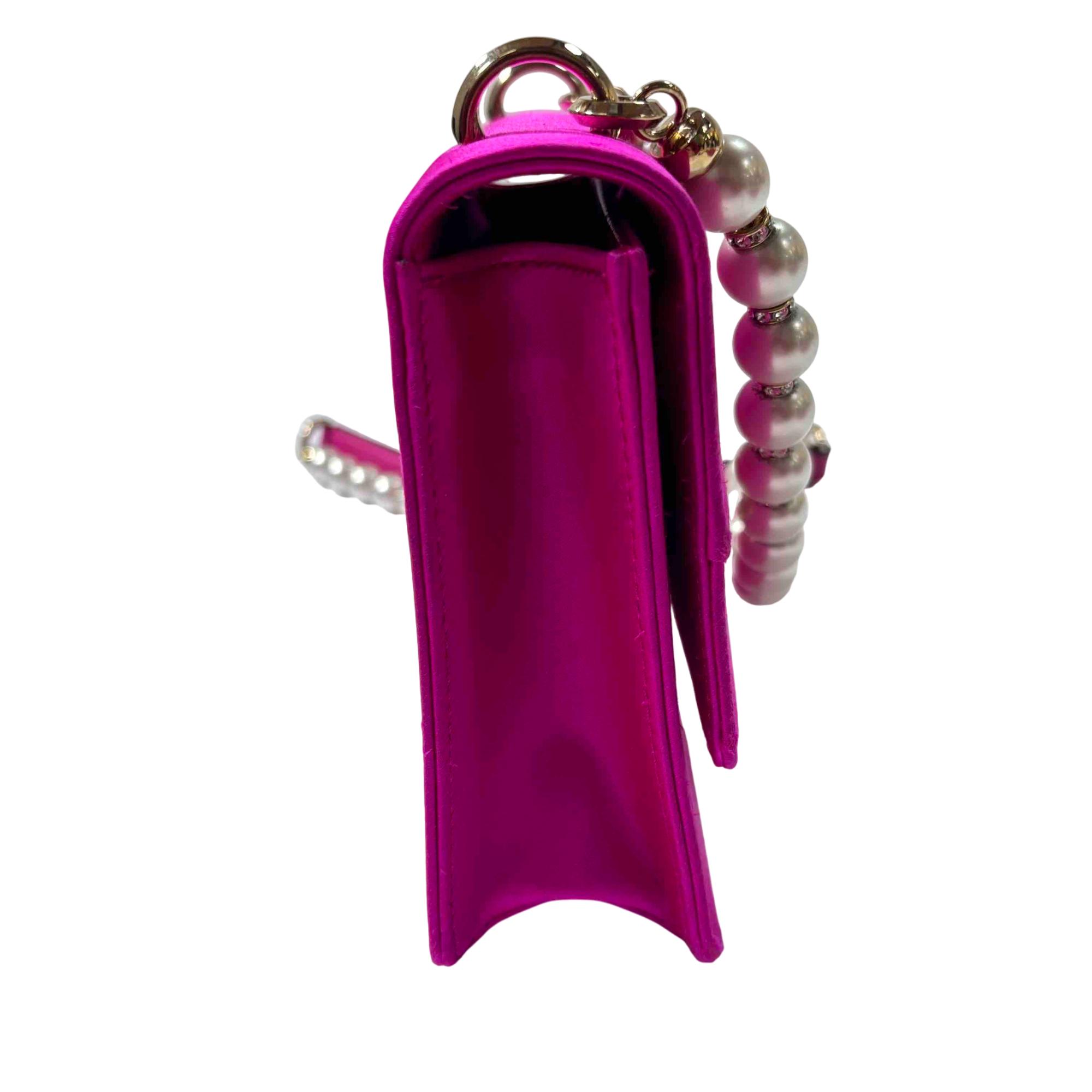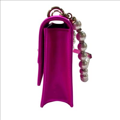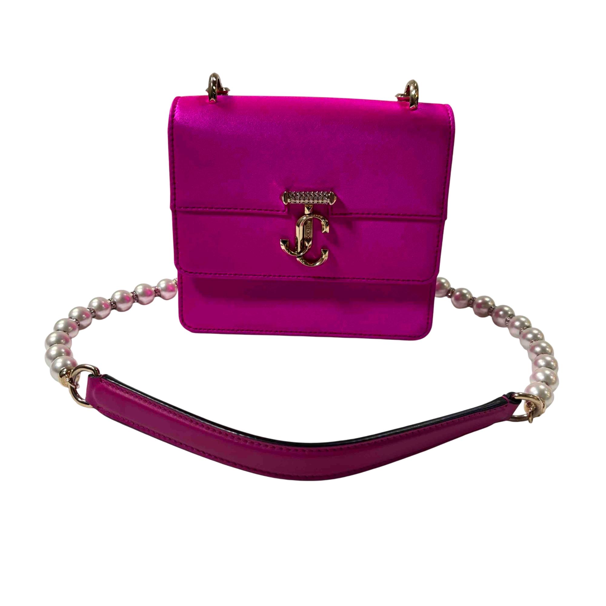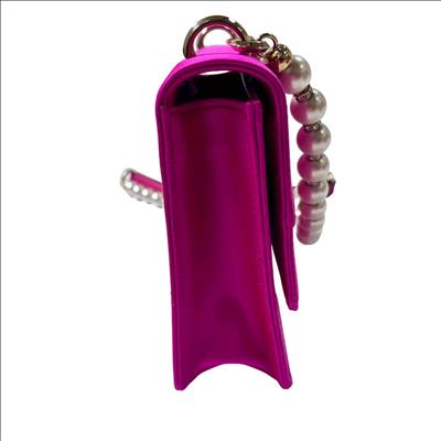 The Jimmy Choo Avenue Quad XS Satin Shoulder Bag in Pearl Pink features a luxurious satin finish complemented by a distinctive pearl strap that adds an elegant touch. This compact shoulder bag combines refined craftsmanship with a soft pink hue and subtle gold lettering, making it a stylish accessory for everyday fashion.